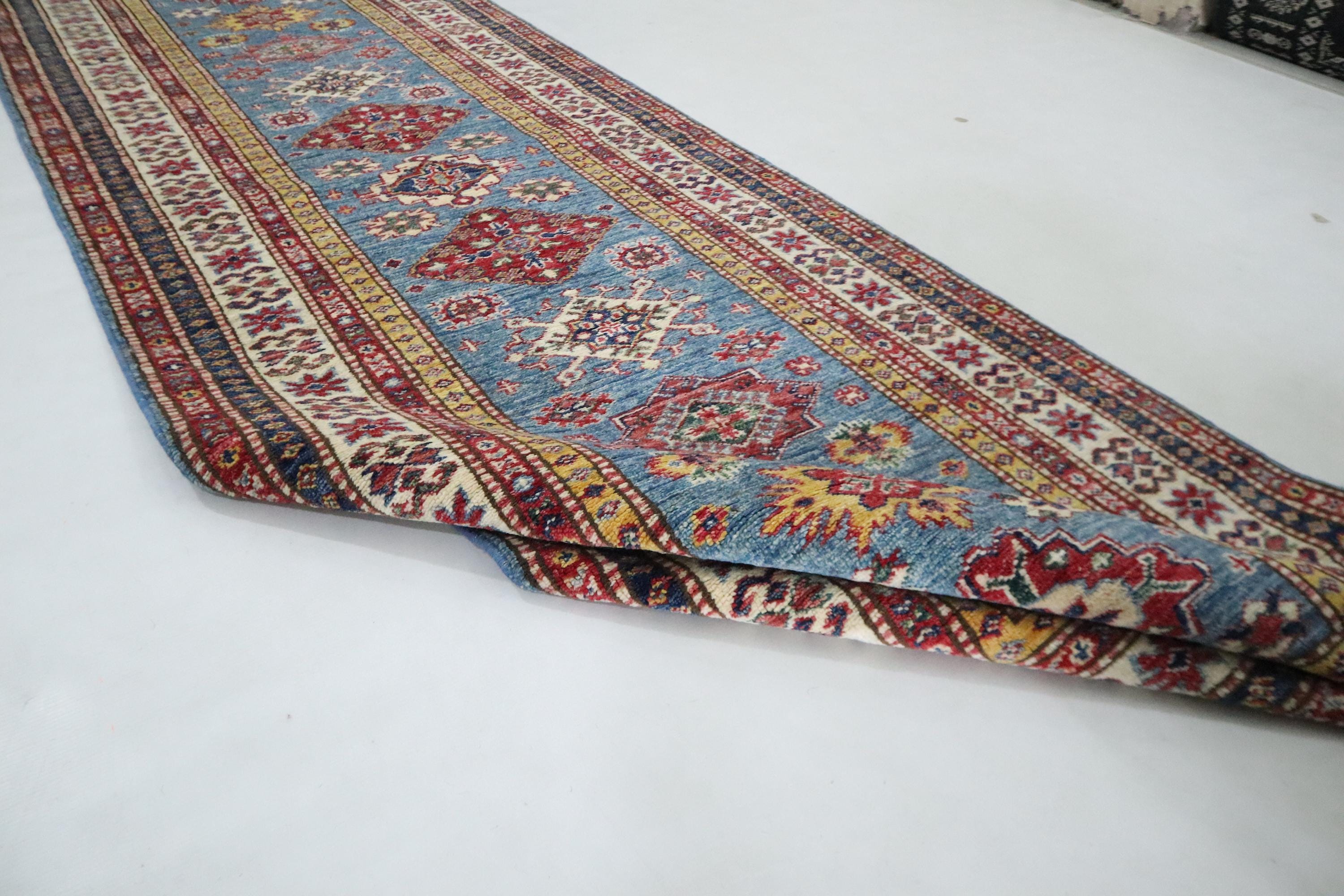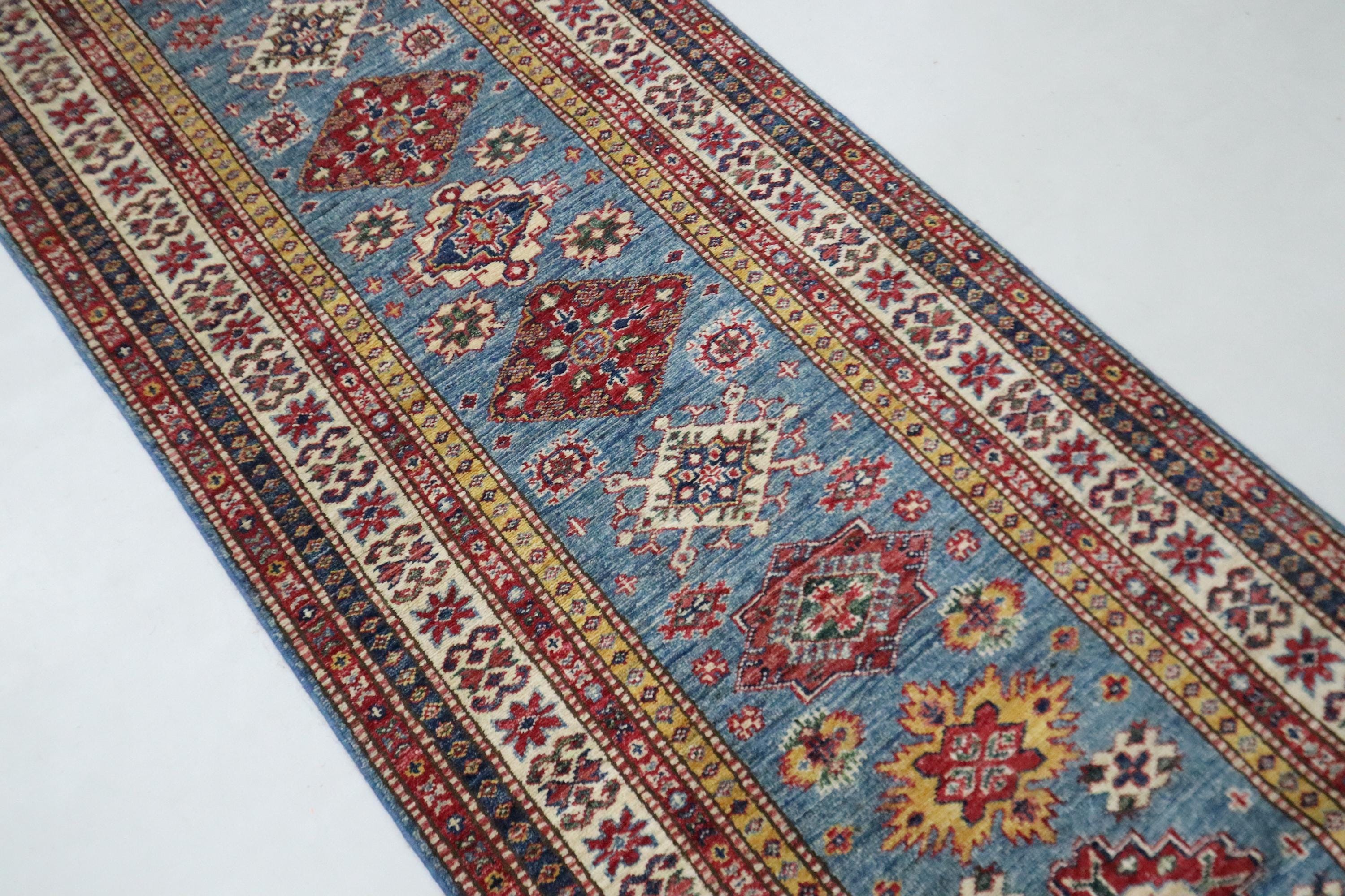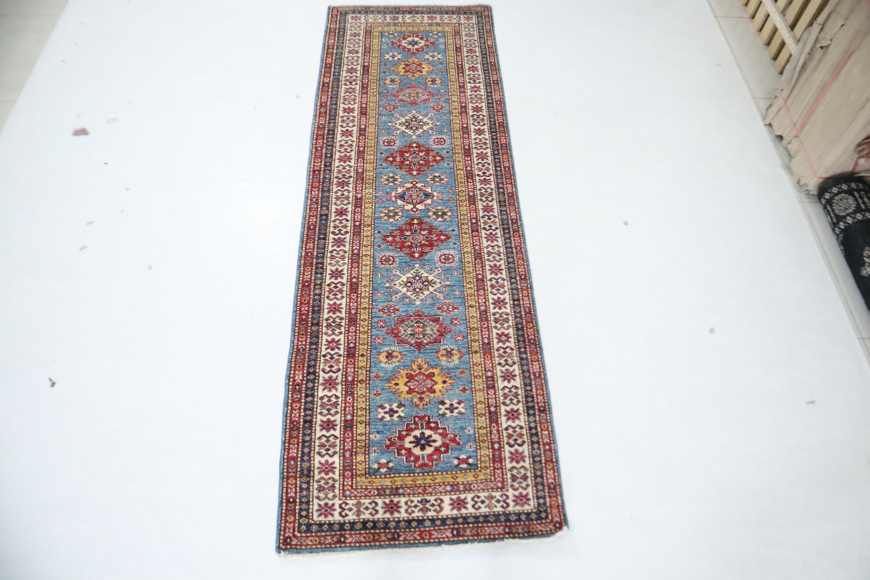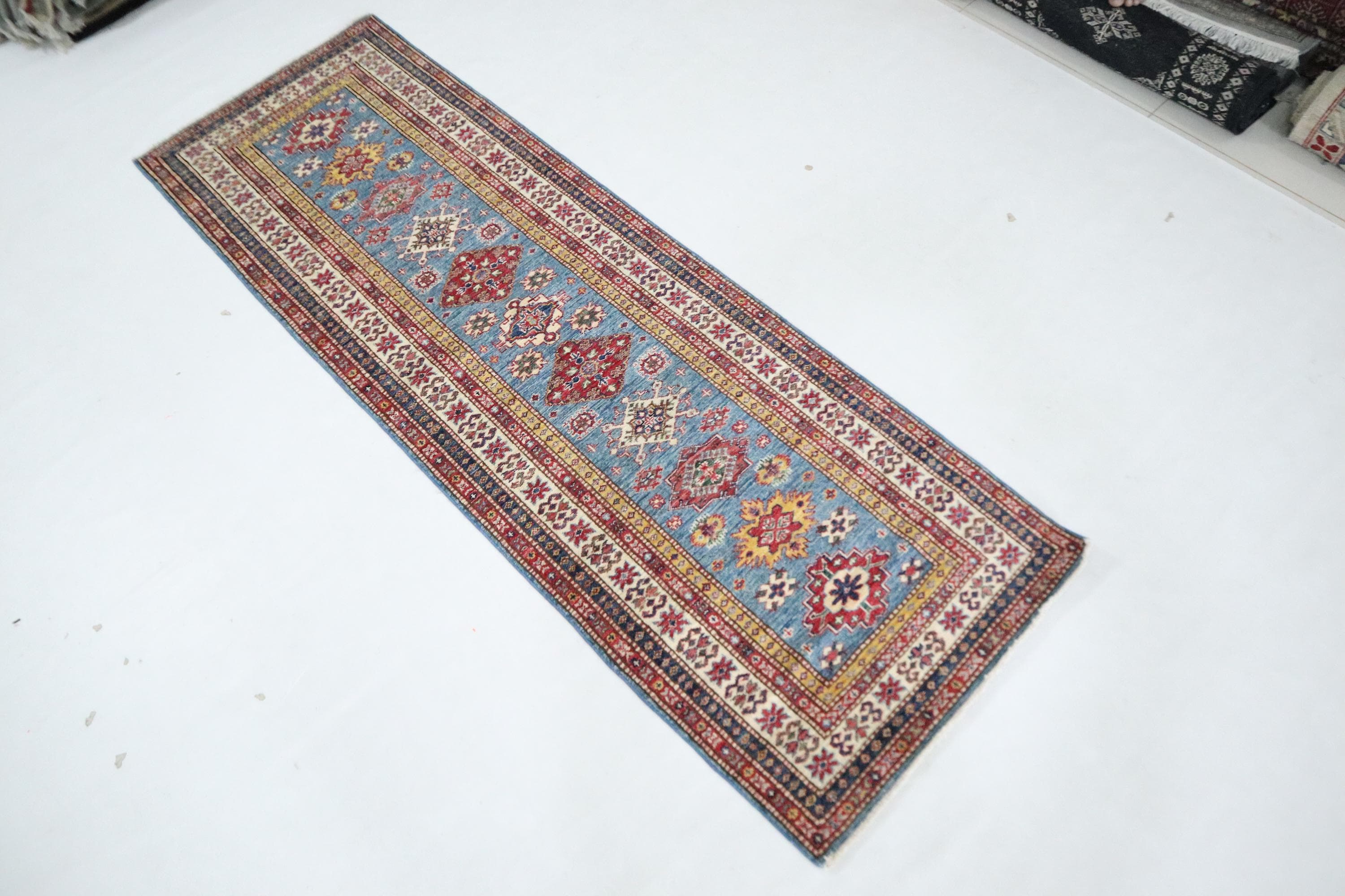 8 Ft Kazak Runner Rug, Blue Afghan Hand Knotted Caucasian Veg Dye Wool Runner, Geometric Runner, Oriental Runner, Kitchen Runner, Runner