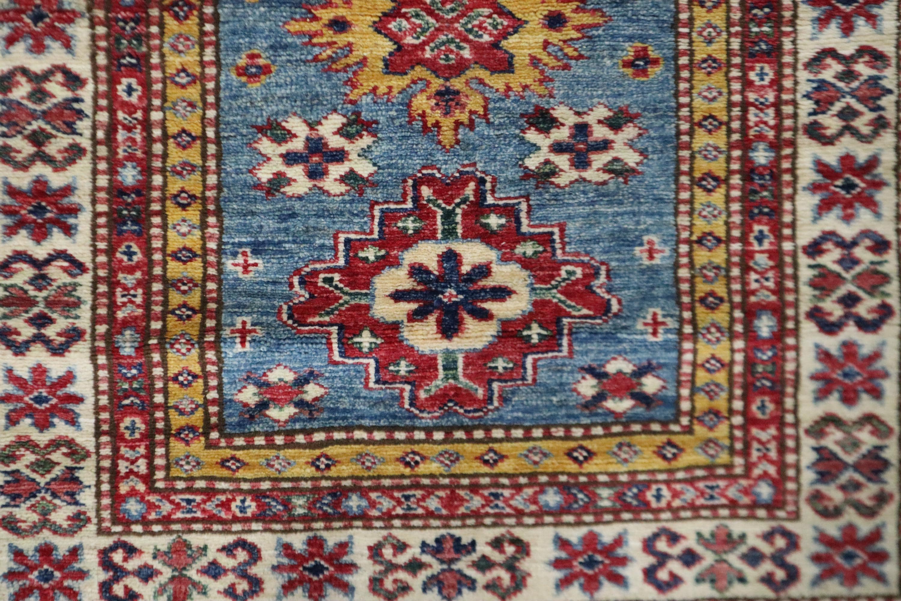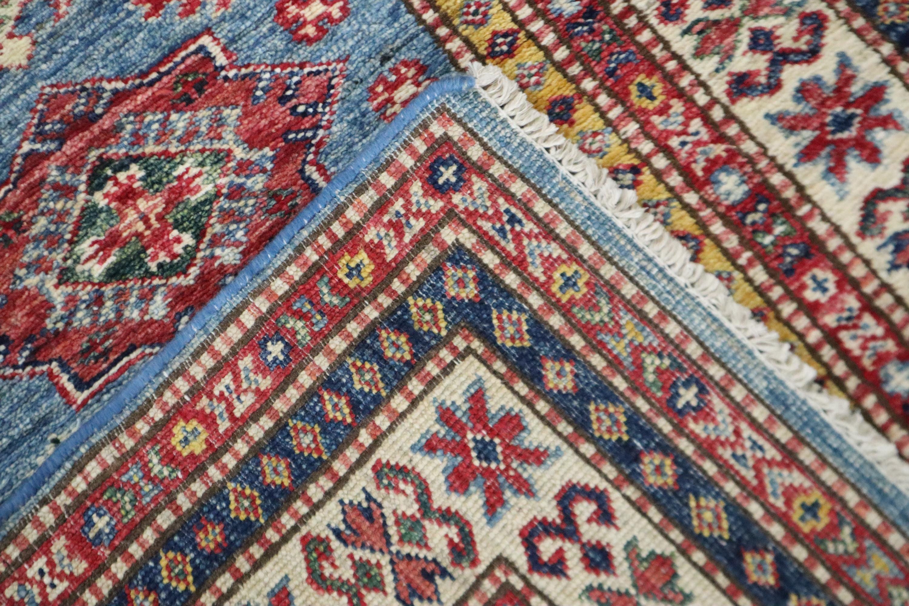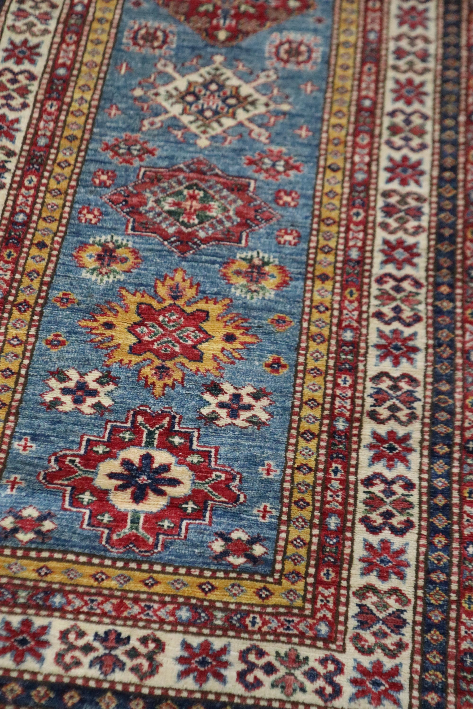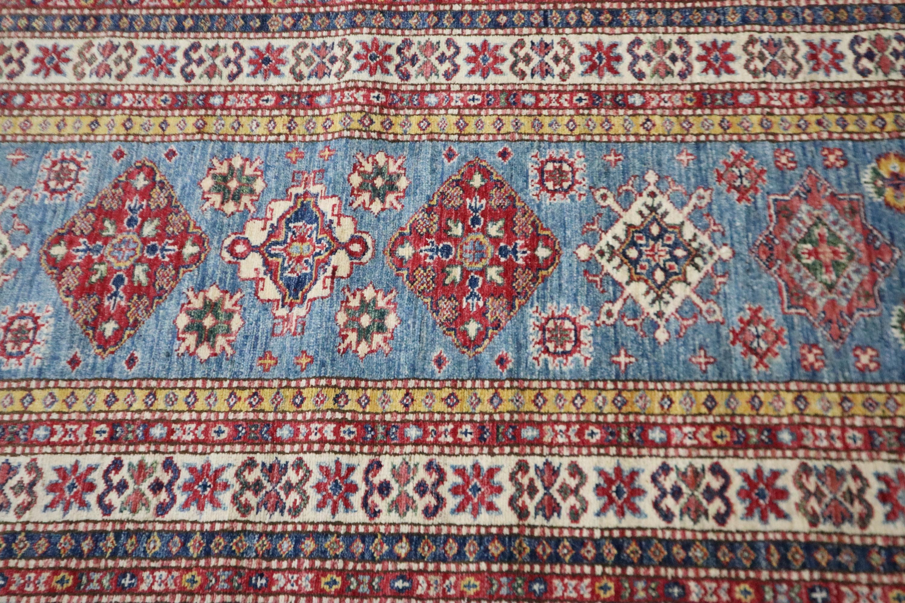8 Ft Kazak Runner Rug, Blue Afghan Hand Knotted Caucasian Veg Dye Wool Runner, Geometric Runner, Oriental Runner, Kitchen Runner, Runner