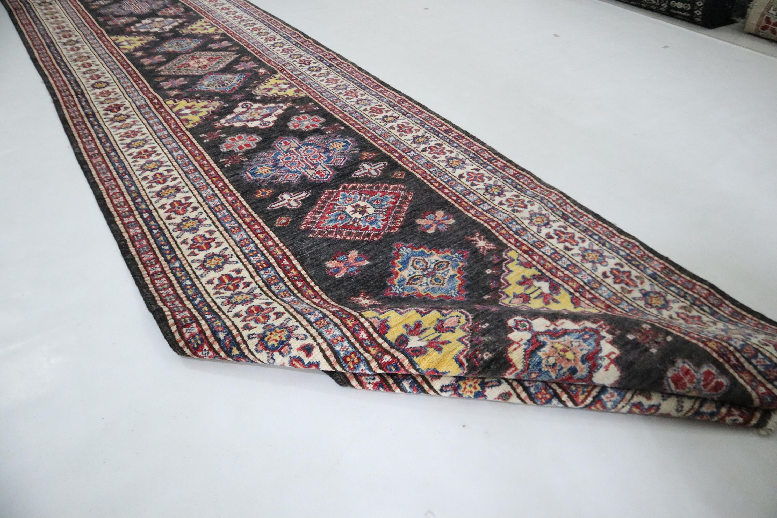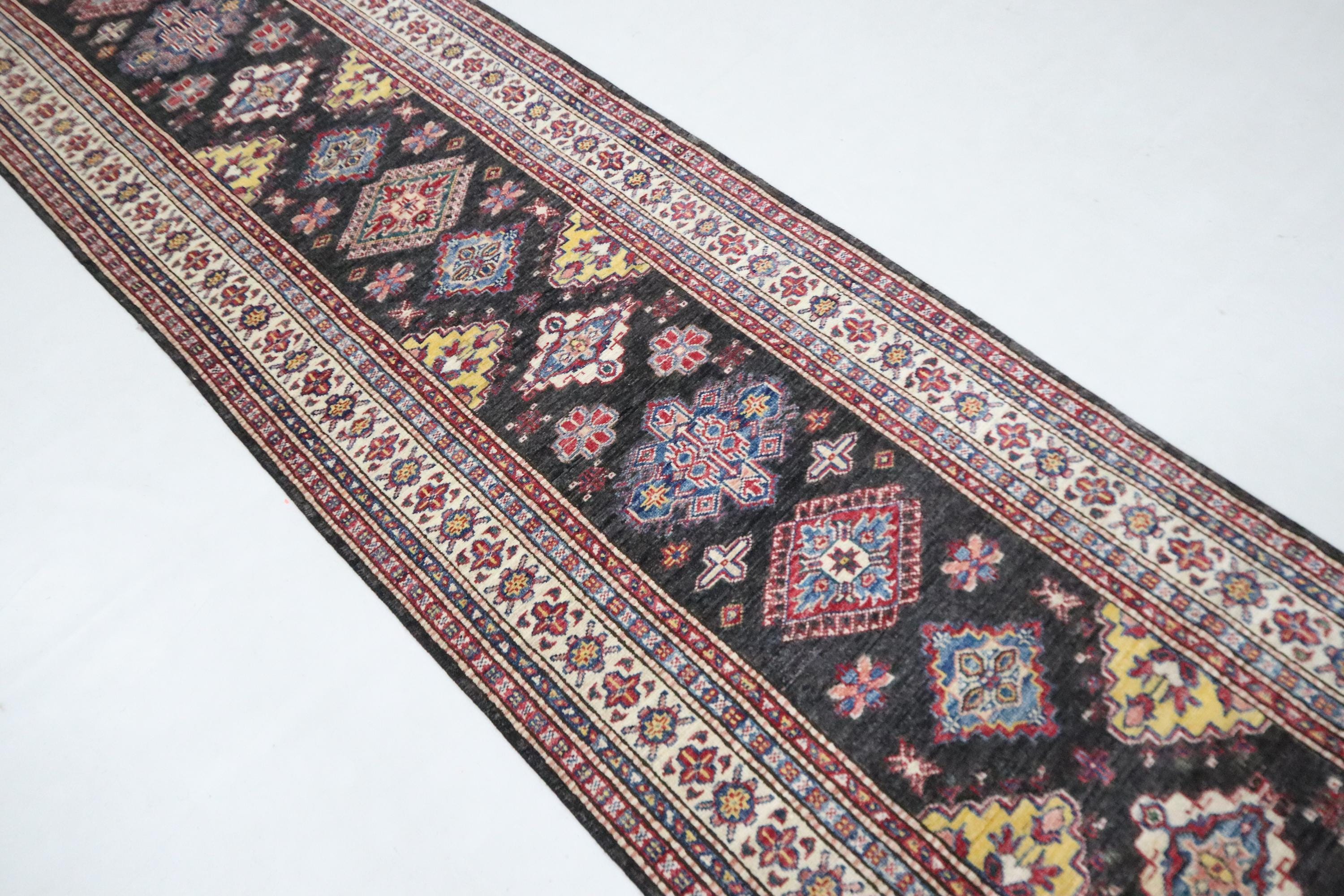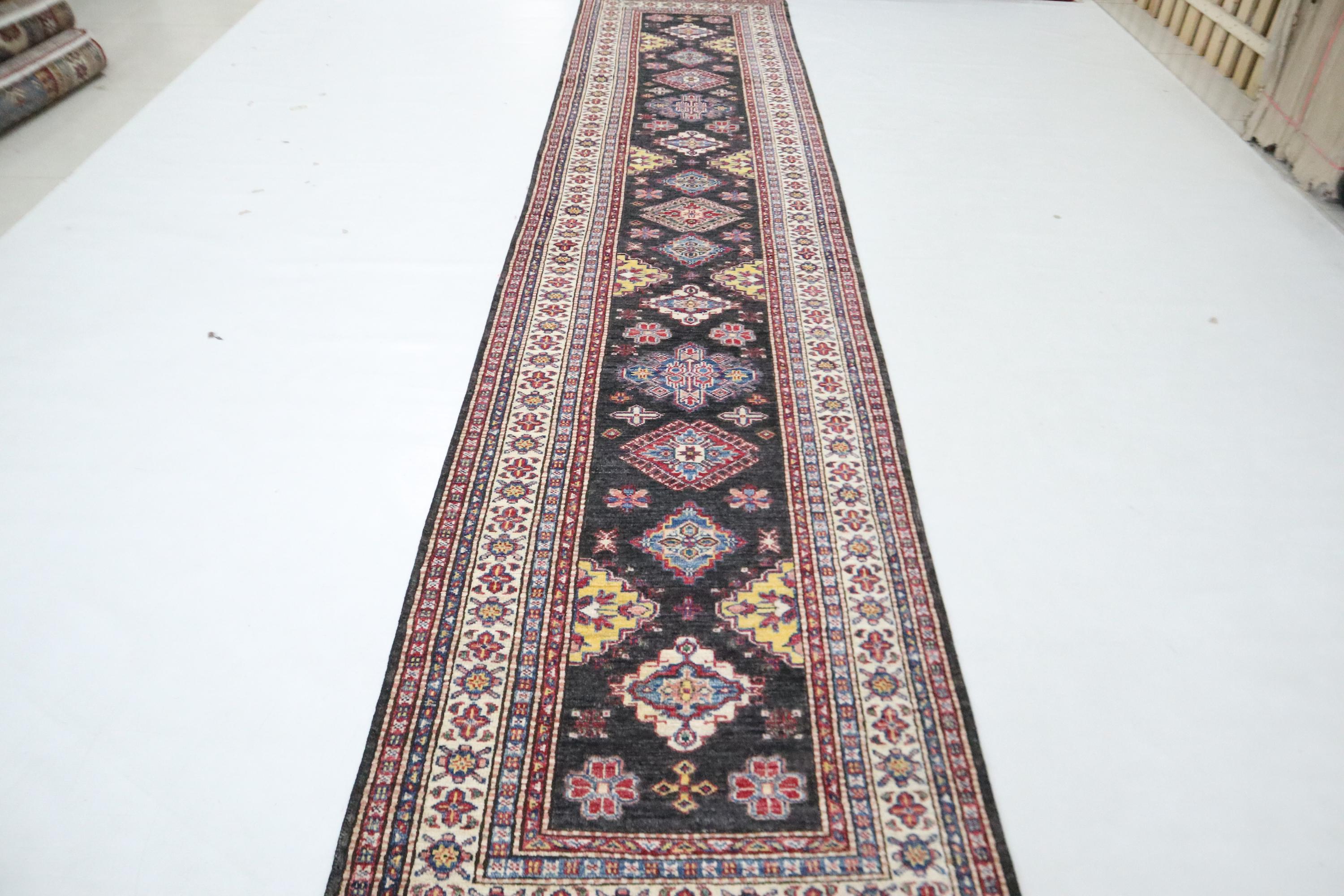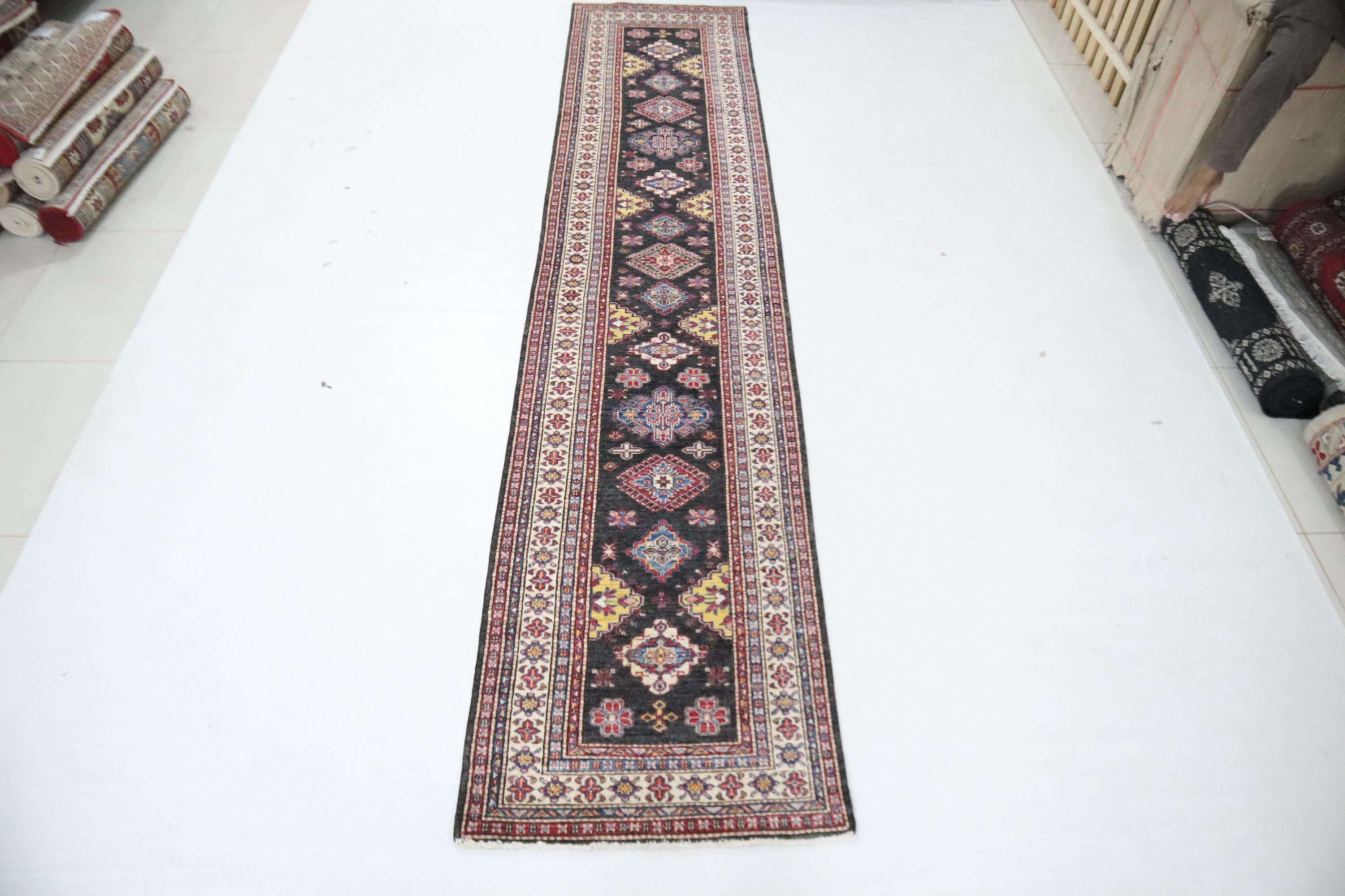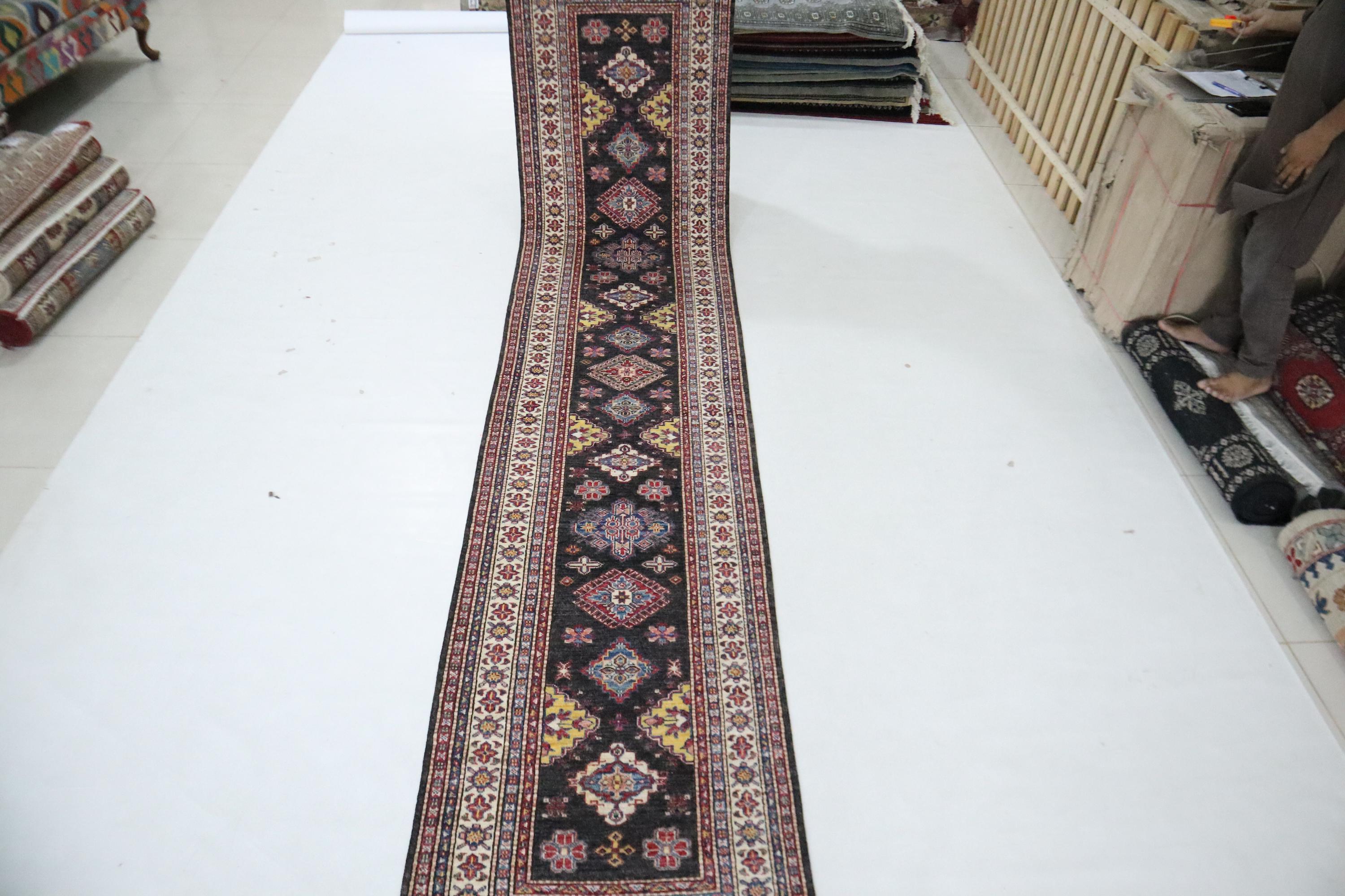 12 Ft Kazak Runner Rug, Black Afghan Hand Knotted Geometric Veg Dye Wool Runner, Large Runner, Traditional Runner, Bedroom Runner, Runners