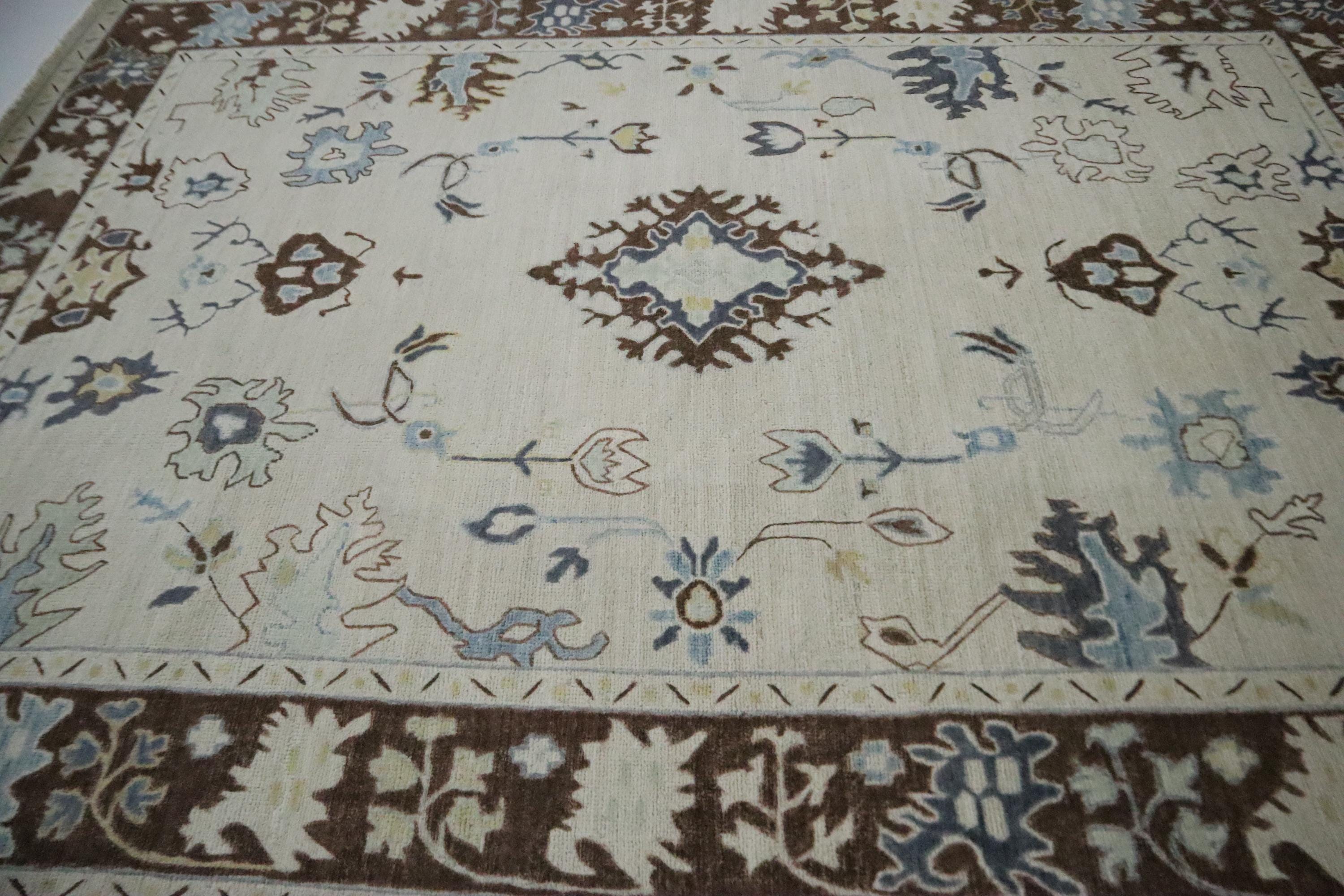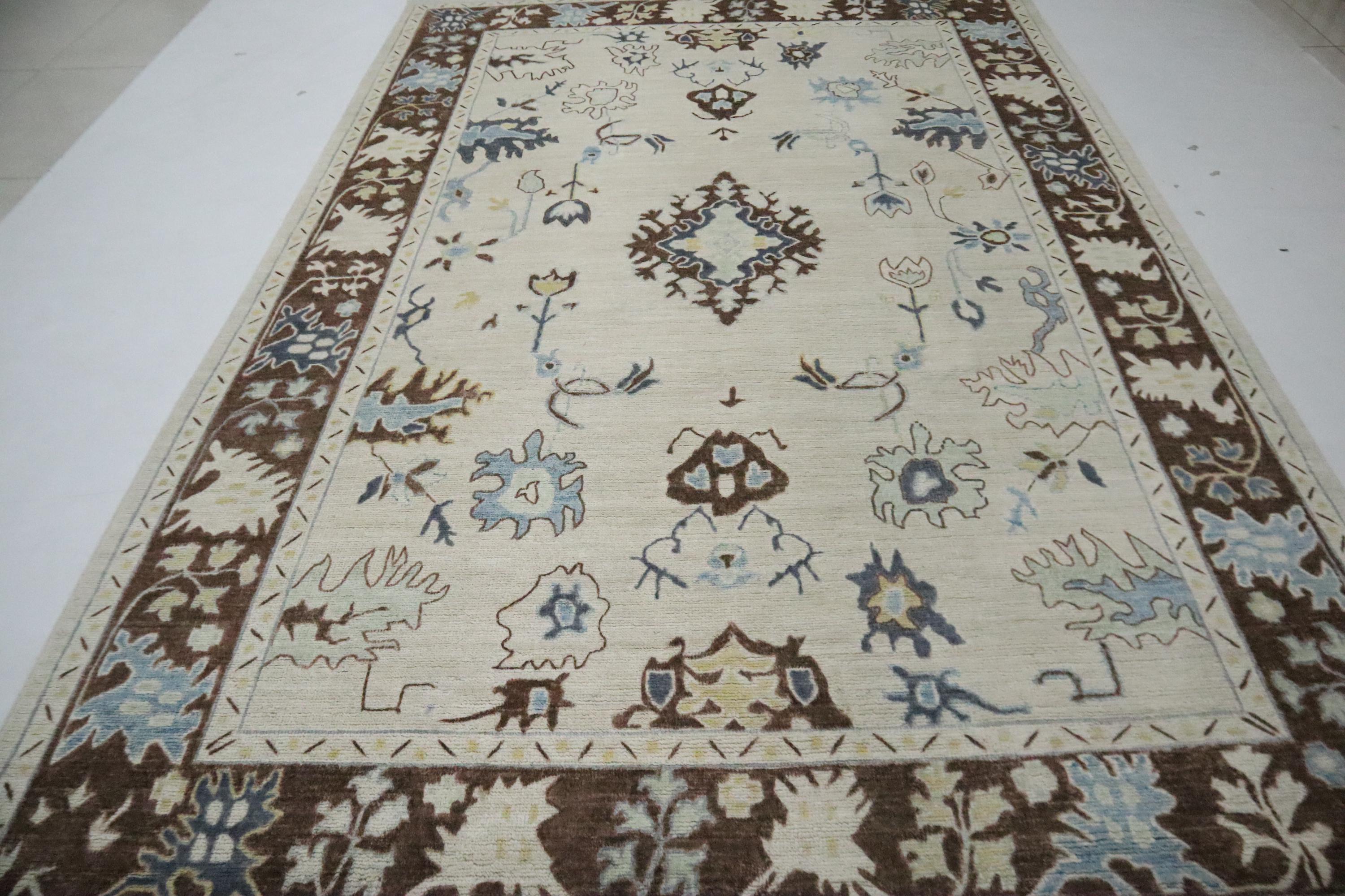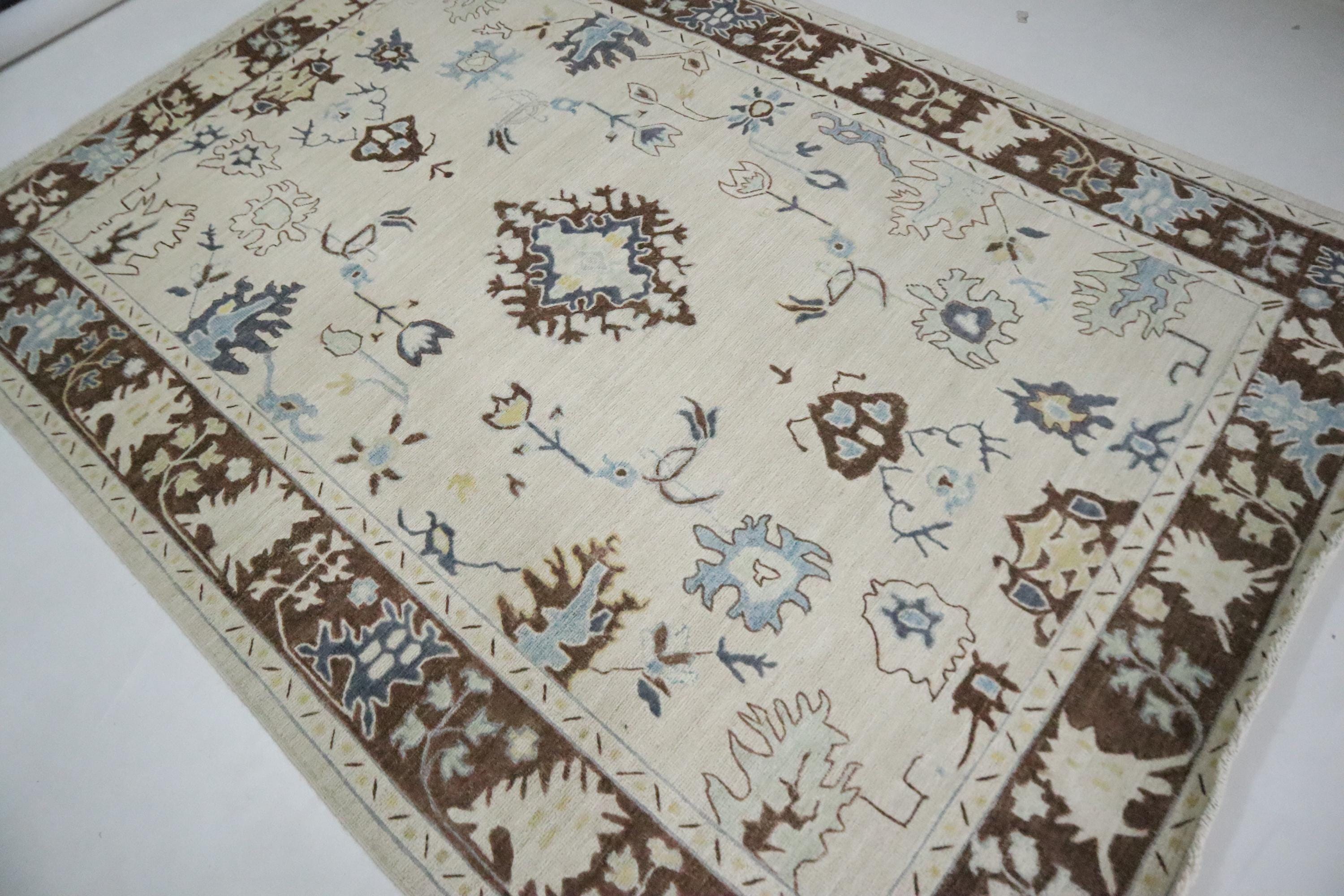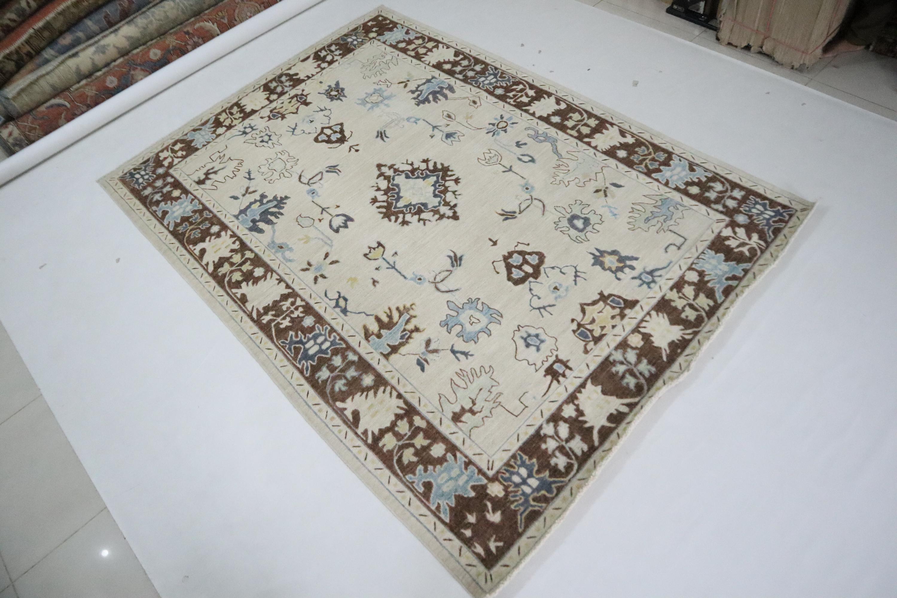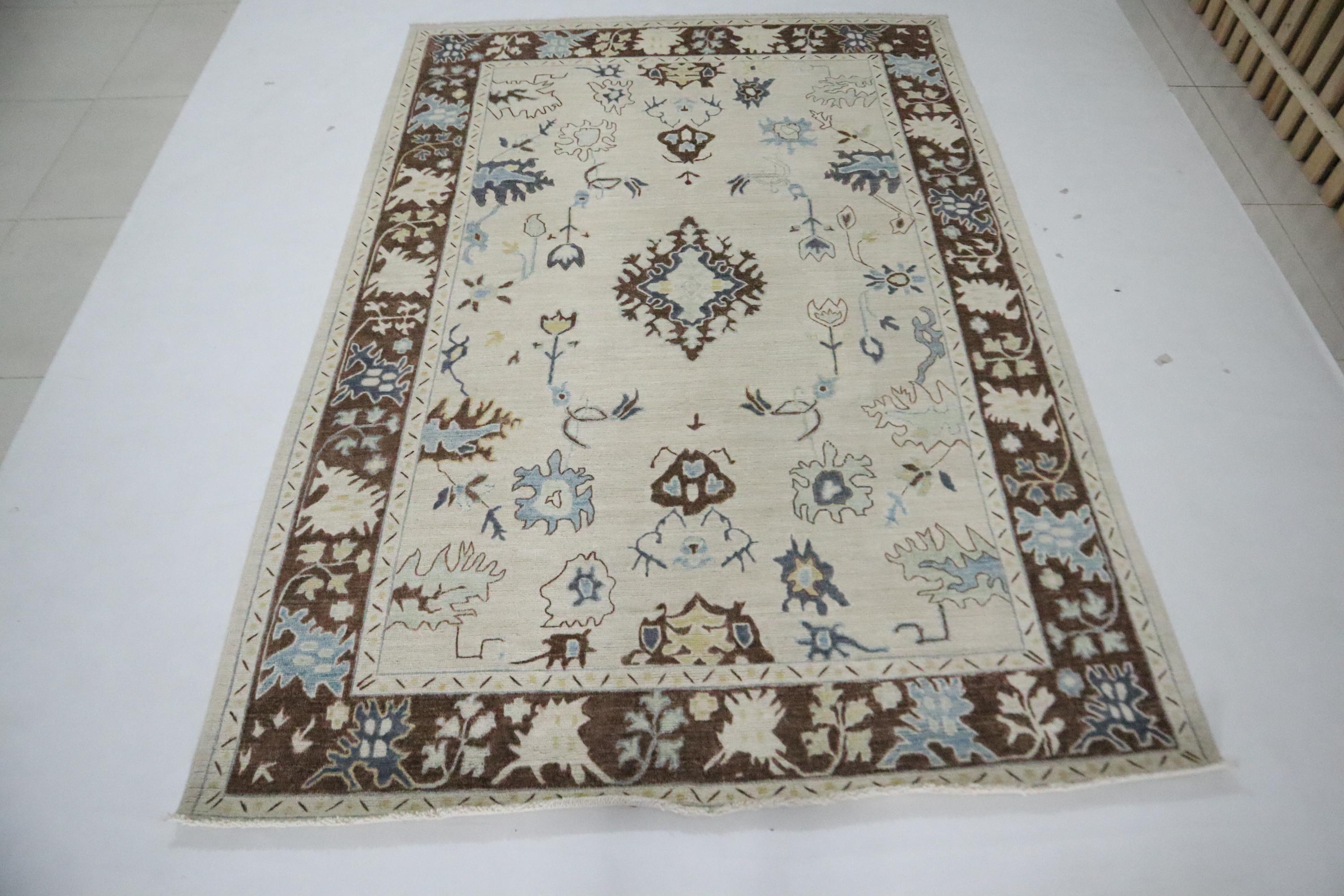 6x9 Ft Oushak Area Rug, Beige Brown Turkish Hand Knotted Floral Motif Soft Wool Rug, Oriental Rug, Bedroom Rug, Office Rug, Living Room Rug
