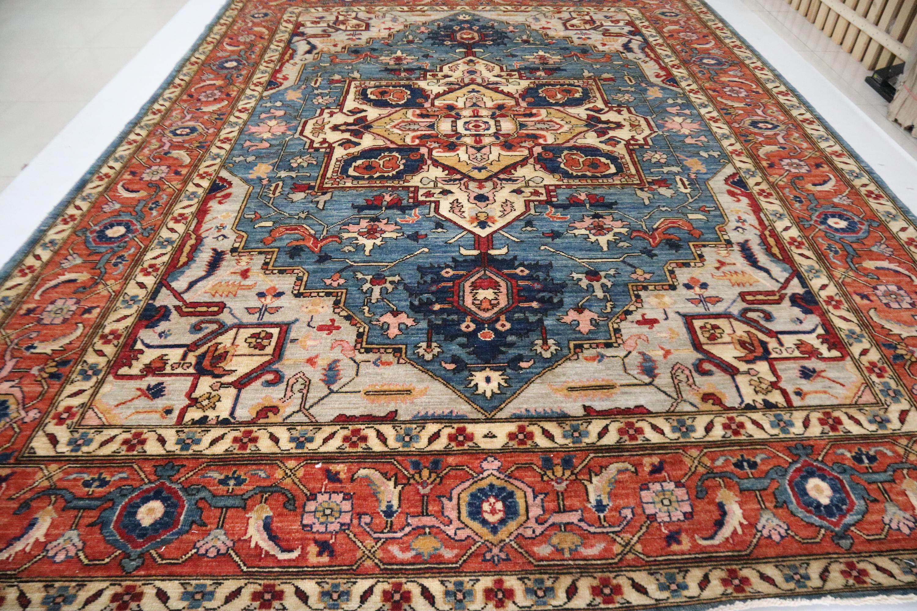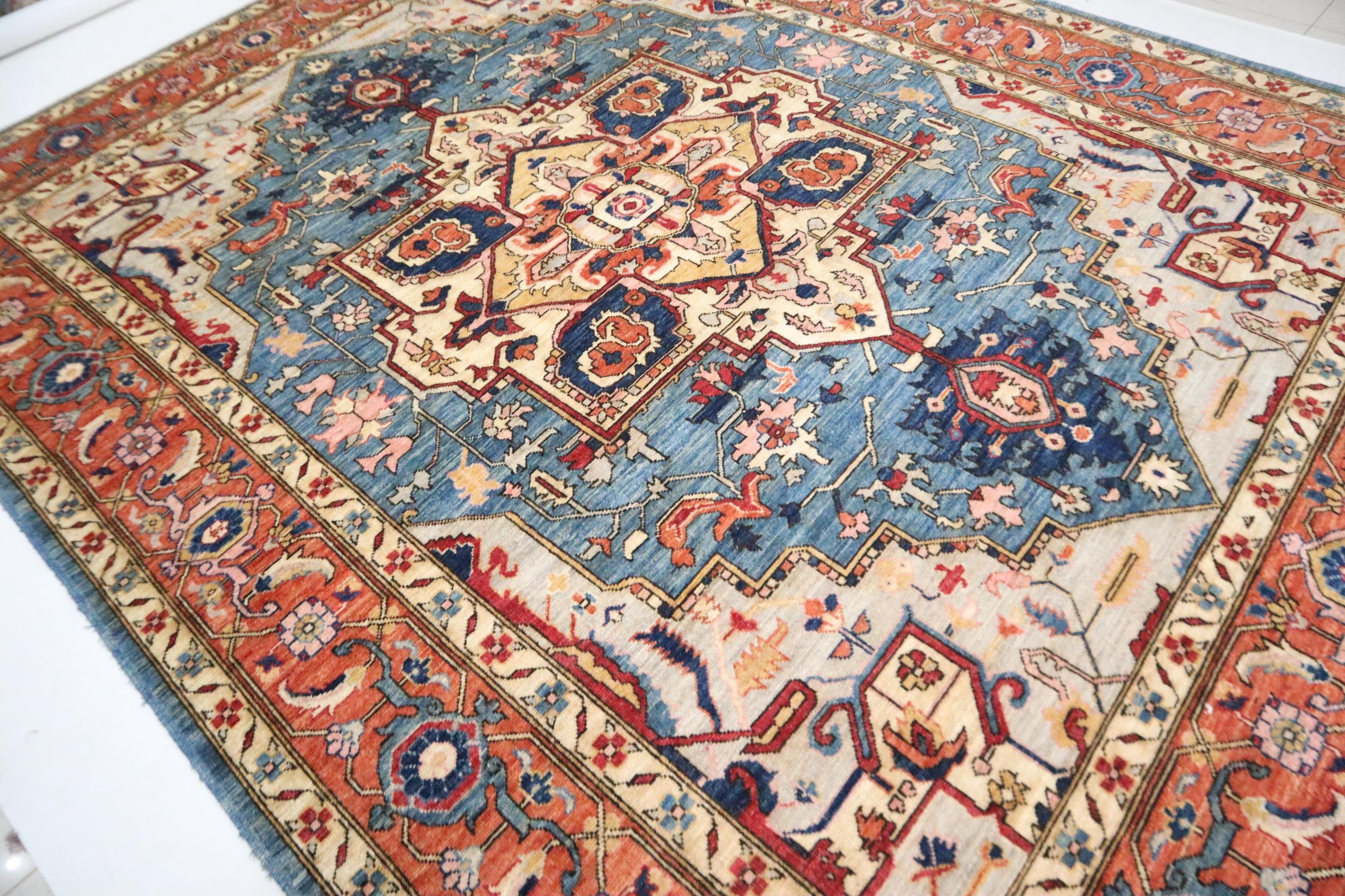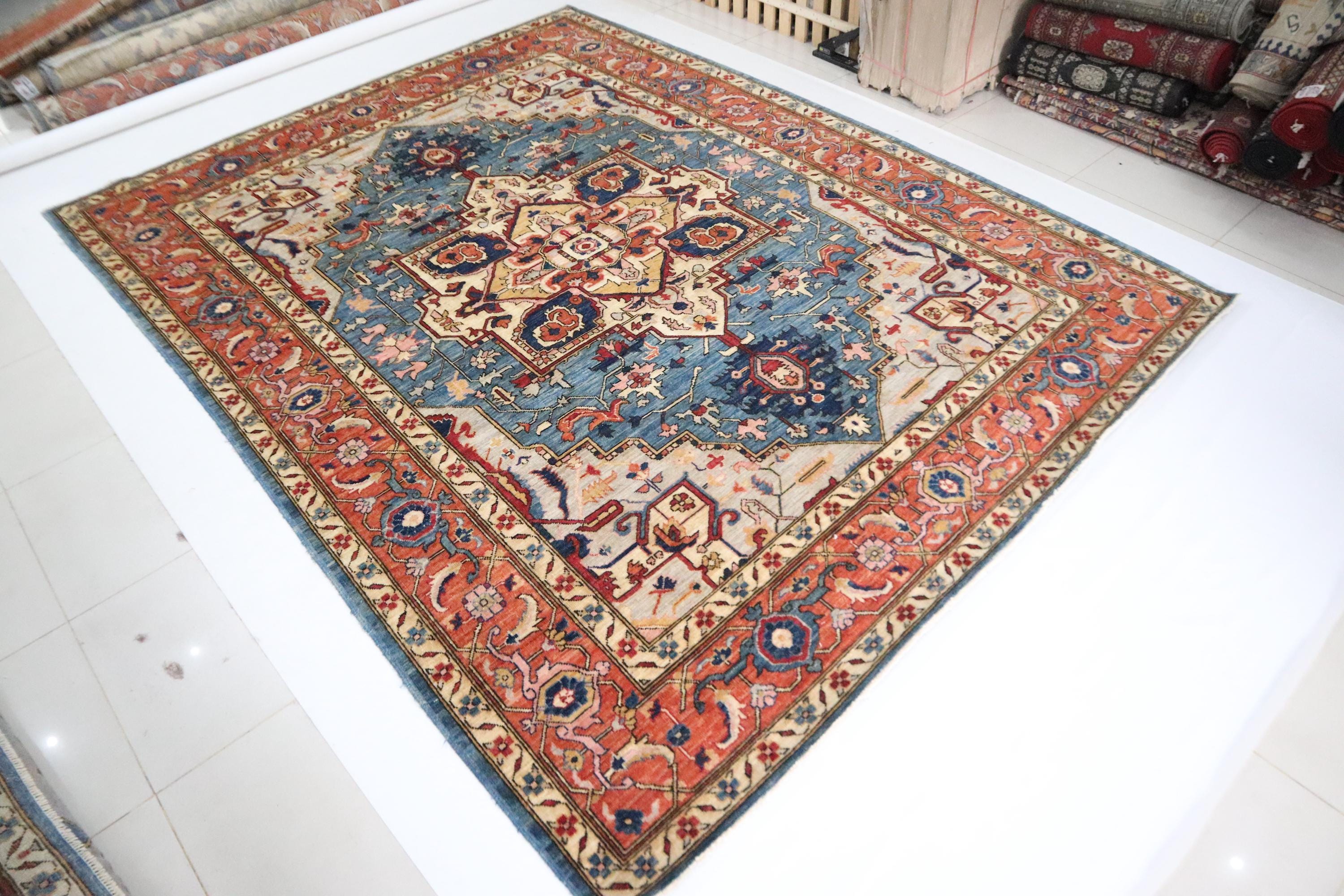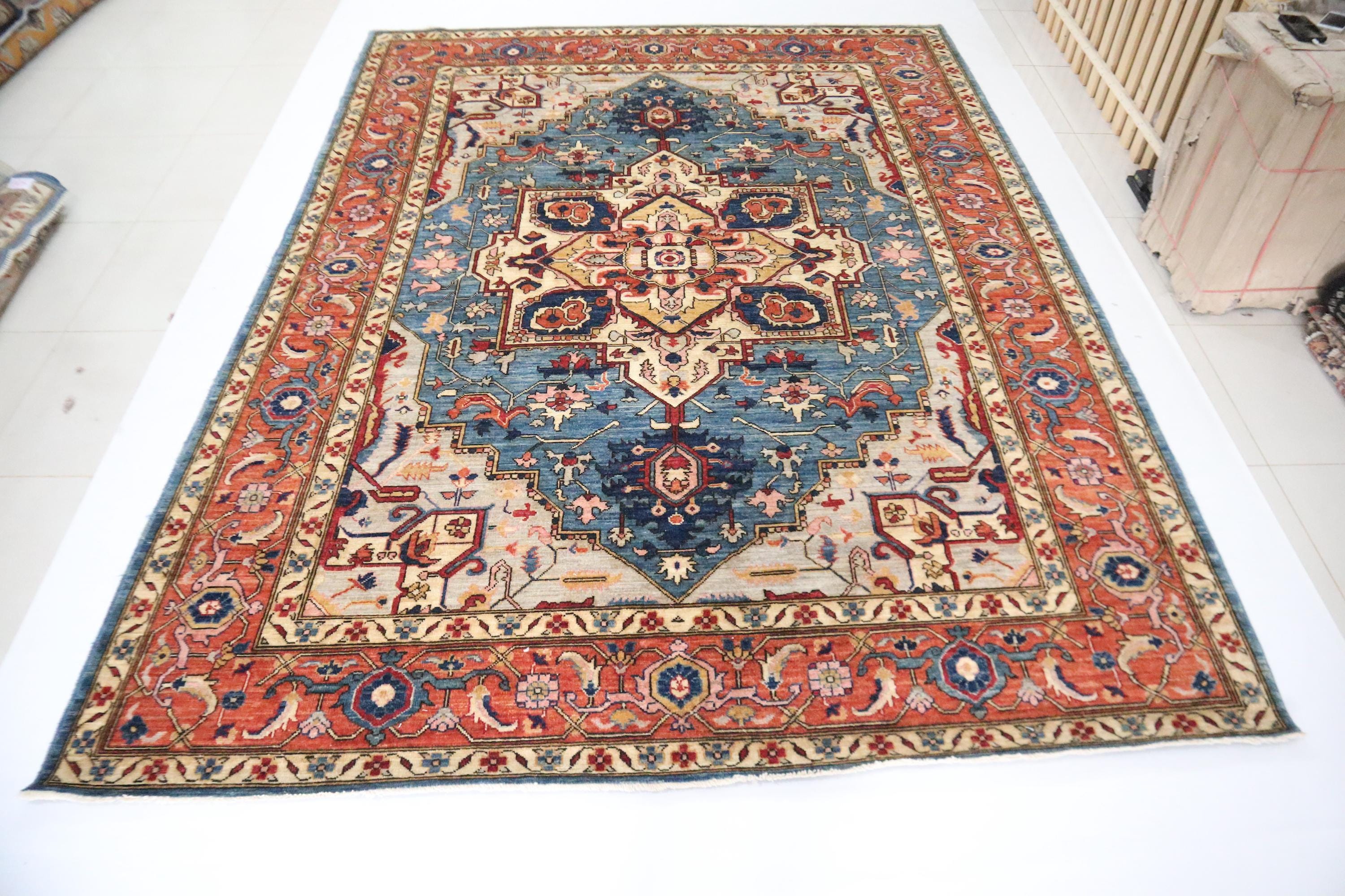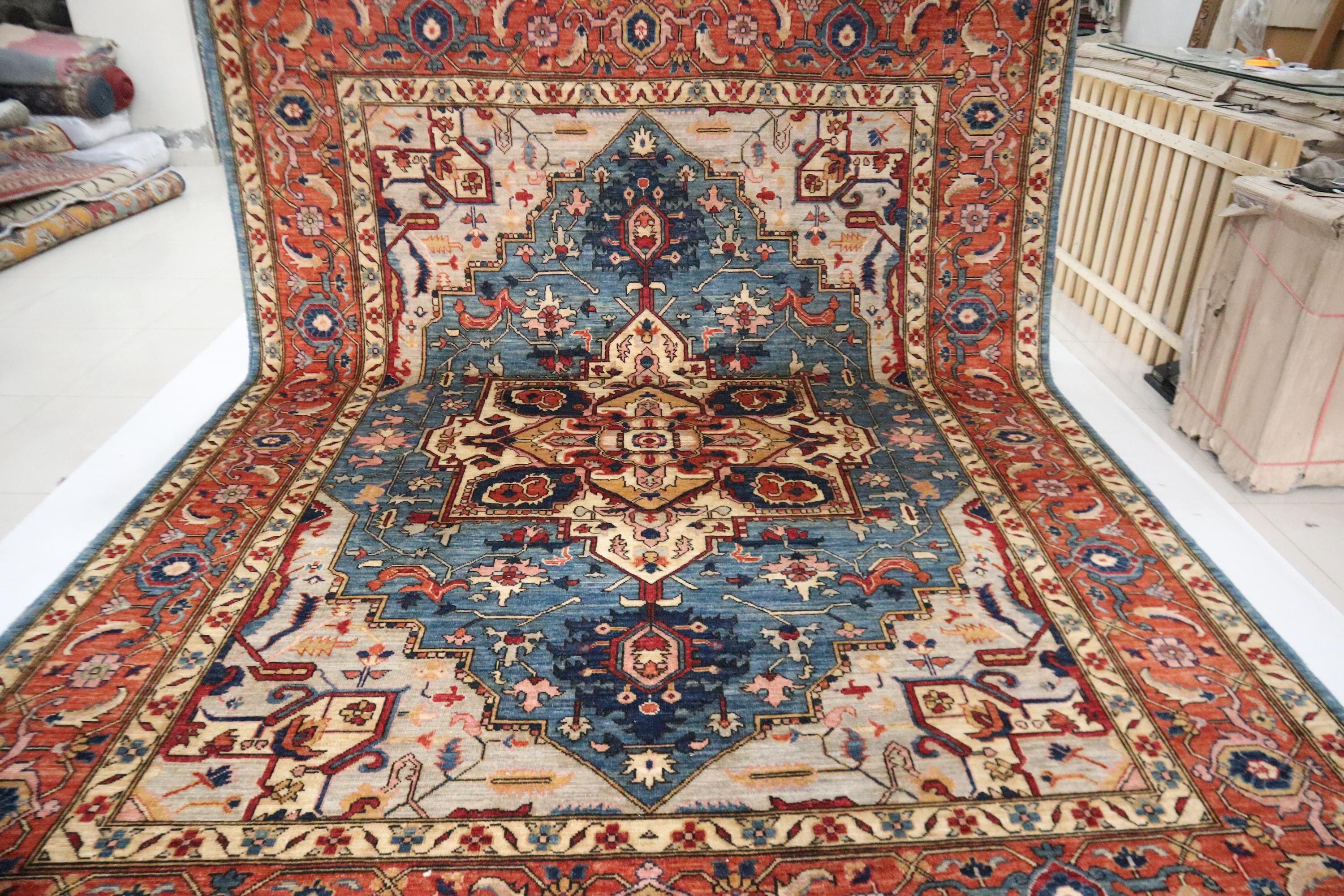 9x12 Ft Heriz Area Rug, Rust Blue Persian Style Afghan Hand Knotted Geometric Veg Dye Wool Rug, Traditional Rug, Bedroom Rug, Office Rug