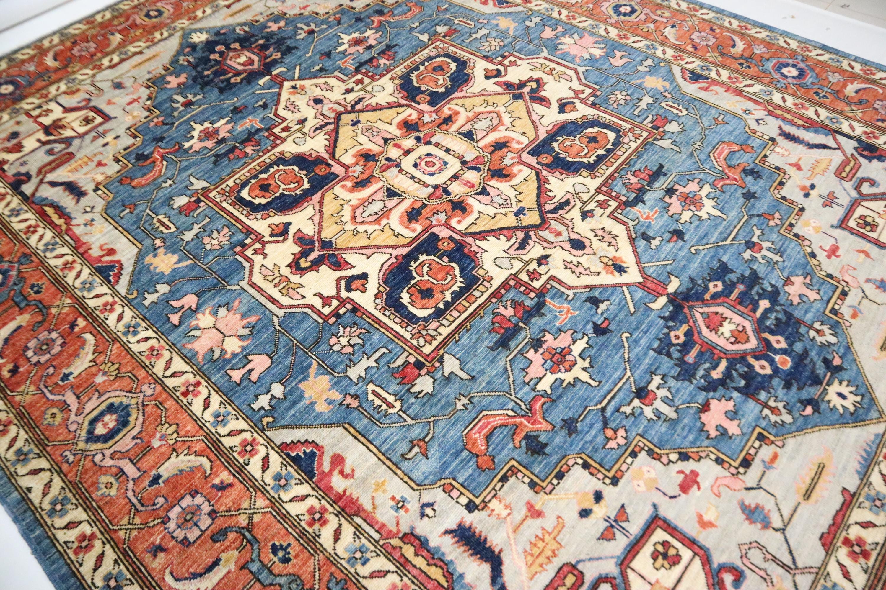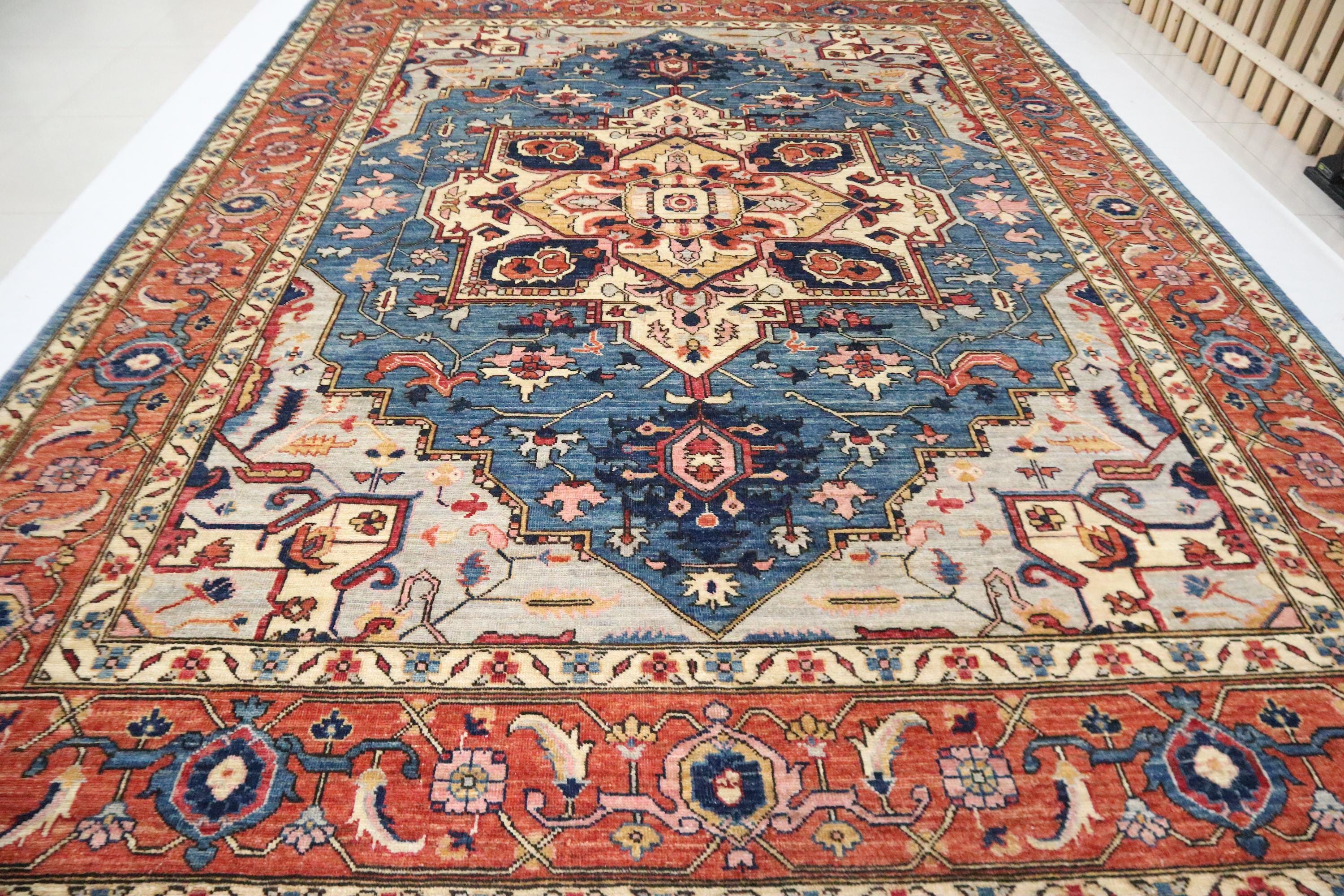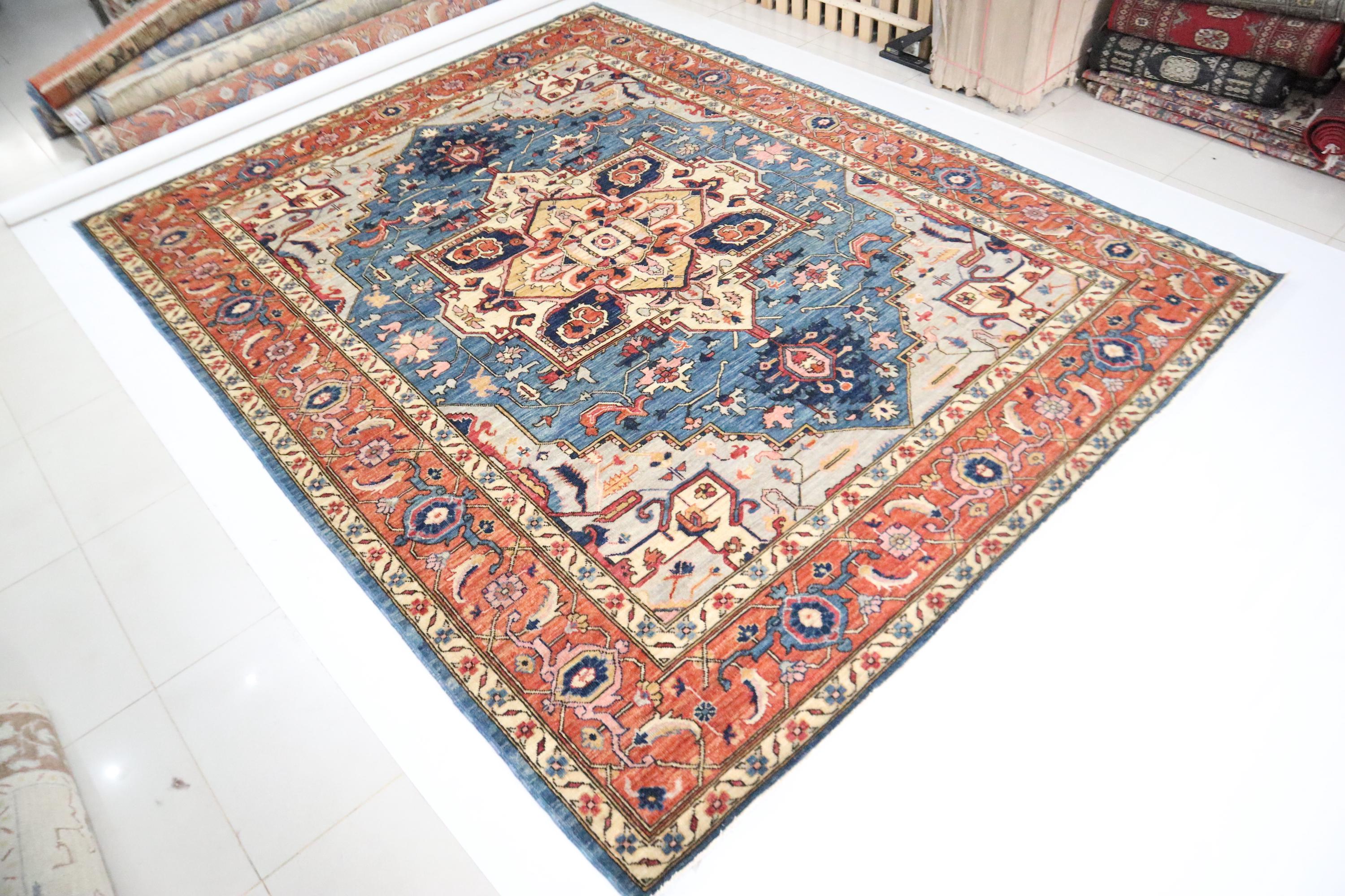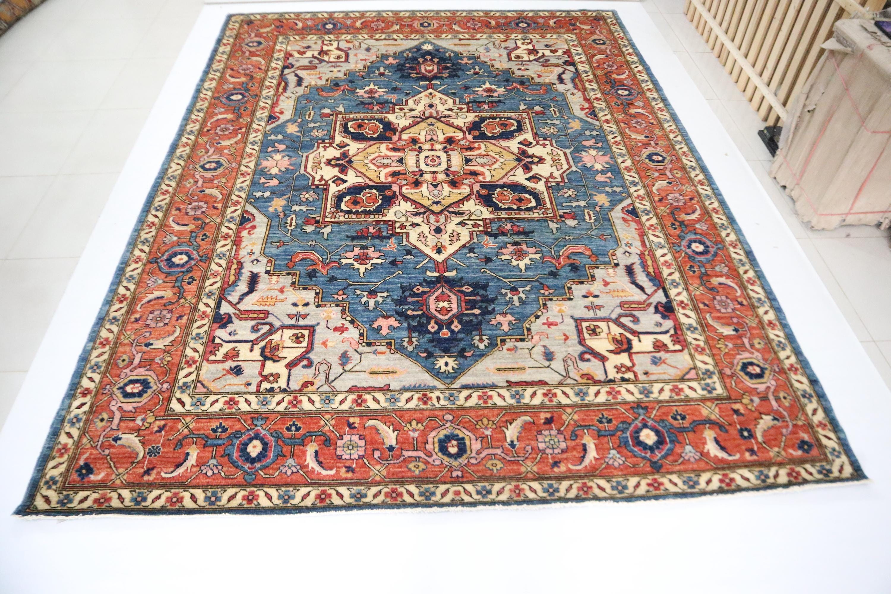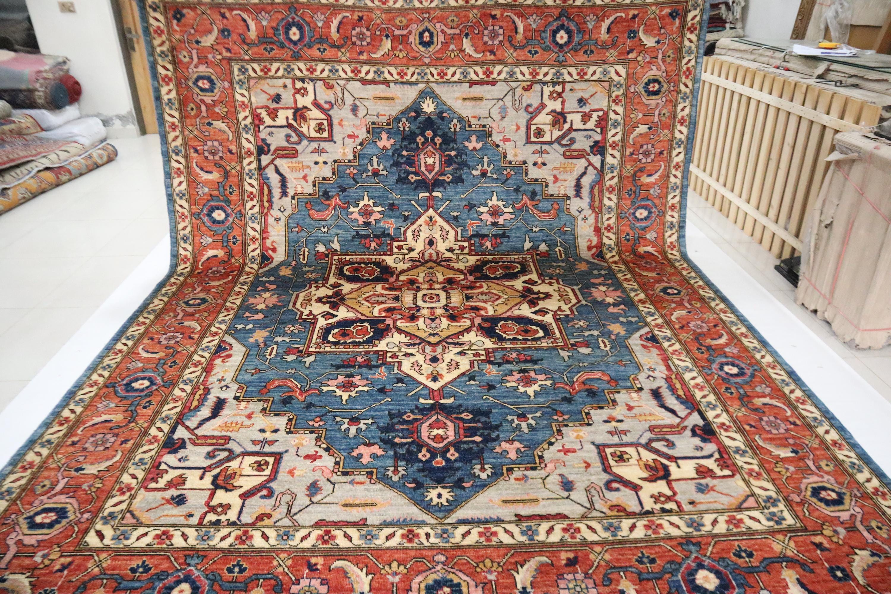 9x12 Ft Heriz Area Rug, Blue Rust Persian Style Afghan Hand Knotted Medallion Veg Dye Wool Rug, Geometric Rug, Bedroom Rug, Living Room Rug