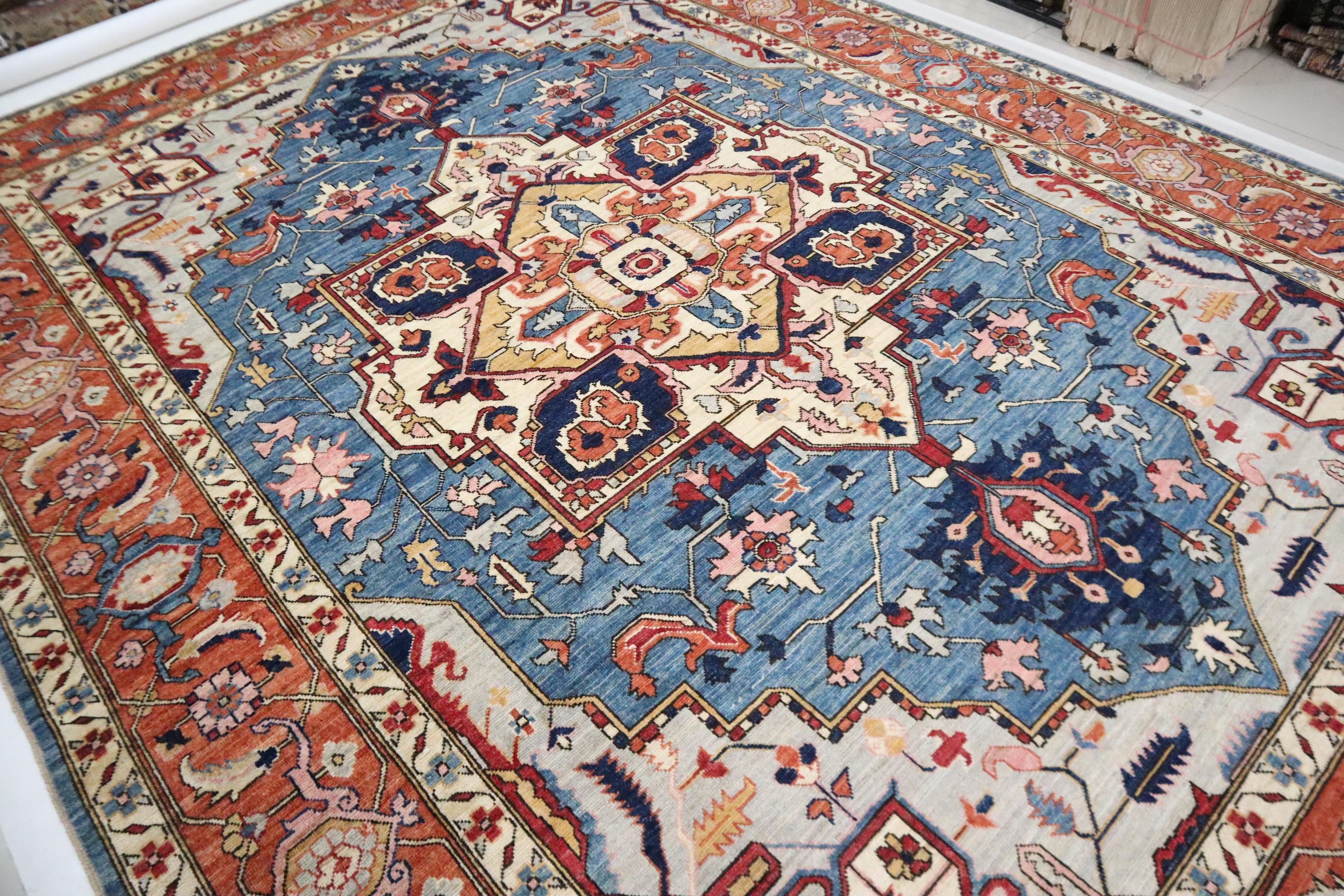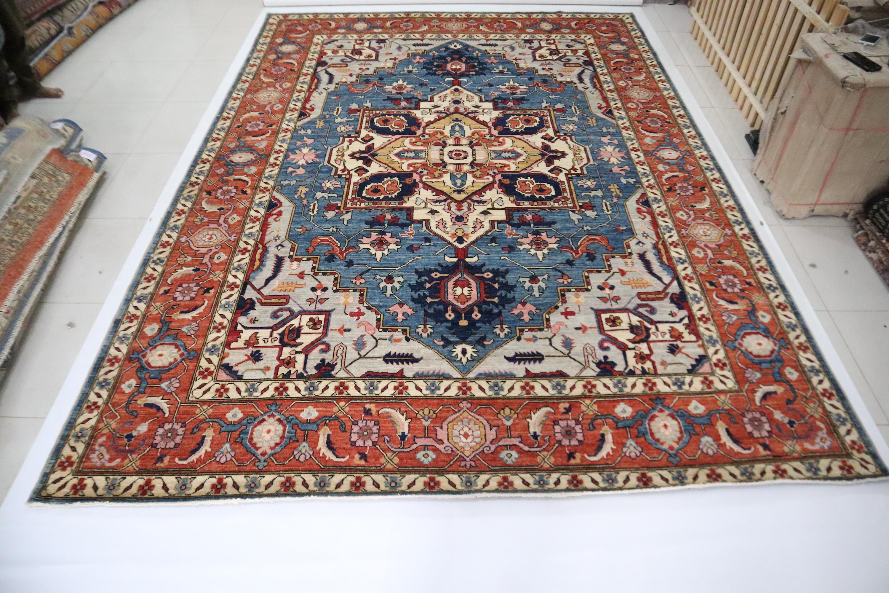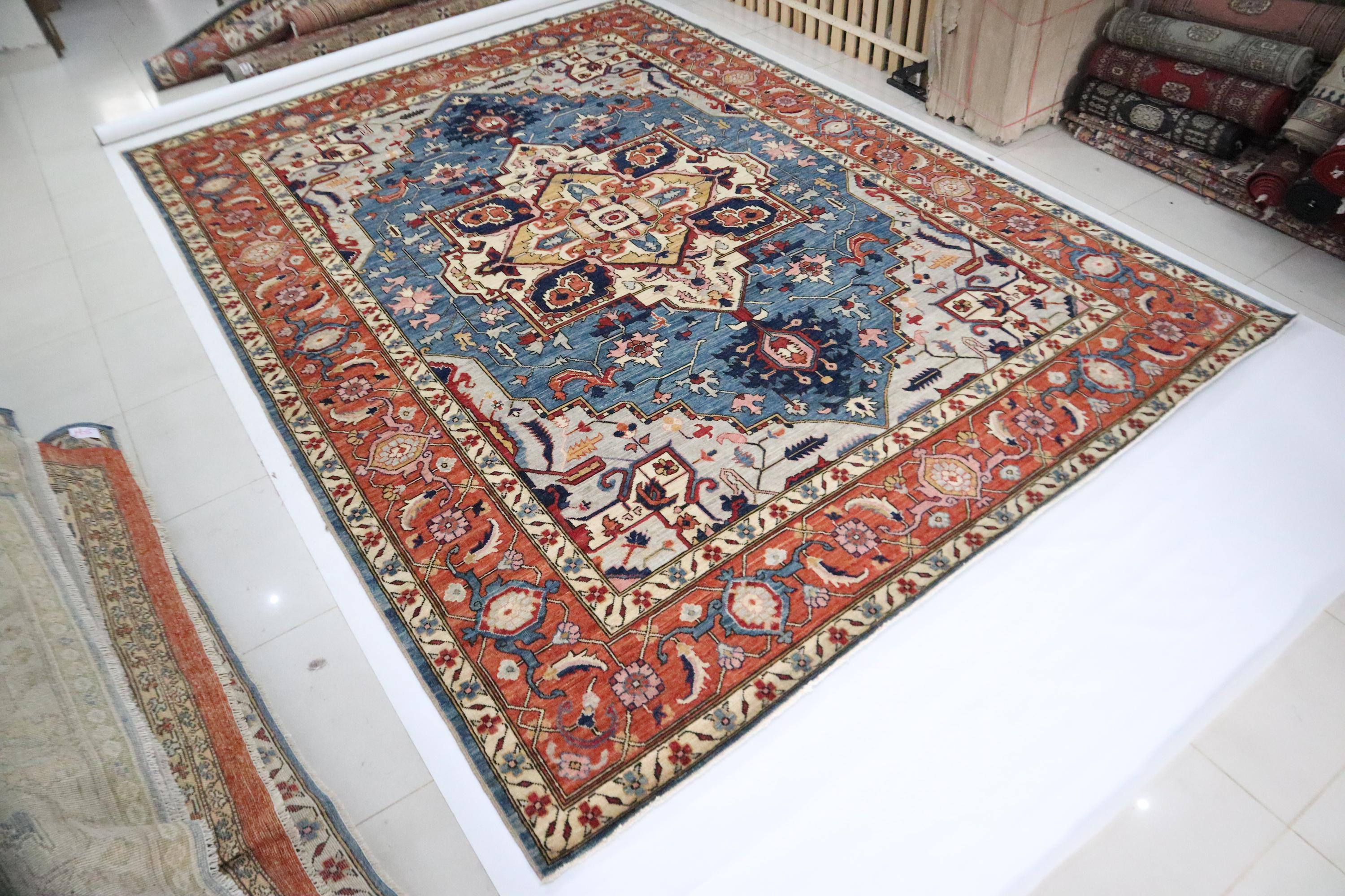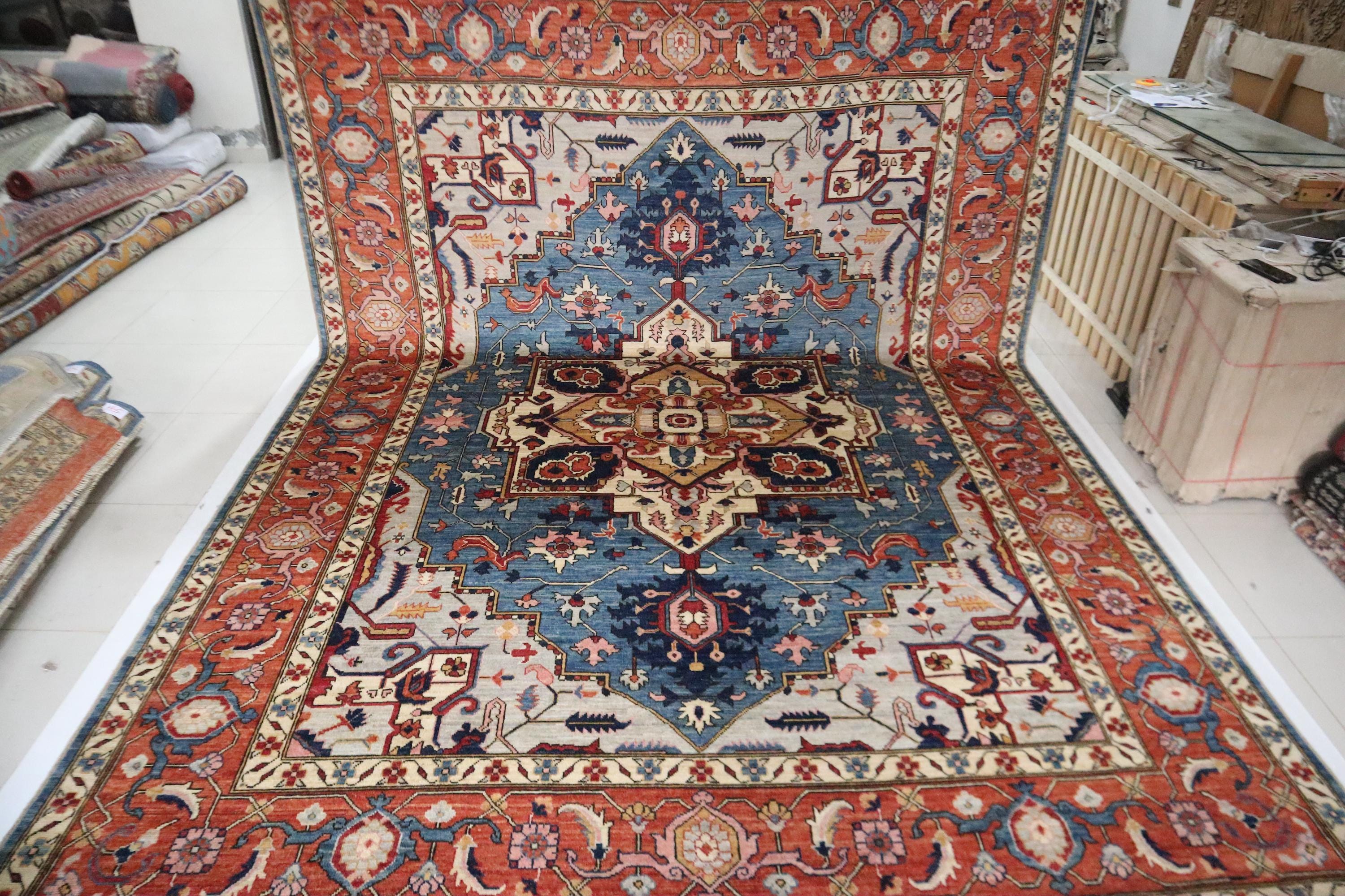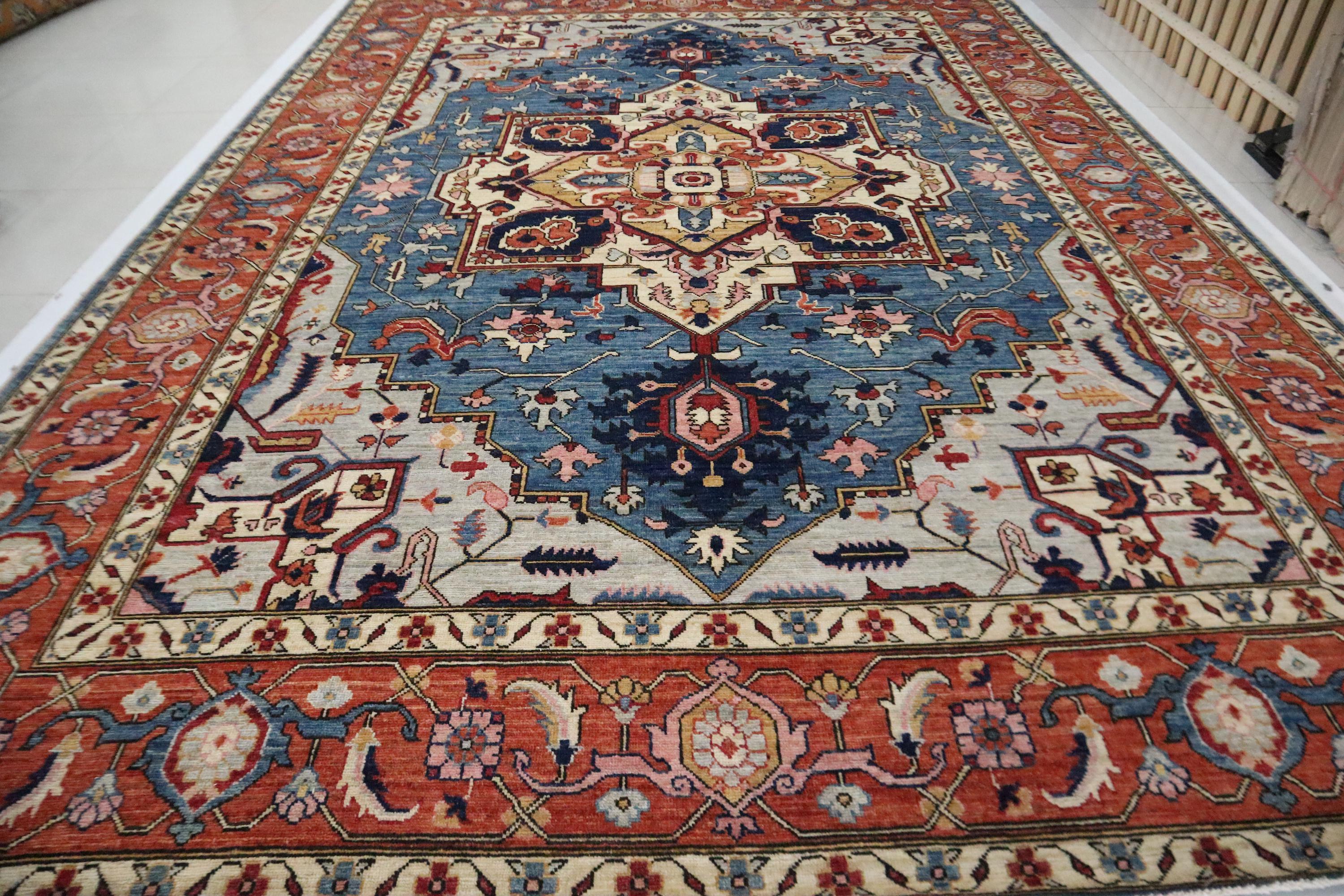 10x14 Ft Heriz Area Rug, Blue Rust Persian Style Afghan Hand Knotted Geometric Organic Dye Wool Rug, Traditional Rug, Oversize Rugs, Rugs