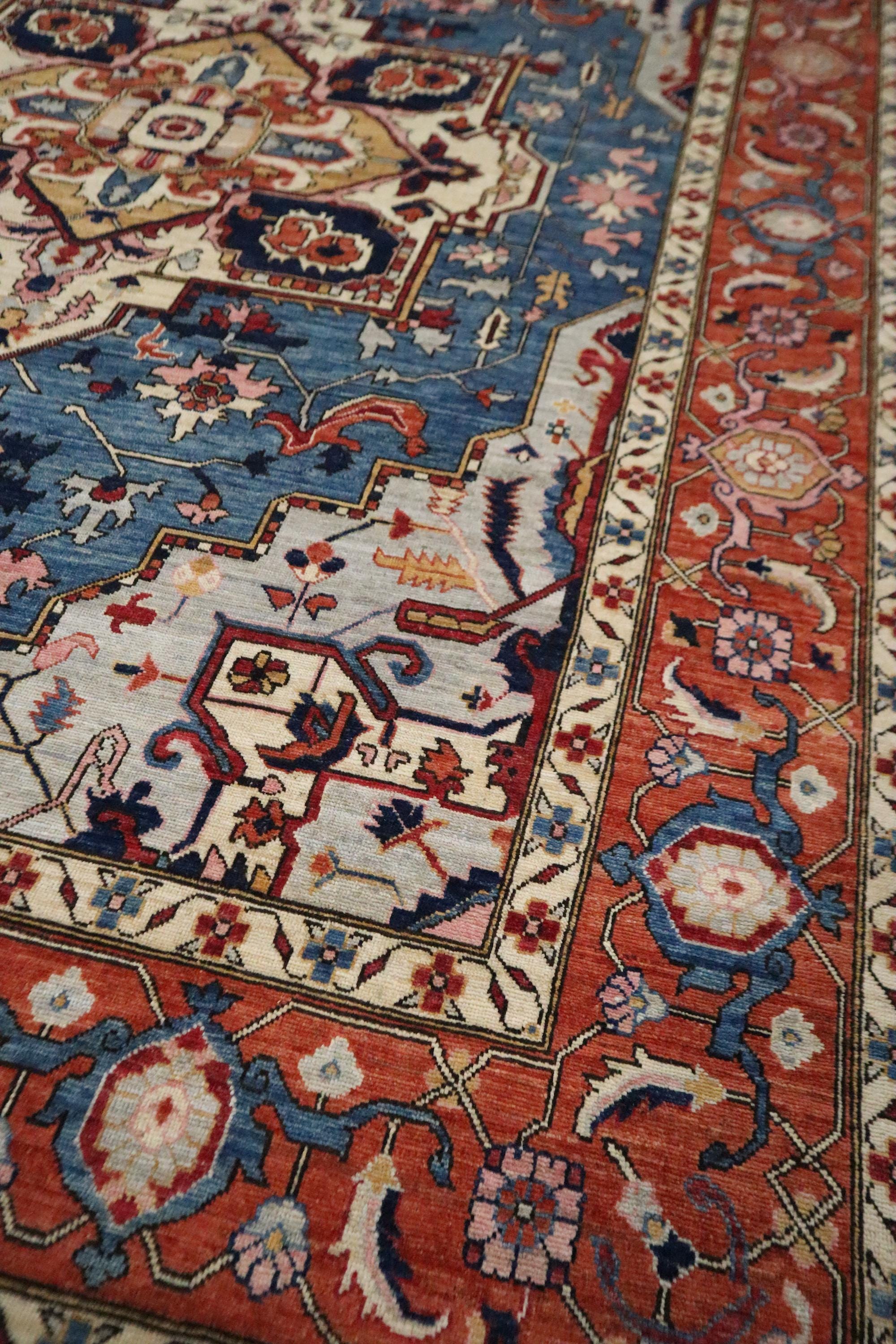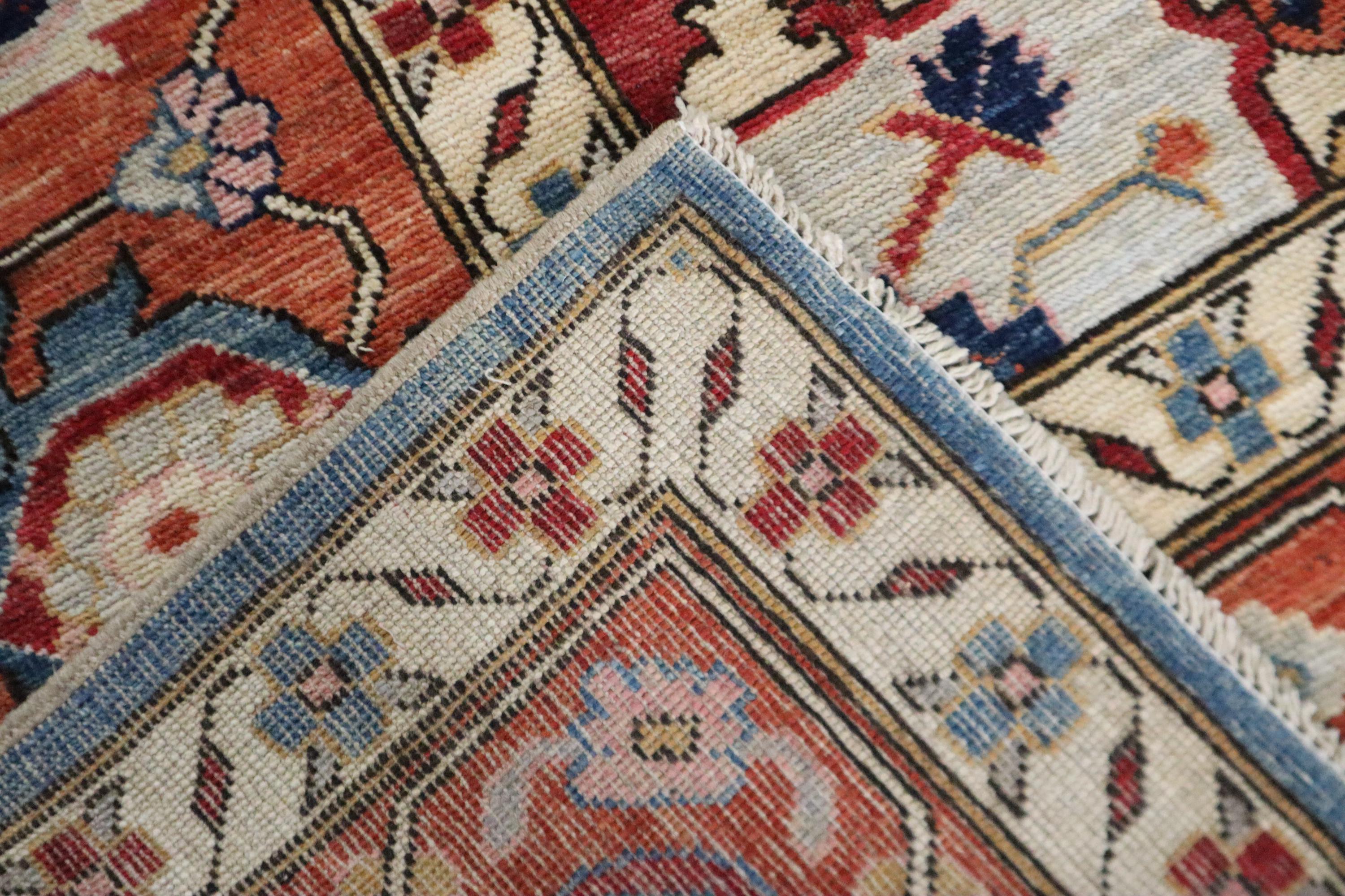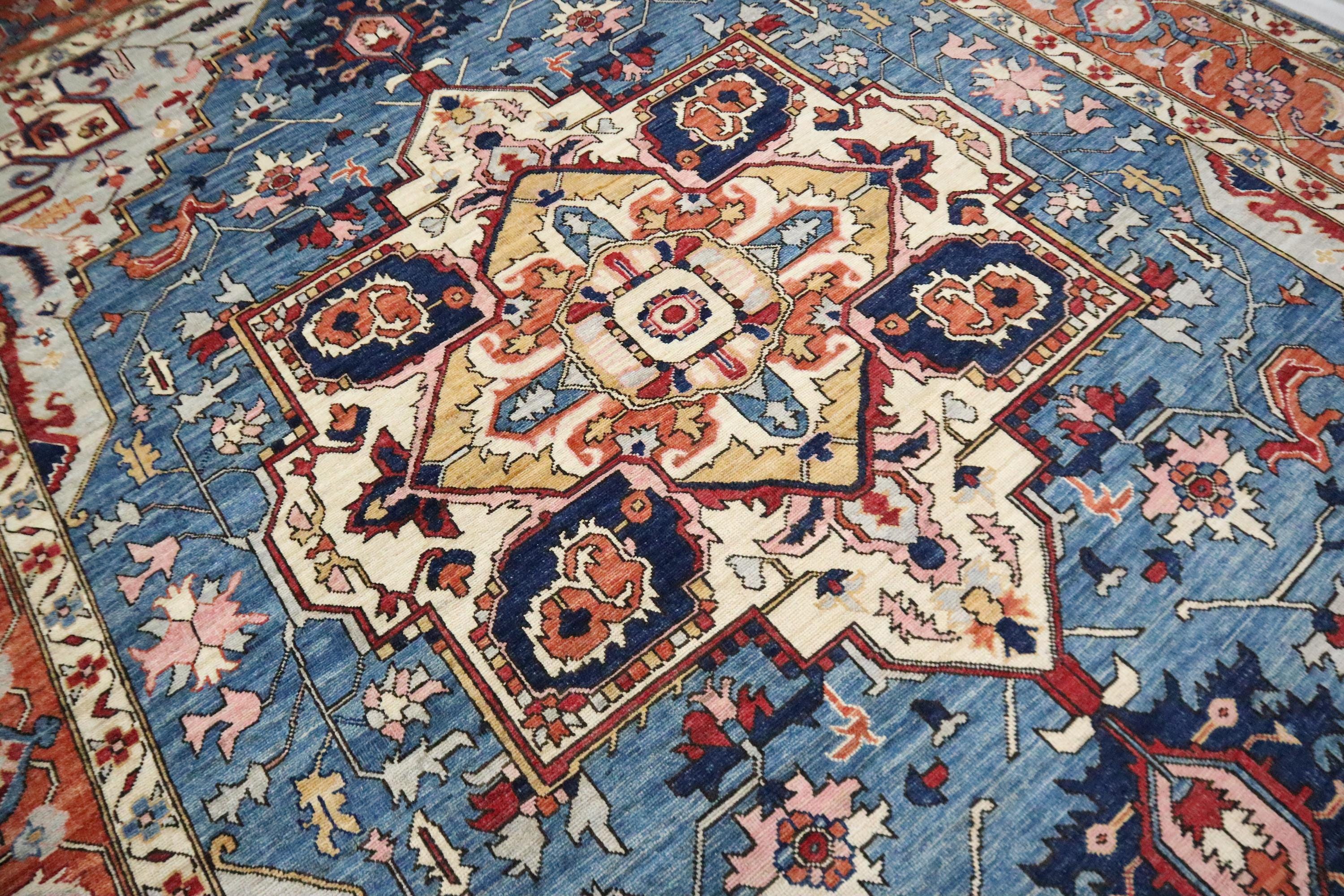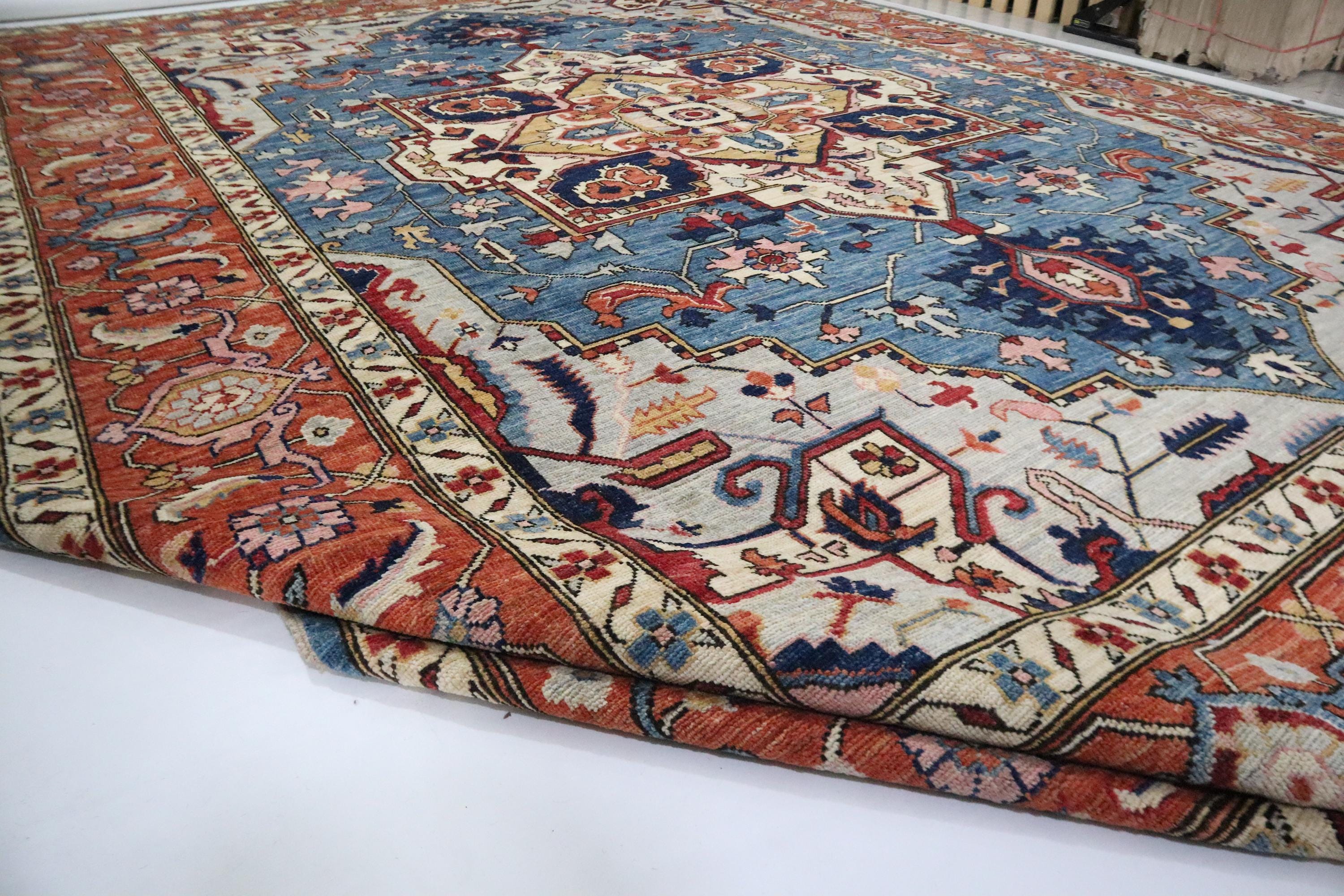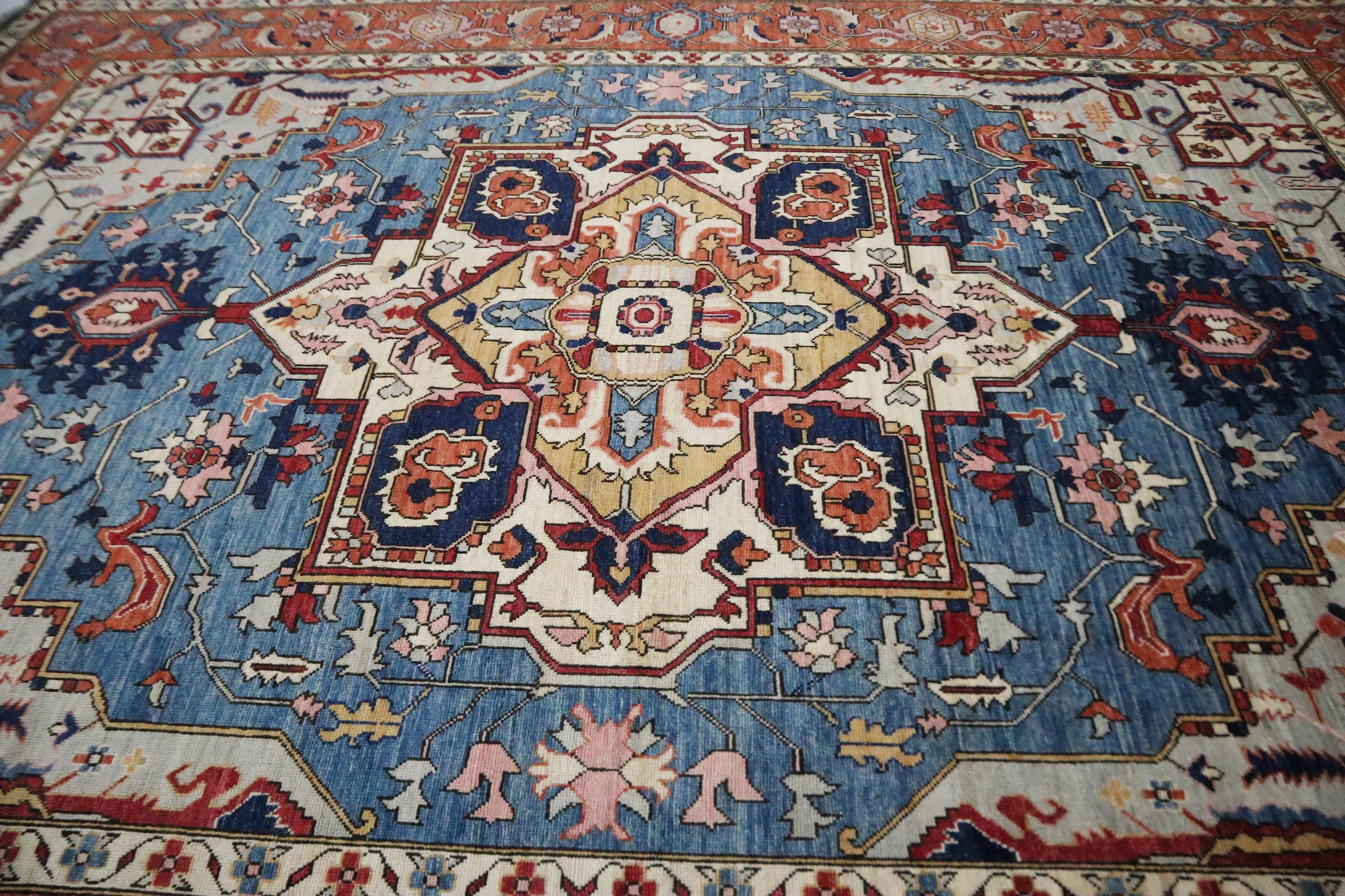 10x14 Ft Heriz Area Rug, Blue Rust Persian Style Afghan Hand Knotted Geometric Organic Dye Wool Rug, Traditional Rug, Oversize Rugs, Rugs