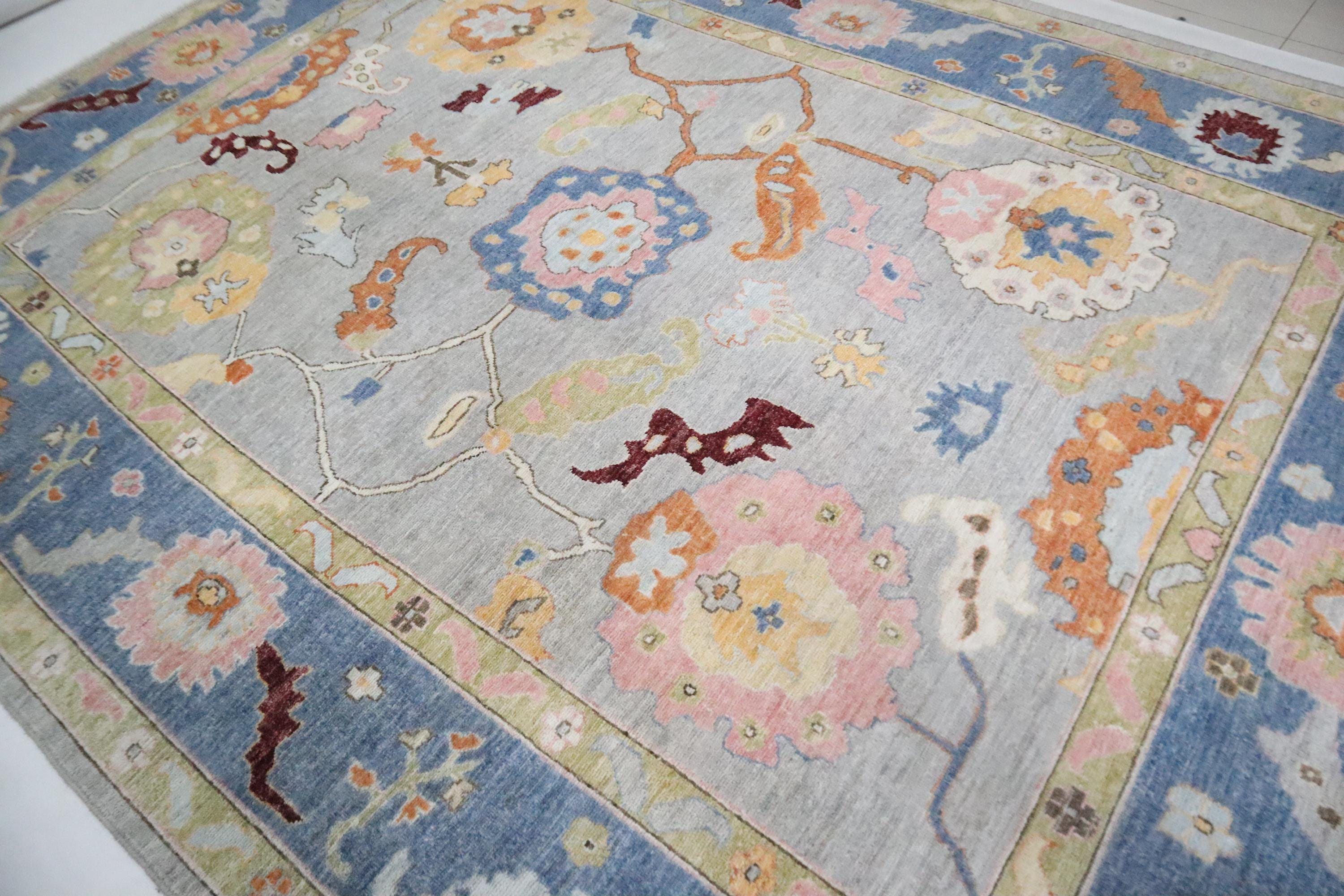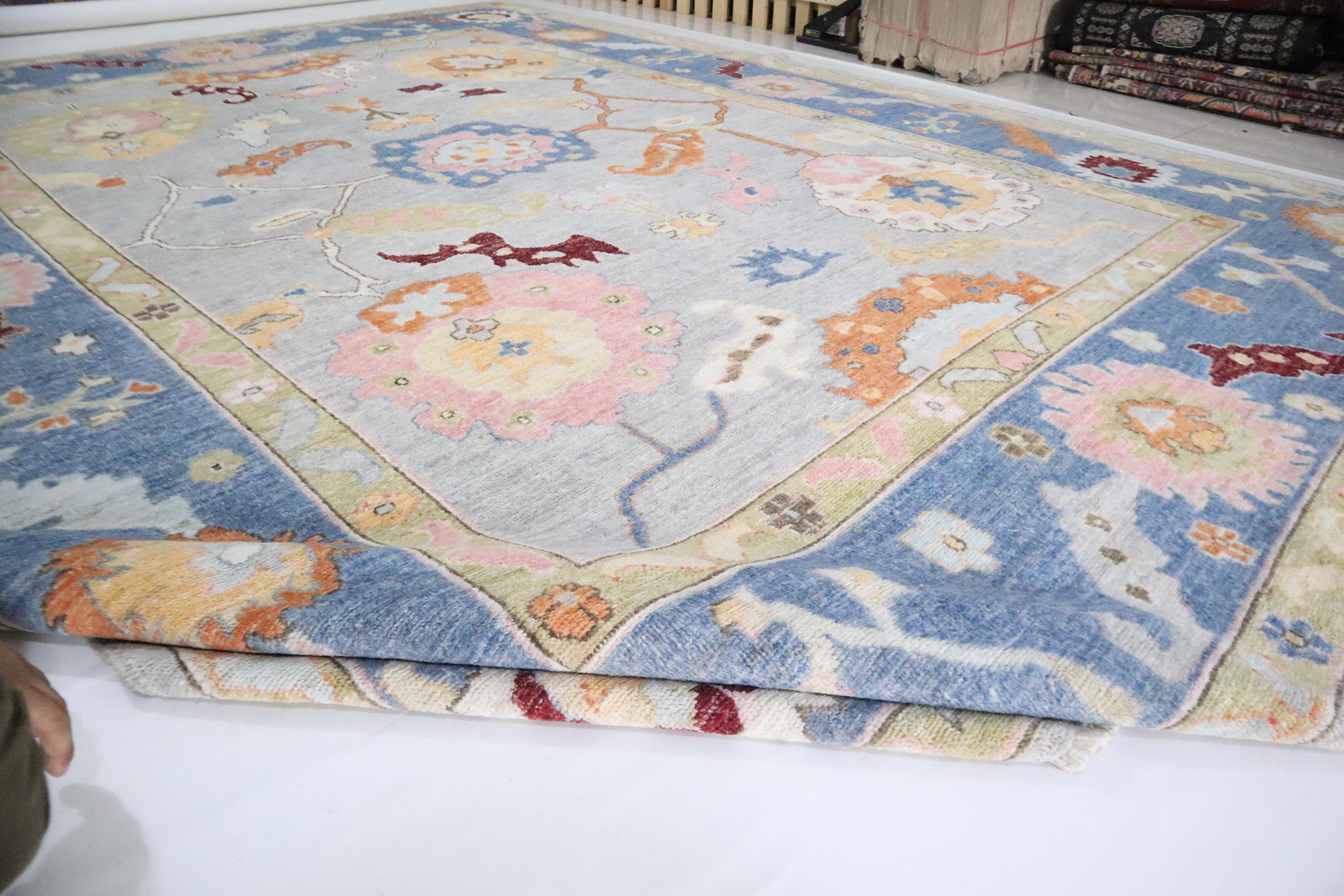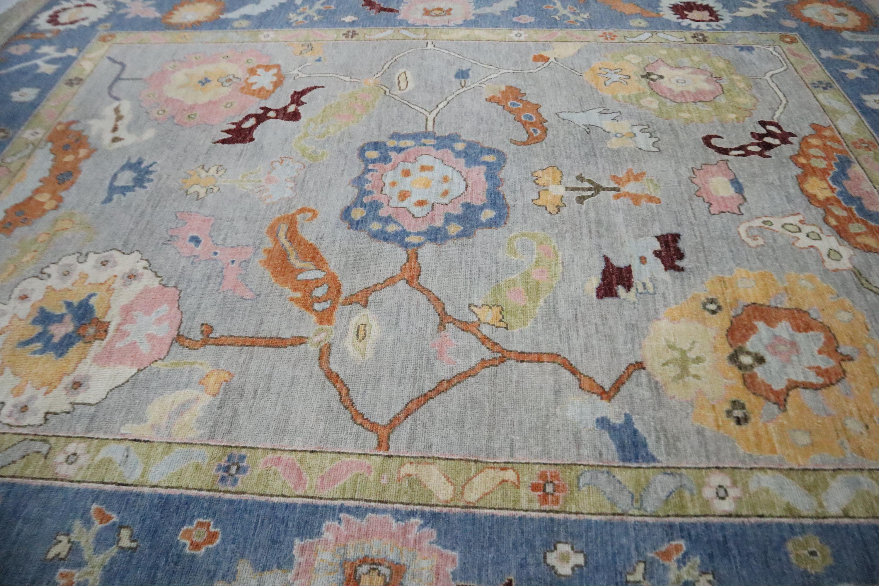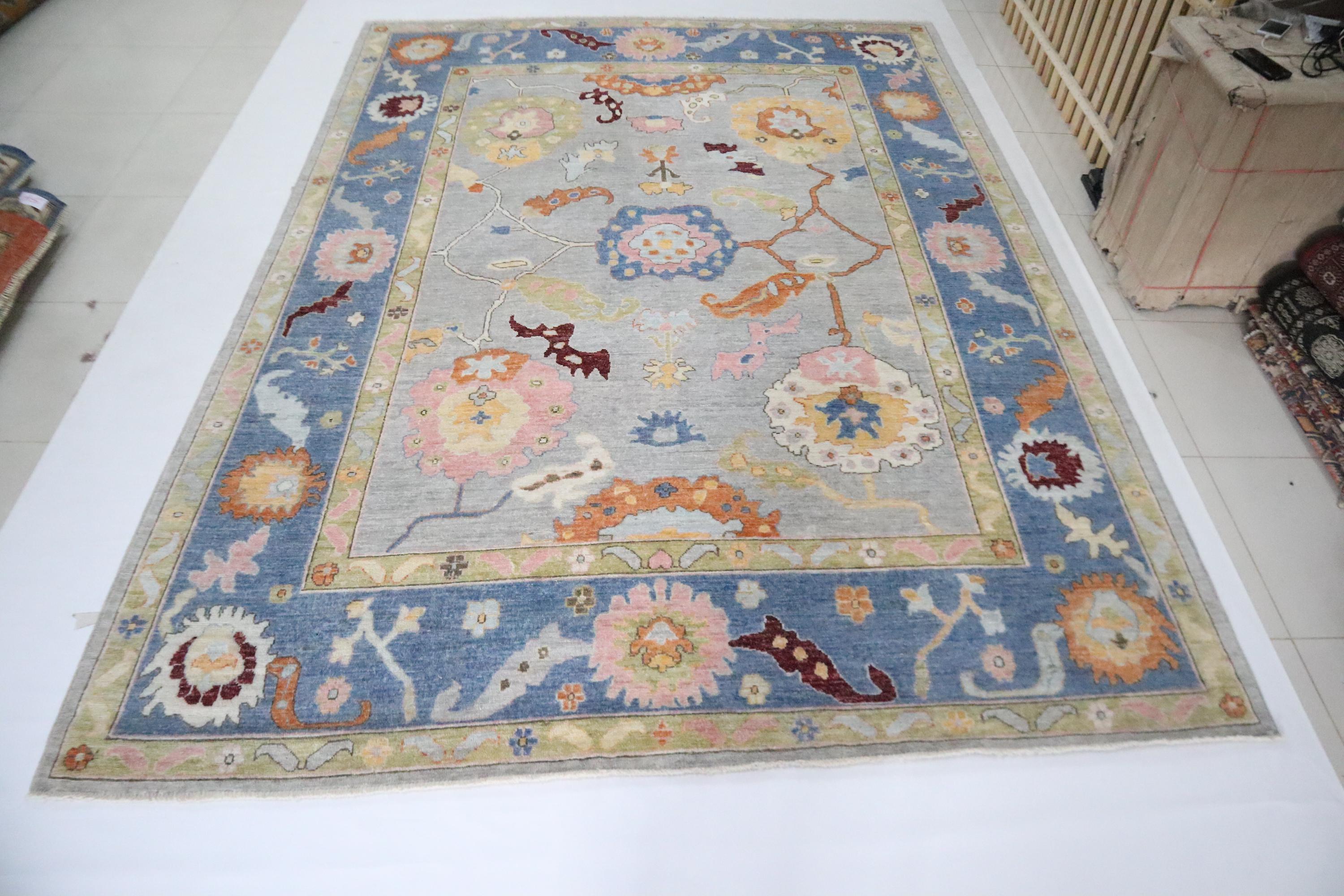 9x12 Ft Oushak Area Rug, Gray Blue Turkish Hand Knotted Floral Style Soft Wool Rug, Traditional Rug, Bedroom Rug, Living & Dining Room Rug