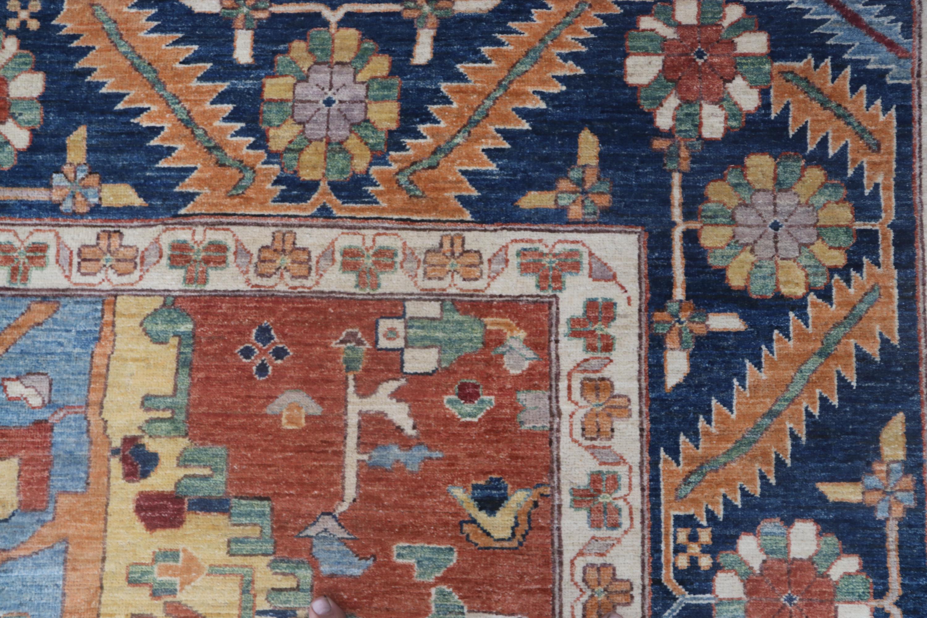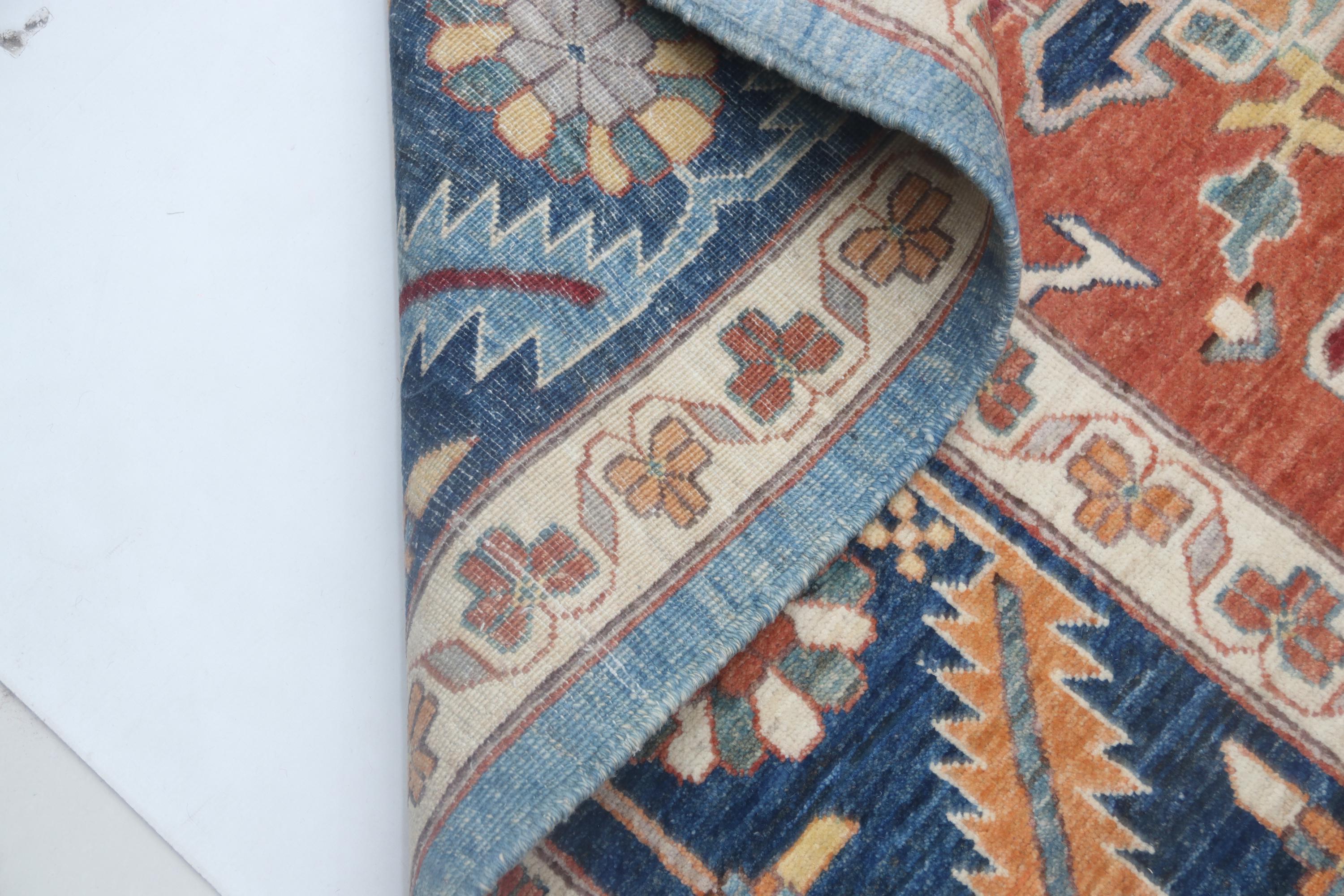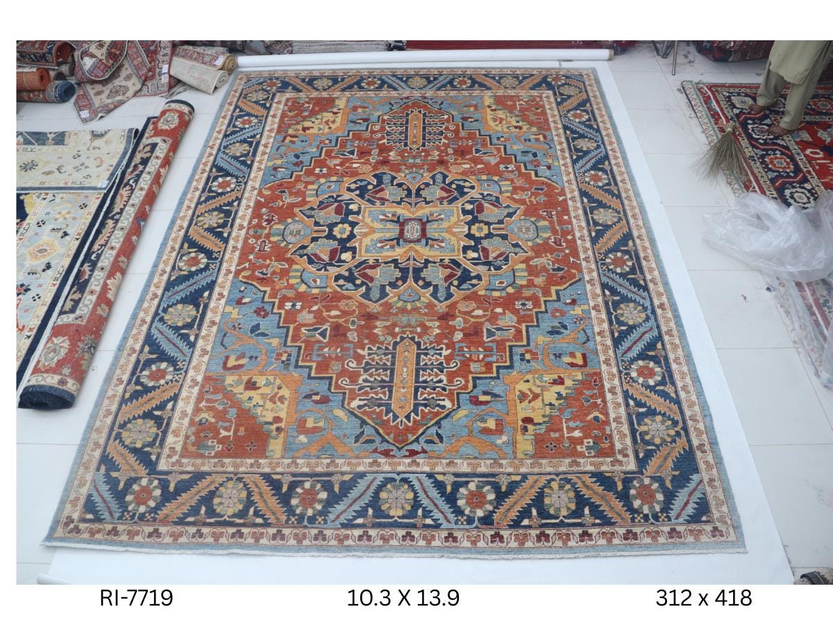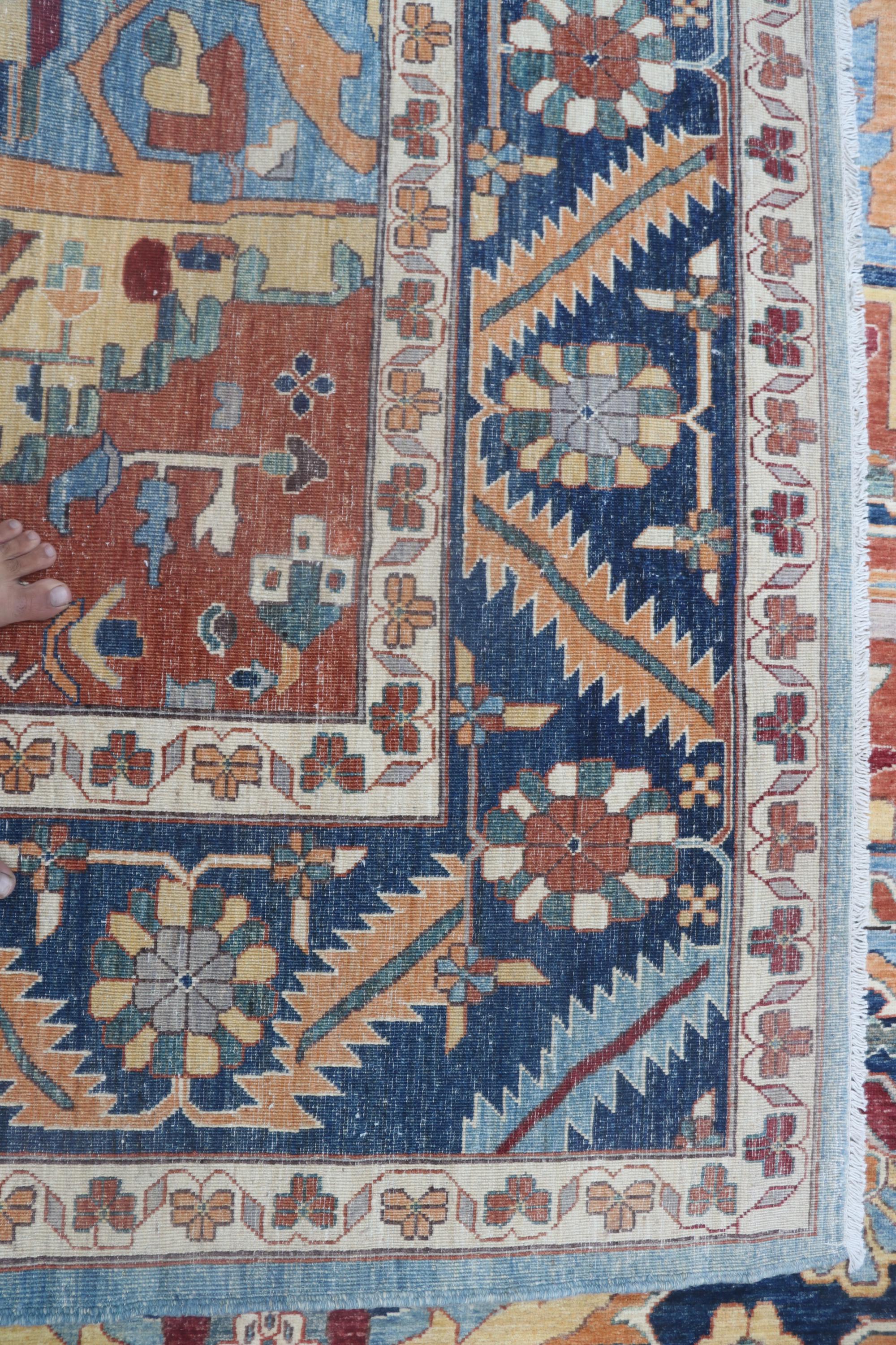 this rug in Orange with a Blue border brings elegance to any room.