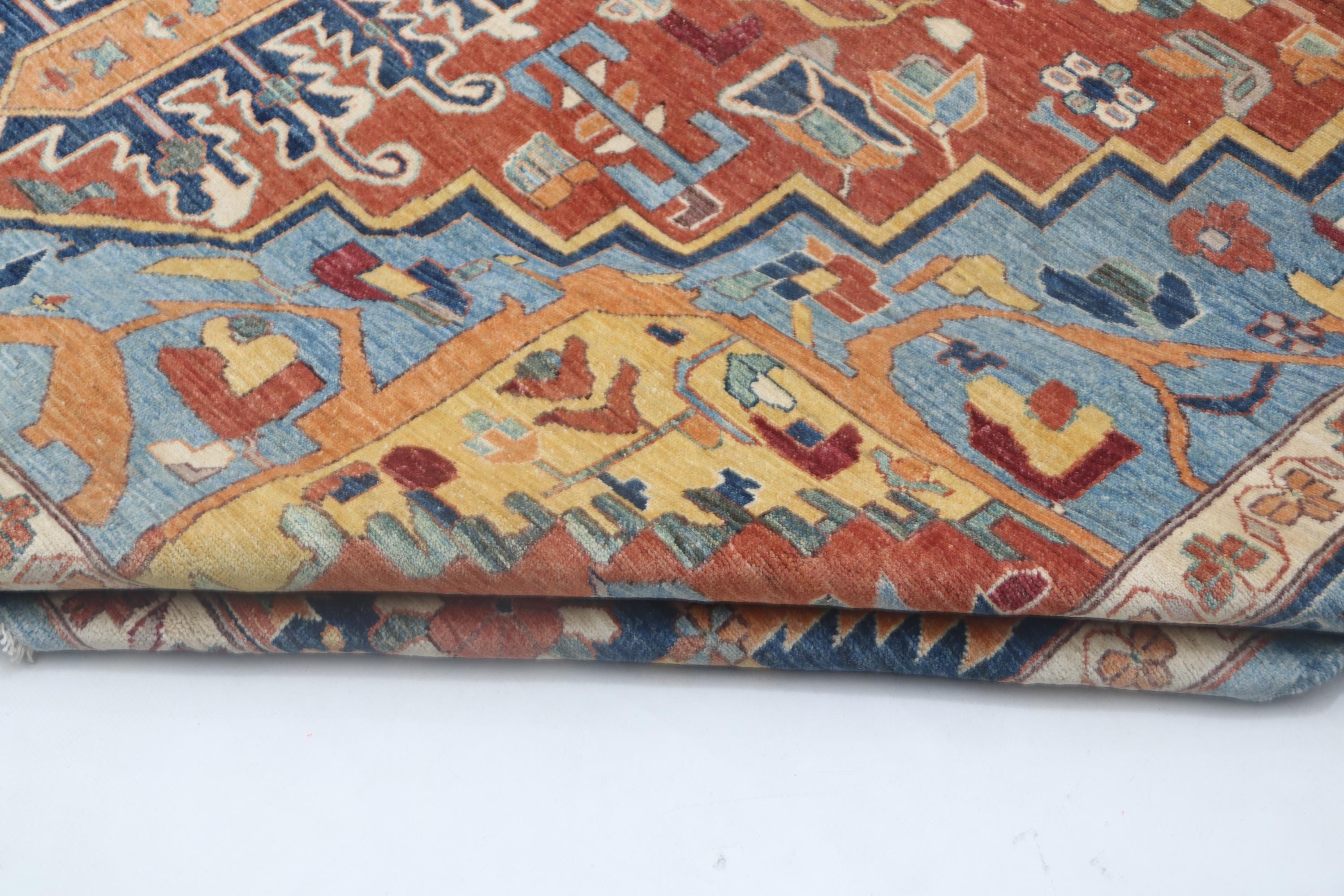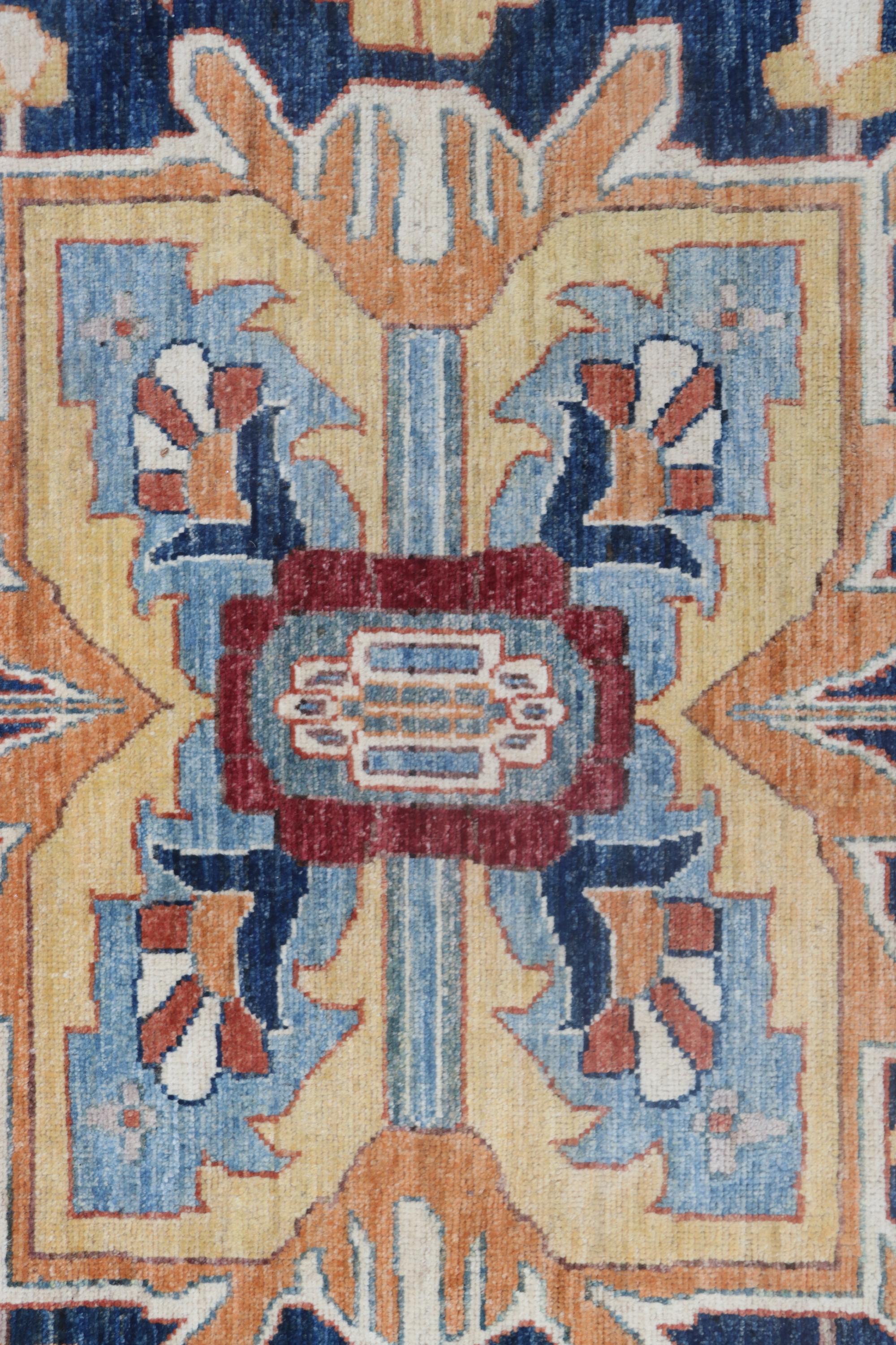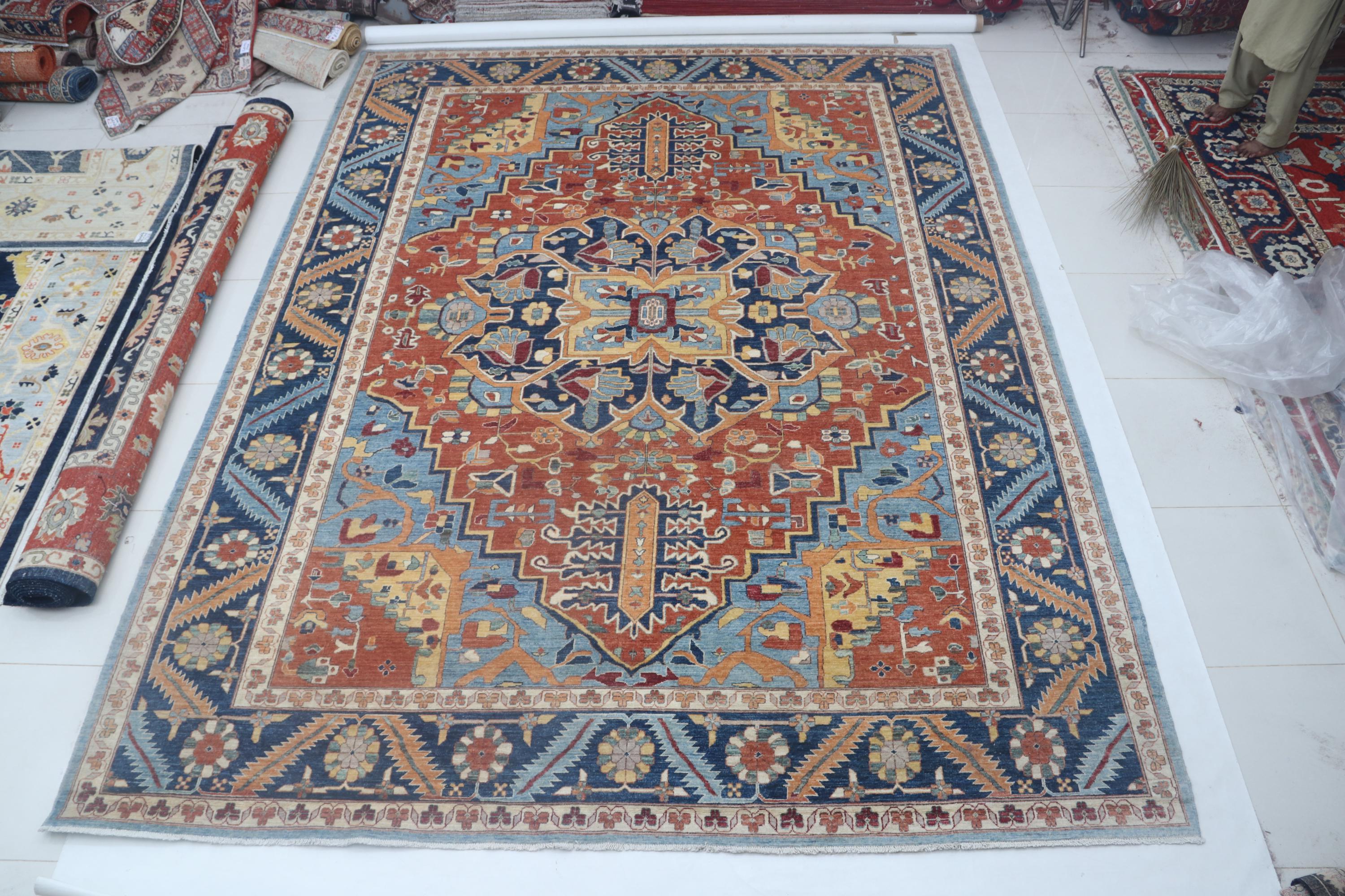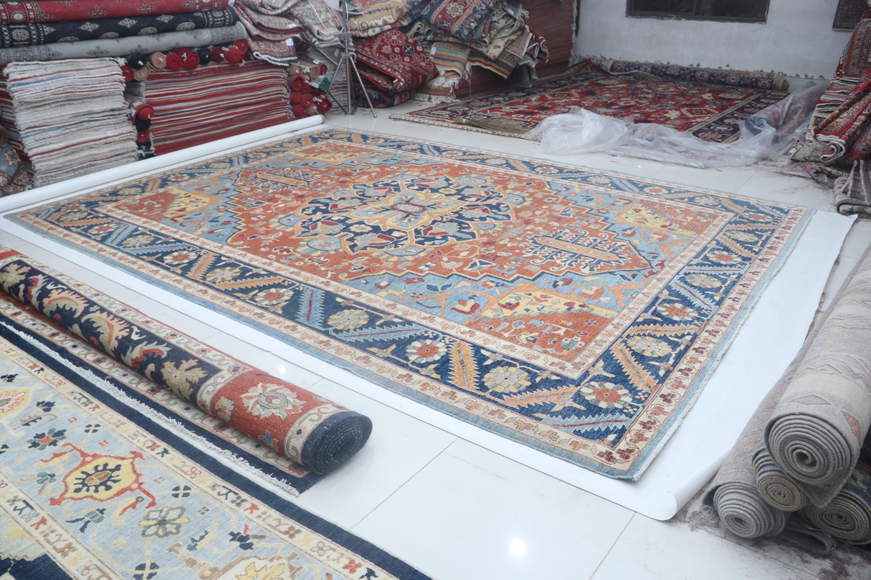 this rug in Orange with a Blue border brings elegance to any room.