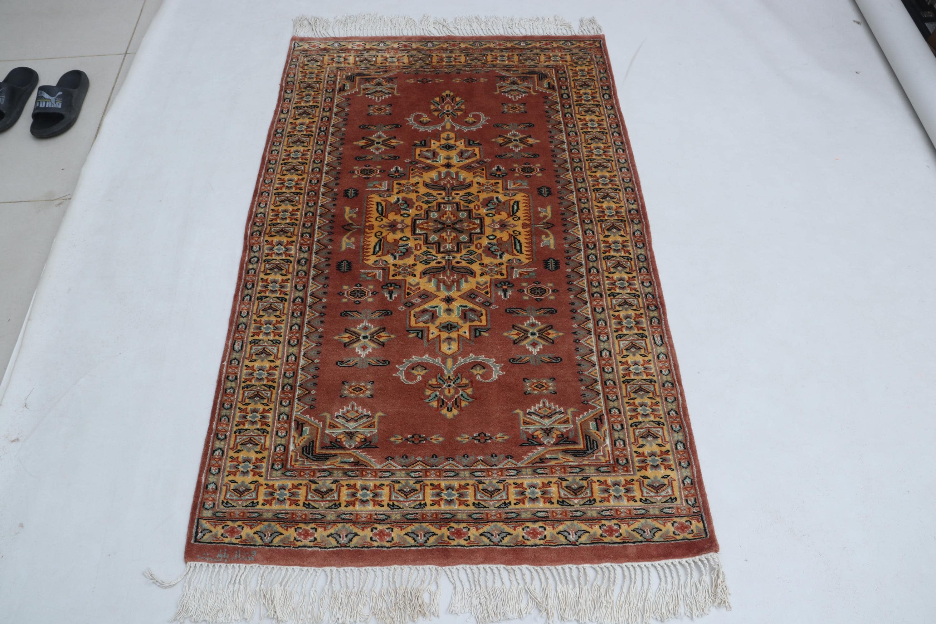 this rug in Red with a Orange border brings elegance to any room.