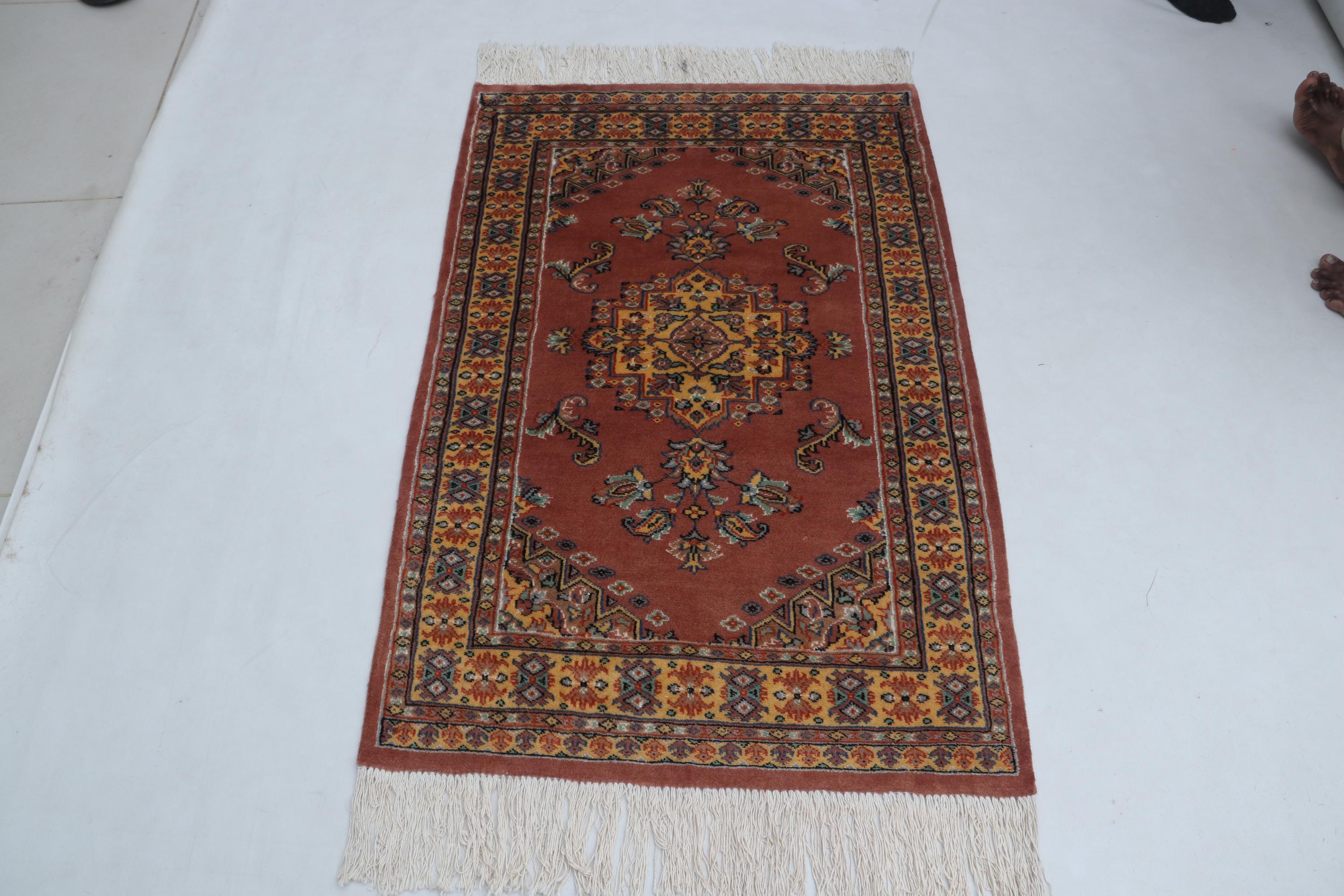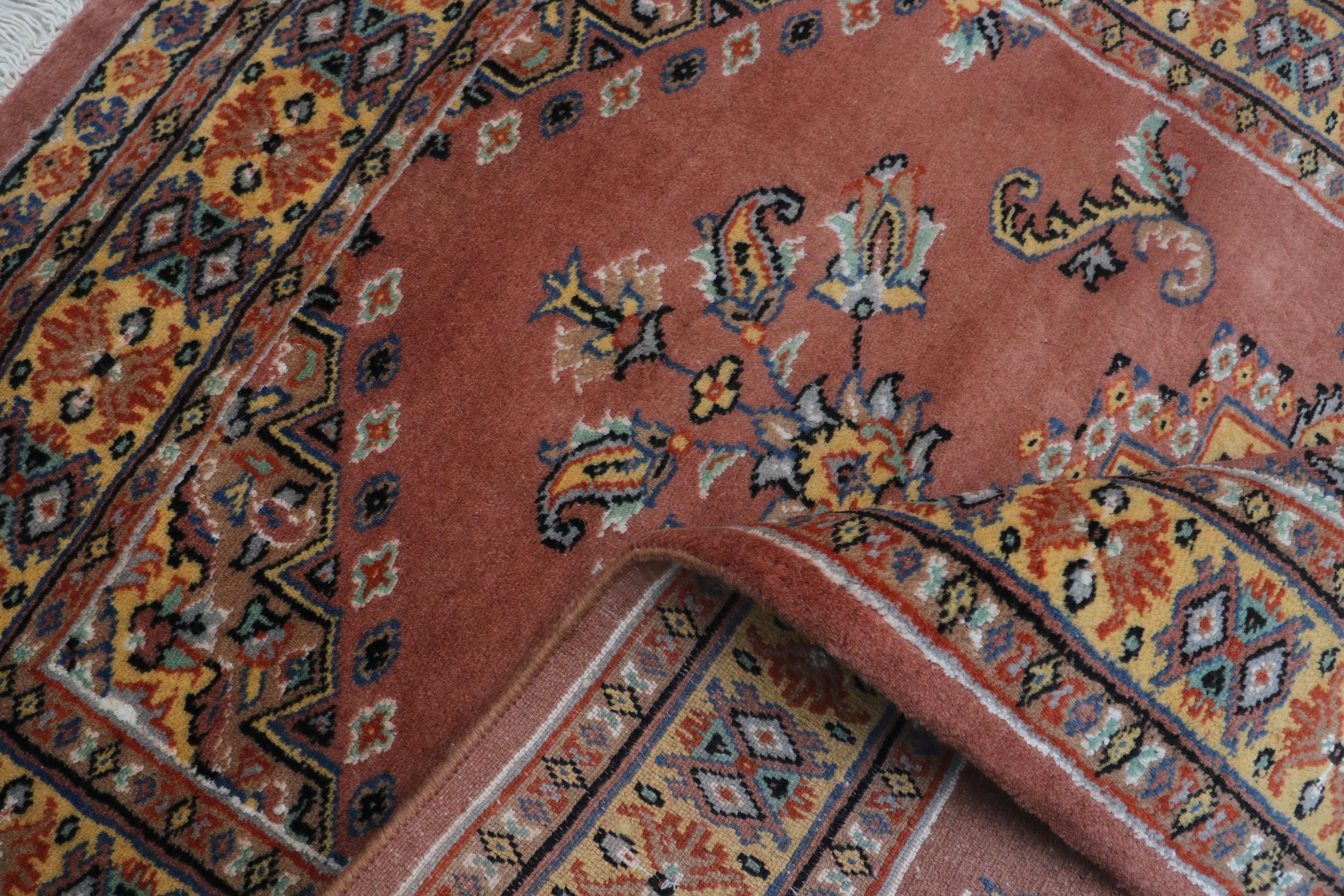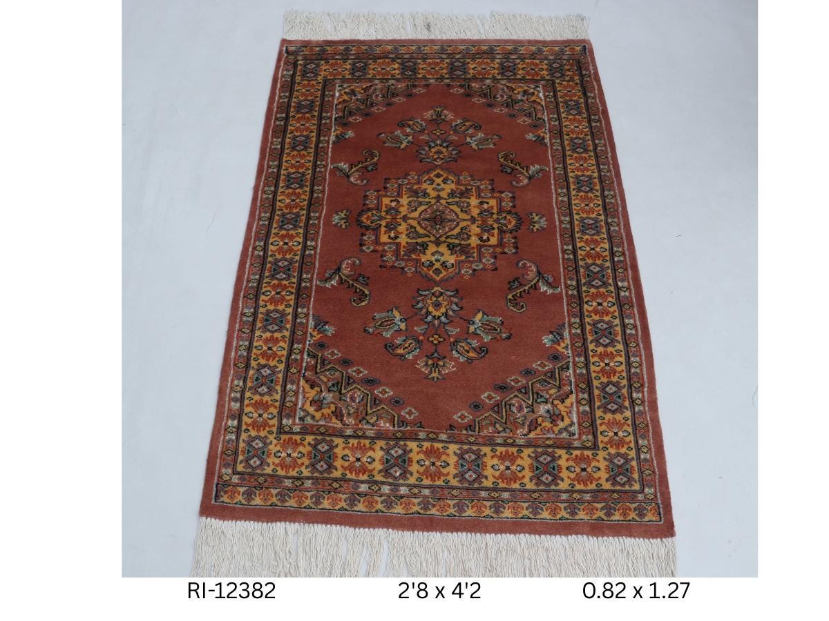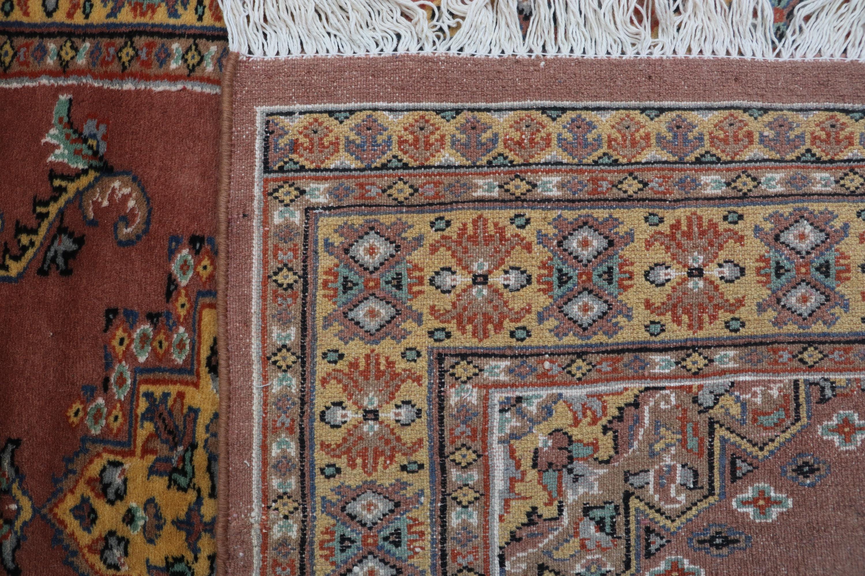 Hand-knotted Cotton Wool Silk Rug, Geometric Copper and Yellow, 2.8 x 4.2 ft