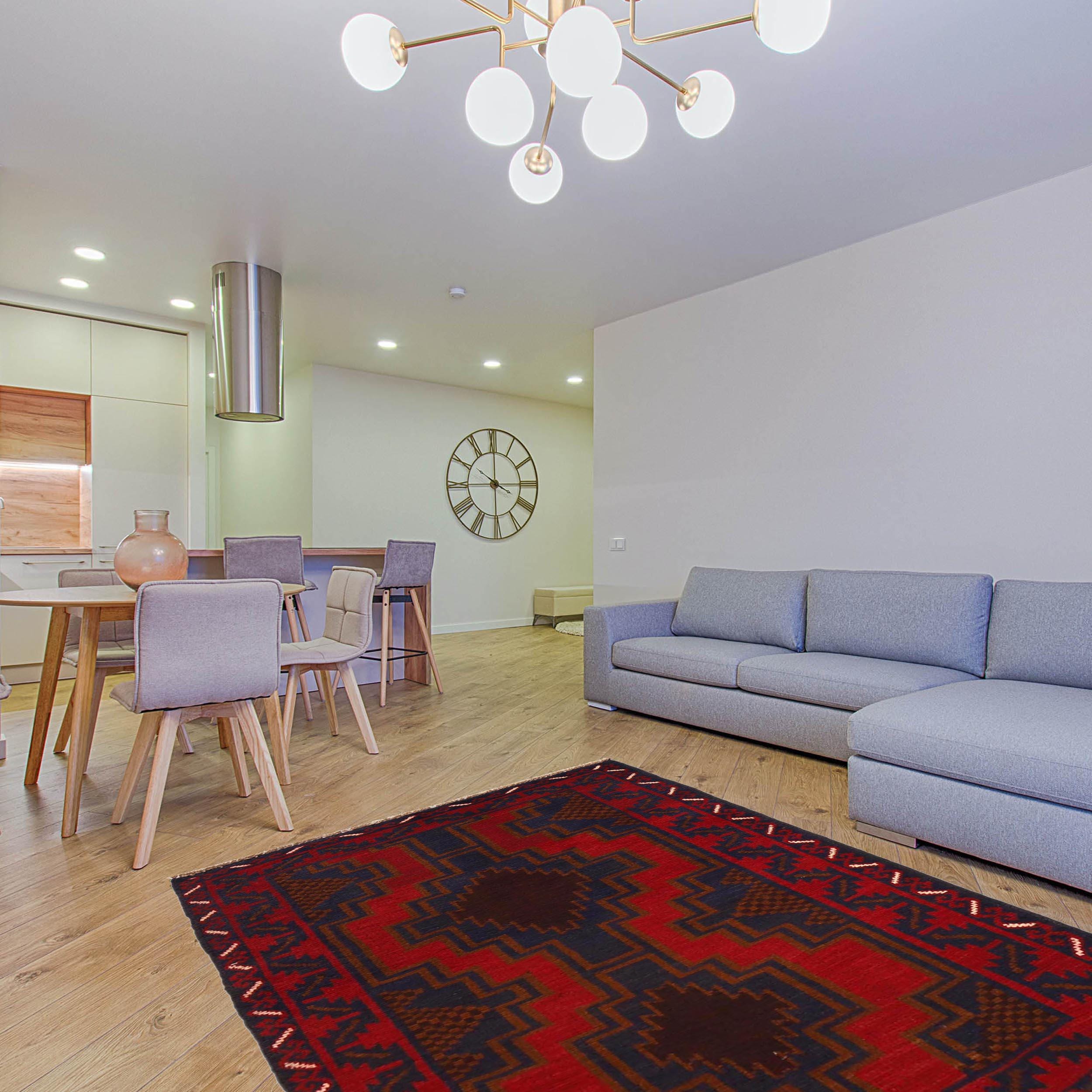 Designed in a Geomatrical style, it showcases Vegetable Dyeing tones for a unique look in Red and Blue colour. Made with Wool, this rug is built to last .
