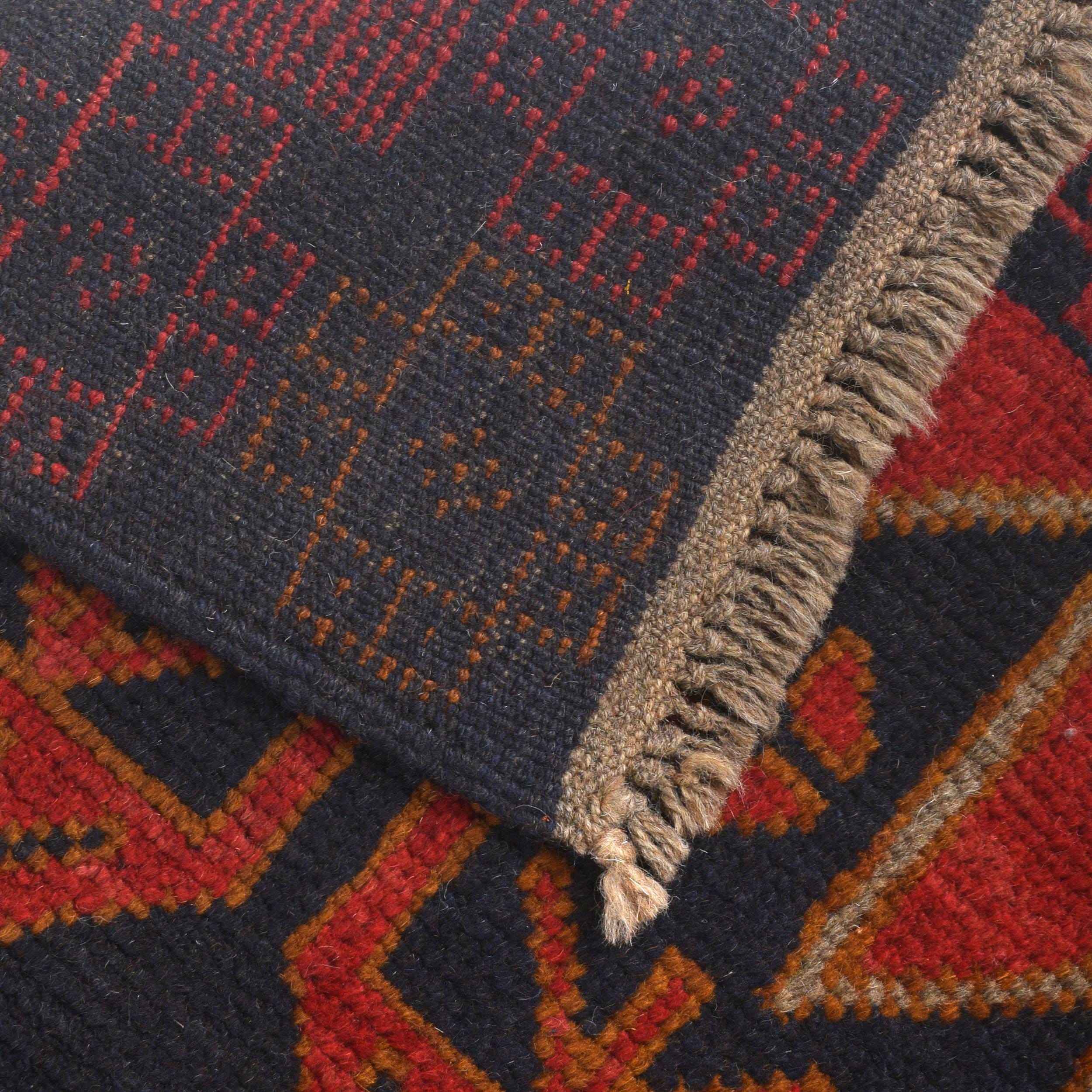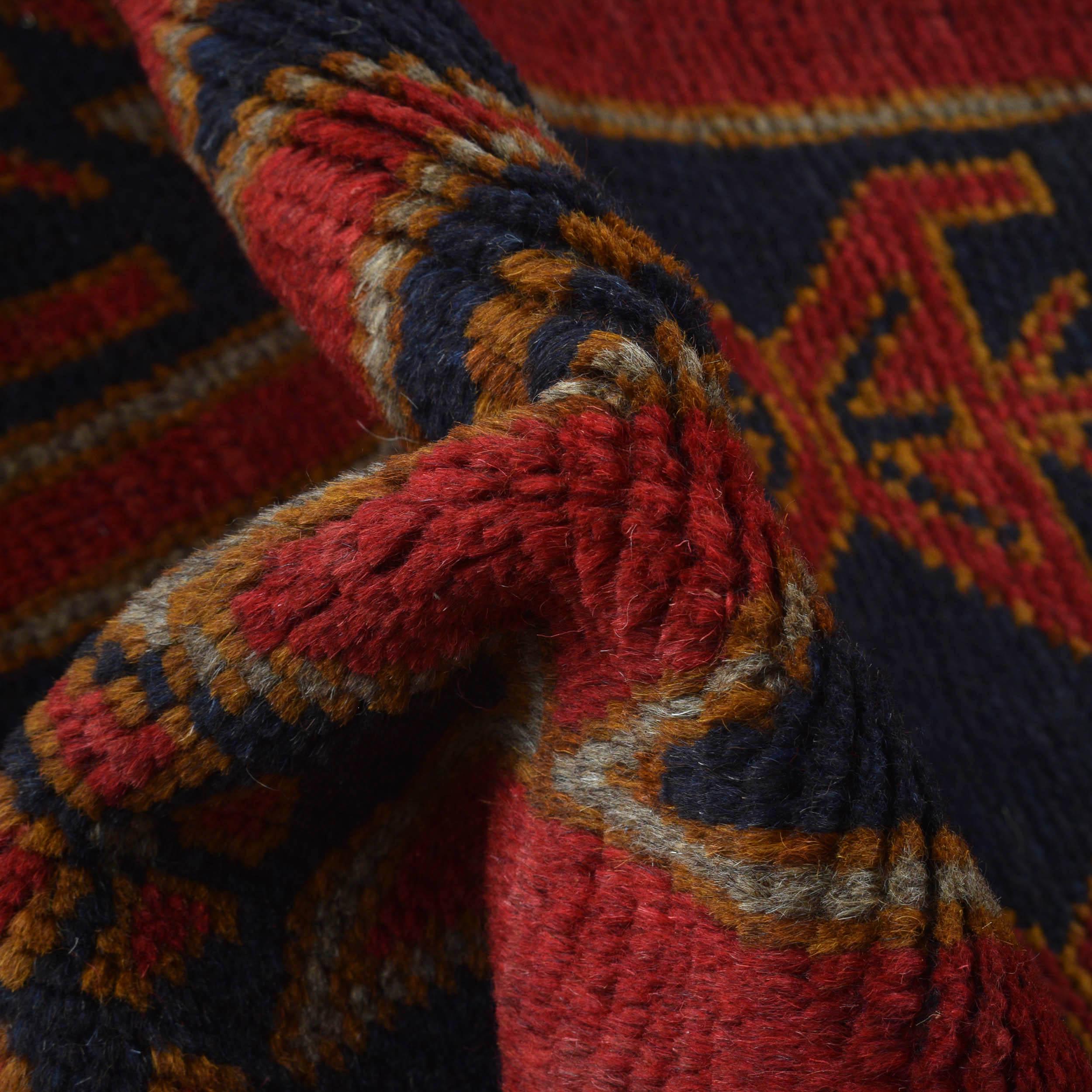 Elevate your décor with the Baluchi, a luxury handmade Geomatrical rug. Featuring a rich Blue and Red this rug blends beauty and durability with its wool texture. Standard Size: 3.93 X 6.56 ft