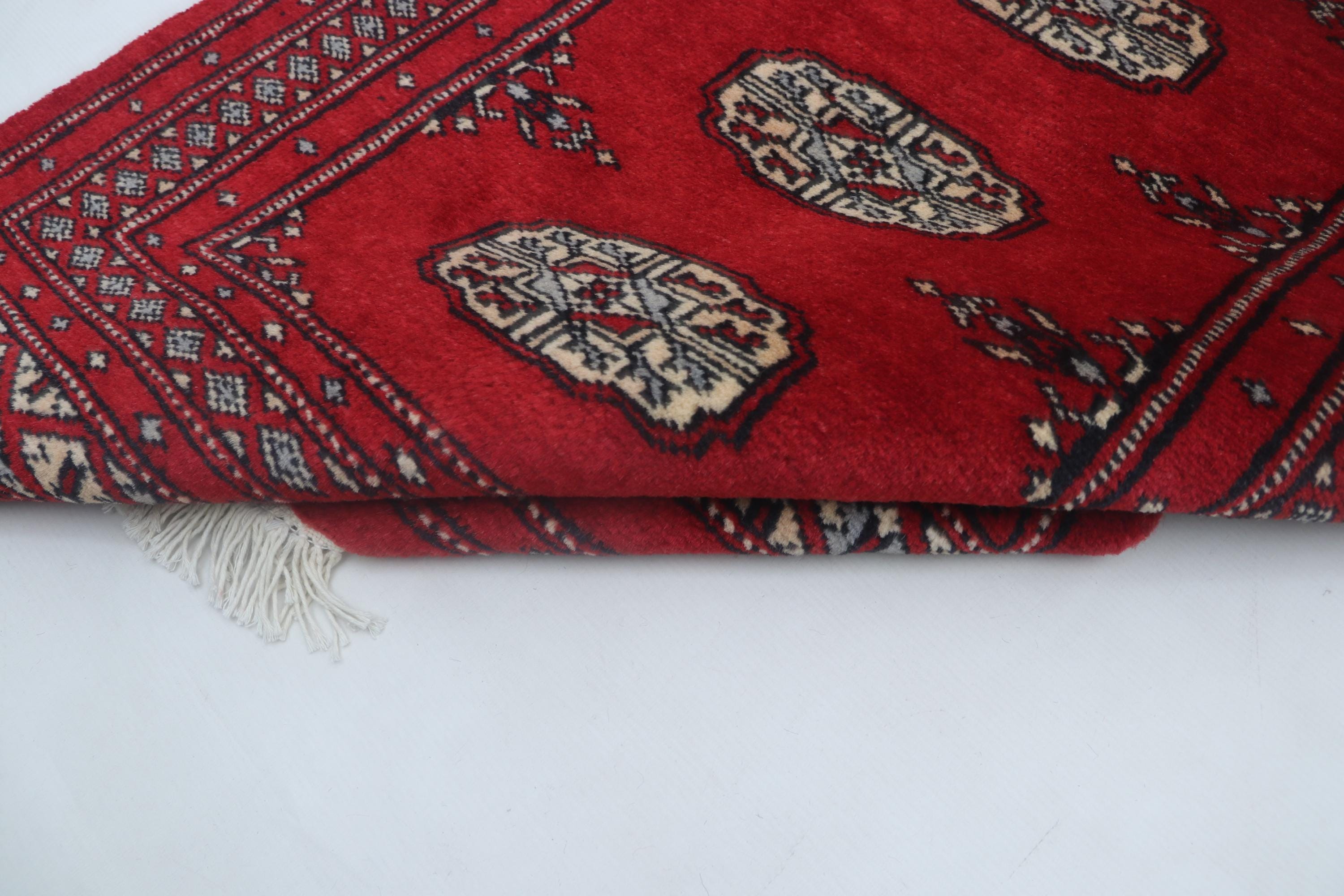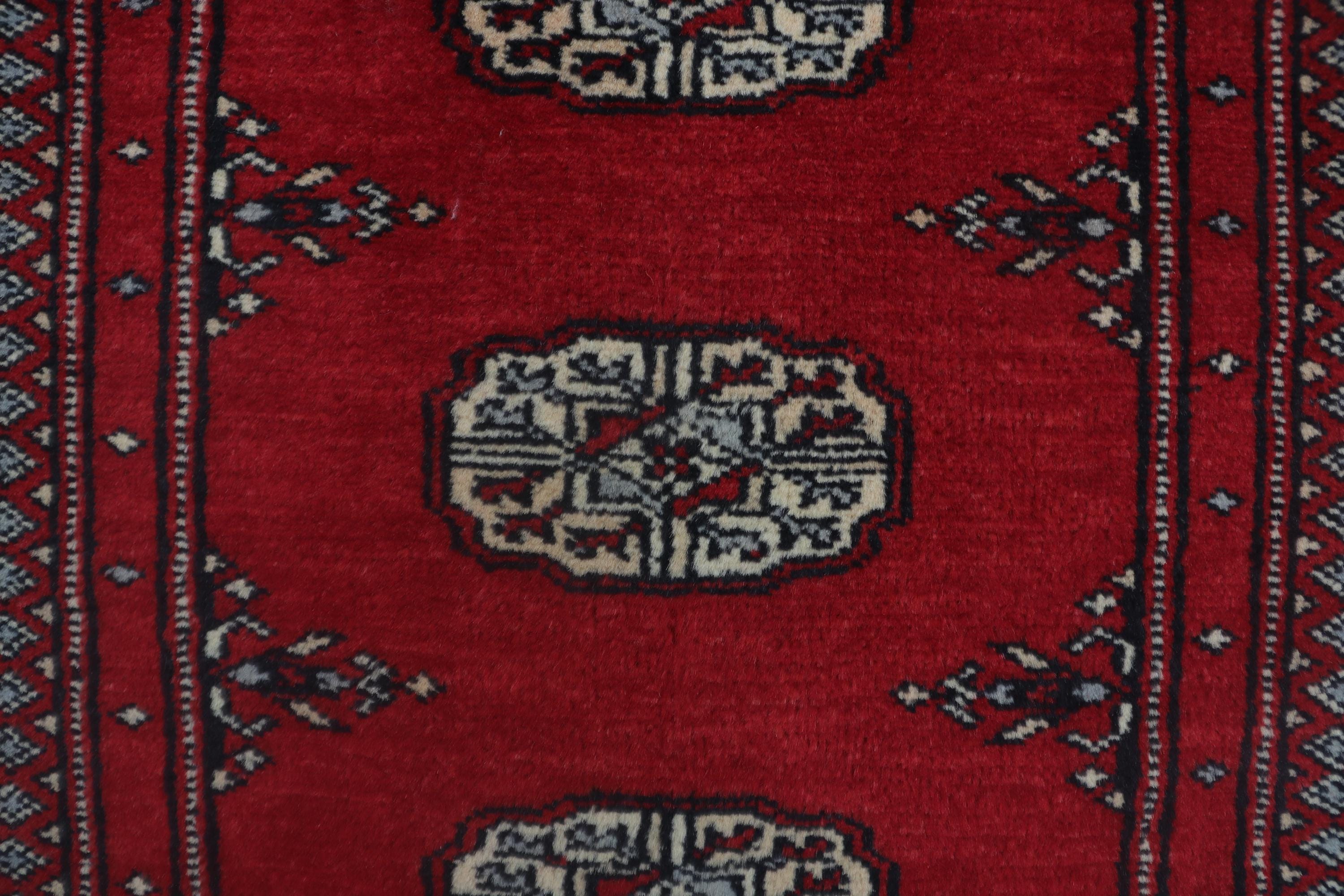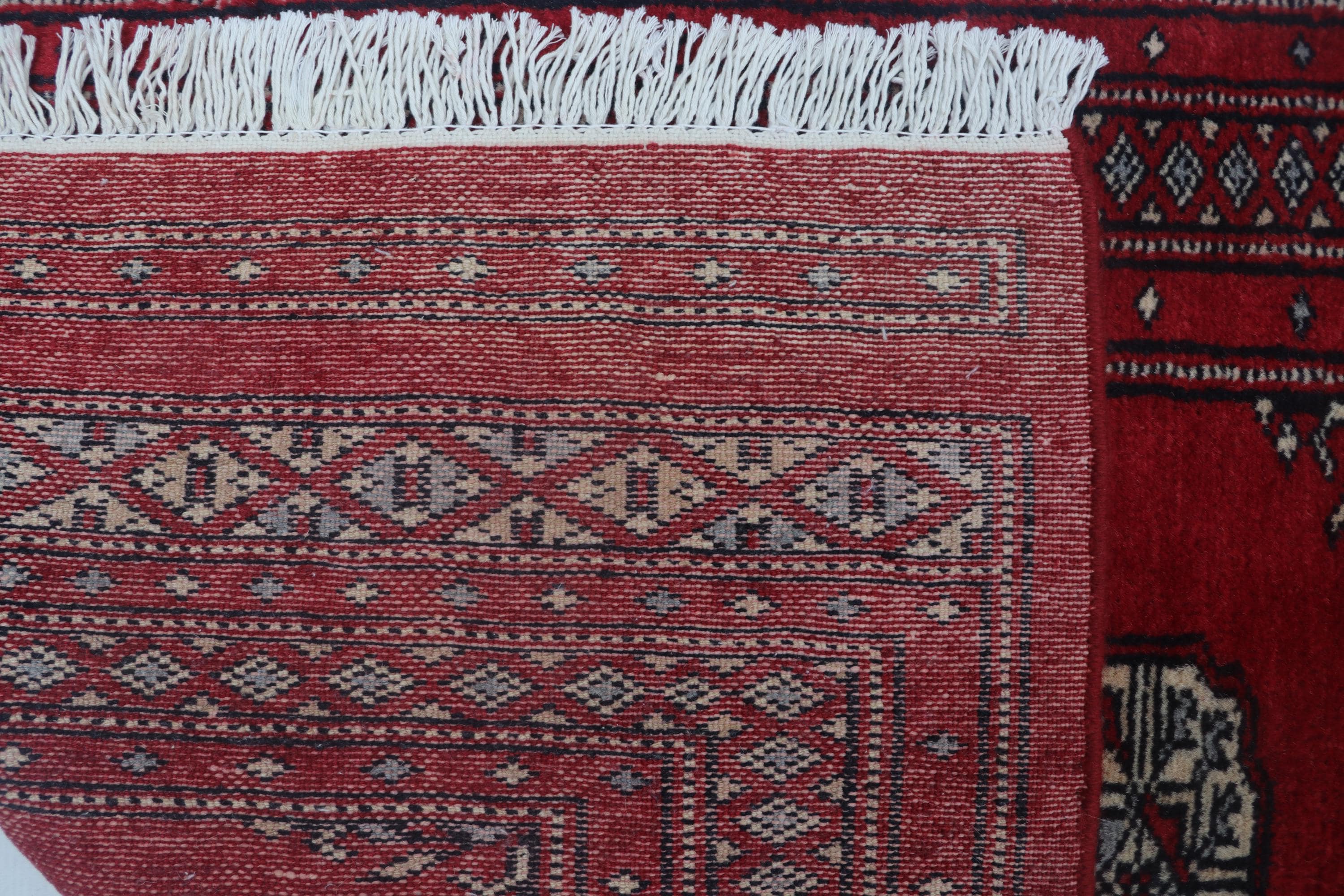 2.6 X 4.0 ft Red Geomatrical Handmade, Mori Bokhara Cotton and Wool