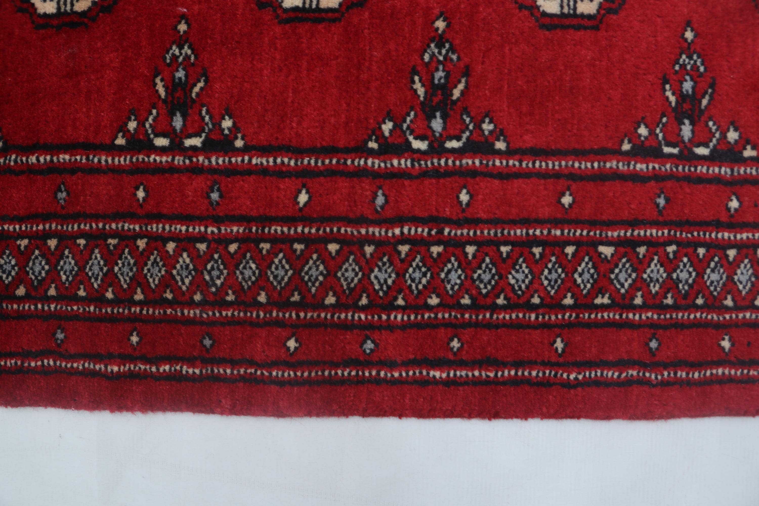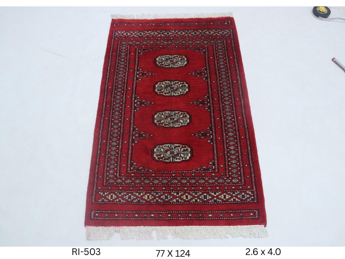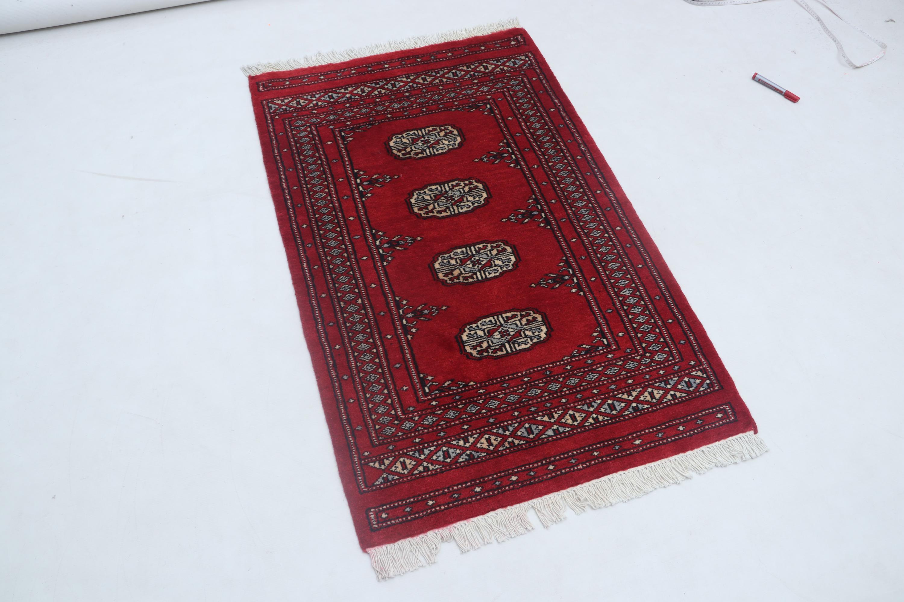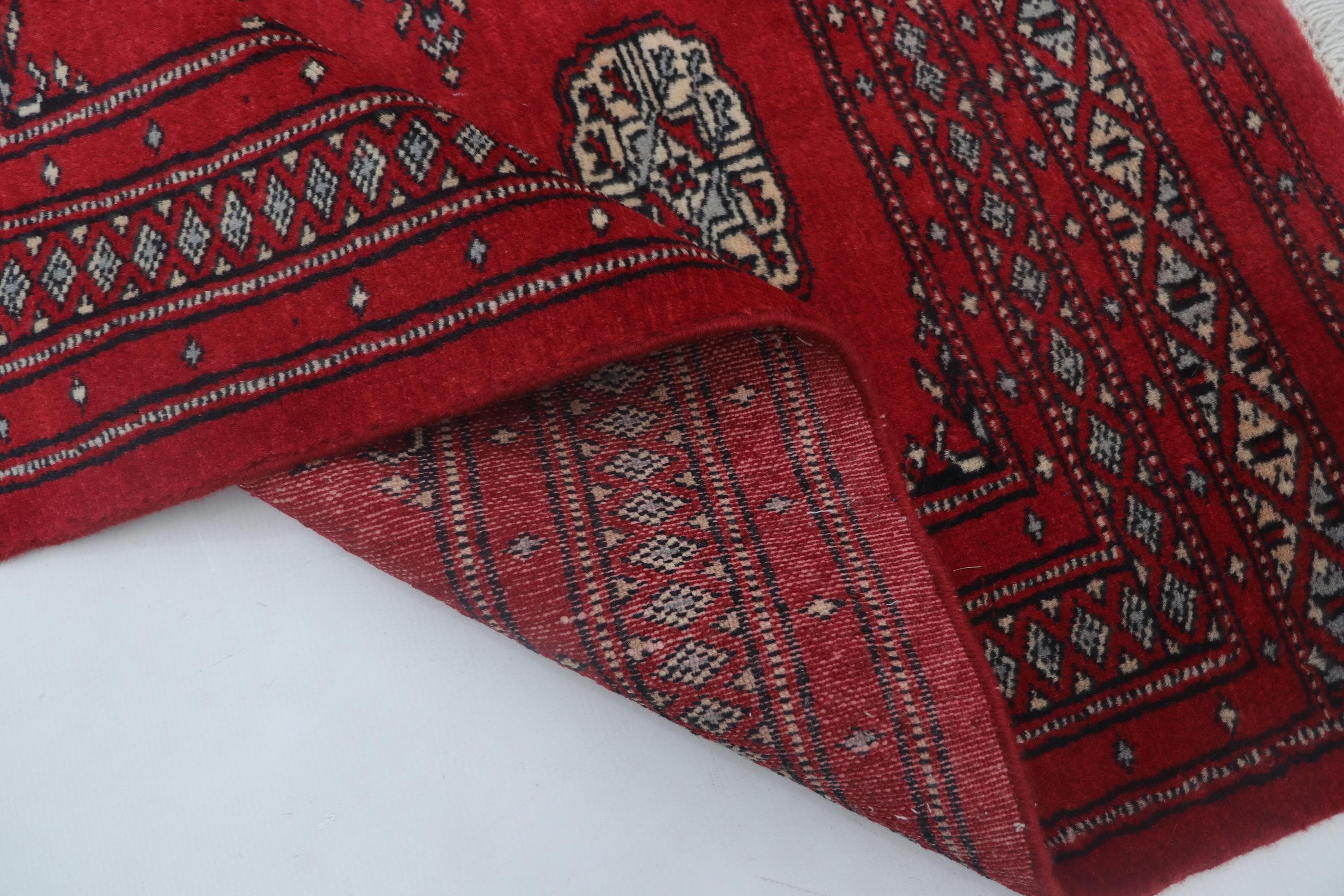 2.6 X 4.0 ft Red Geomatrical Handmade, Mori Bokhara Cotton and Wool