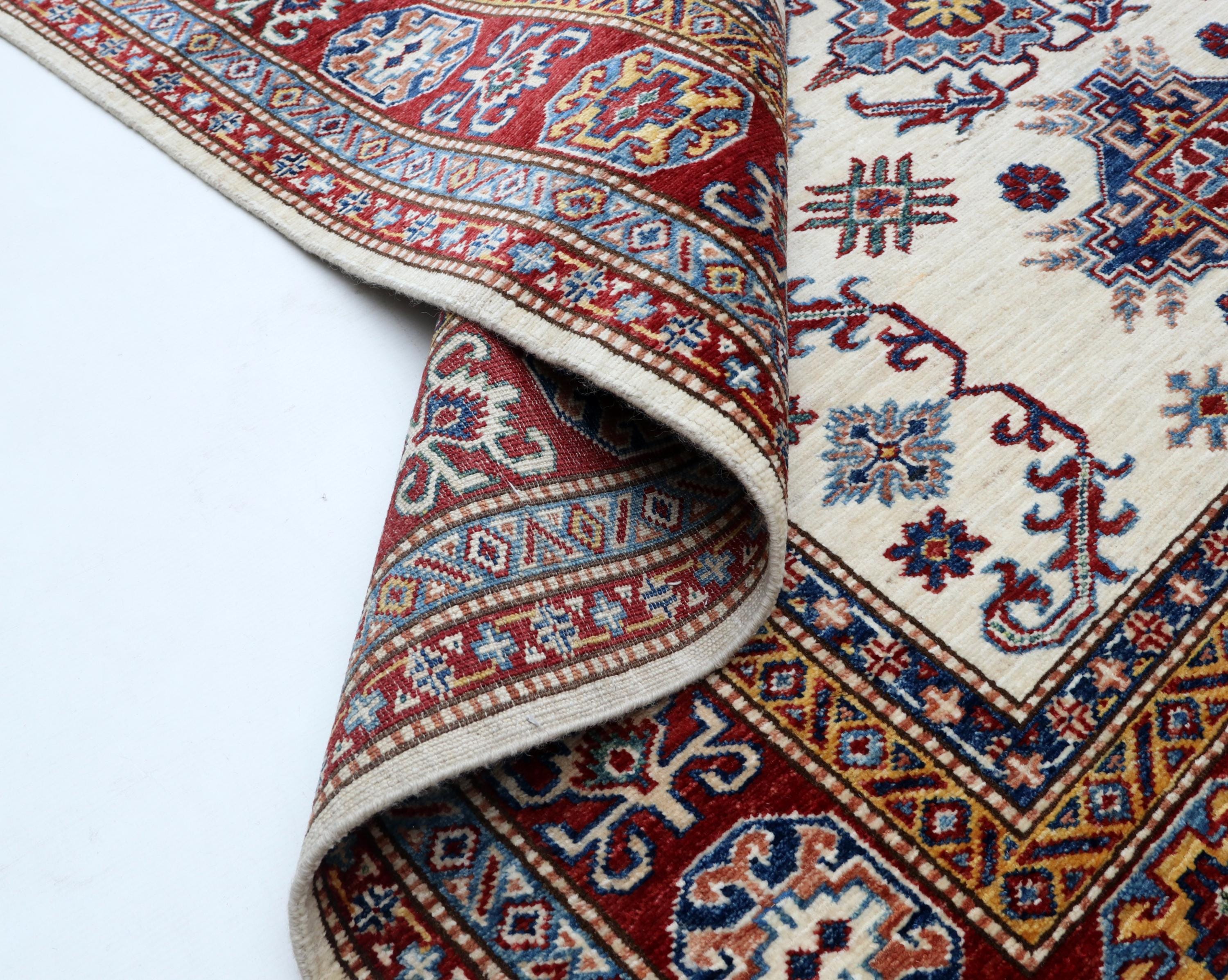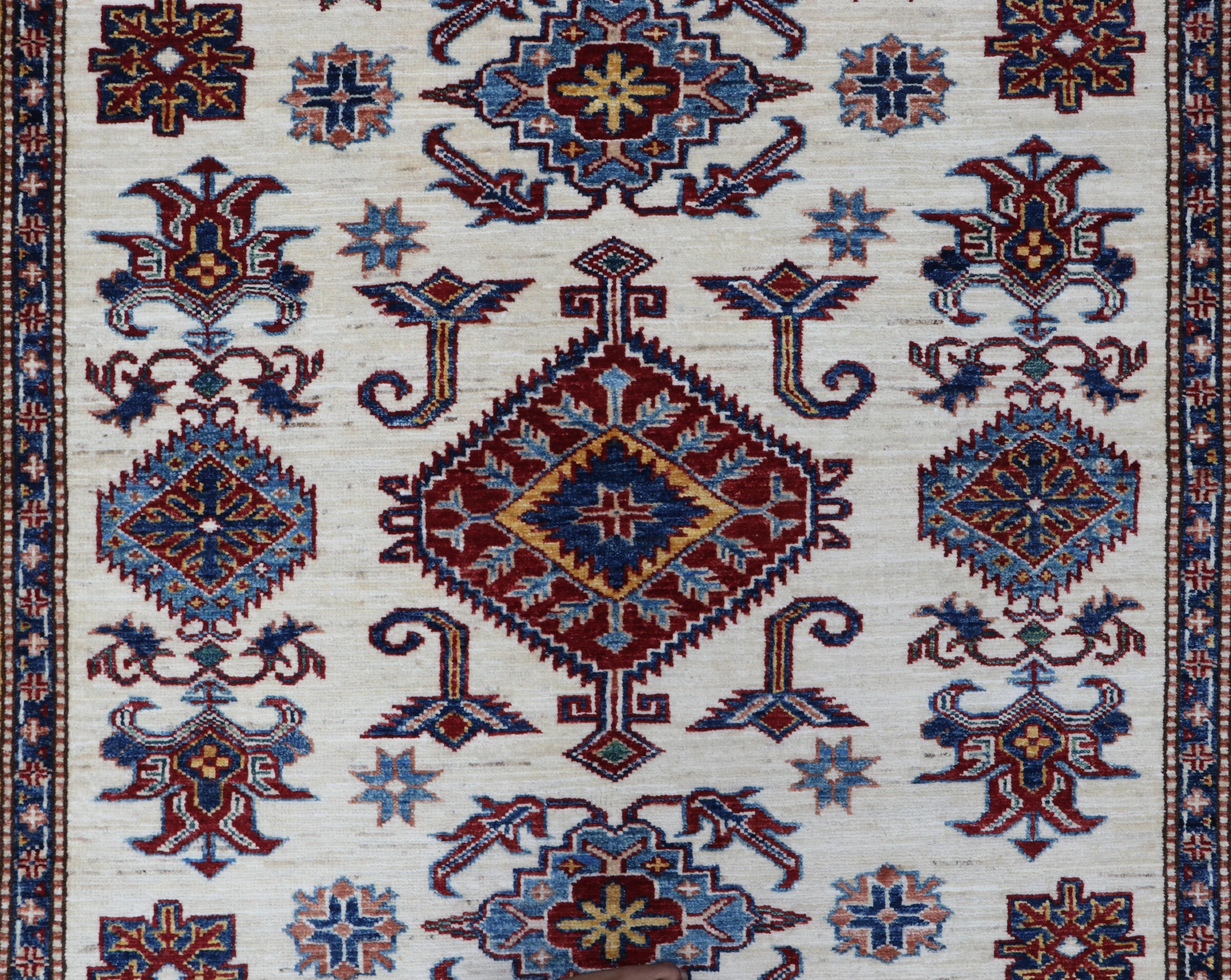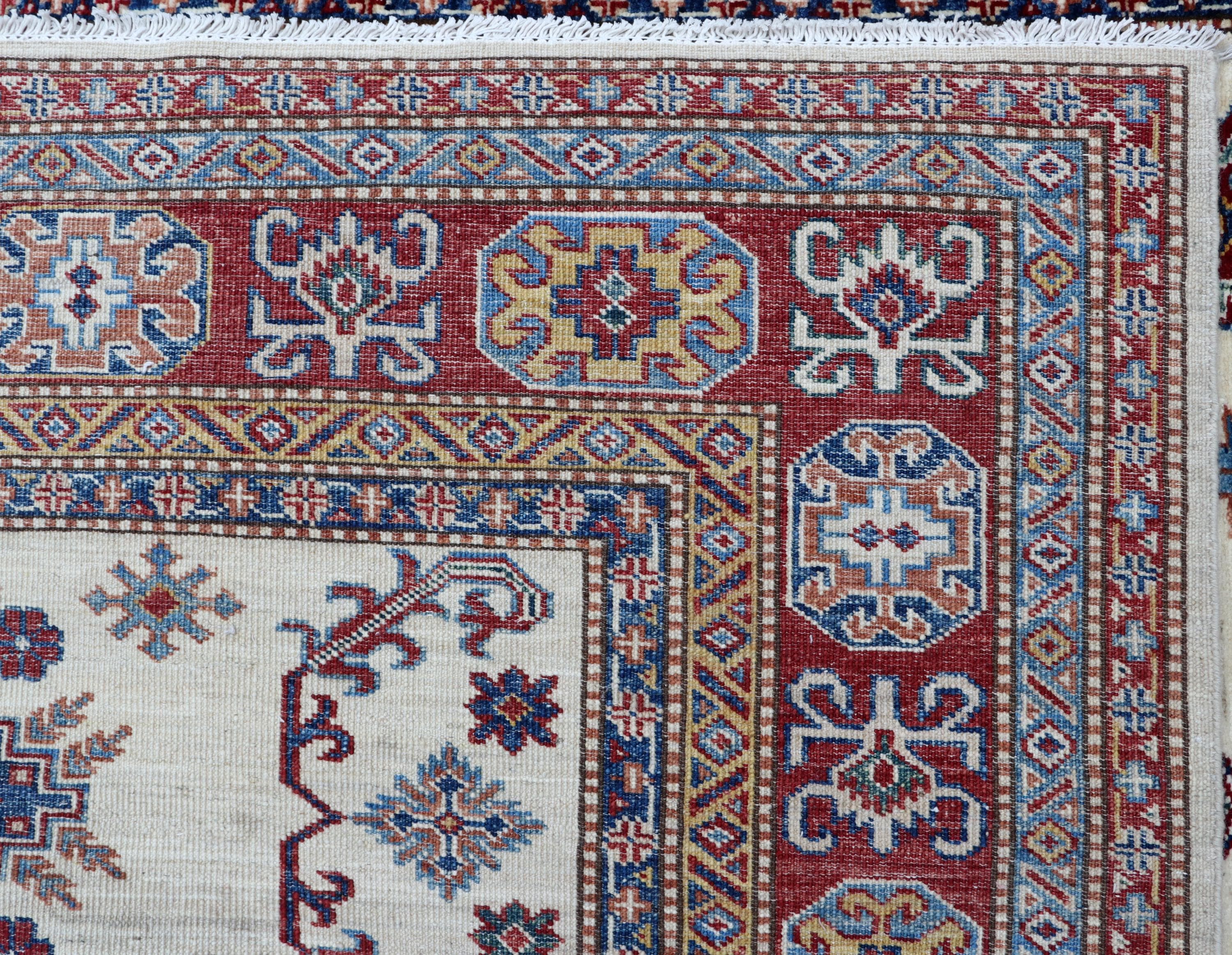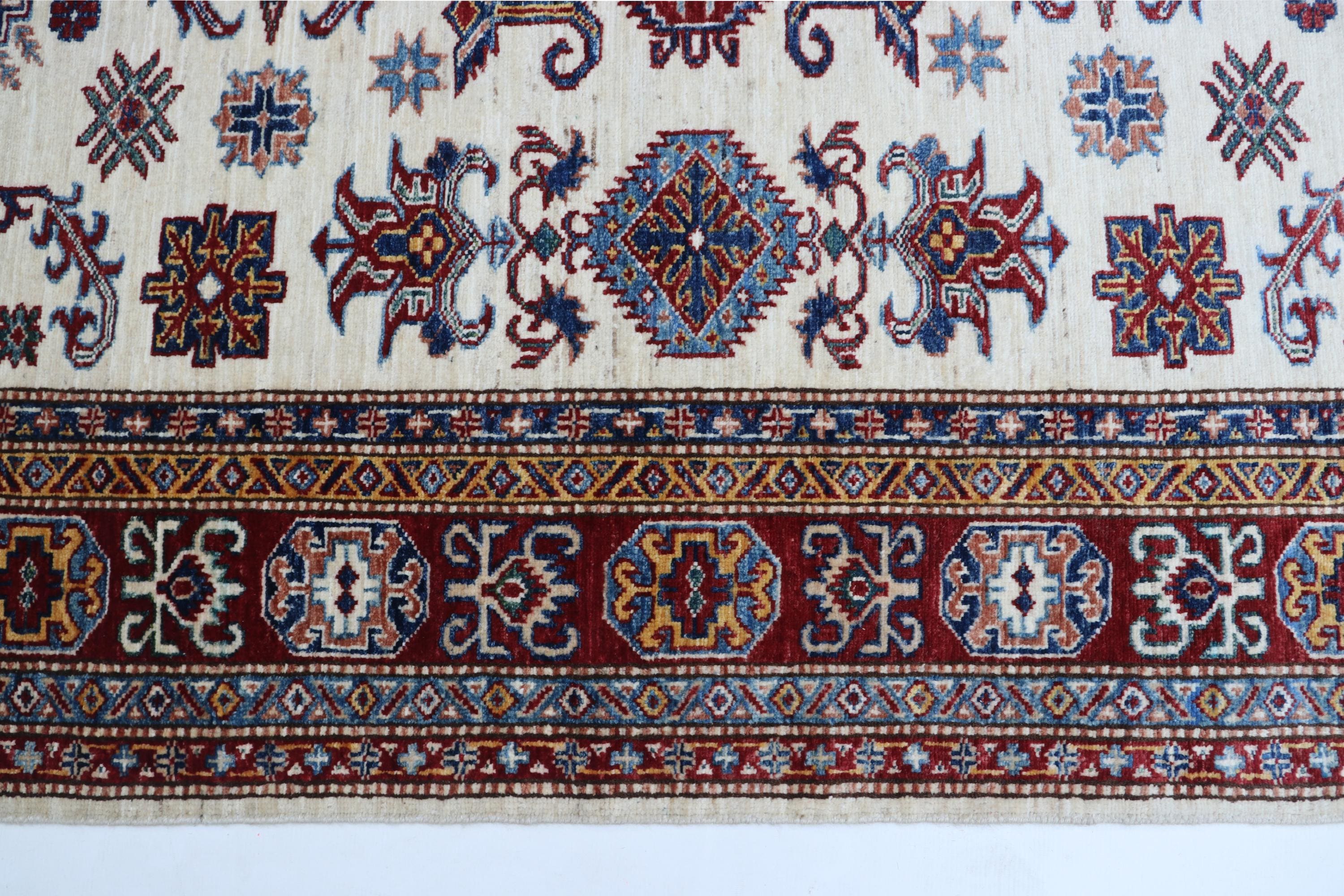 Elevate your décor with the Super Kazak , a luxury handmade Geonatrical rug.