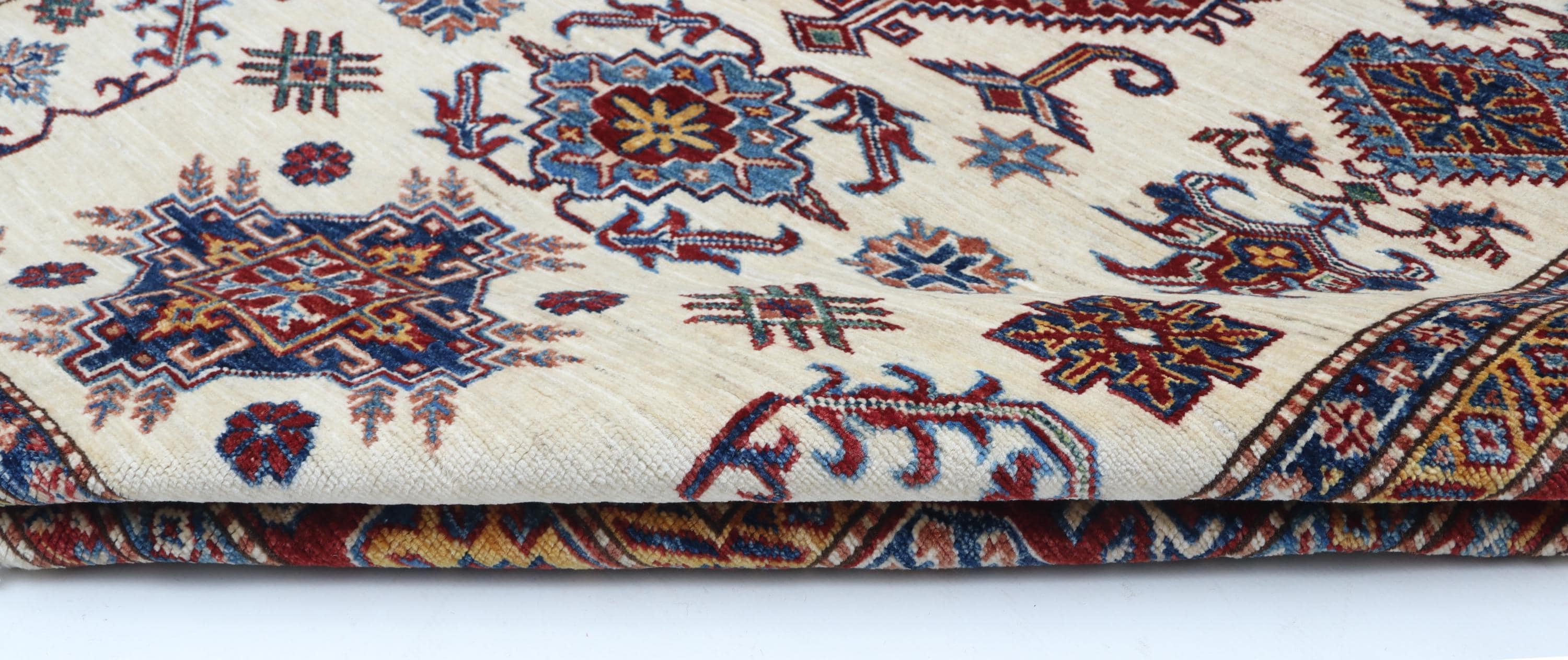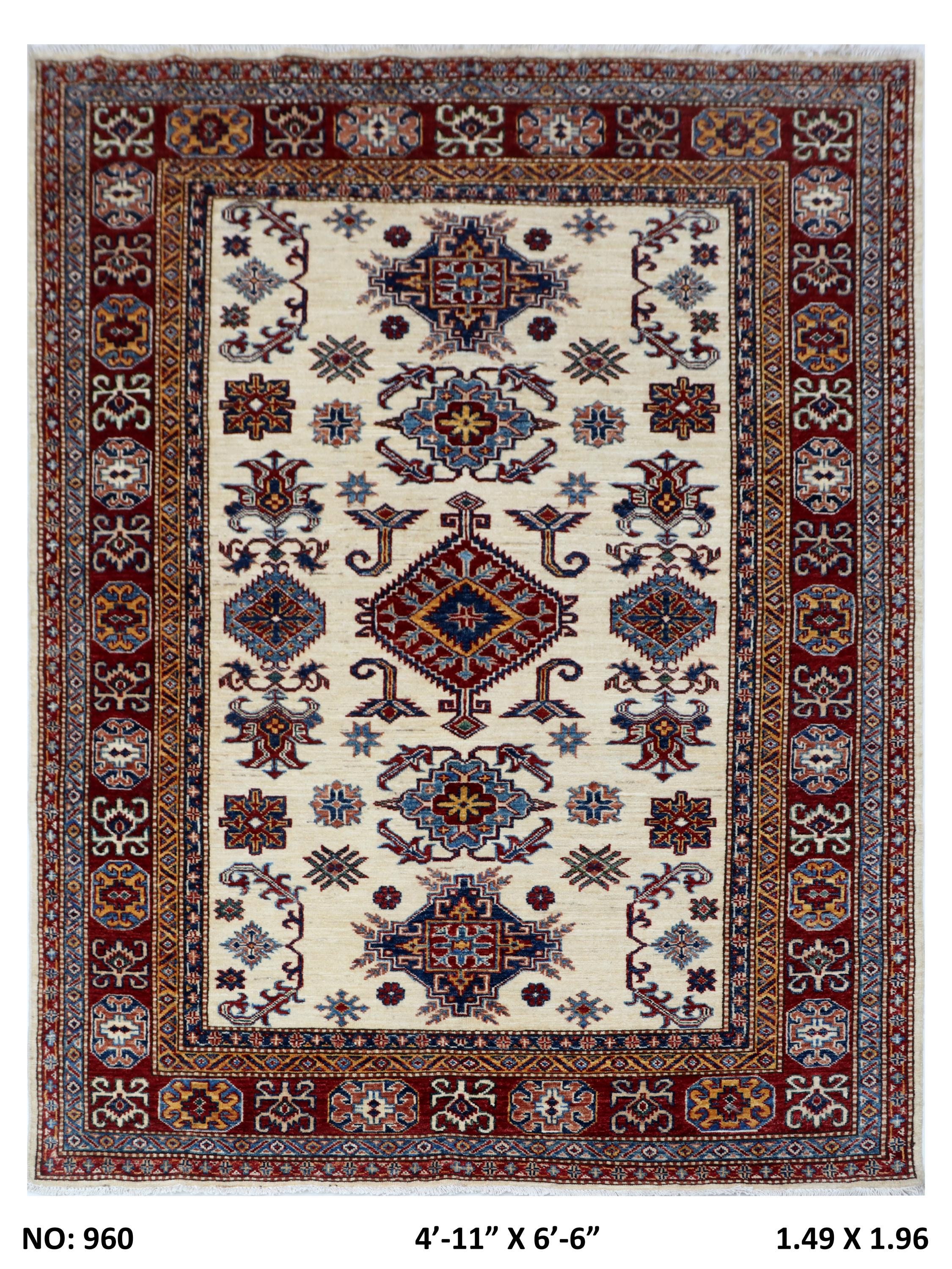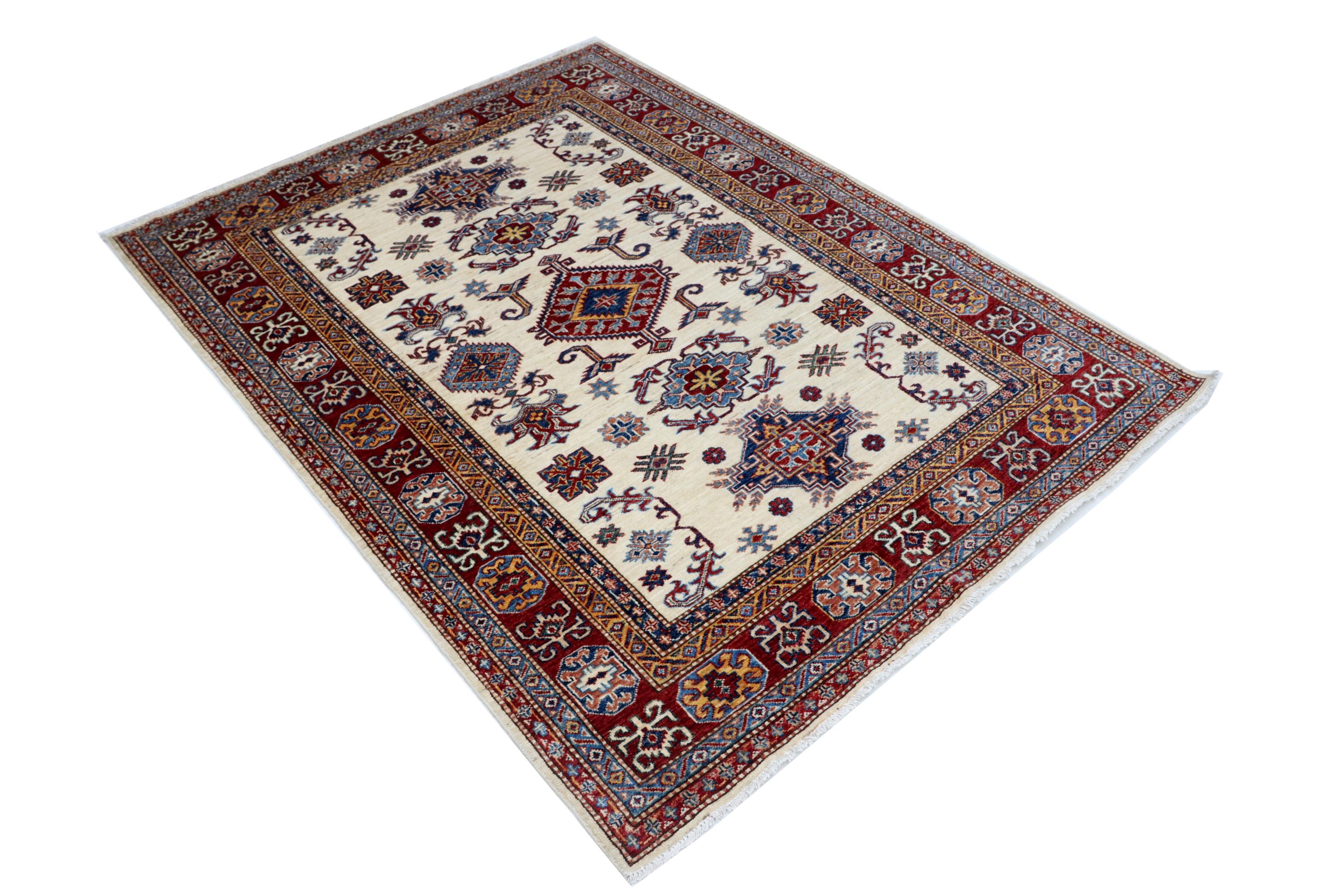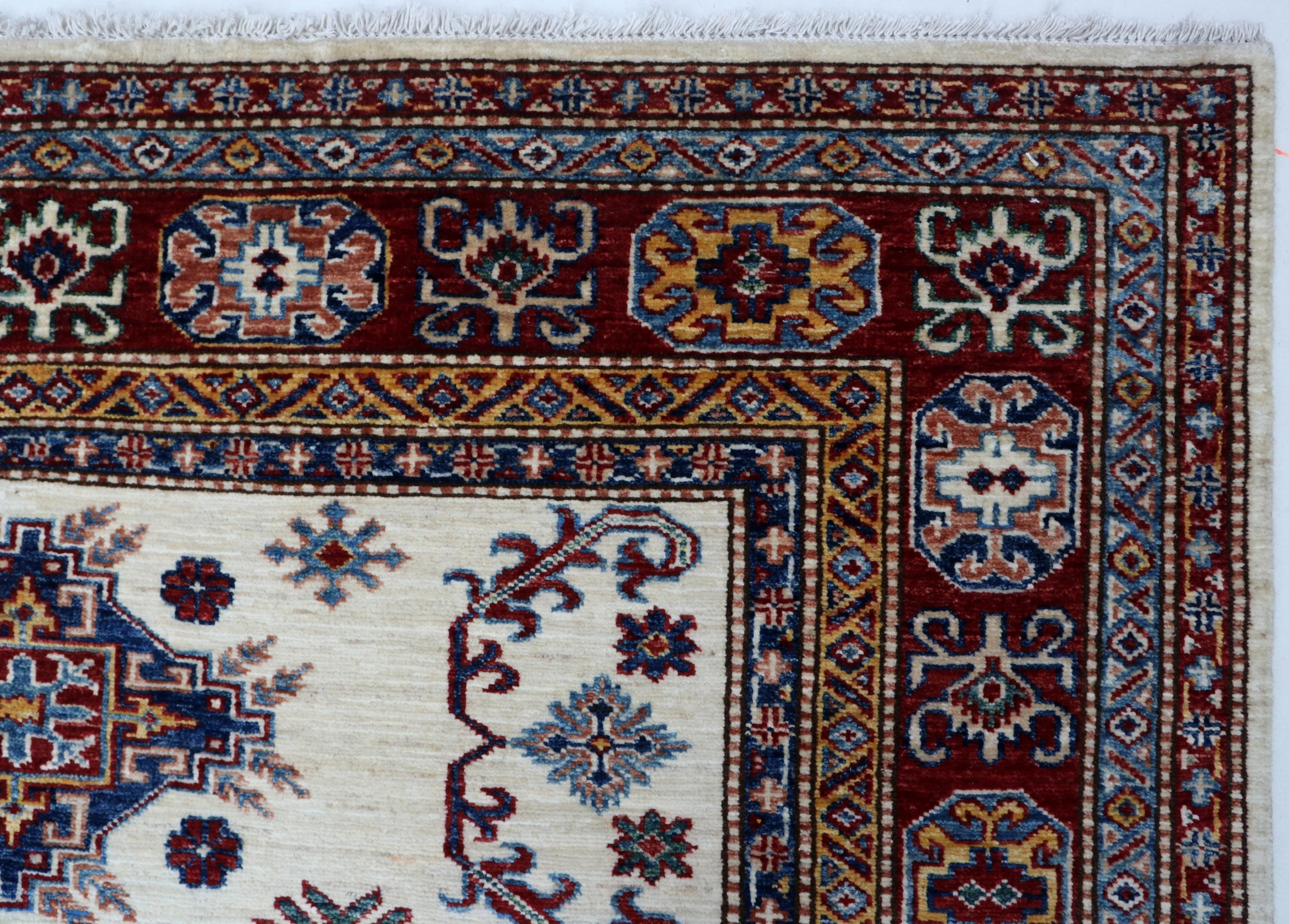 Elevate your décor with the Super Kazak , a luxury handmade Geonatrical rug.