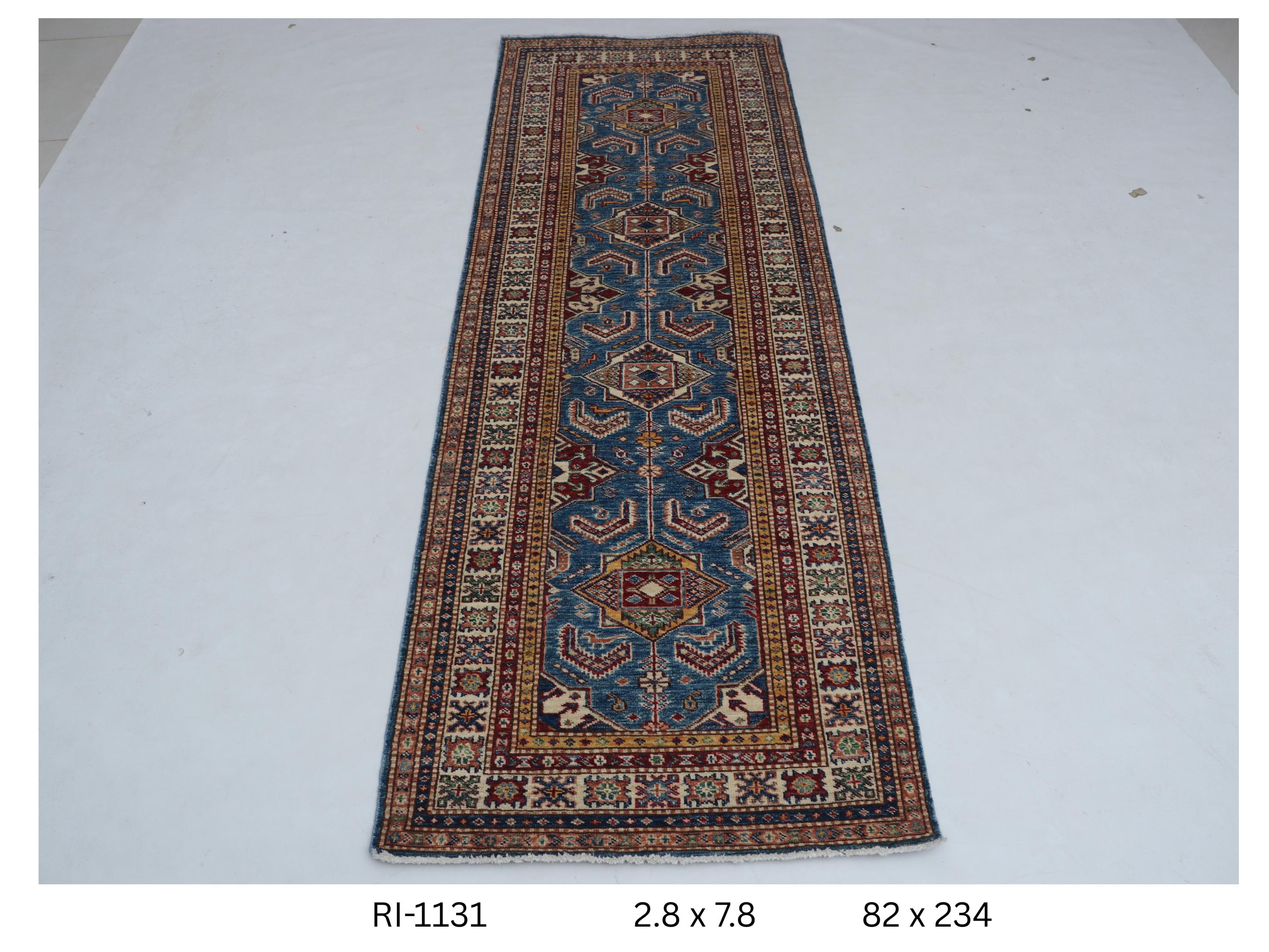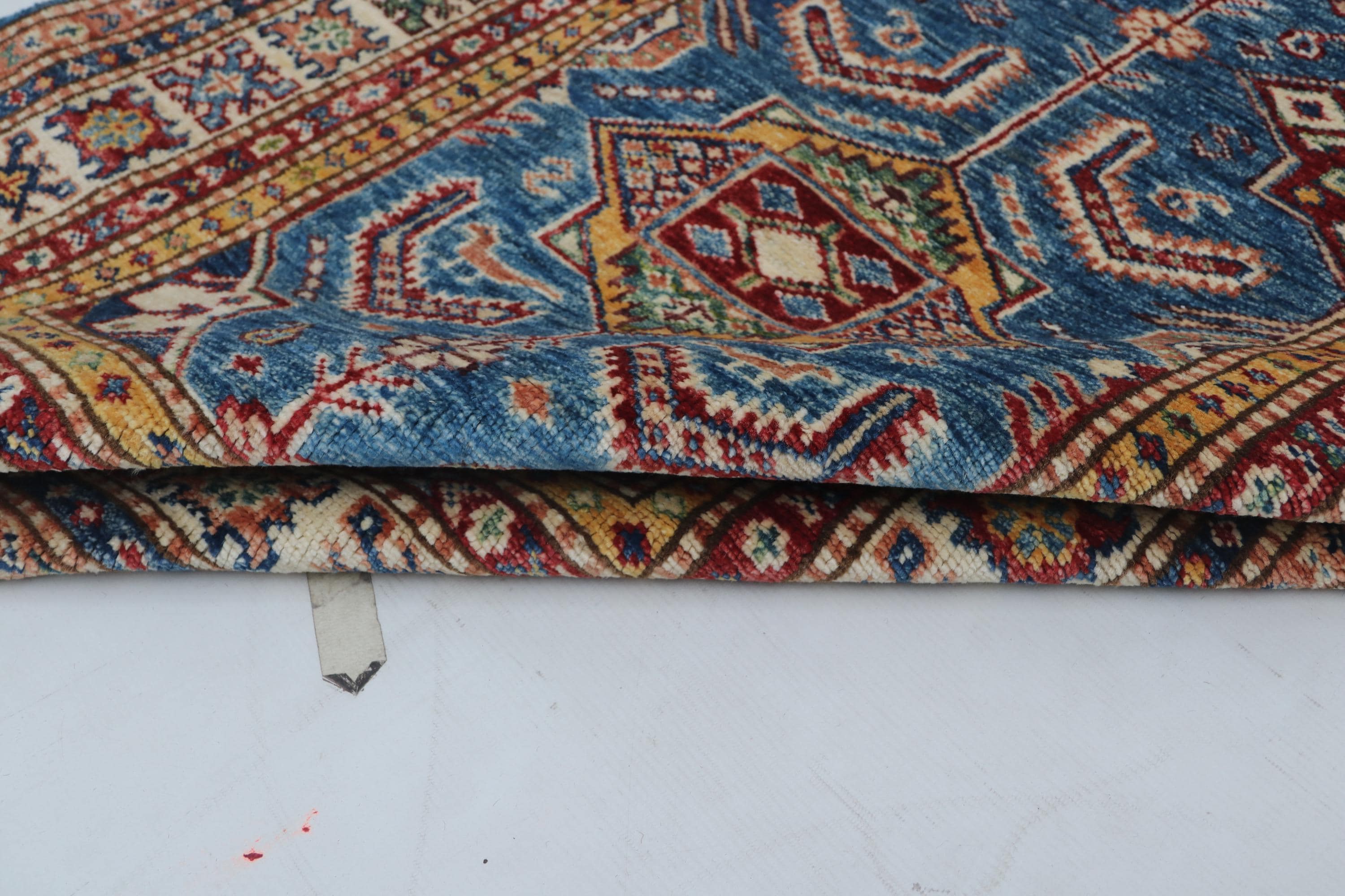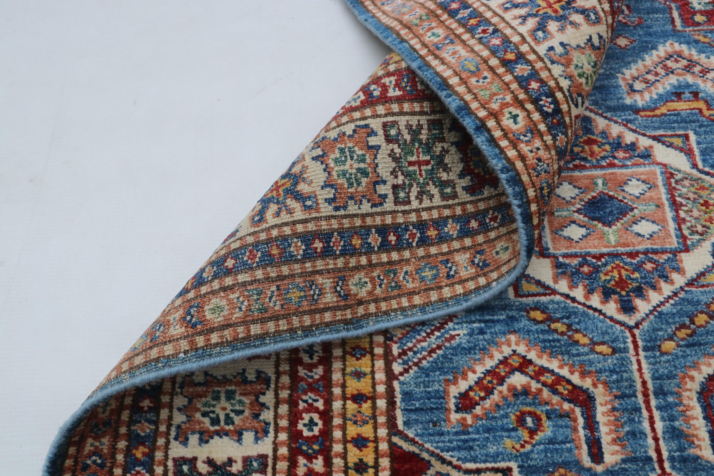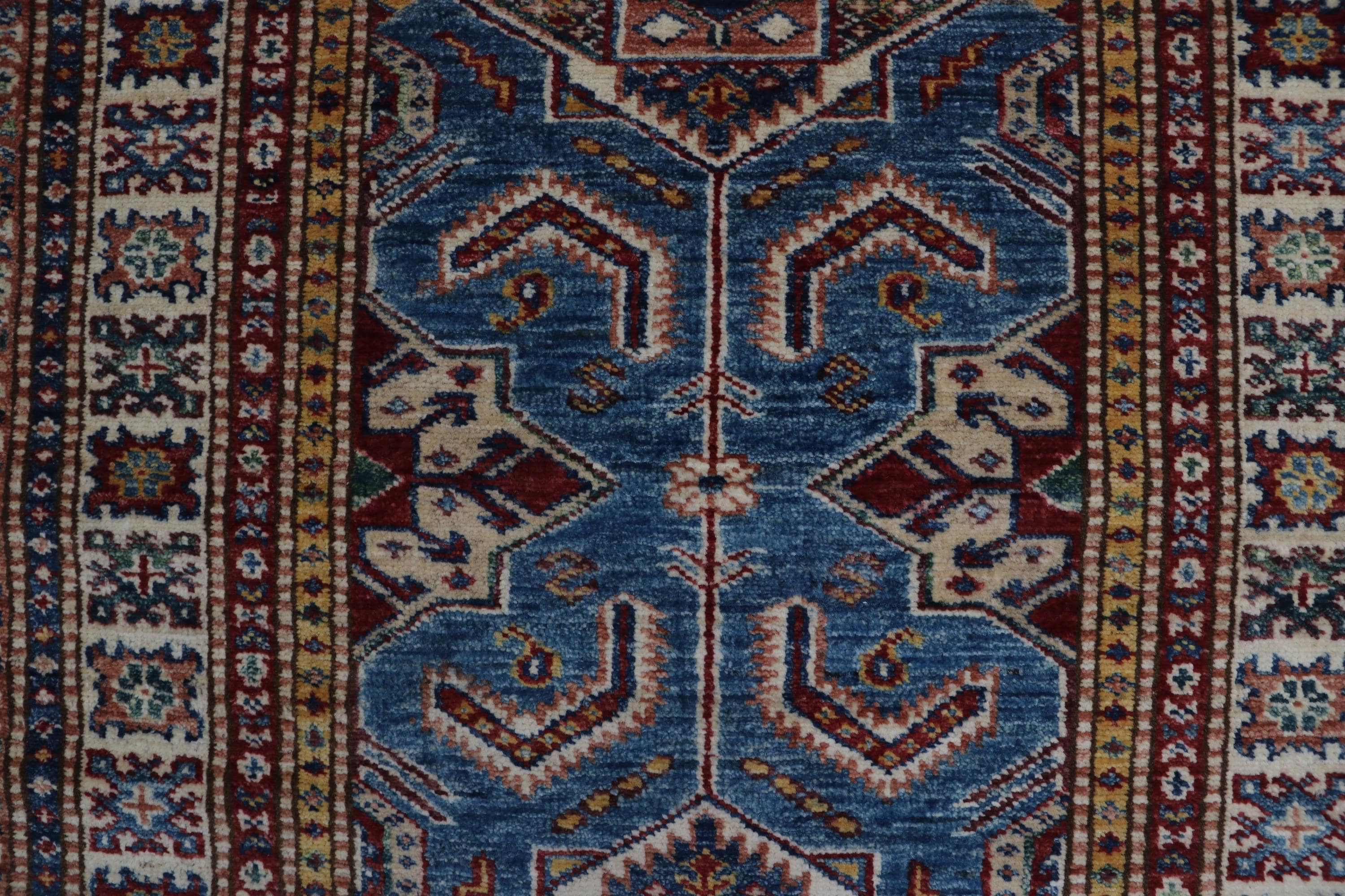 Elevate your décor with the Super Kazak , a luxury handmade Geonatrical rug.