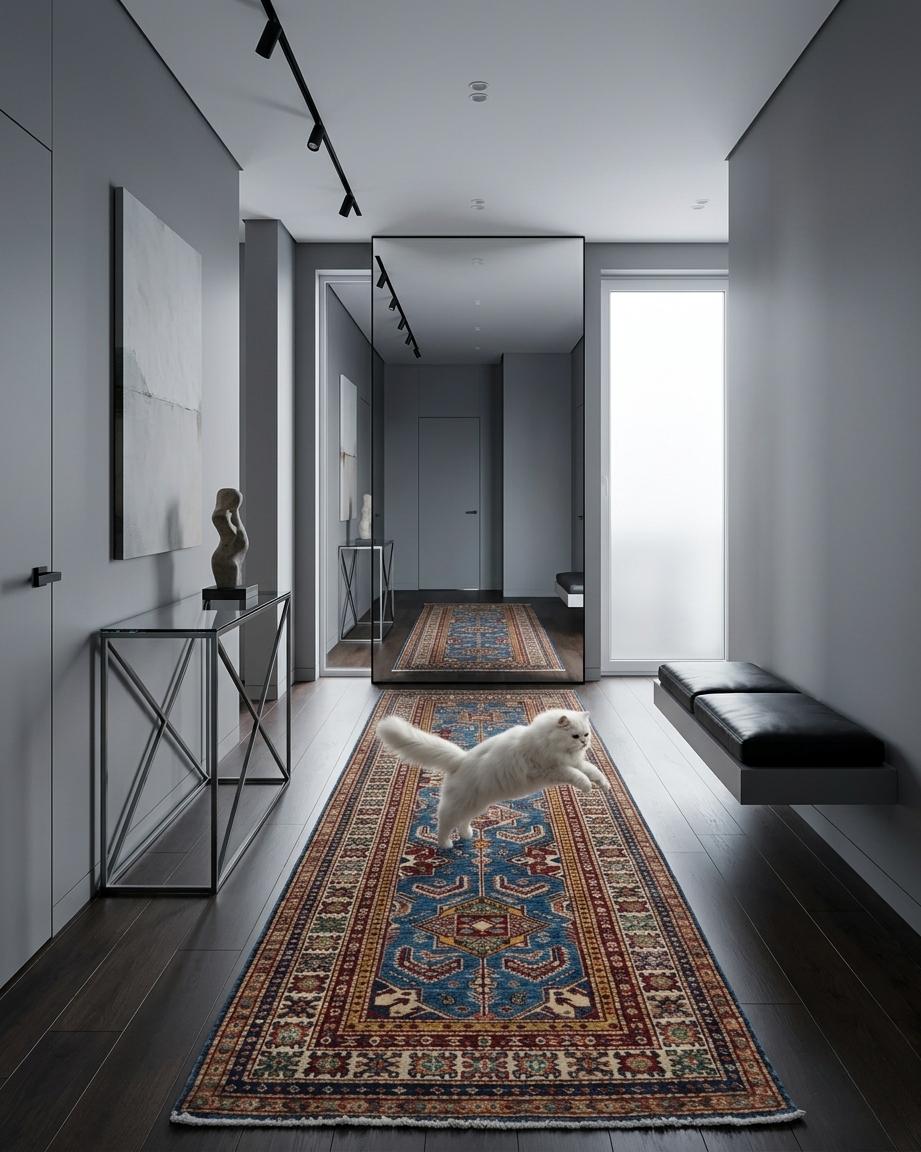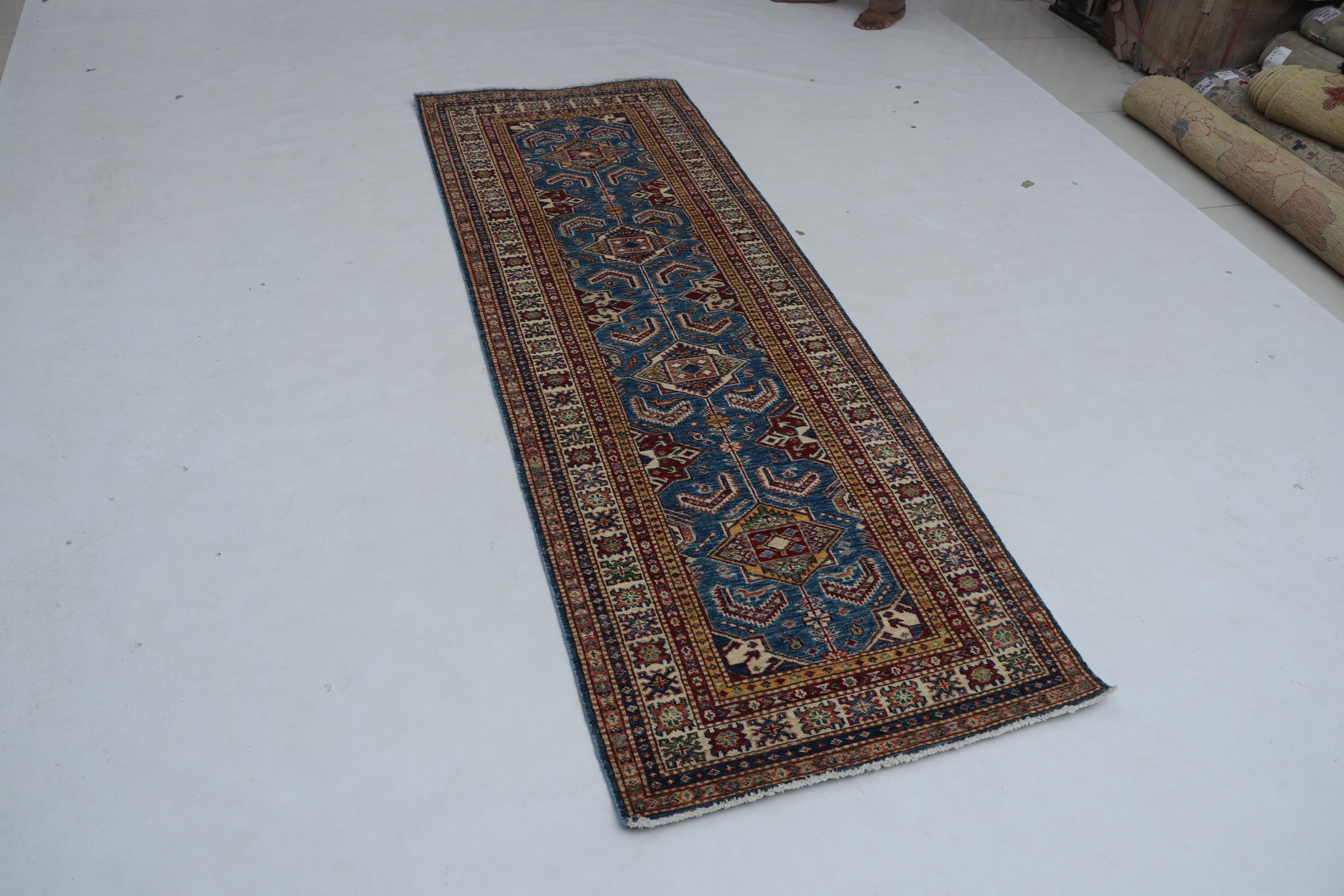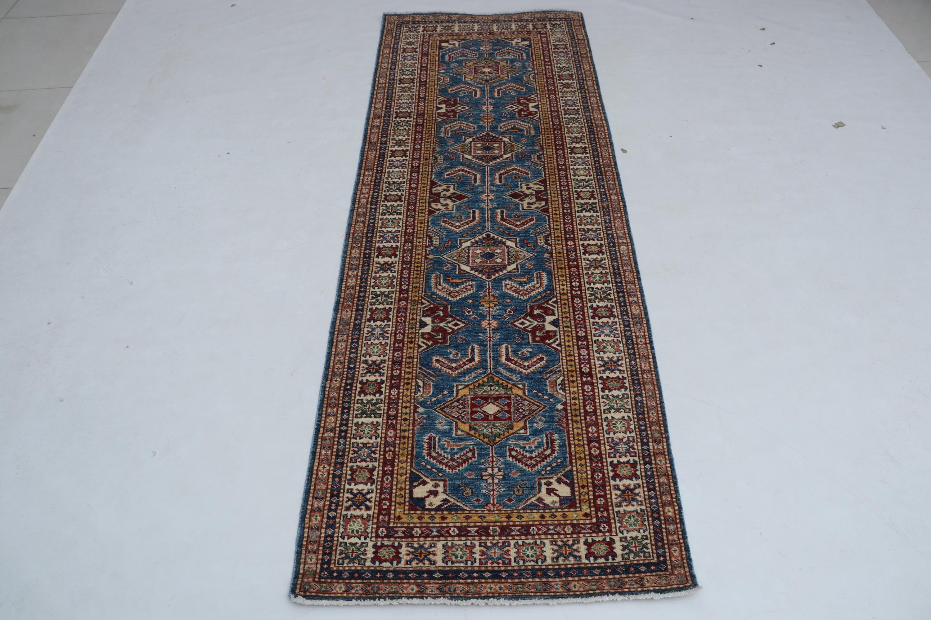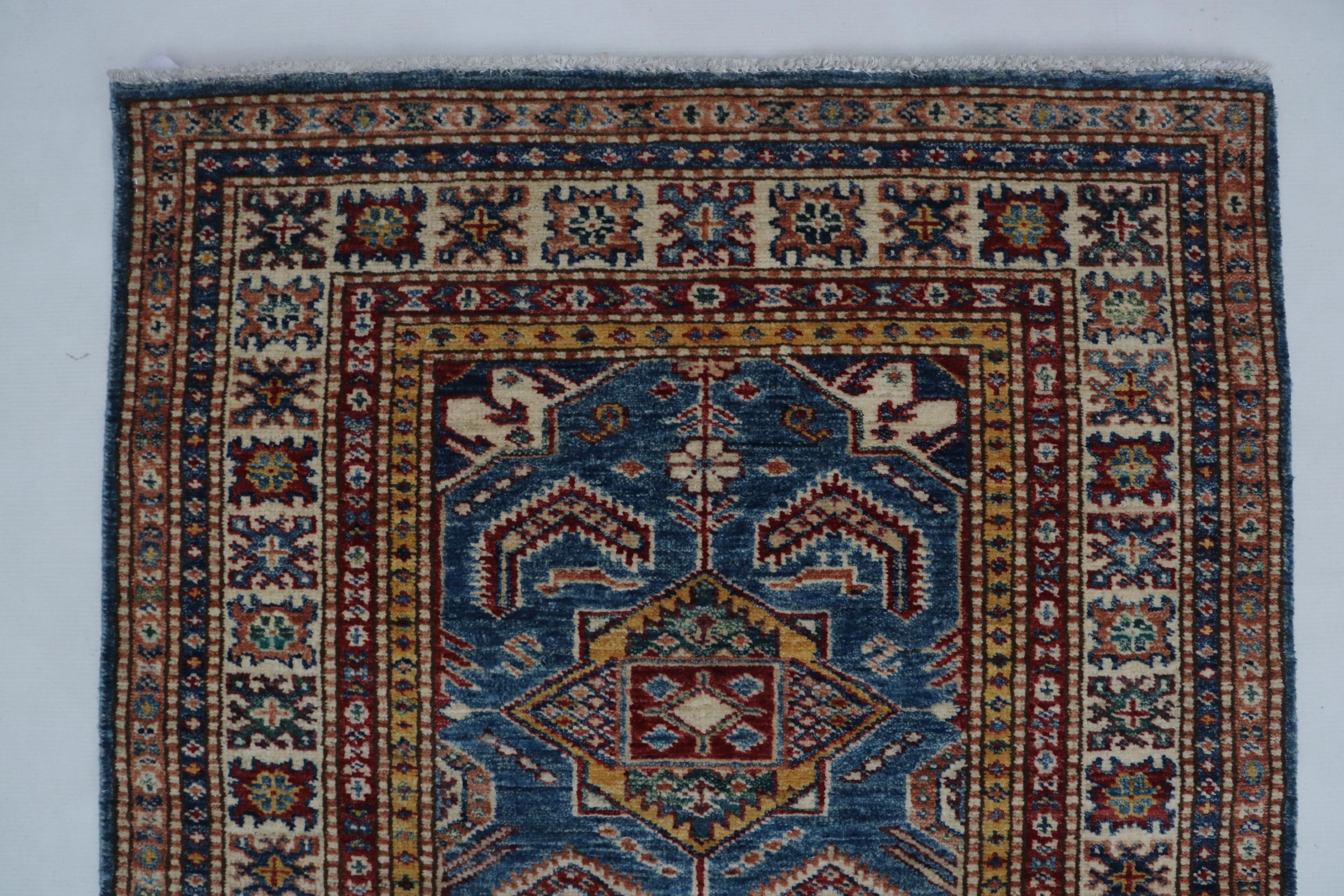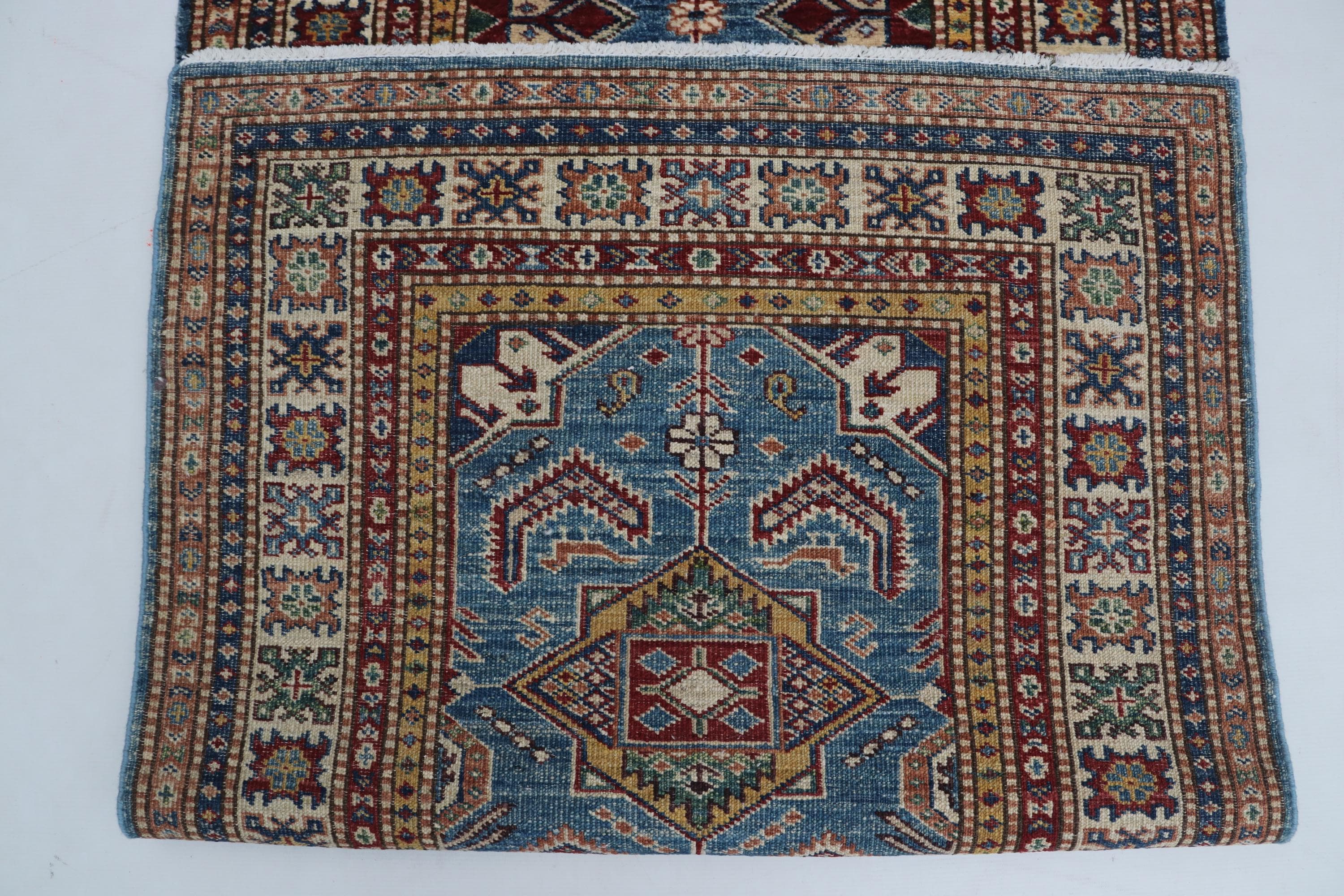 Elevate your décor with the Super Kazak , a luxury handmade Geonatrical rug.