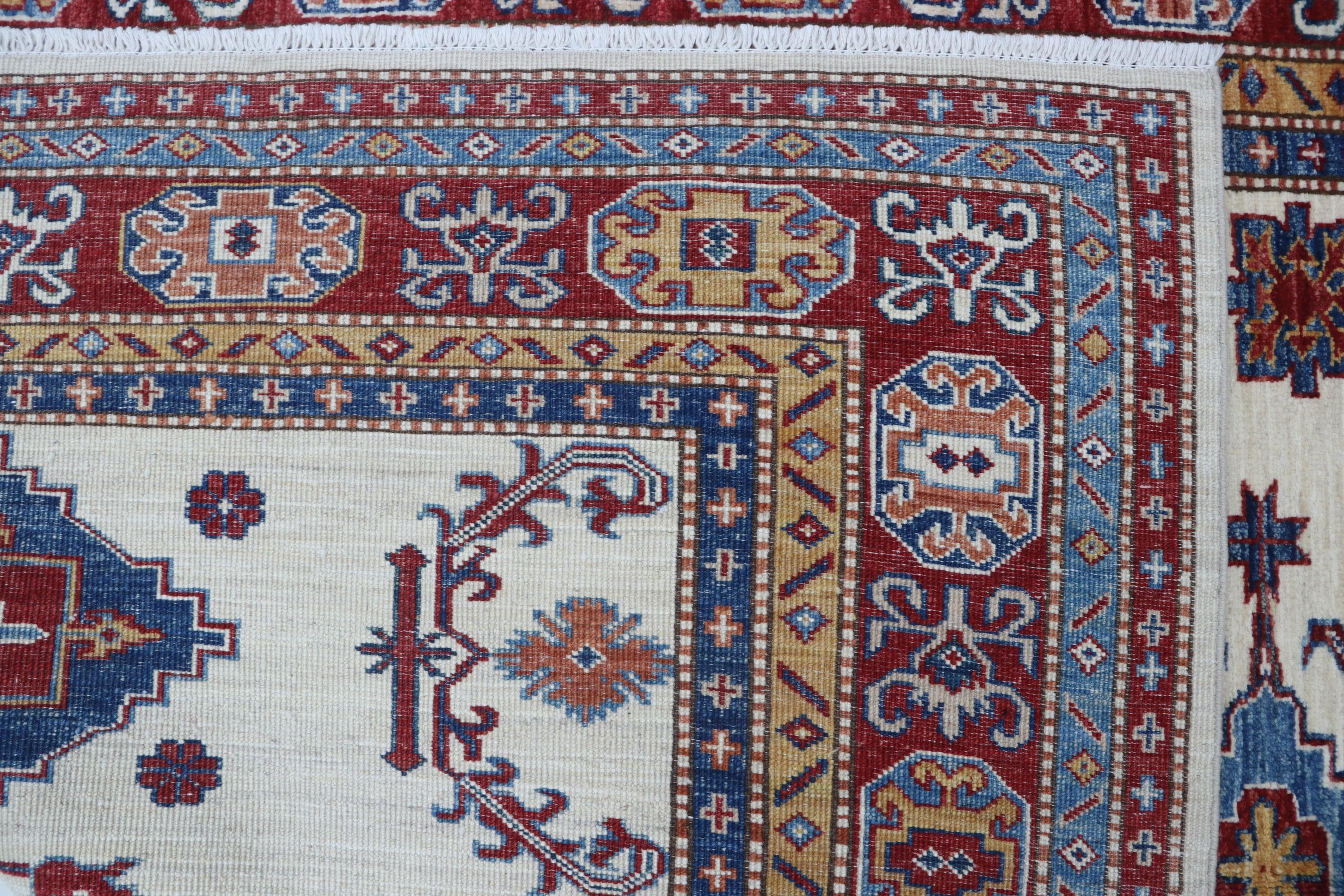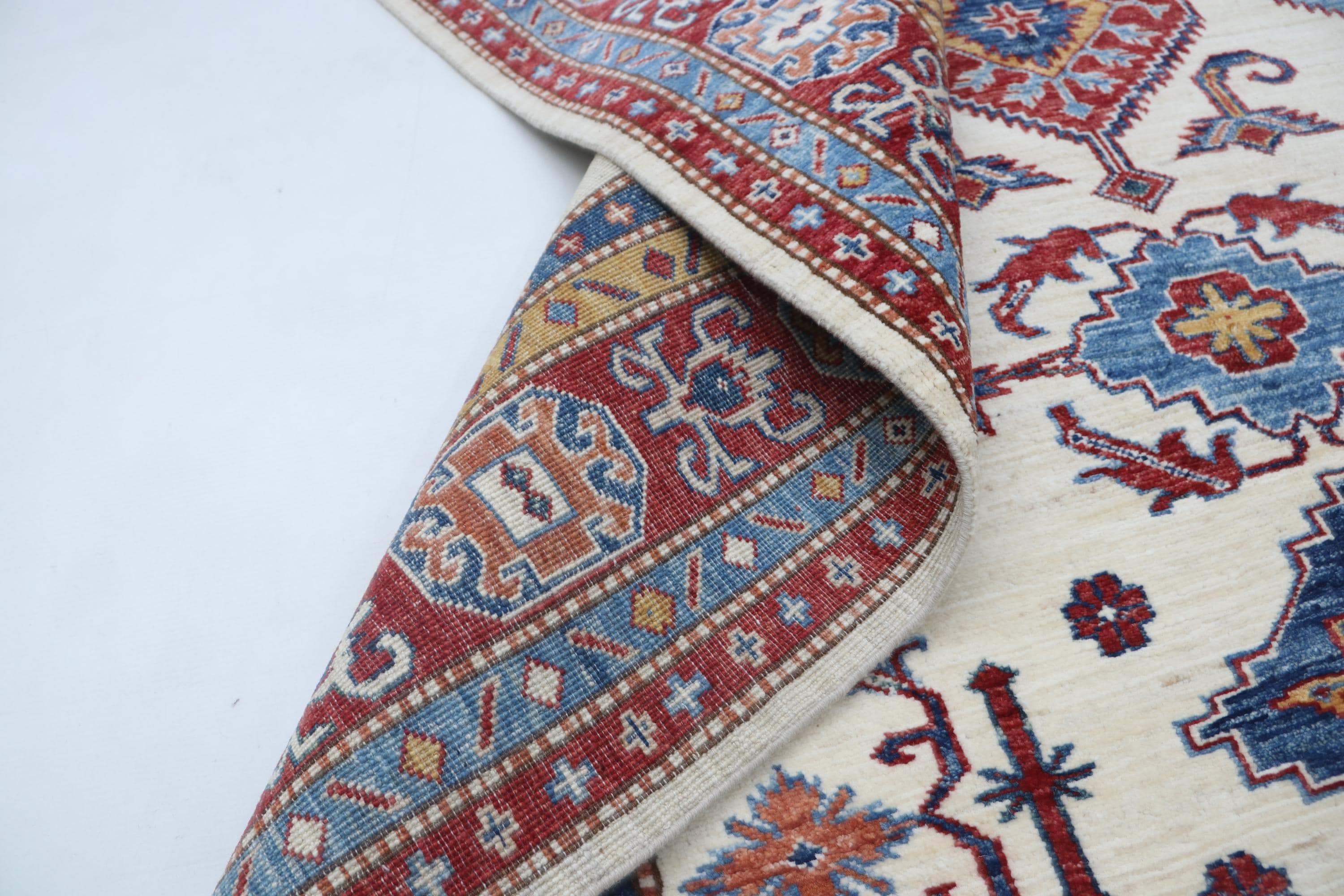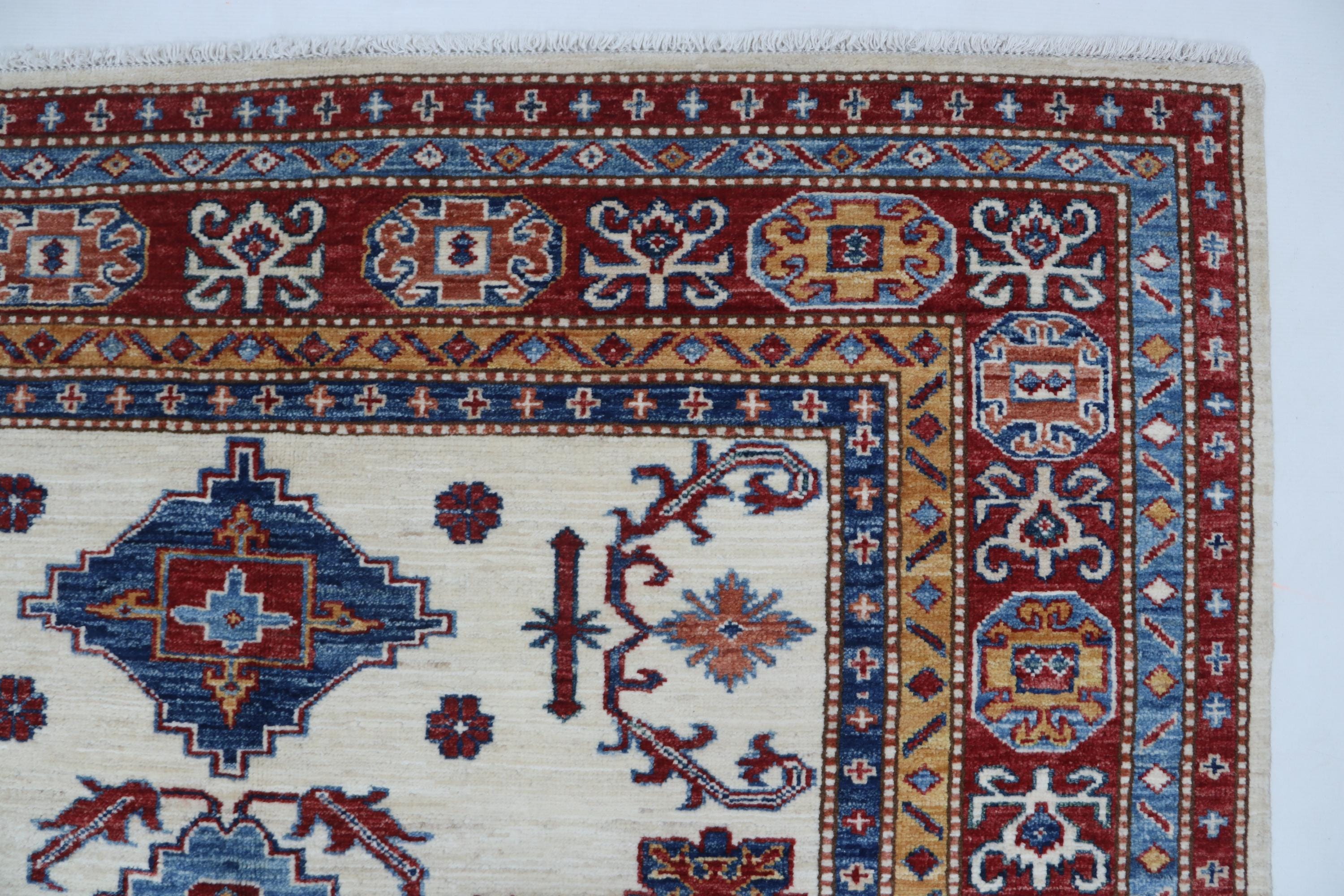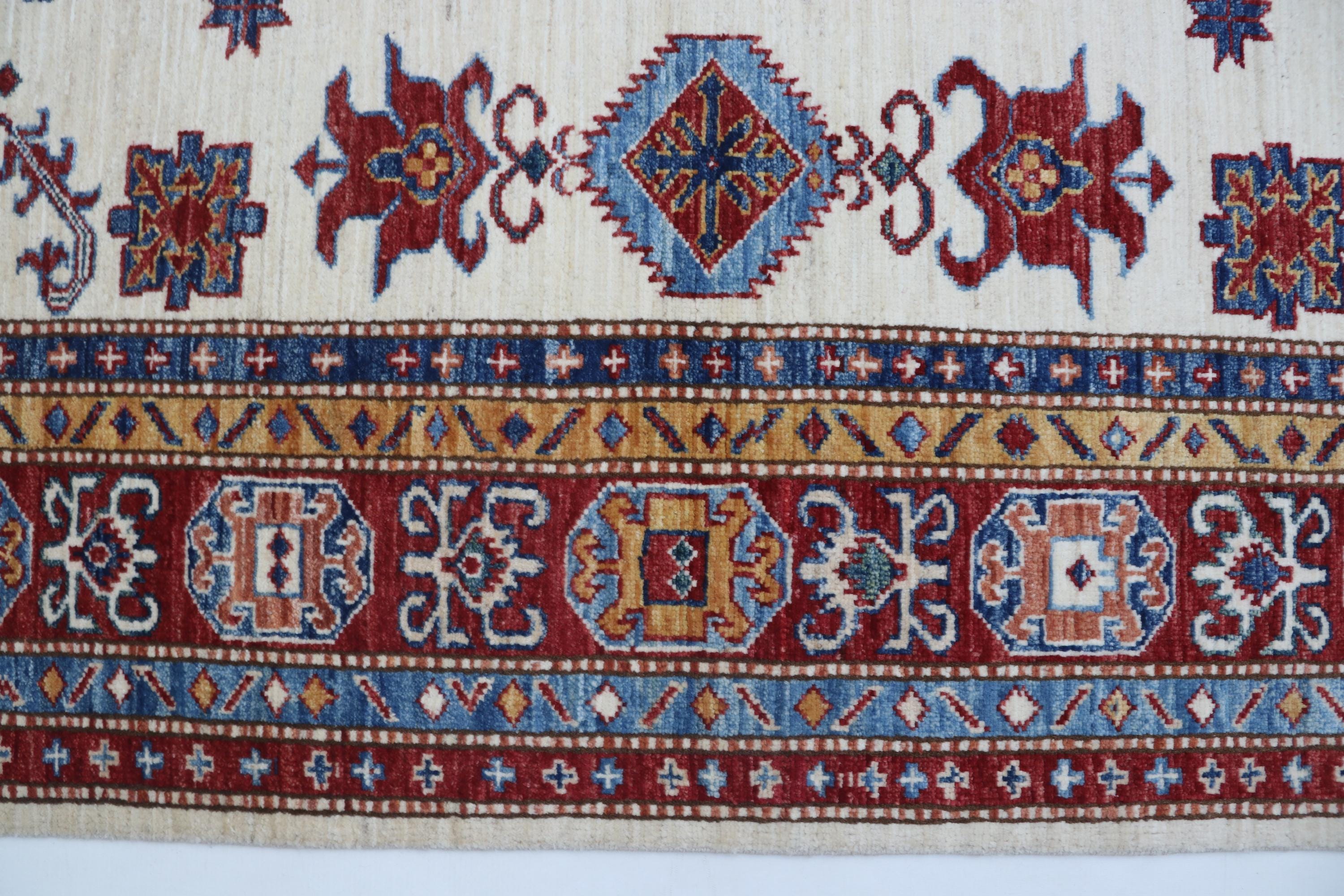 Elevate your décor with the Super Kazak , a luxury handmade Geonatrical rug.