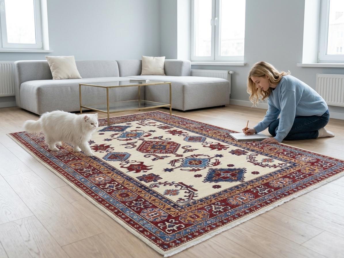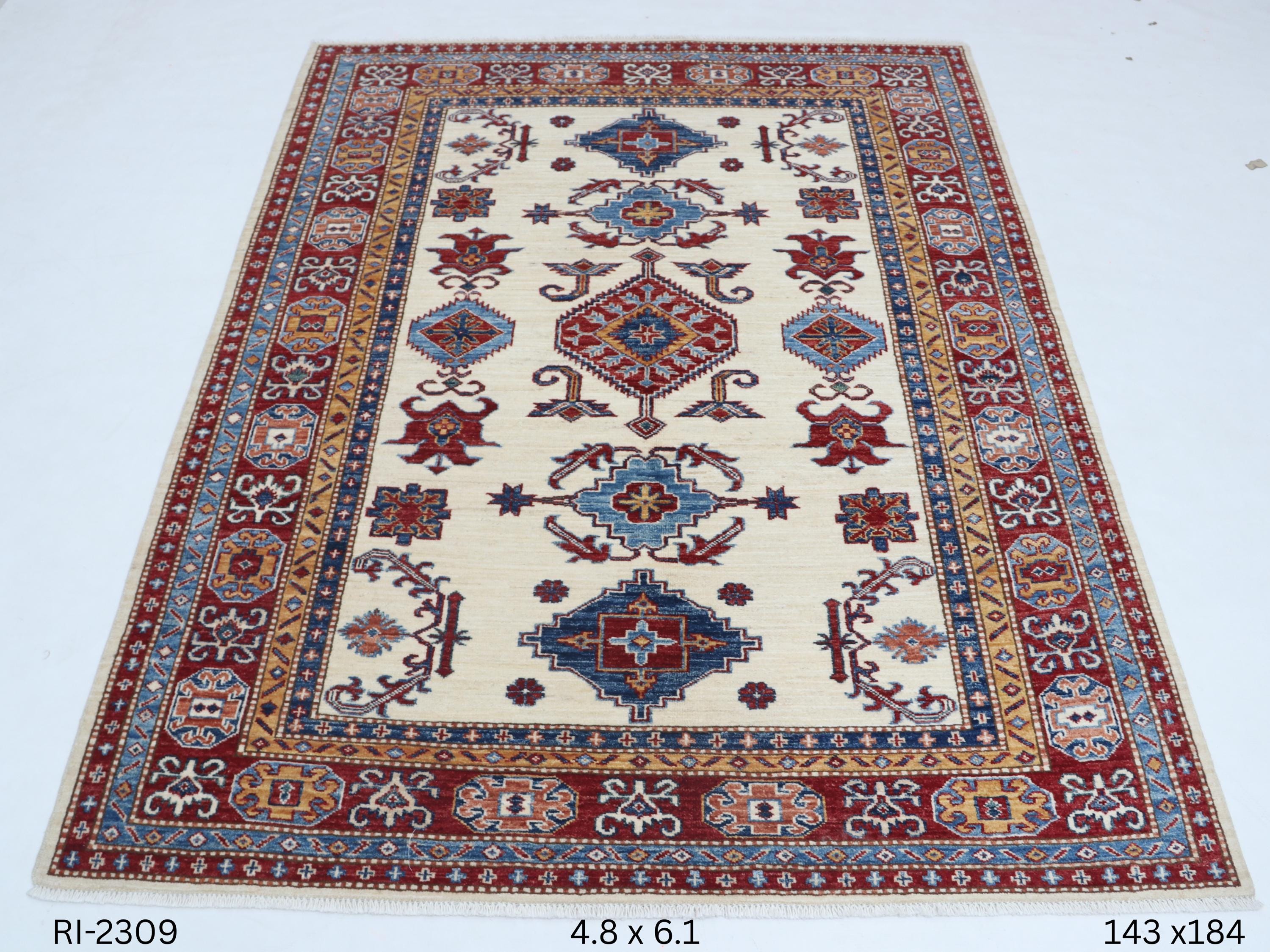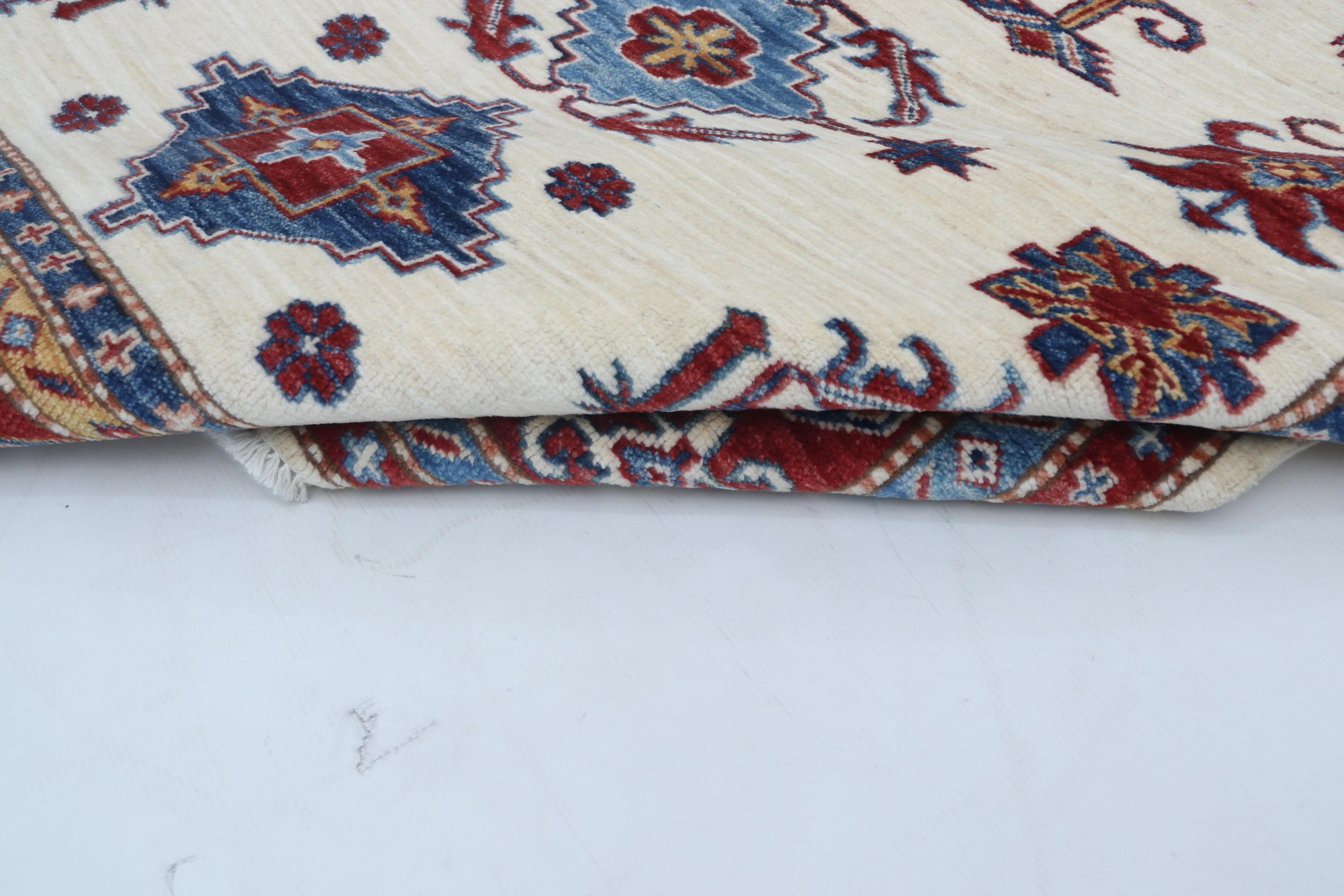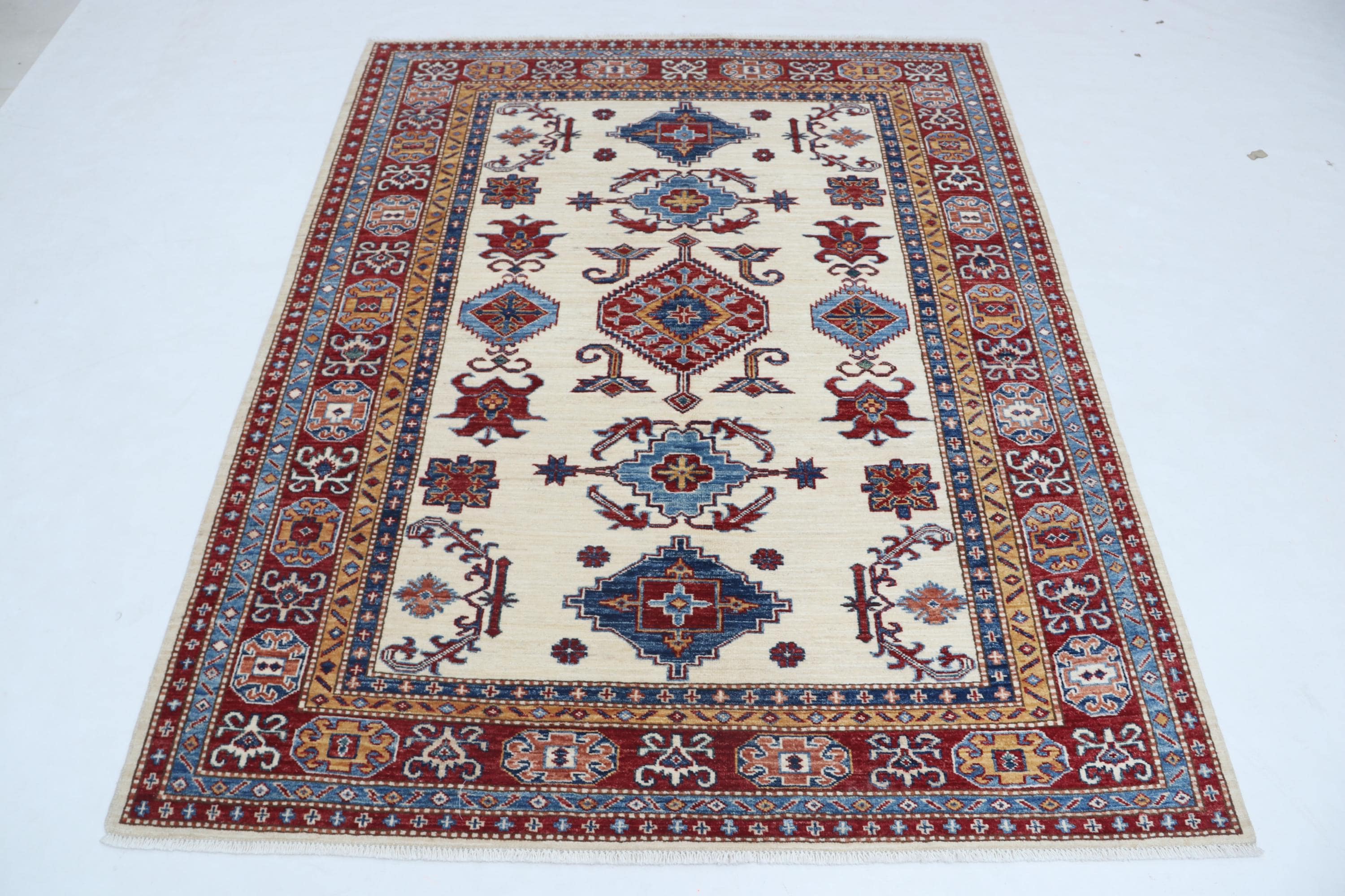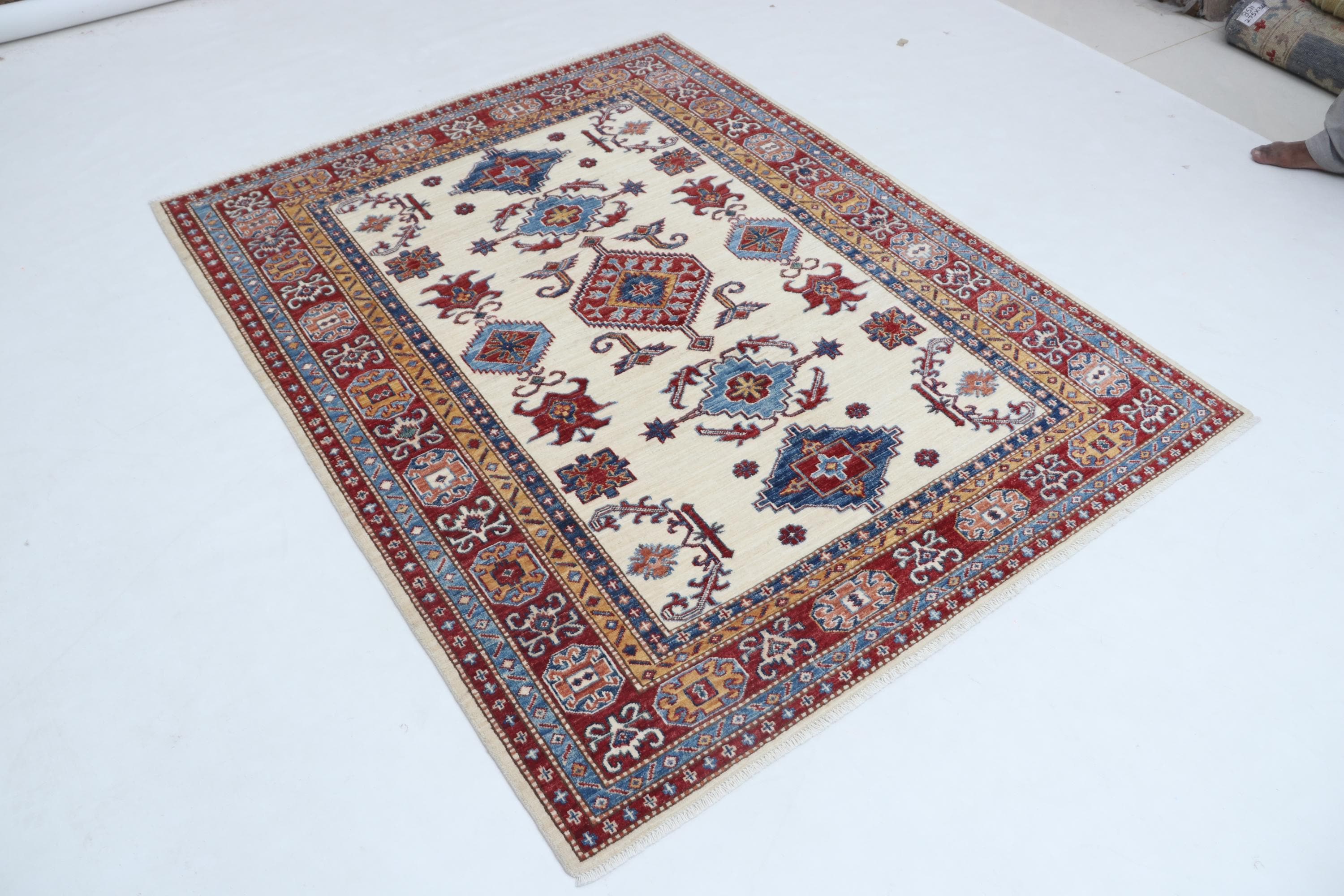 Elevate your décor with the Super Kazak , a luxury handmade Geonatrical rug.