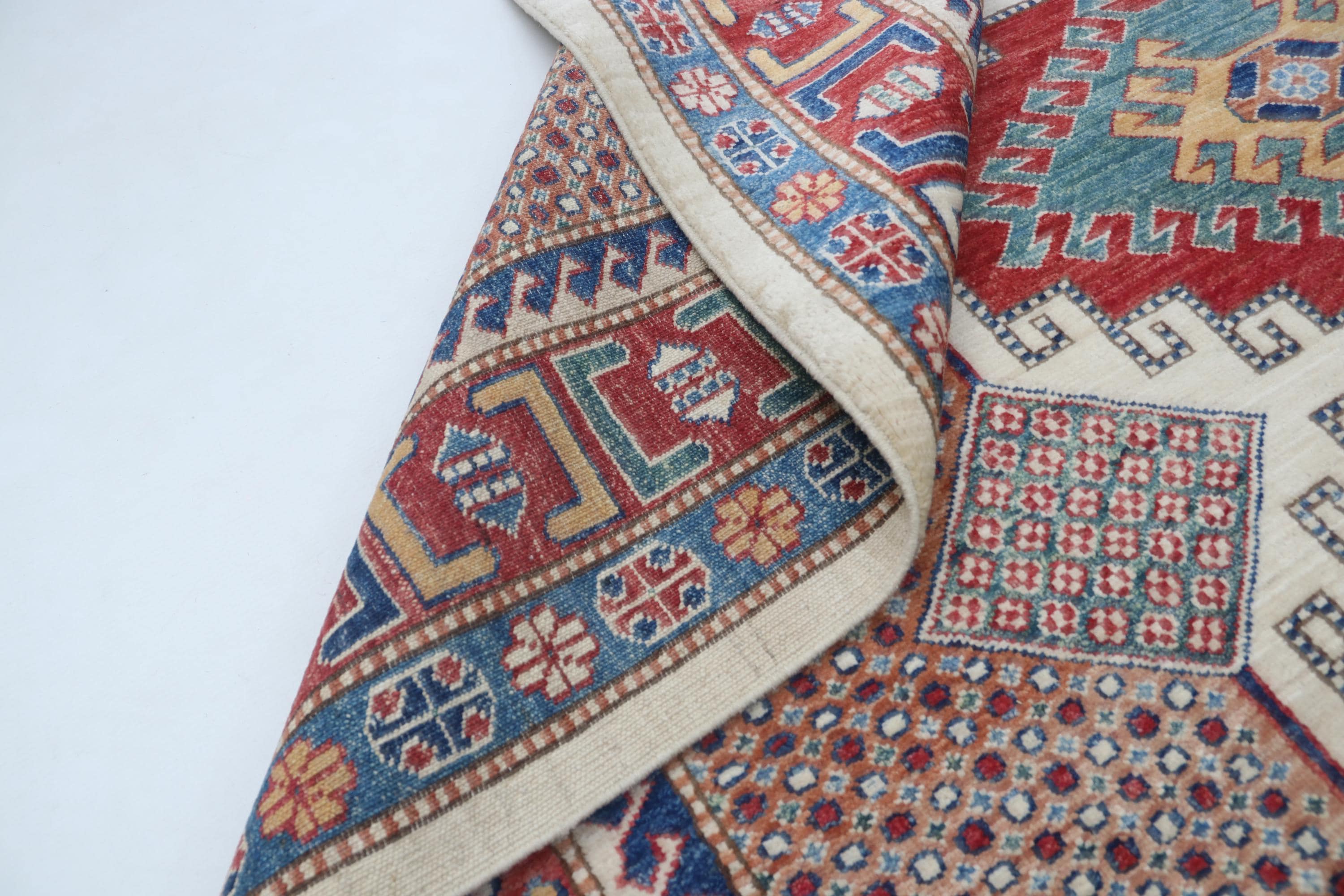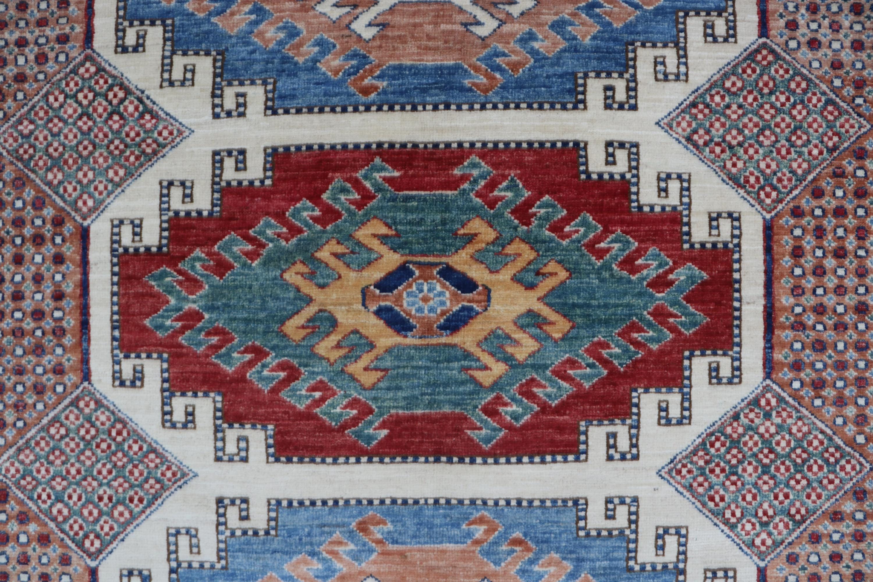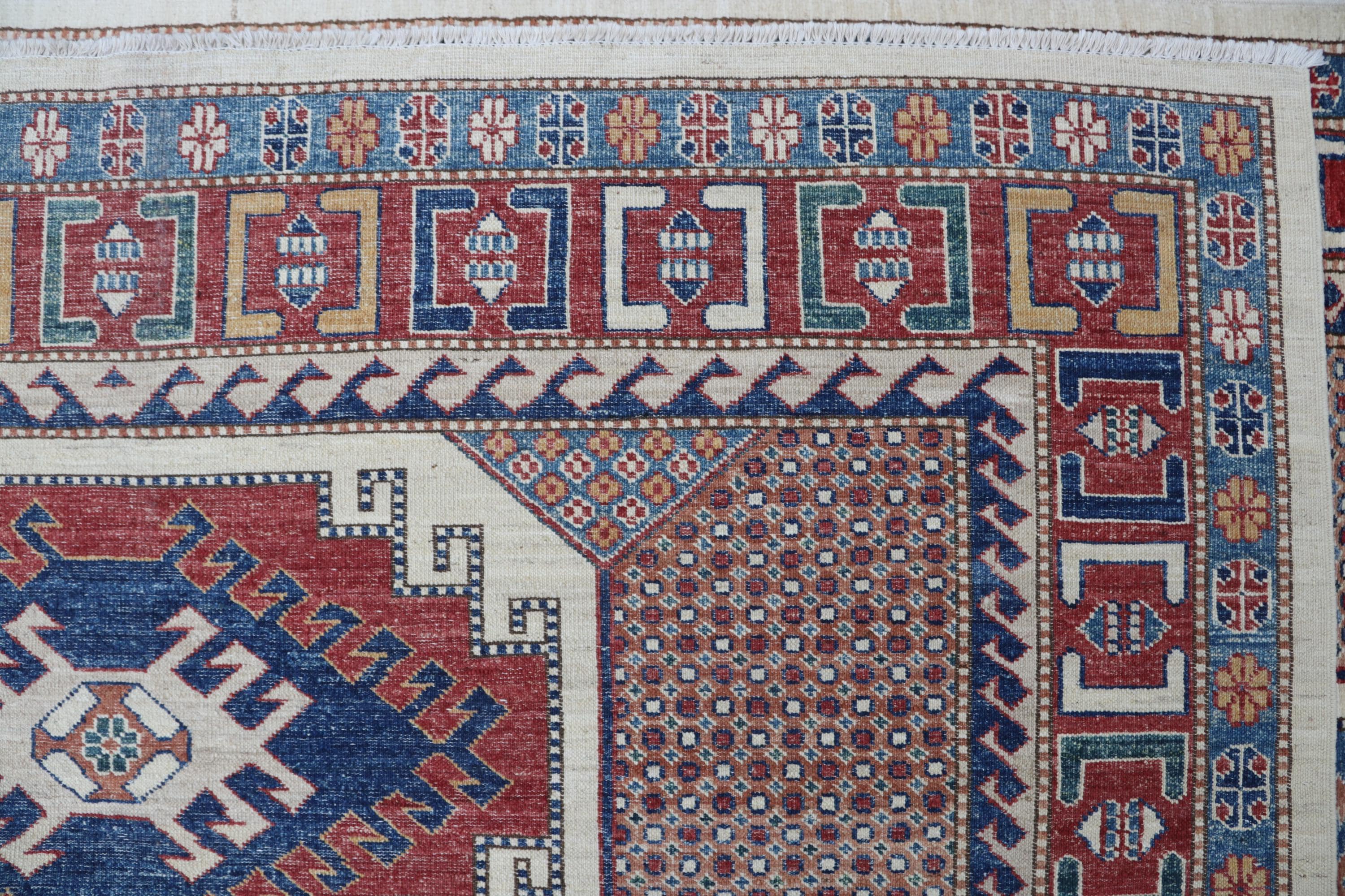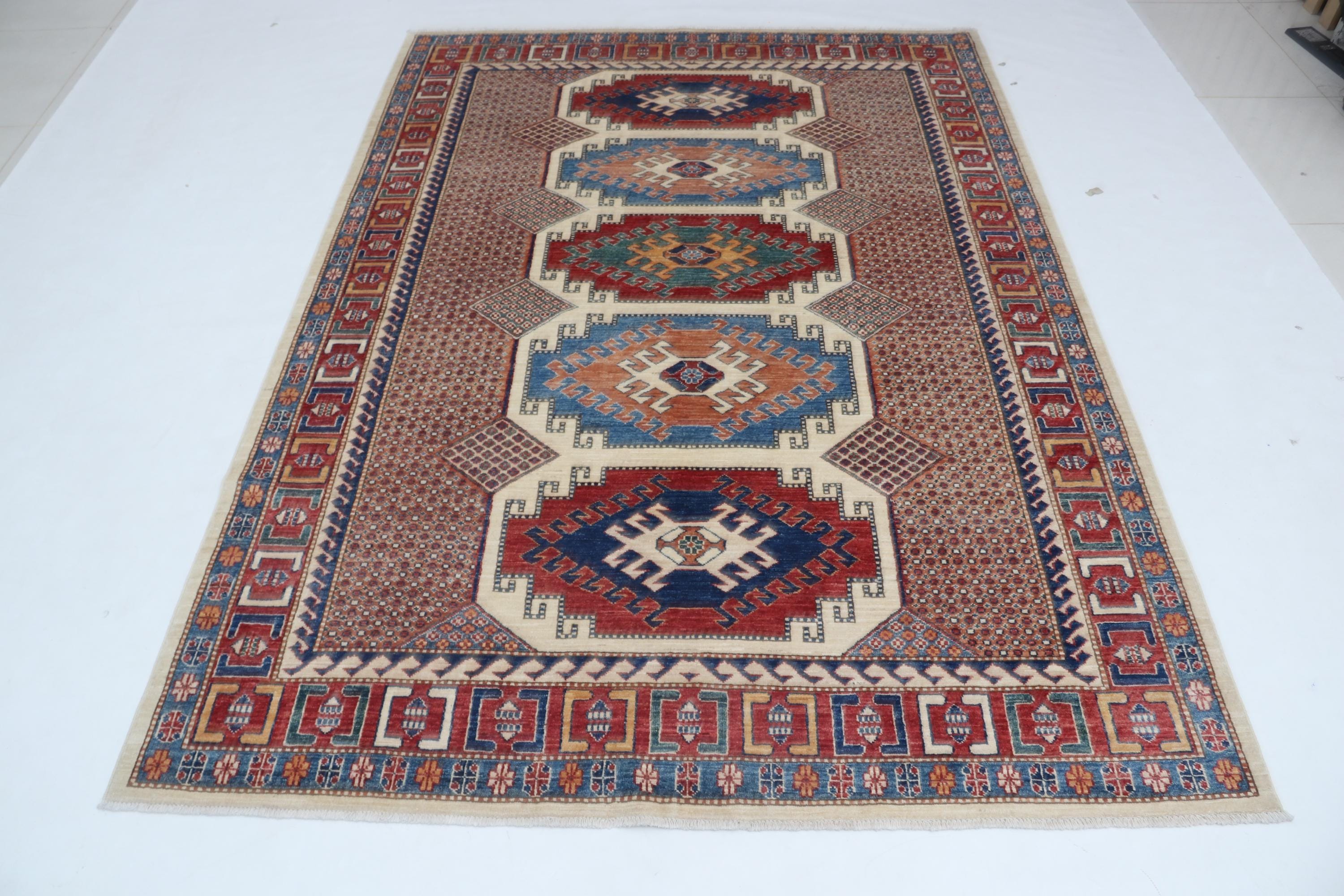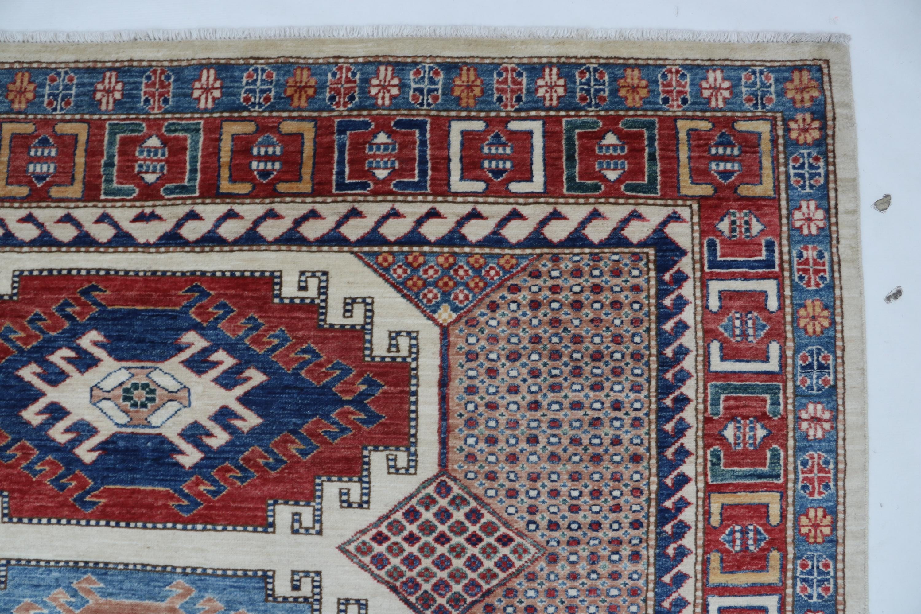 Elevate your décor with the Super Kazak , a luxury handmade Geonatrical rug.