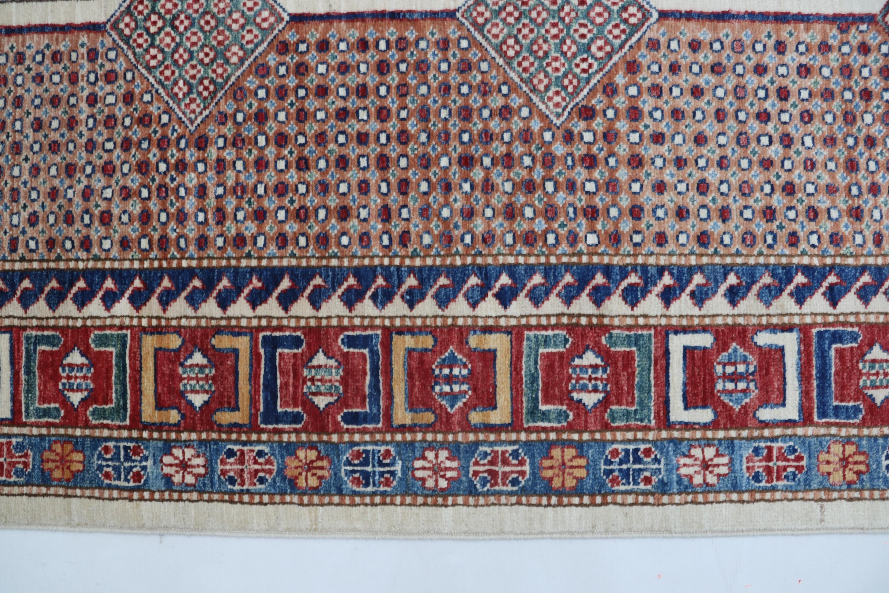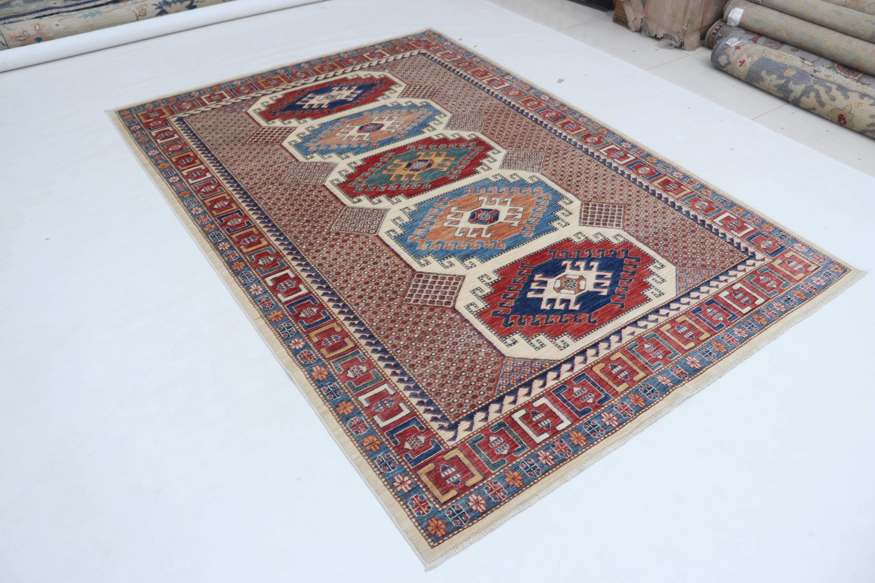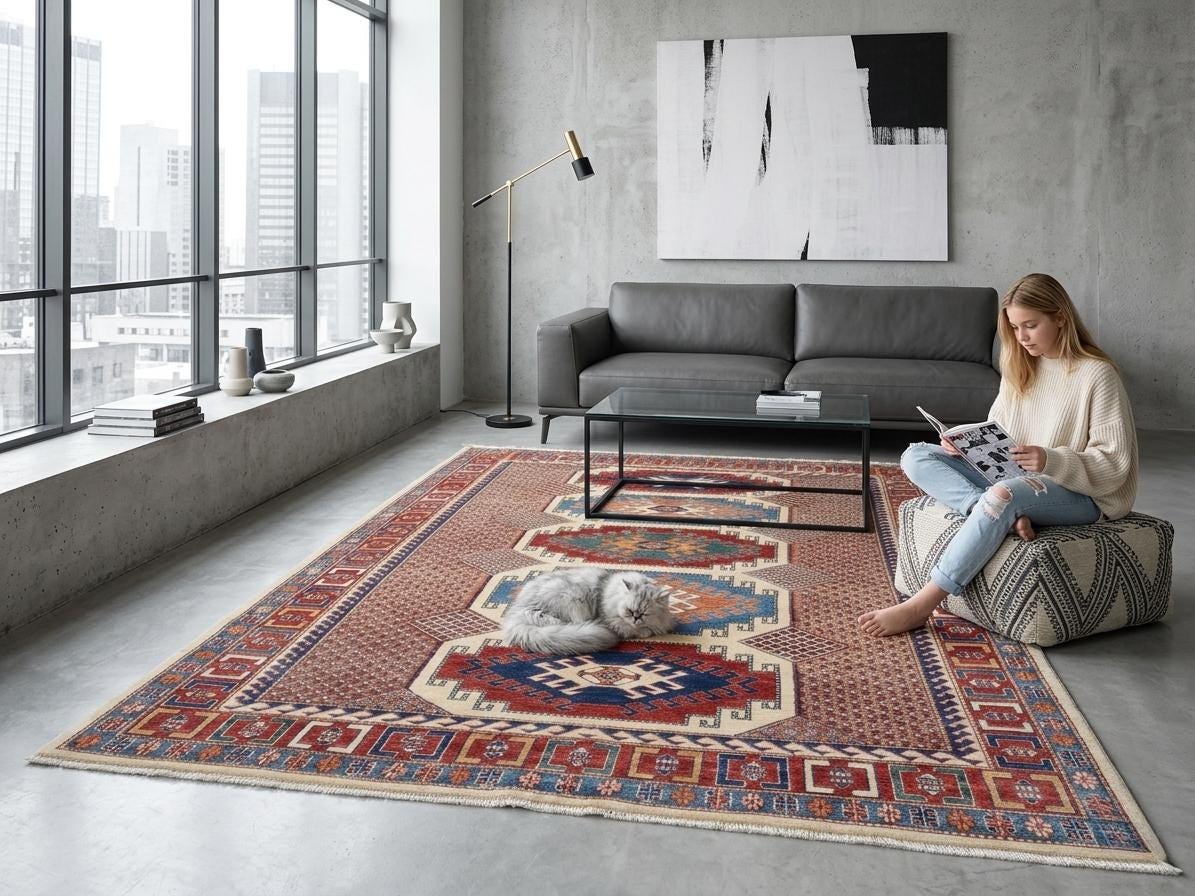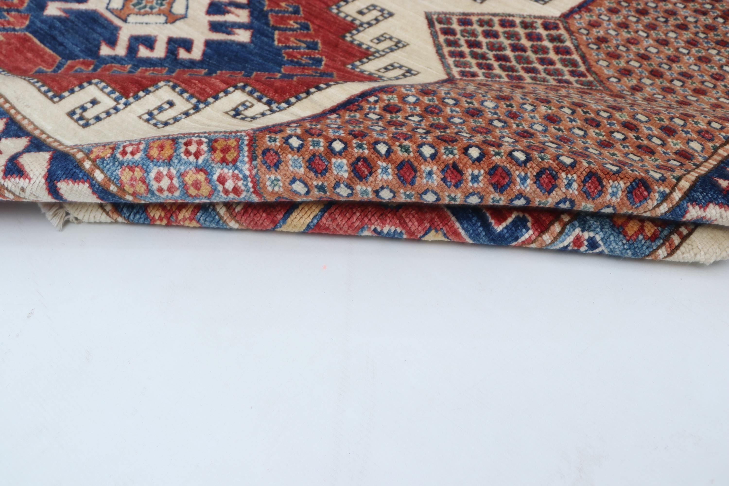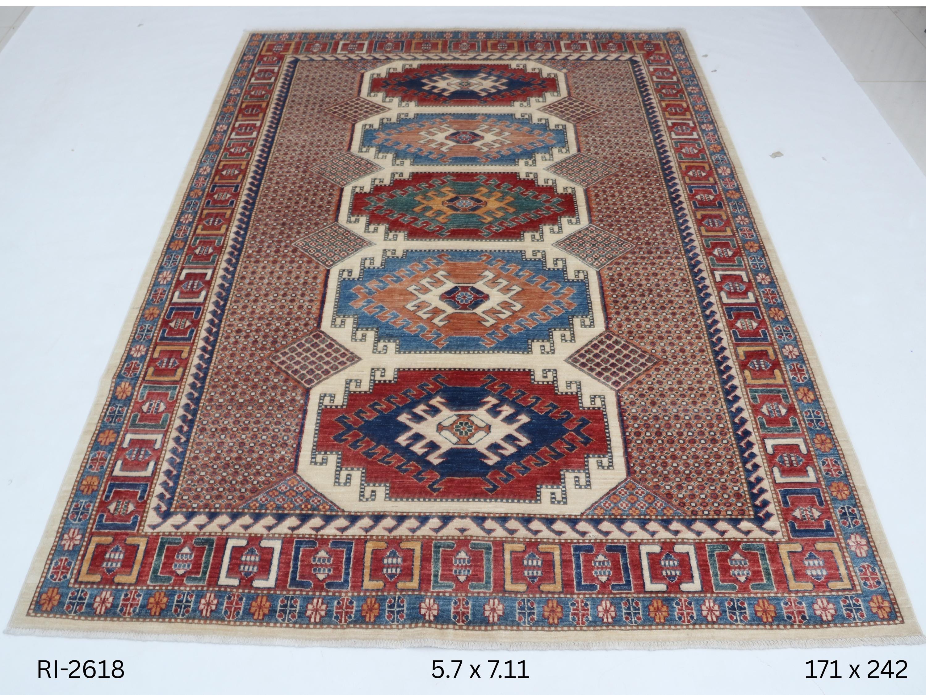 Elevate your décor with the Super Kazak , a luxury handmade Geonatrical rug.