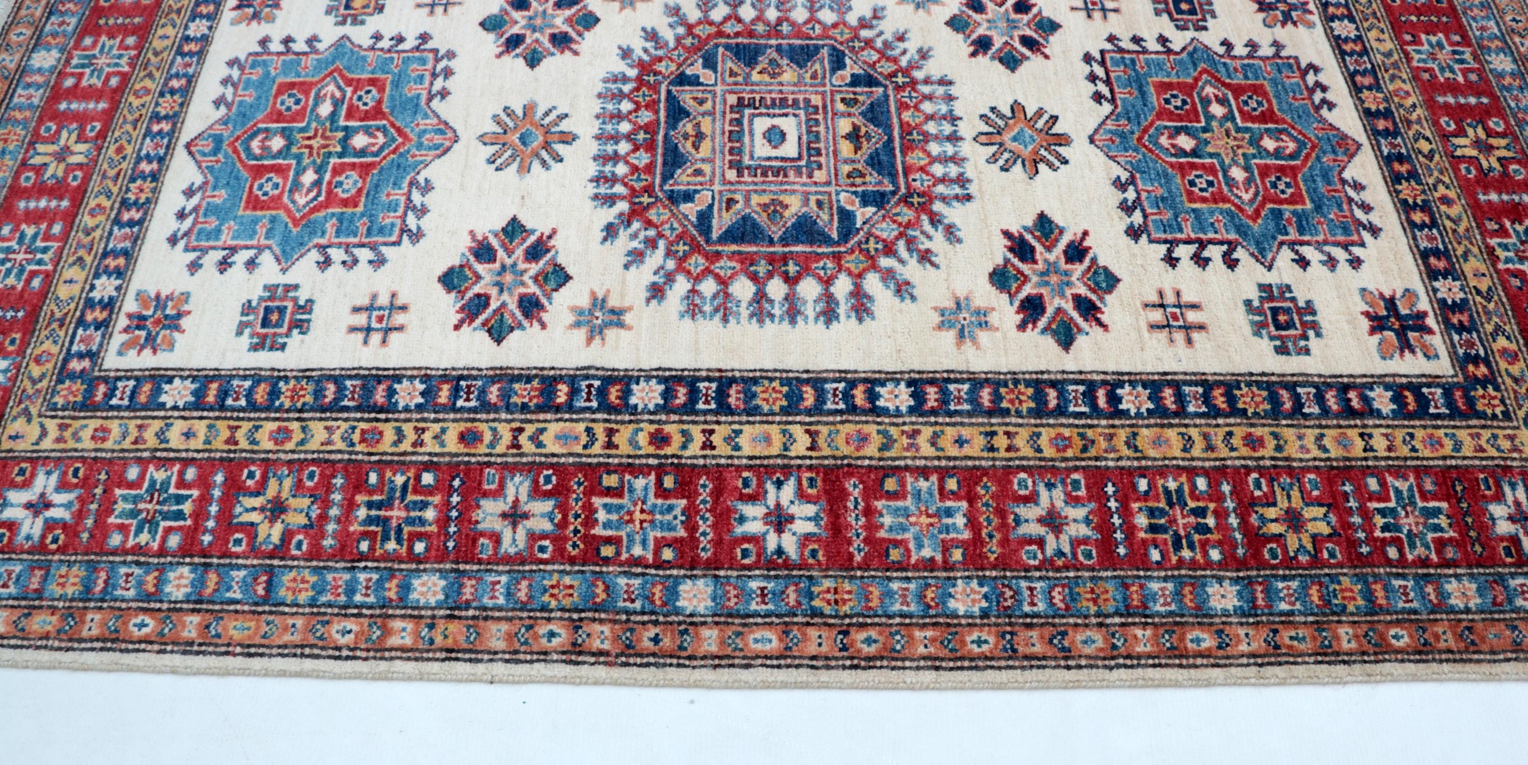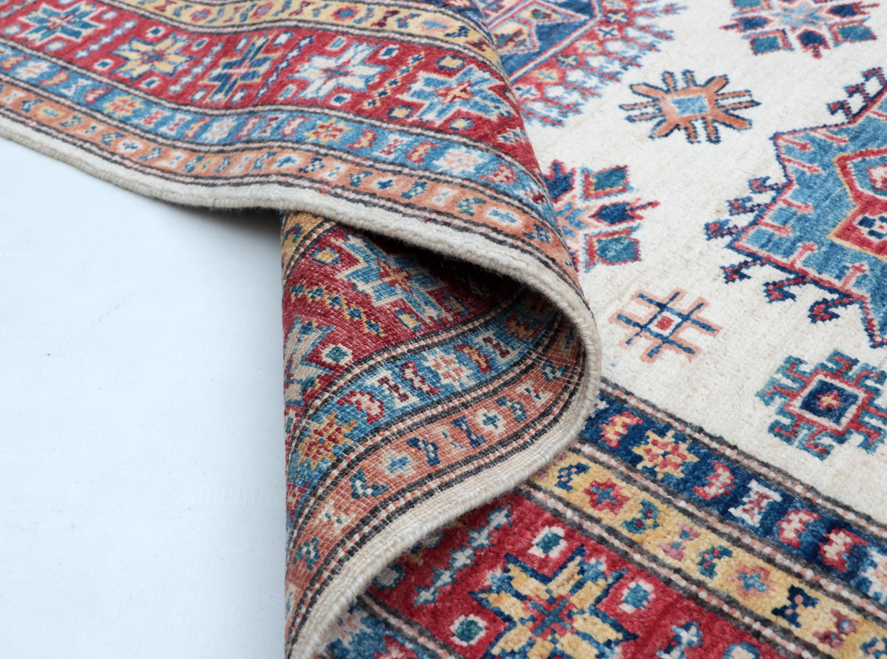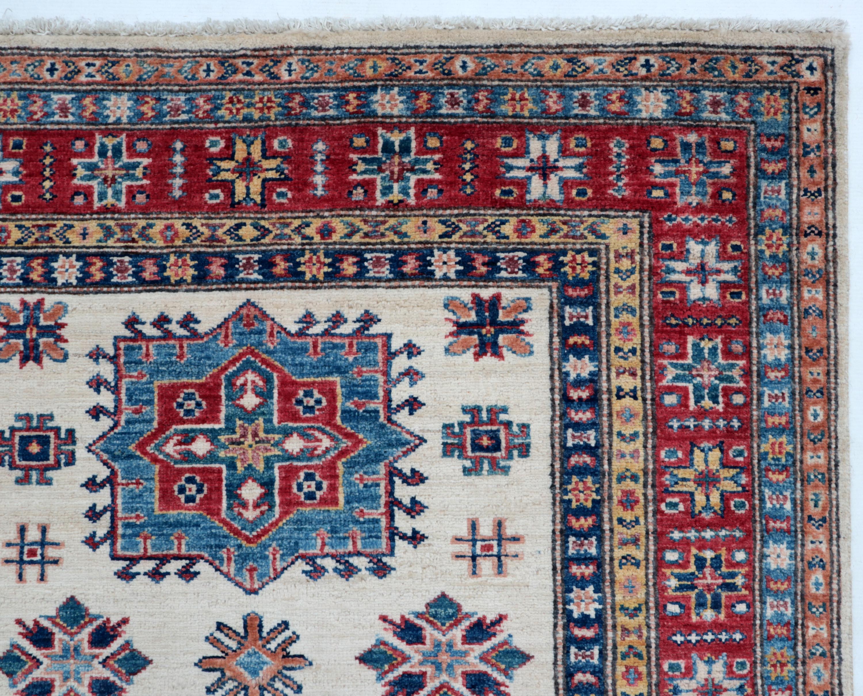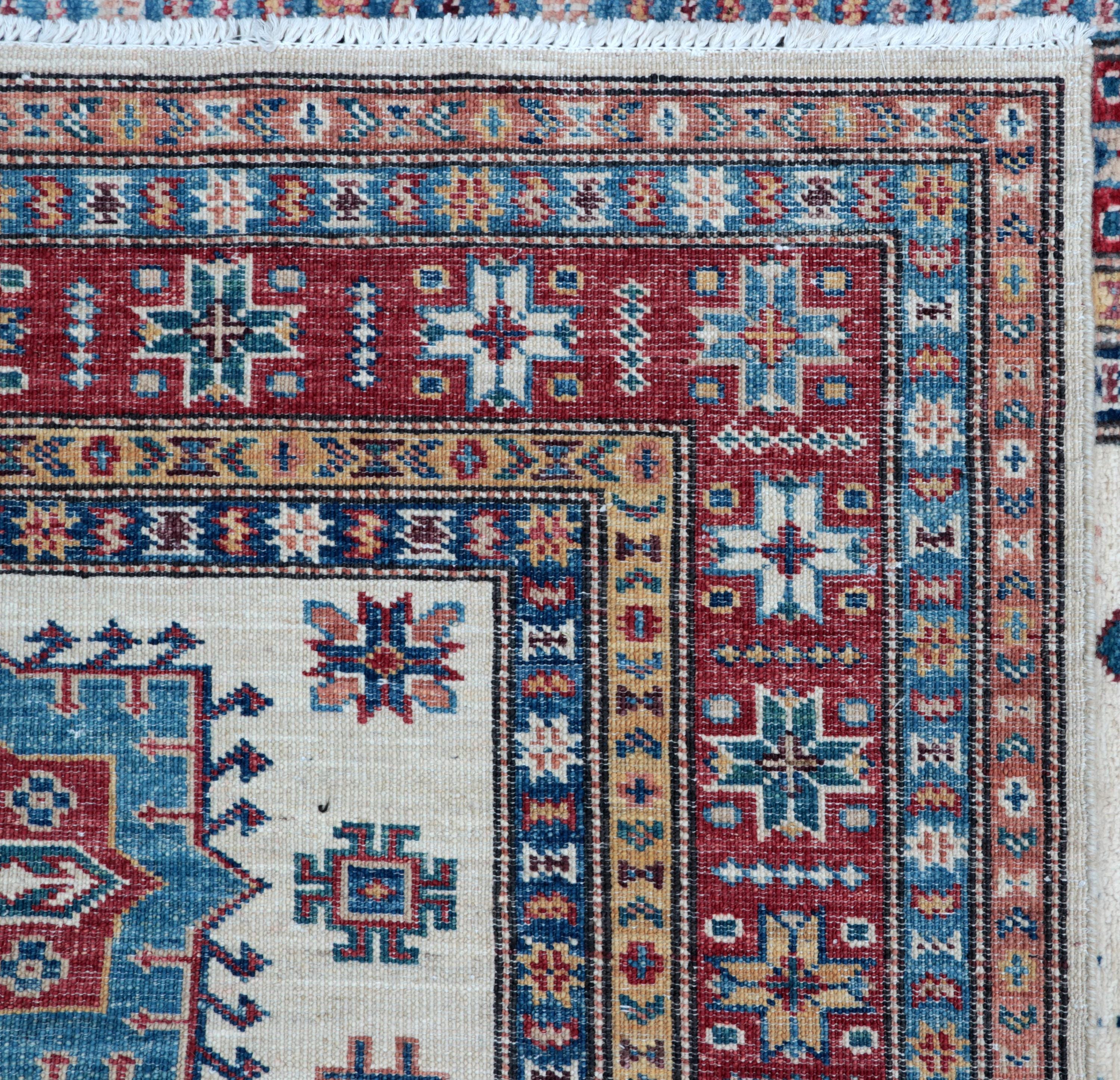 Elevate your décor with the Super Kazak , a luxury handmade Geonatrical rug.