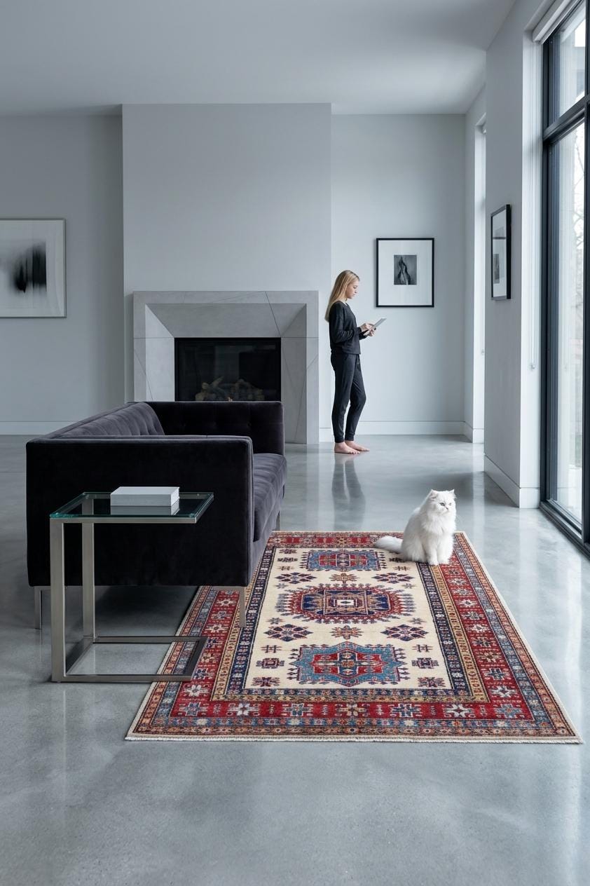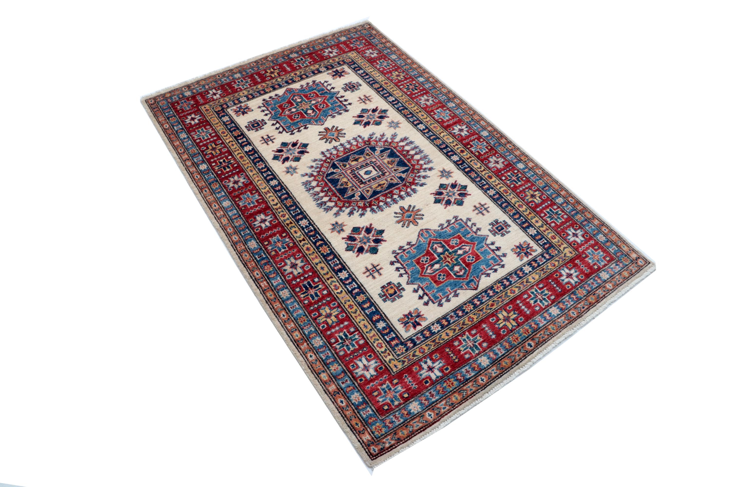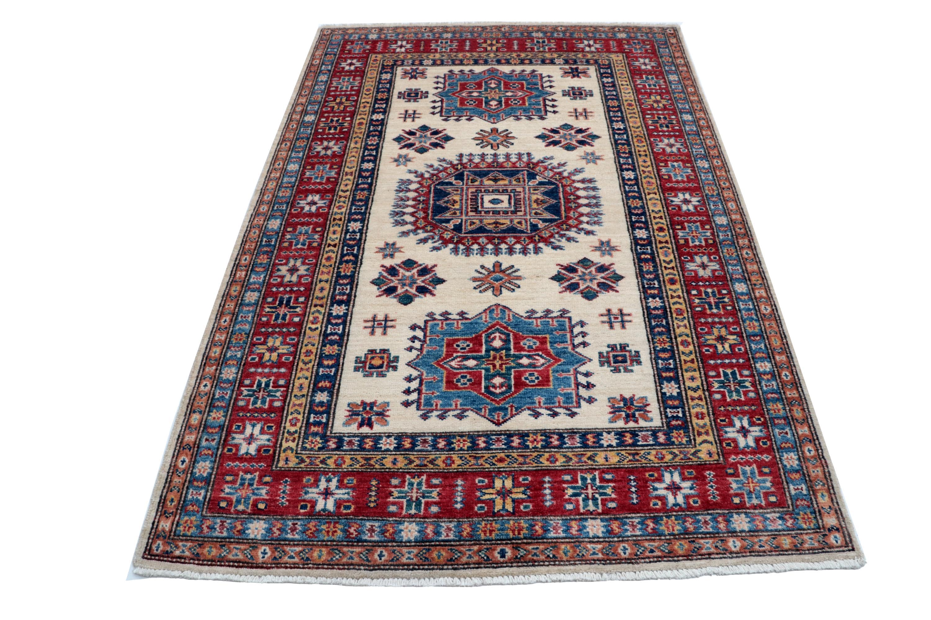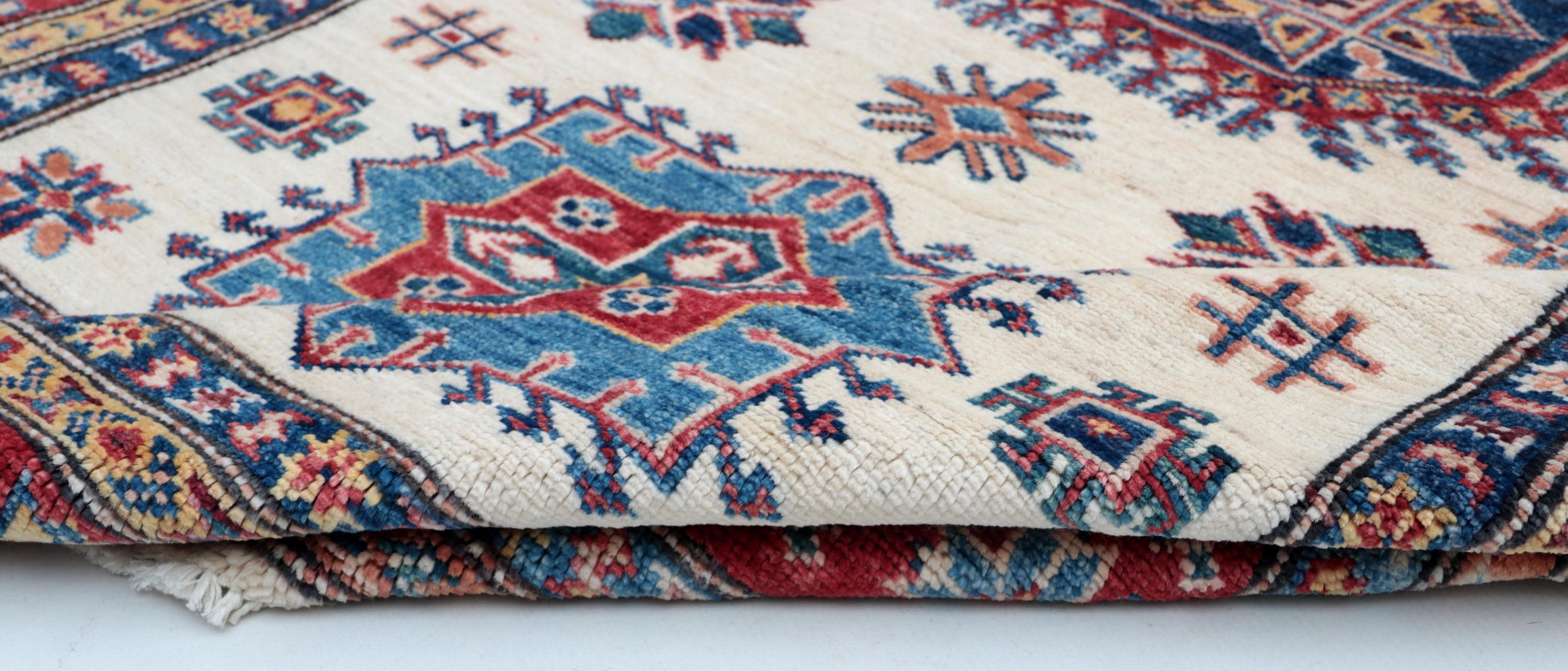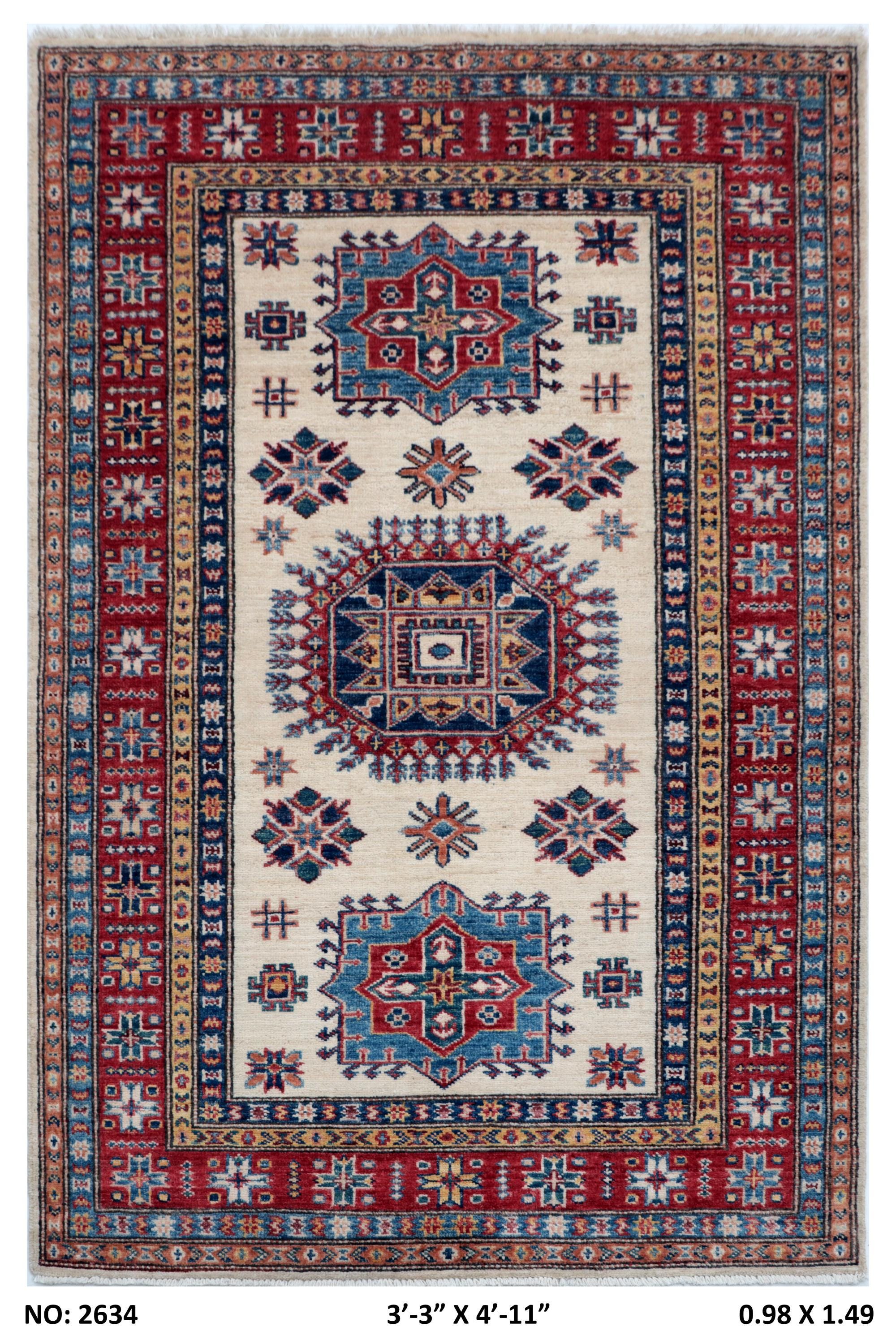 Elevate your décor with the Super Kazak , a luxury handmade Geonatrical rug.