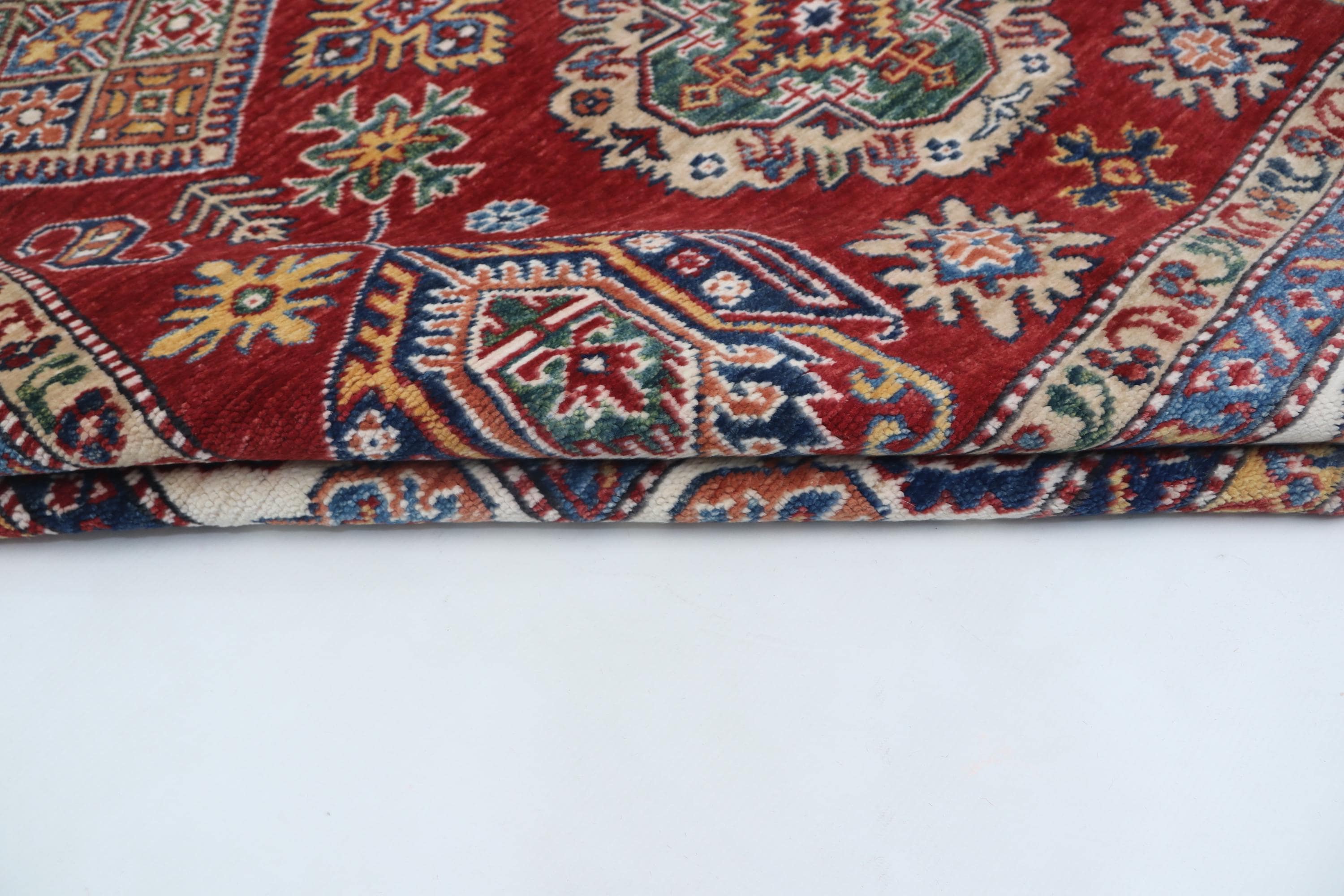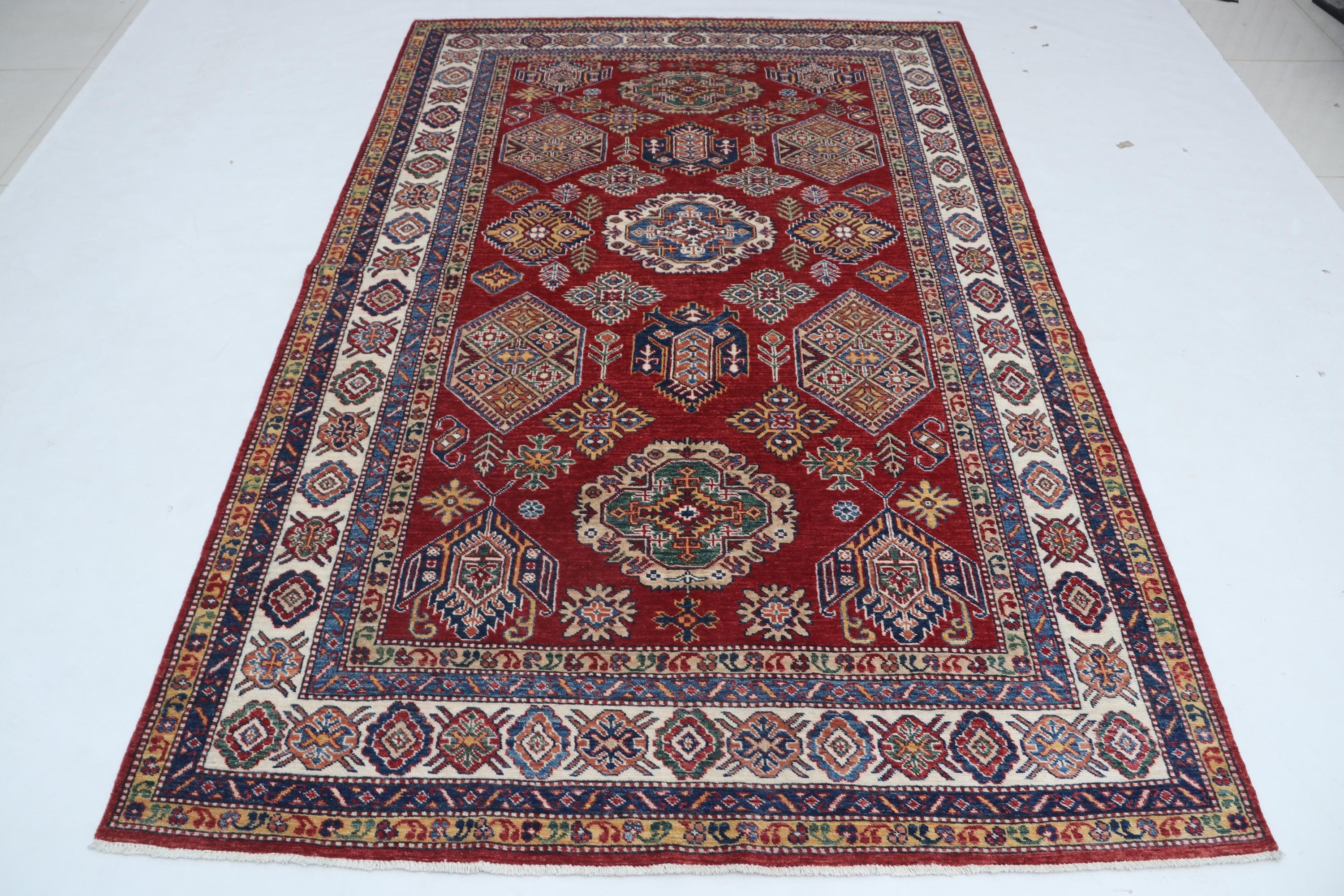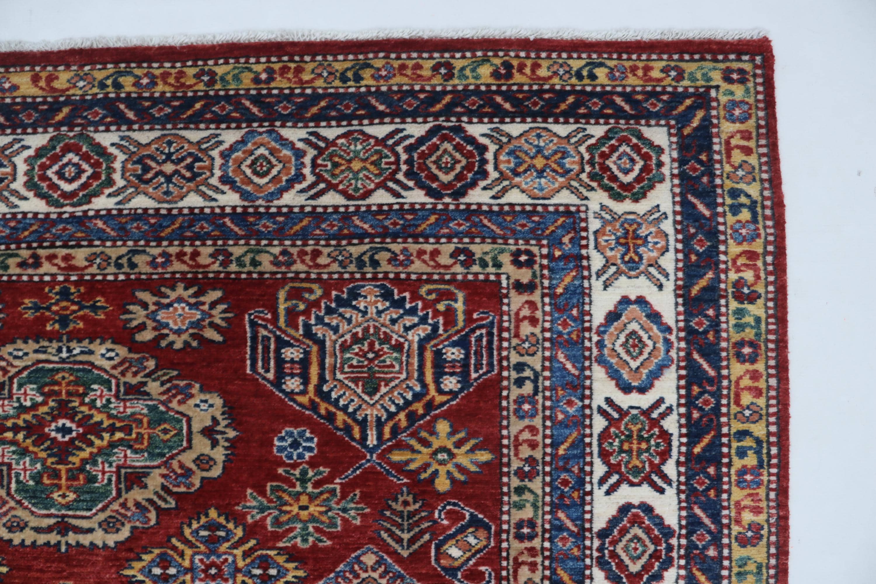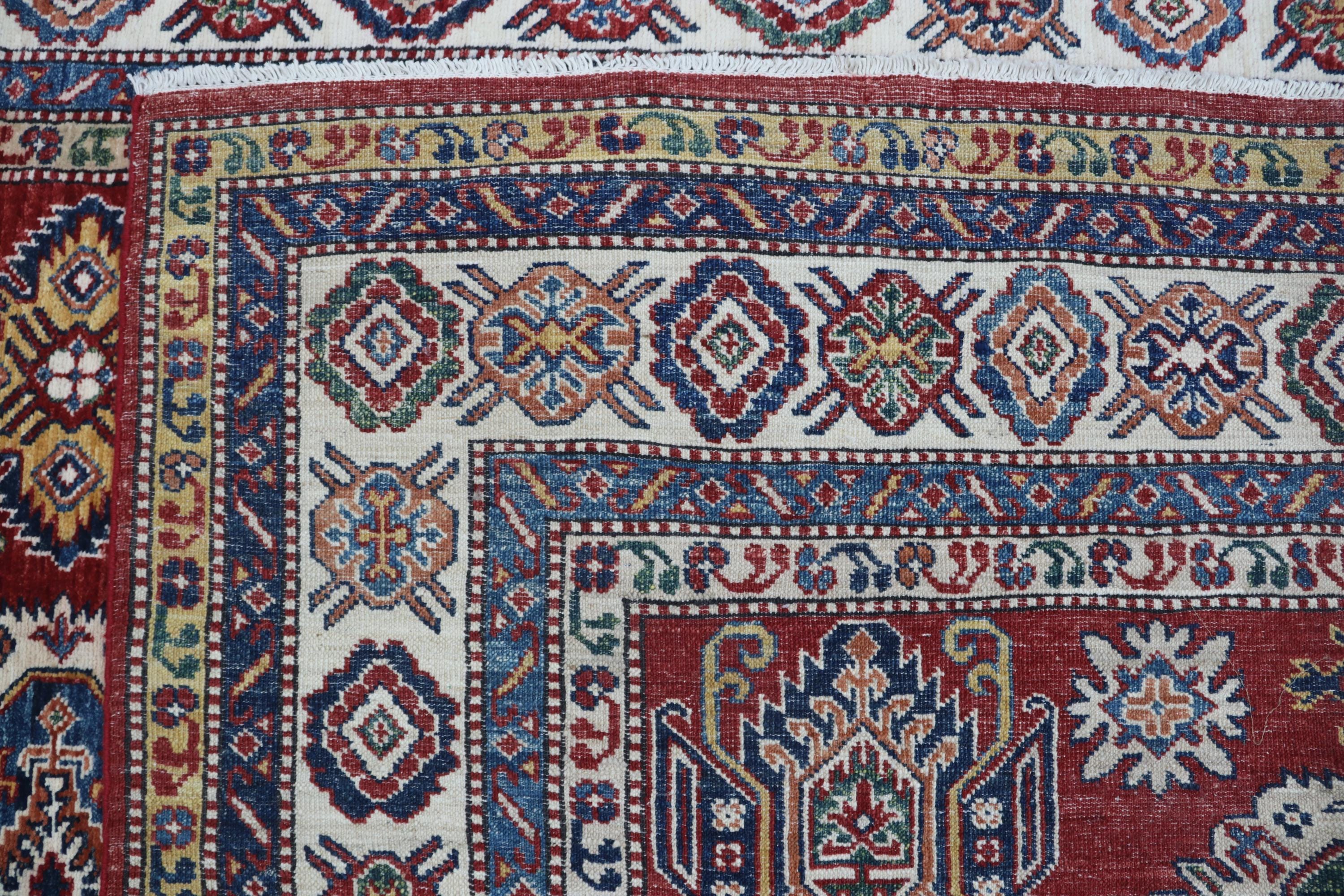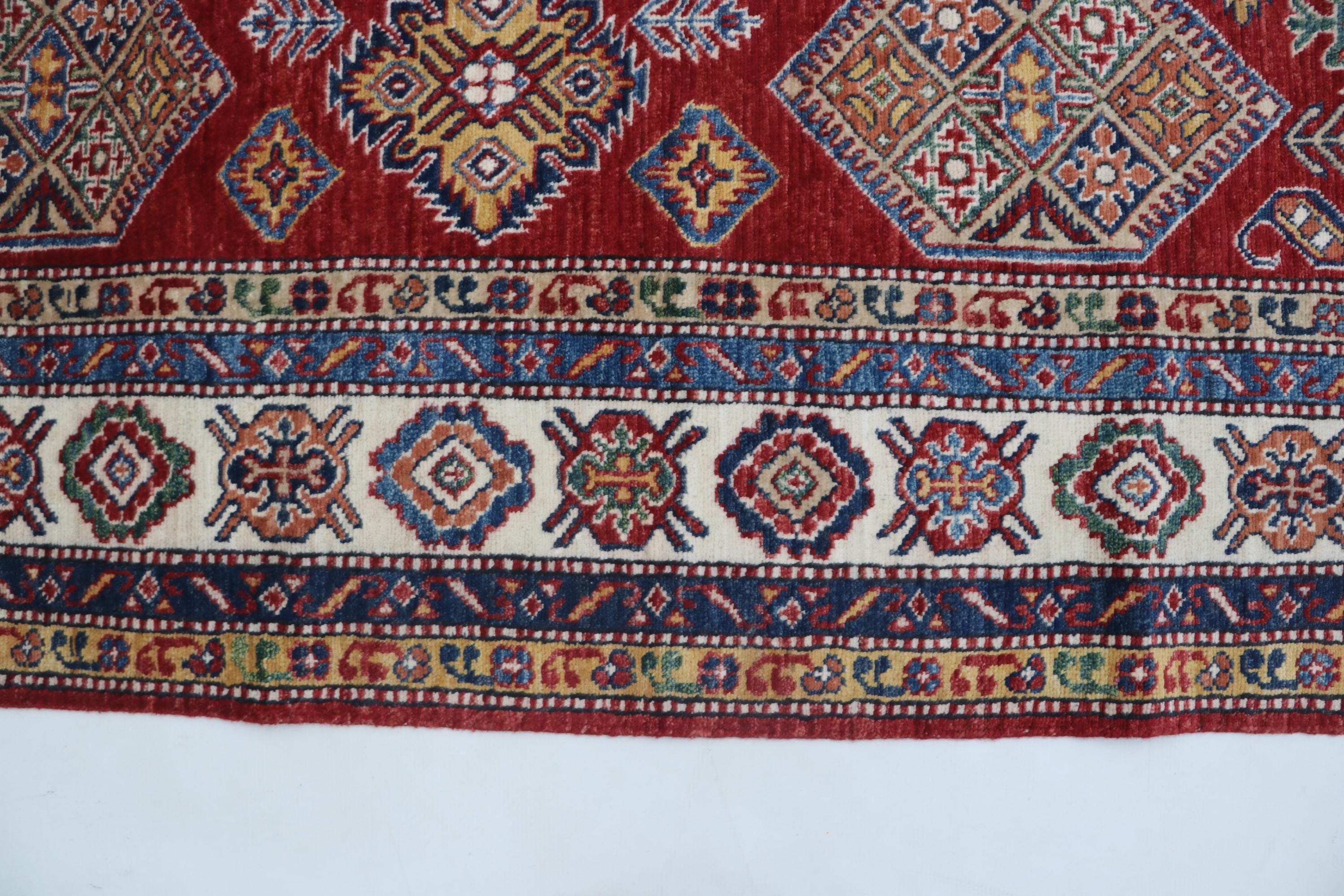 Elevate your décor with the Super Kazak , a luxury handmade Geonatrical rug.