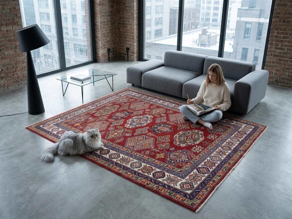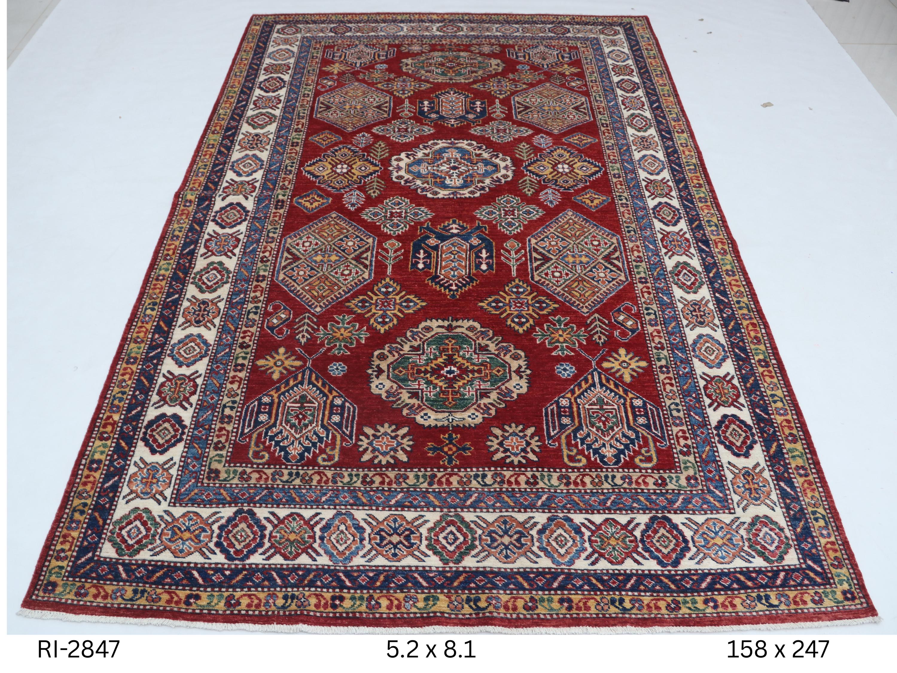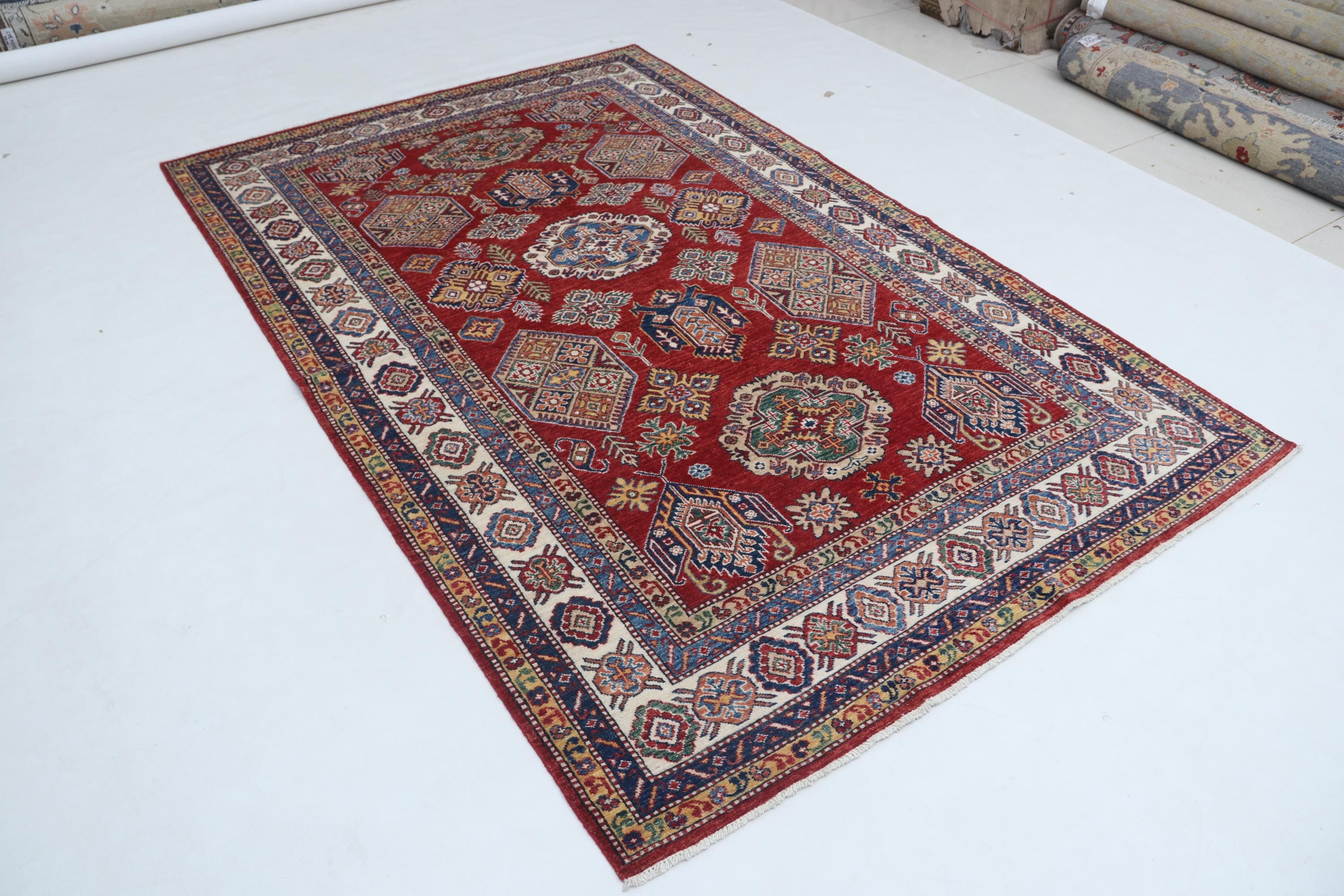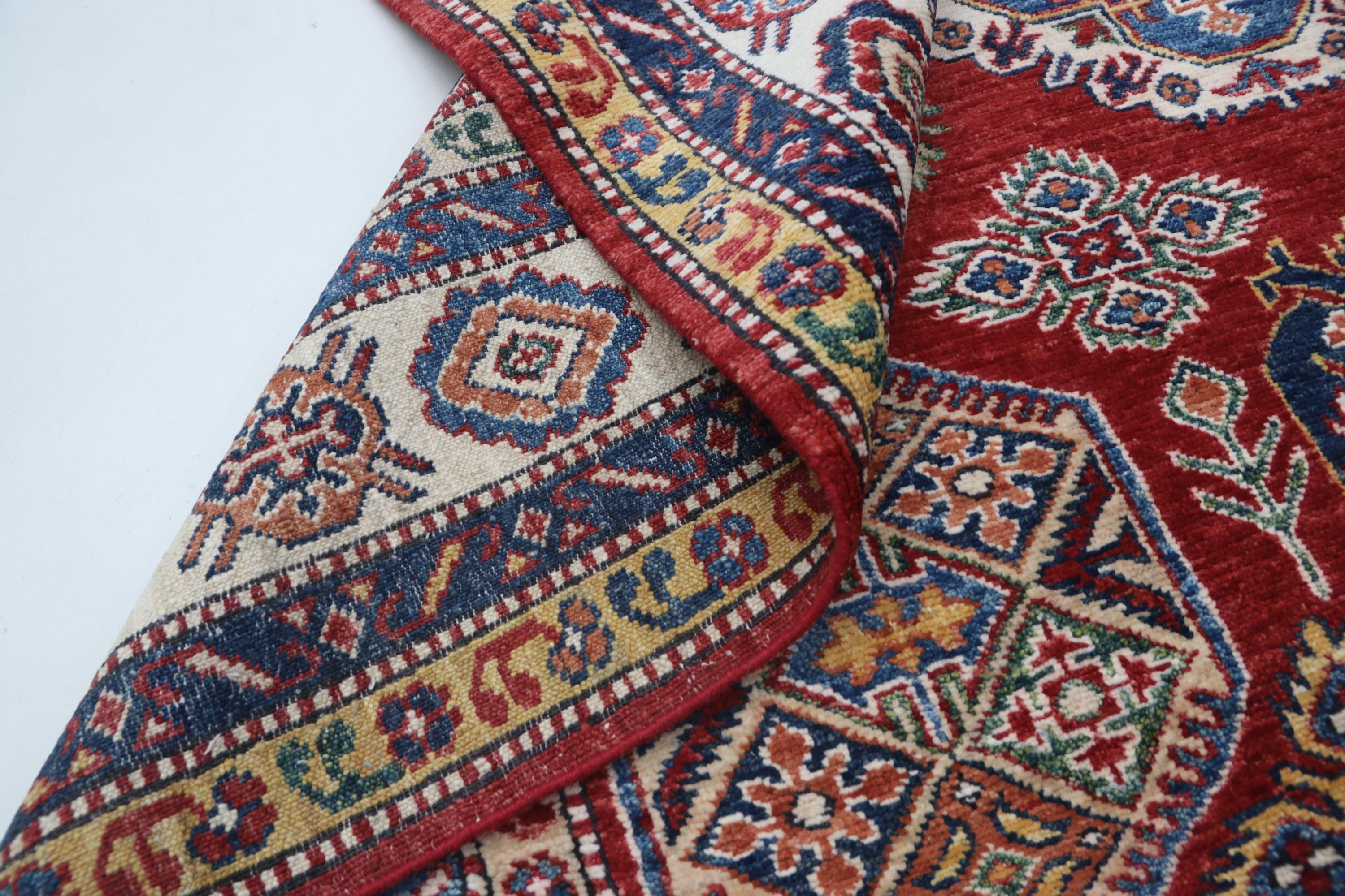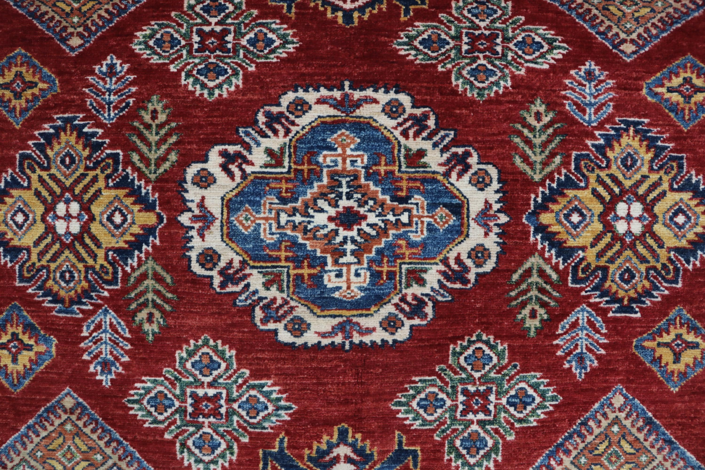 Elevate your décor with the Super Kazak , a luxury handmade Geonatrical rug.