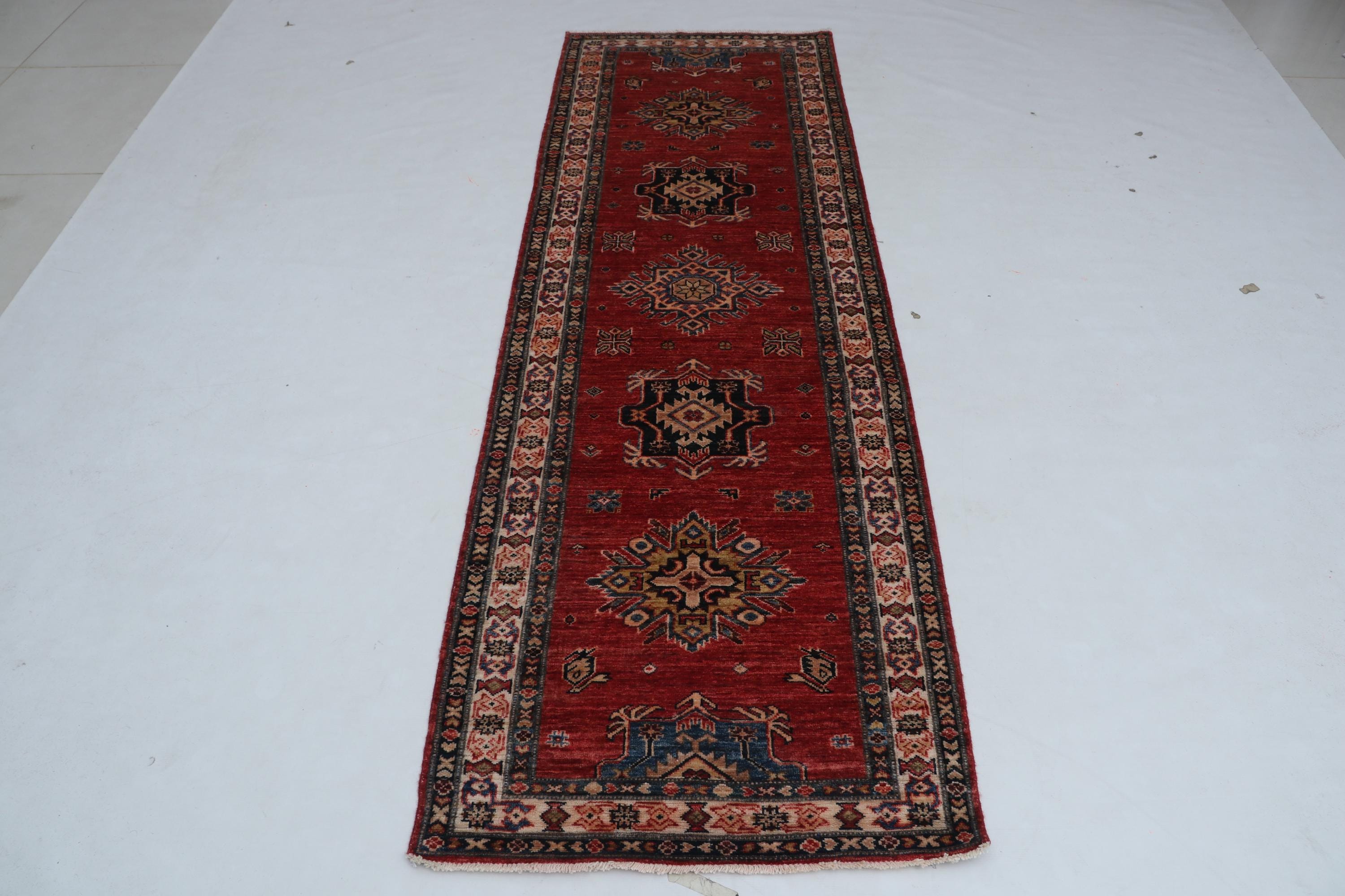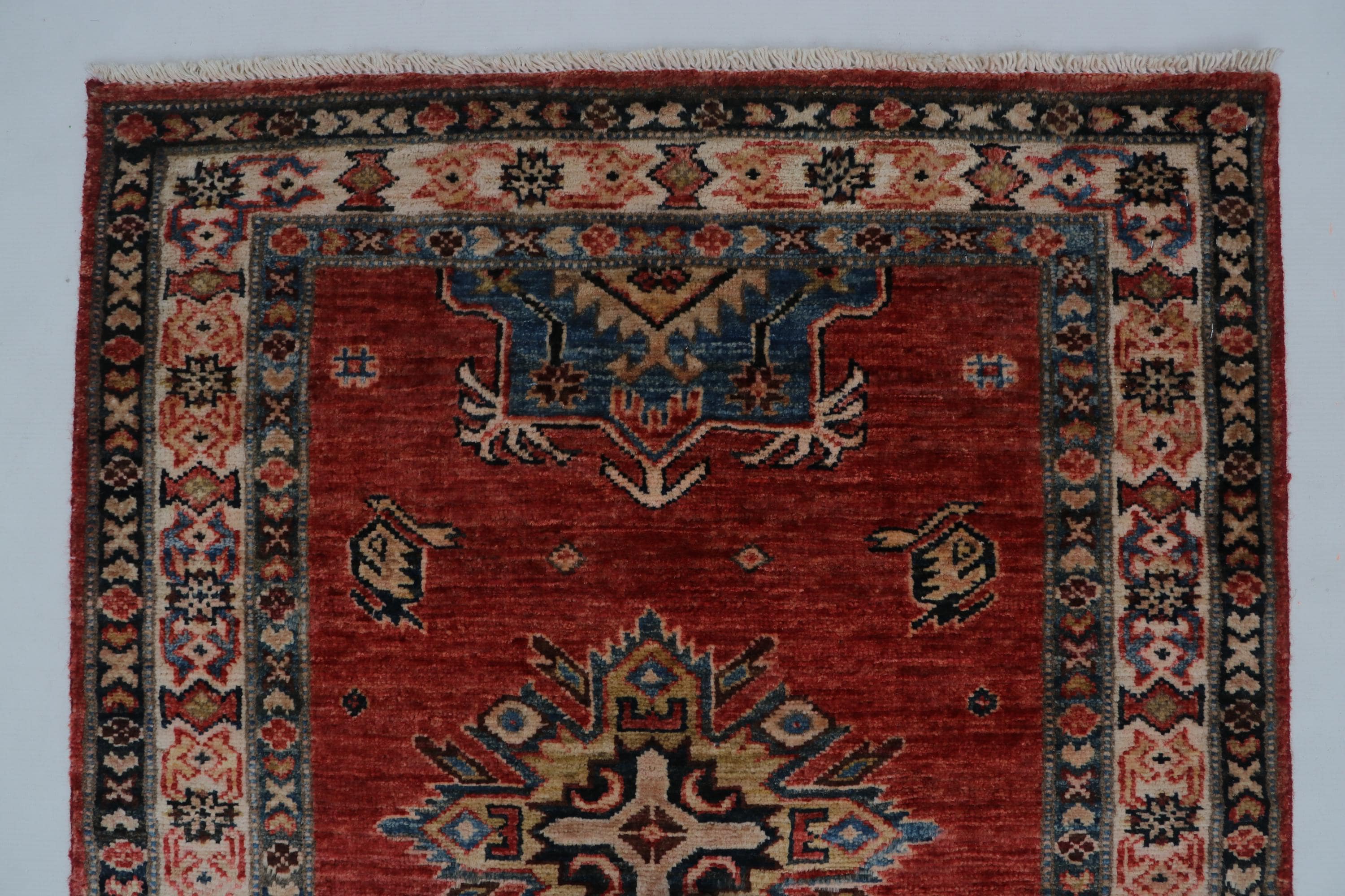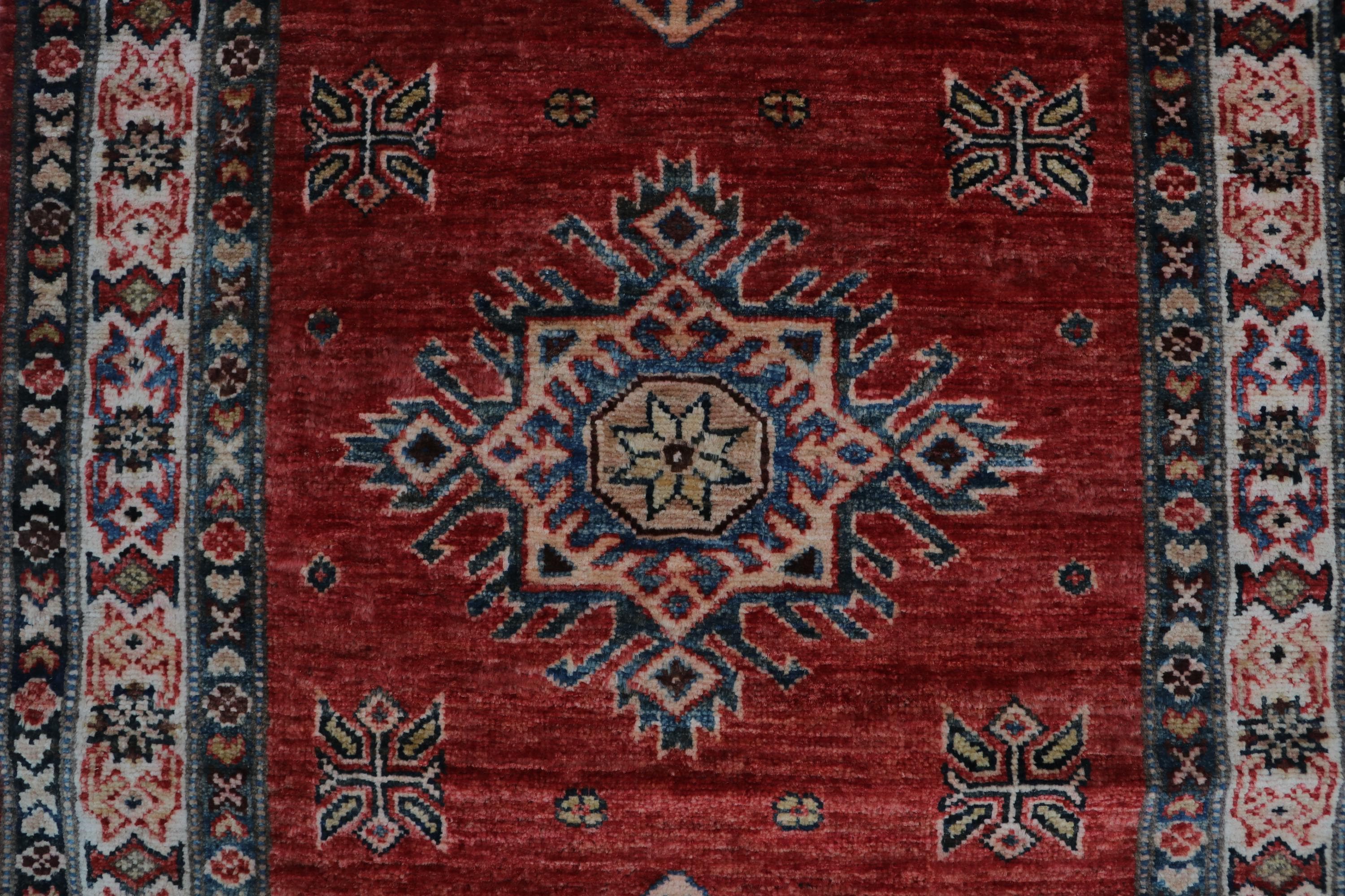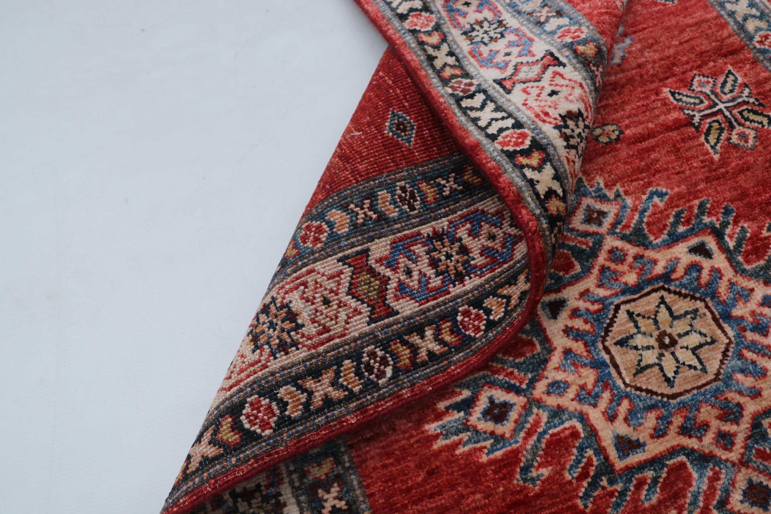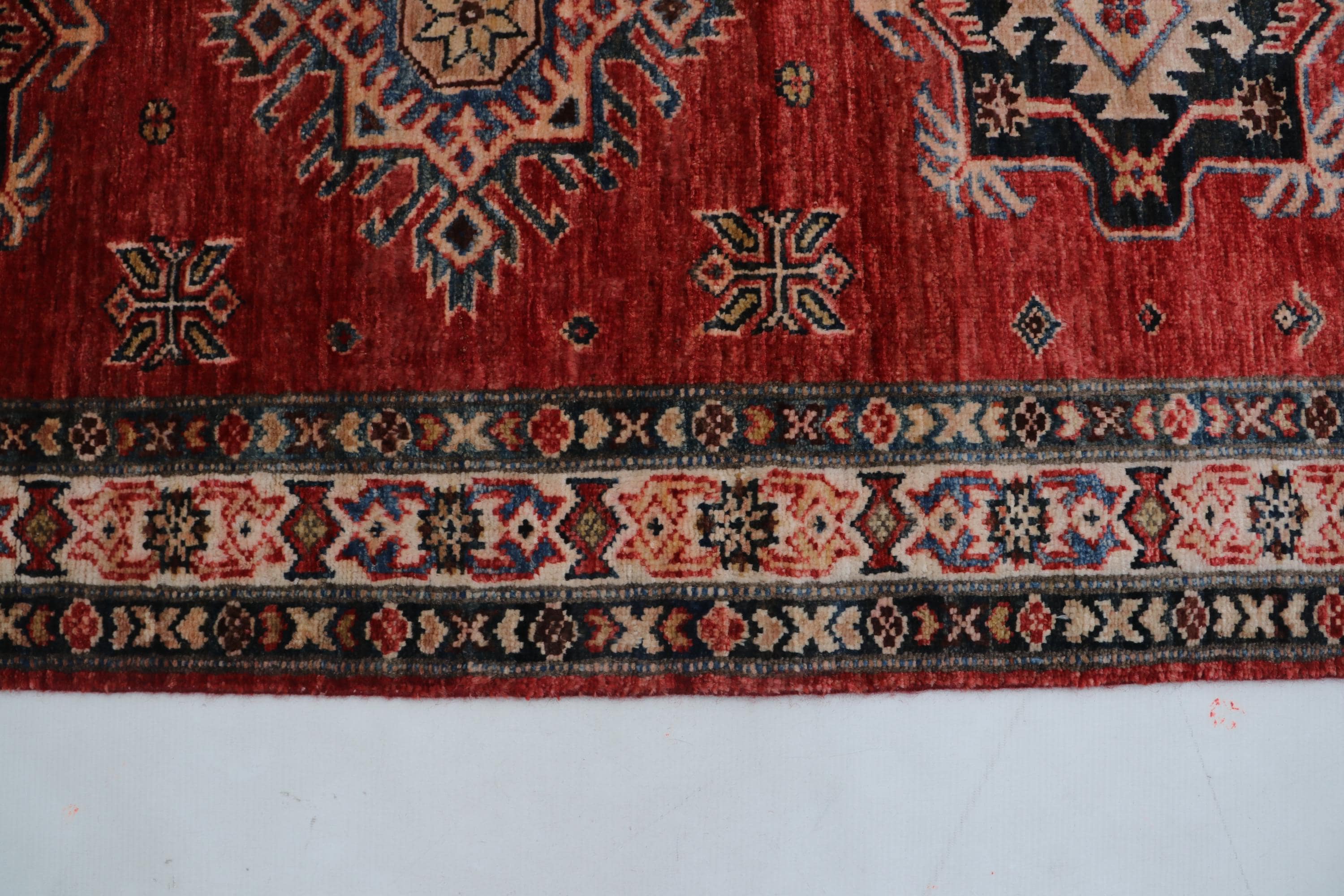 Elevate your décor with the Super Kazak , a luxury handmade Geonatrical rug.