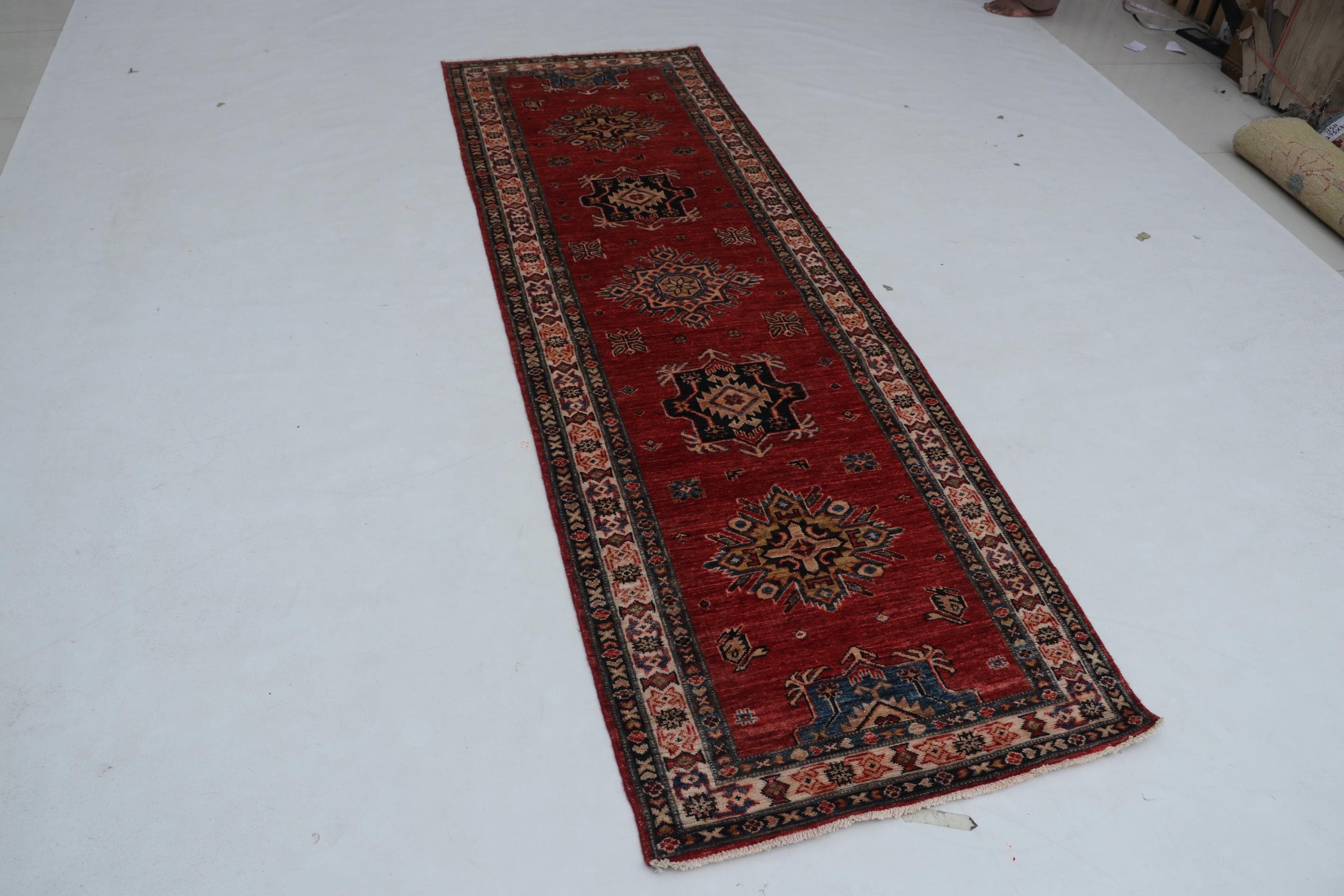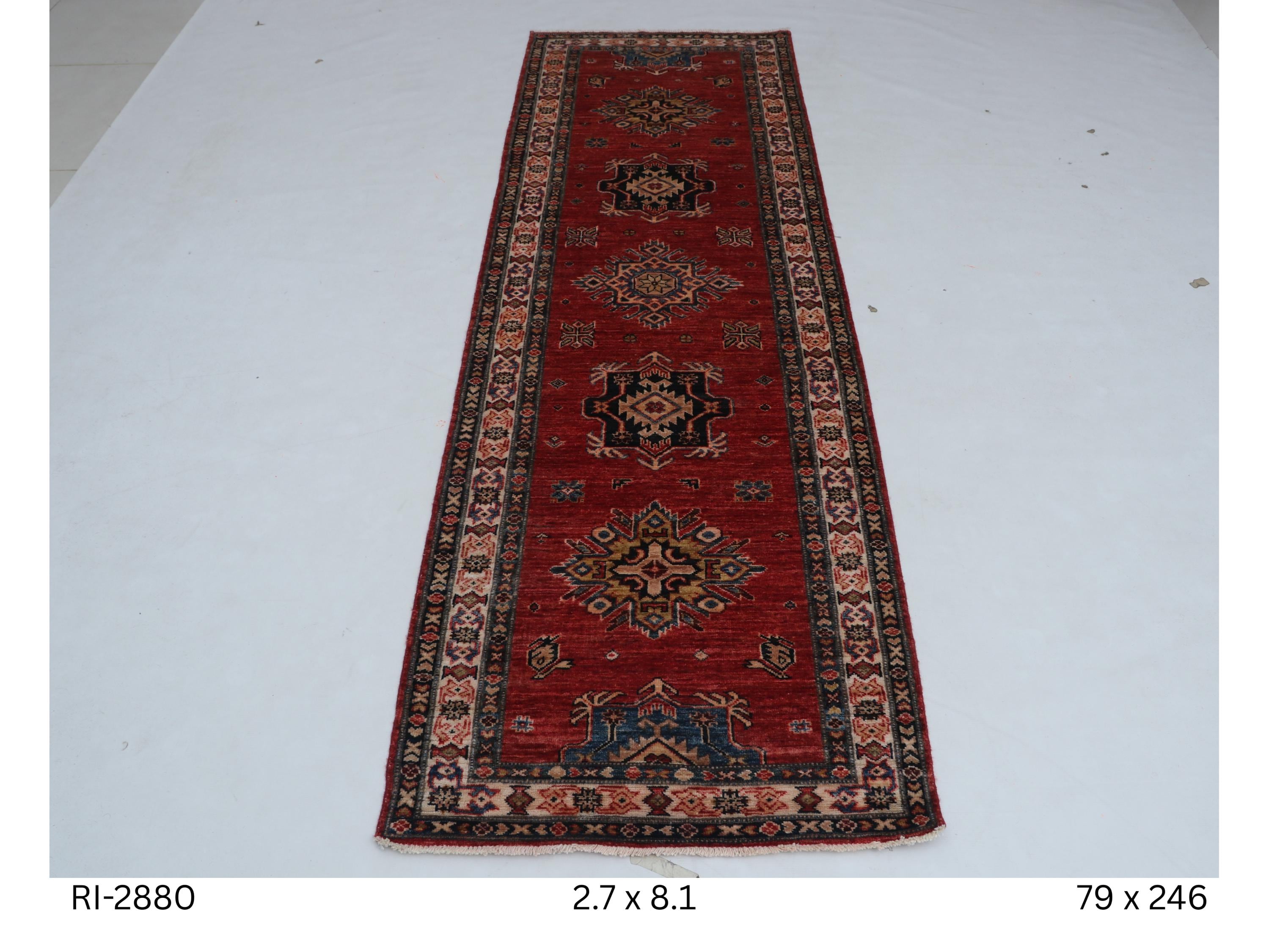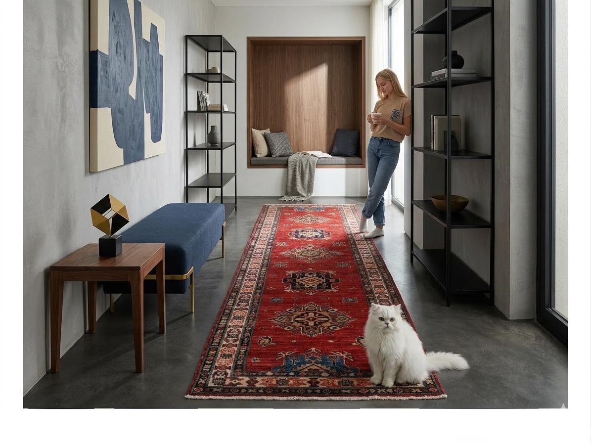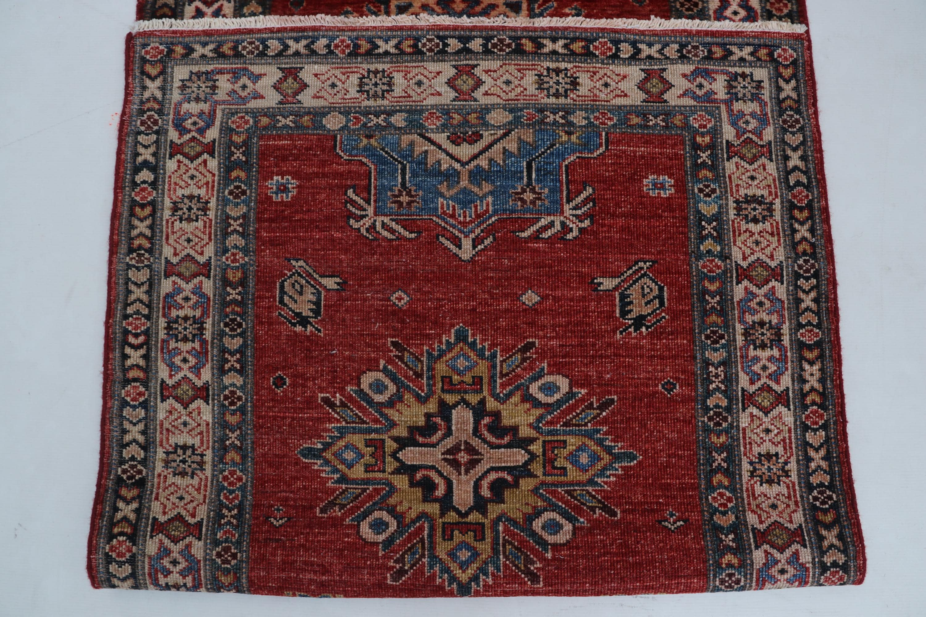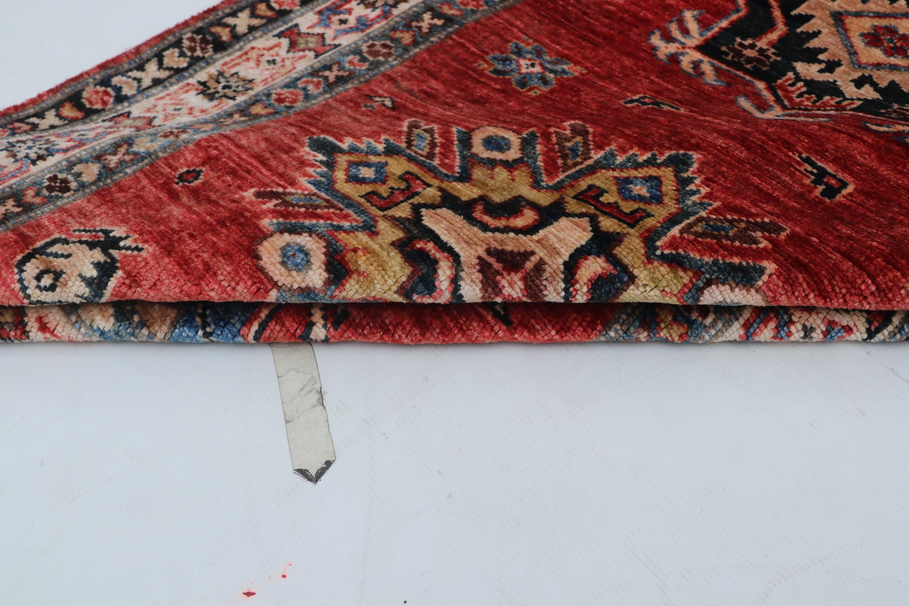 Elevate your décor with the Super Kazak , a luxury handmade Geonatrical rug.