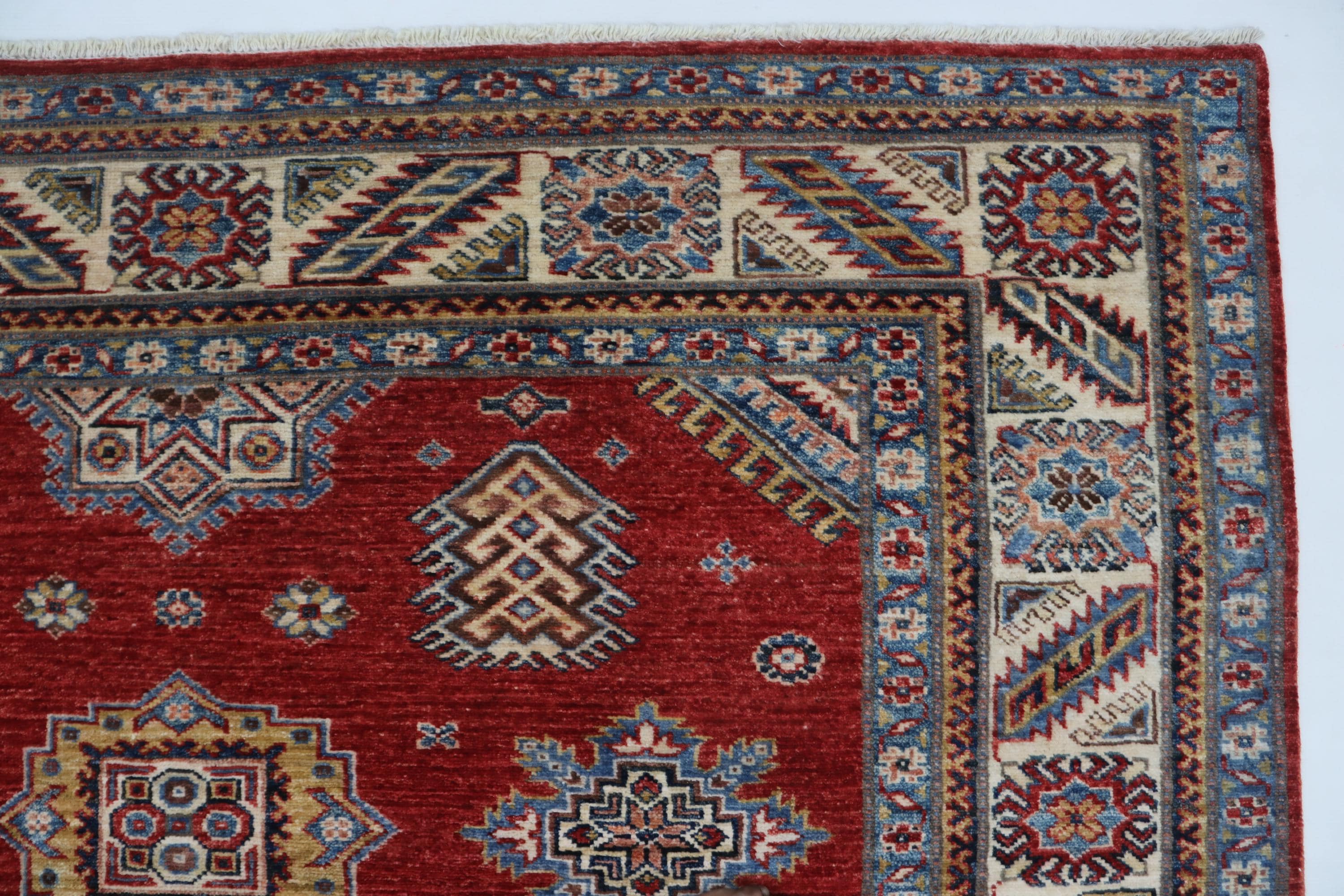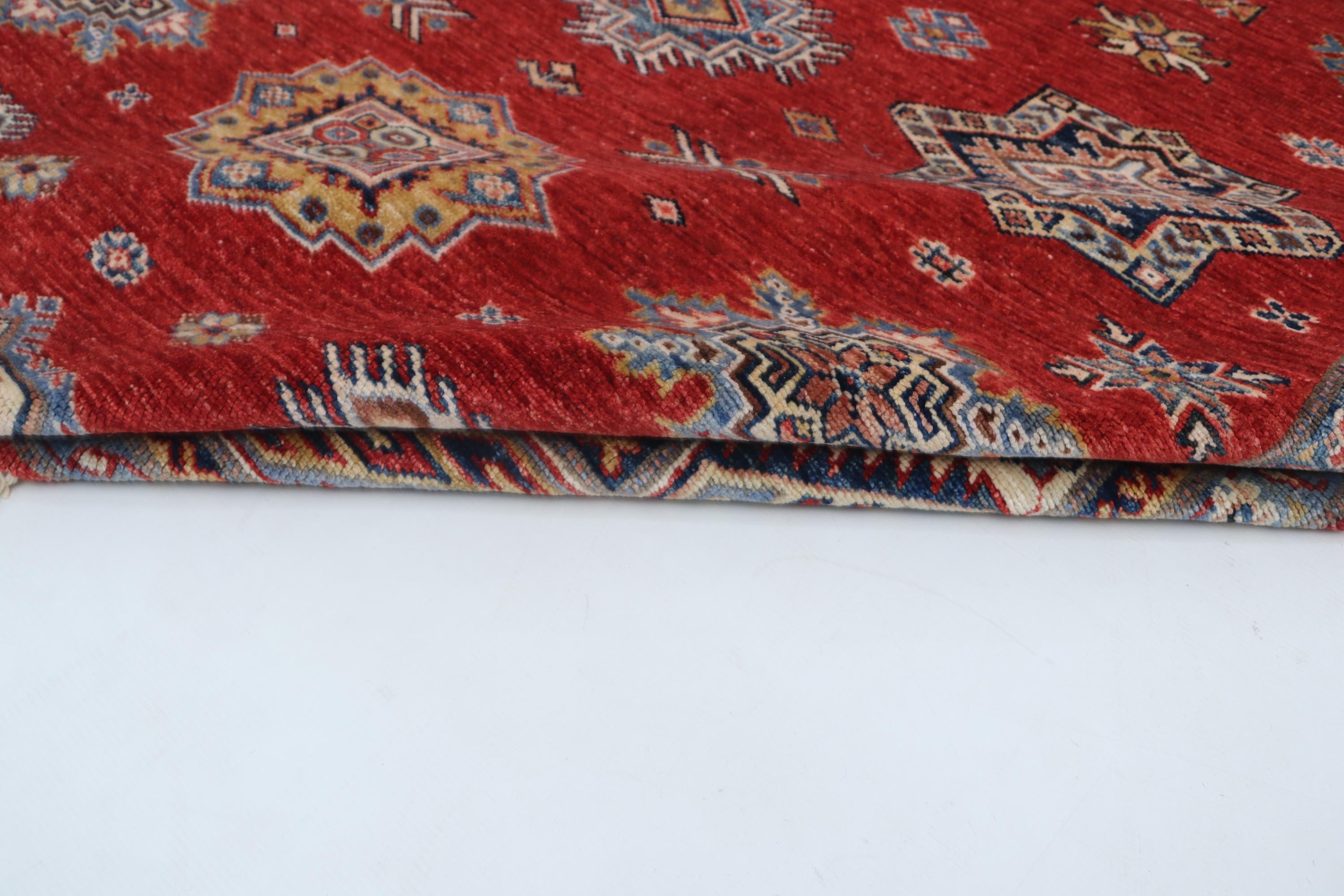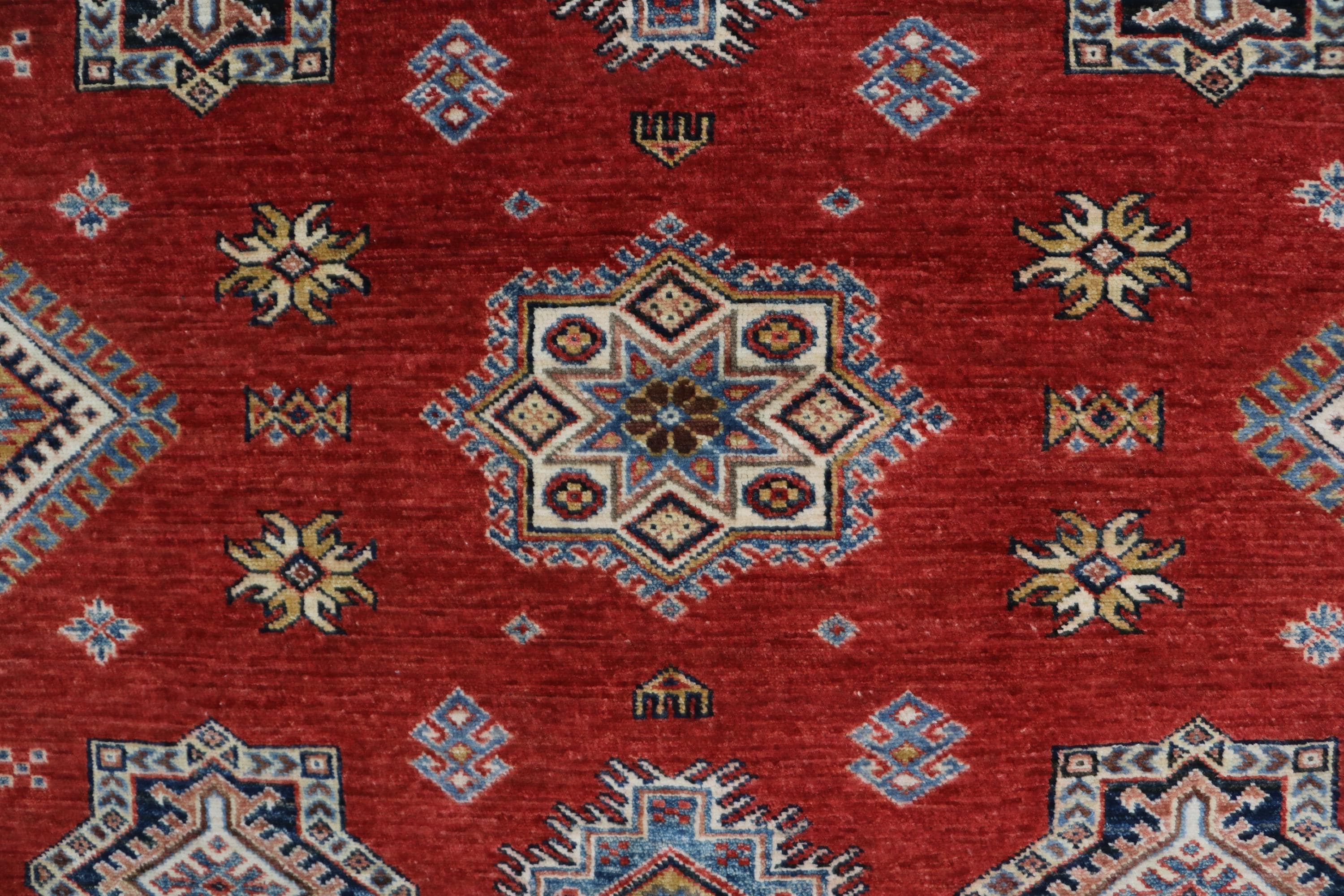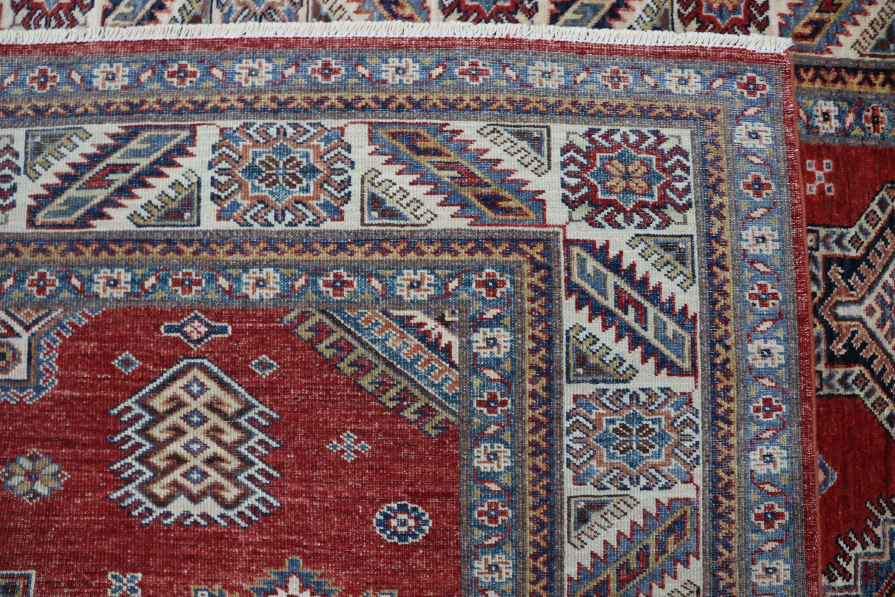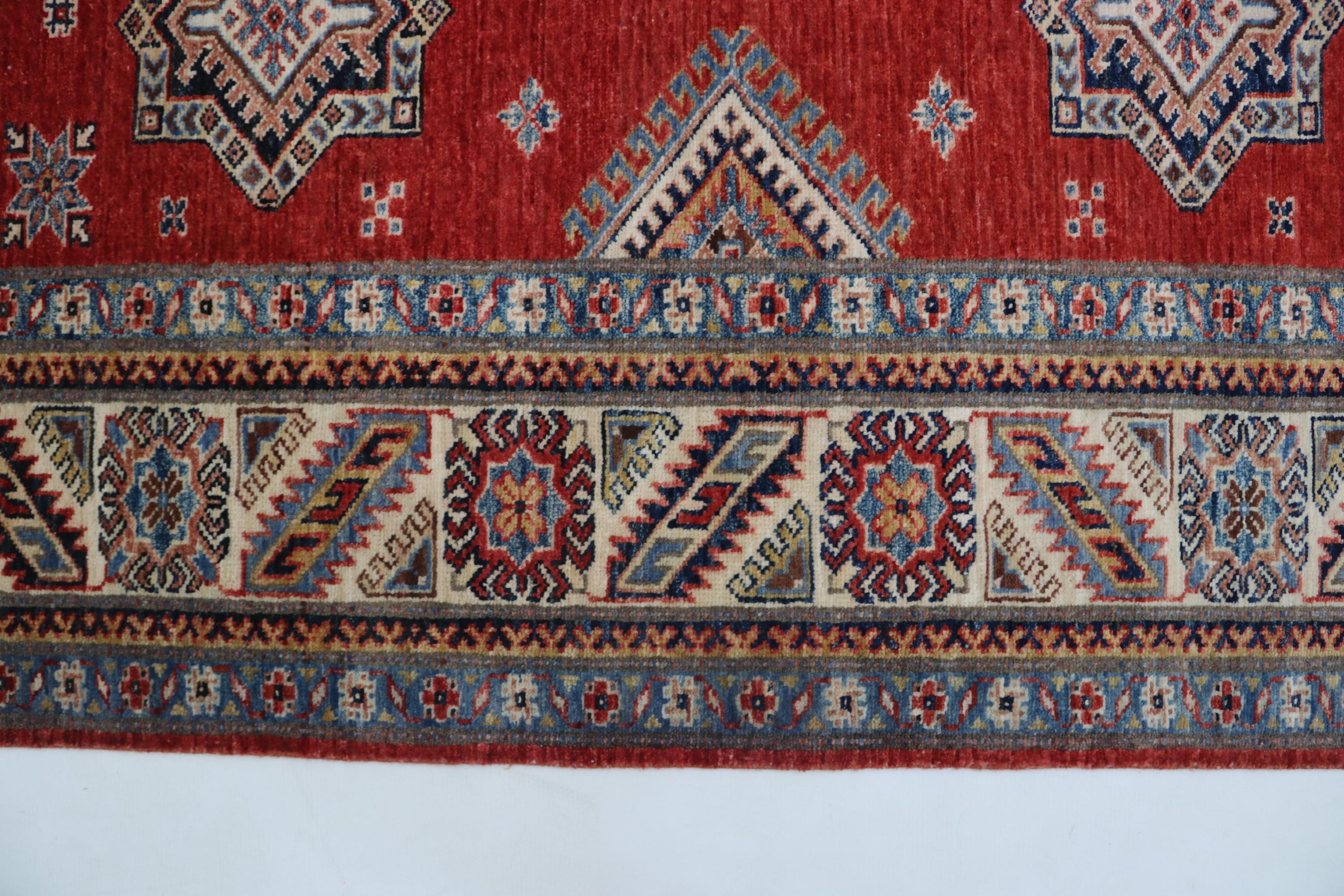 Elevate your décor with the Super Kazak , a luxury handmade Geonatrical rug.