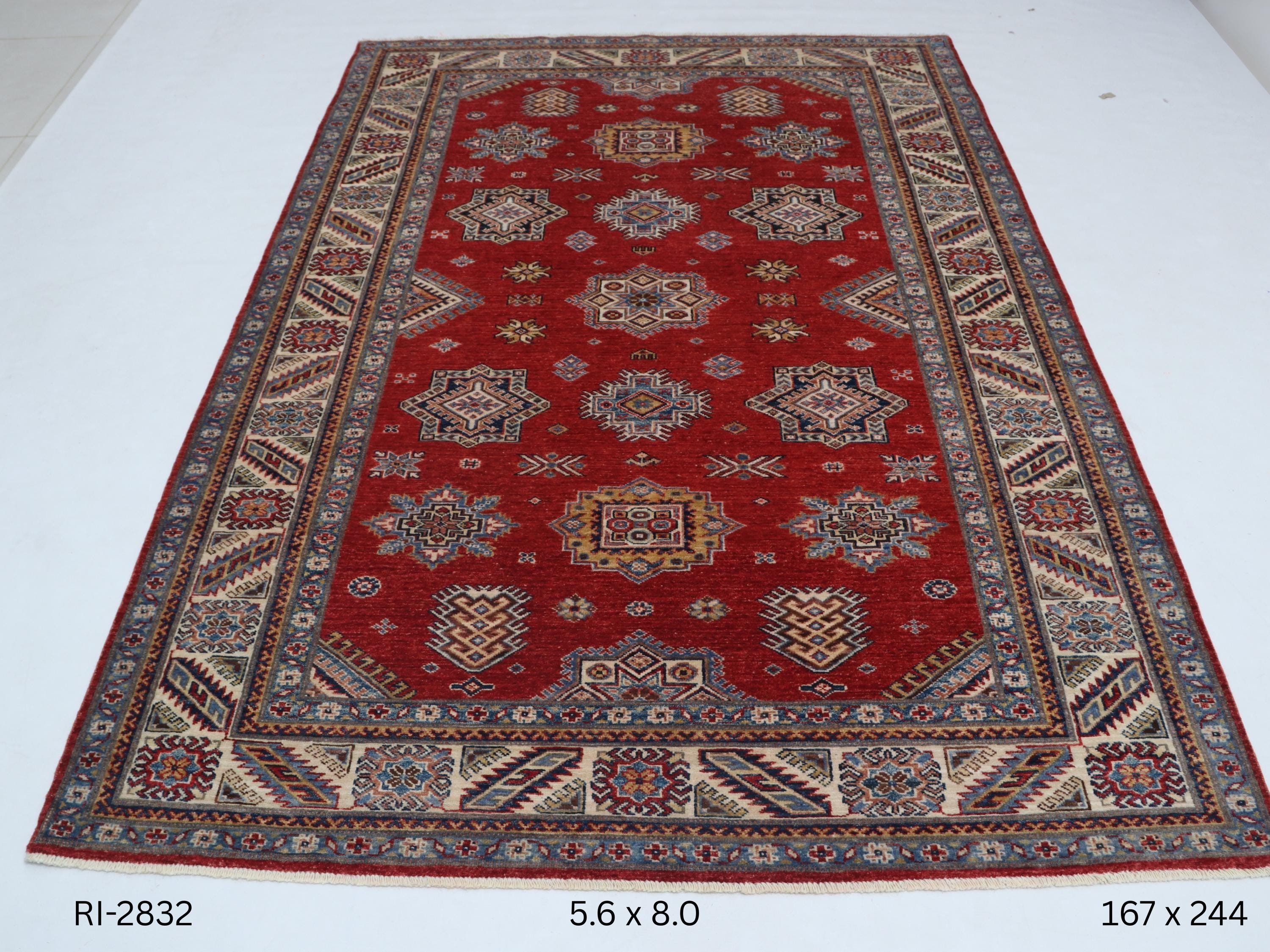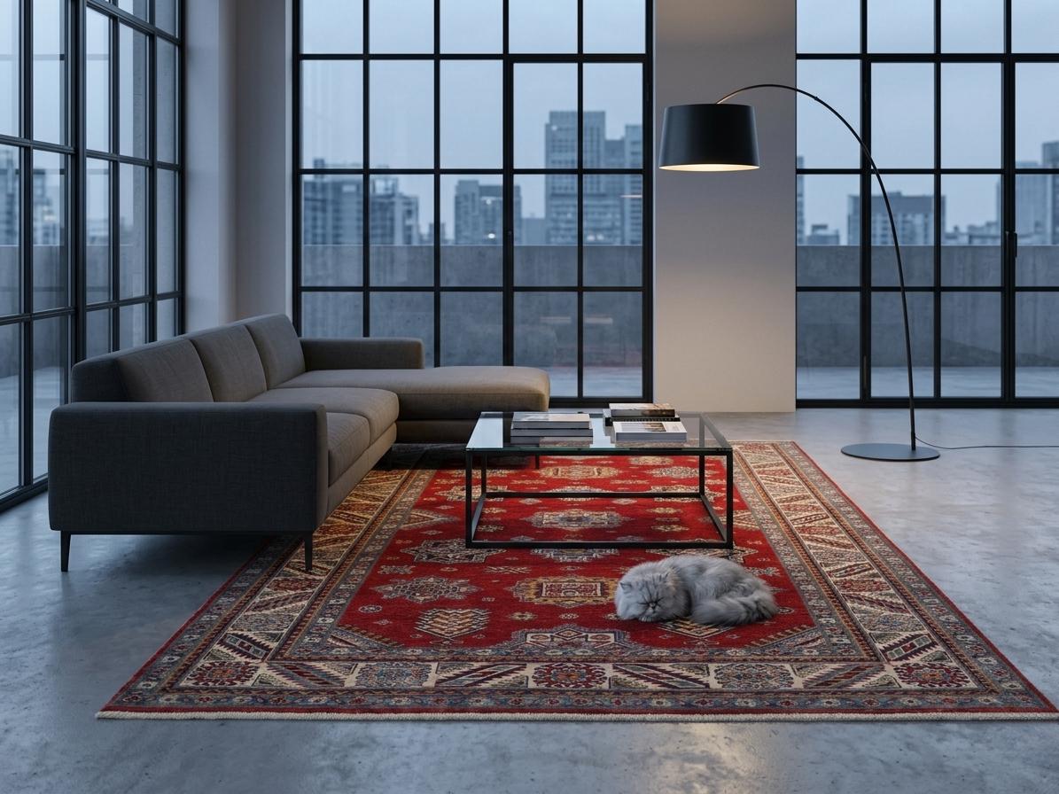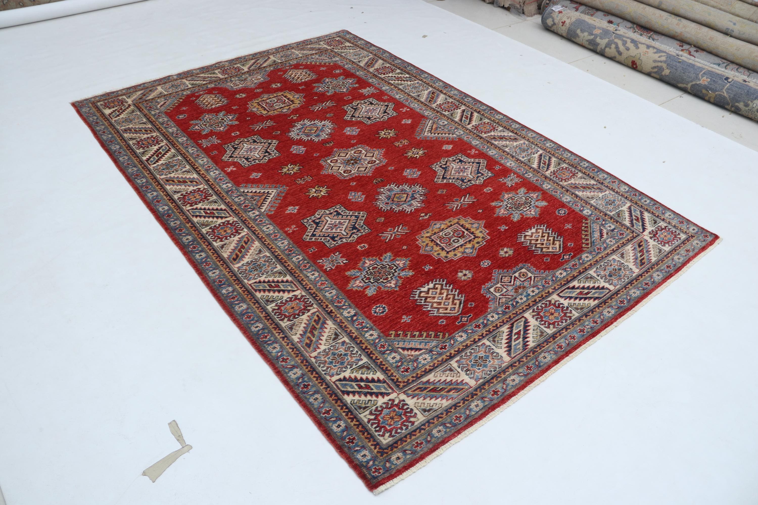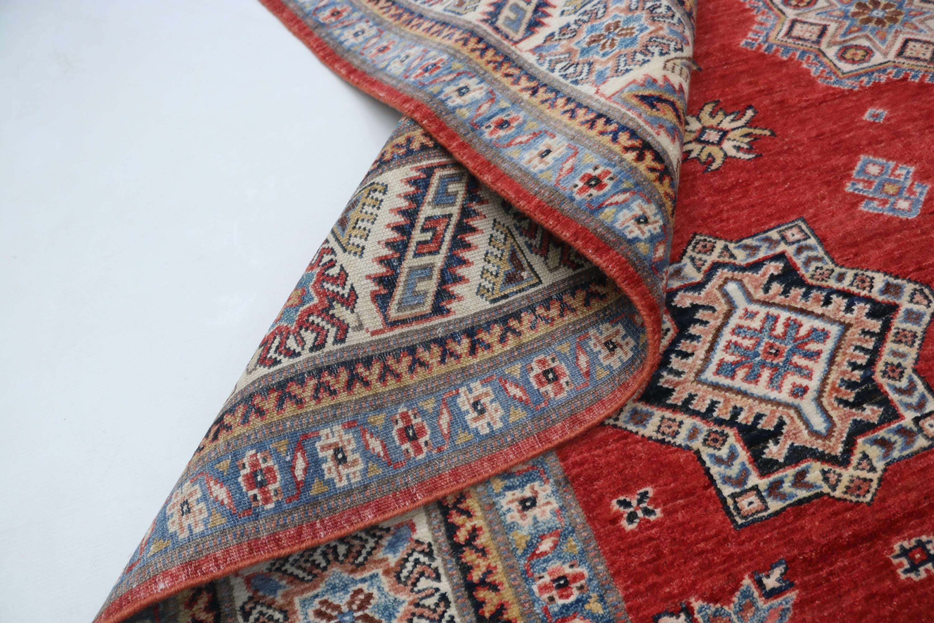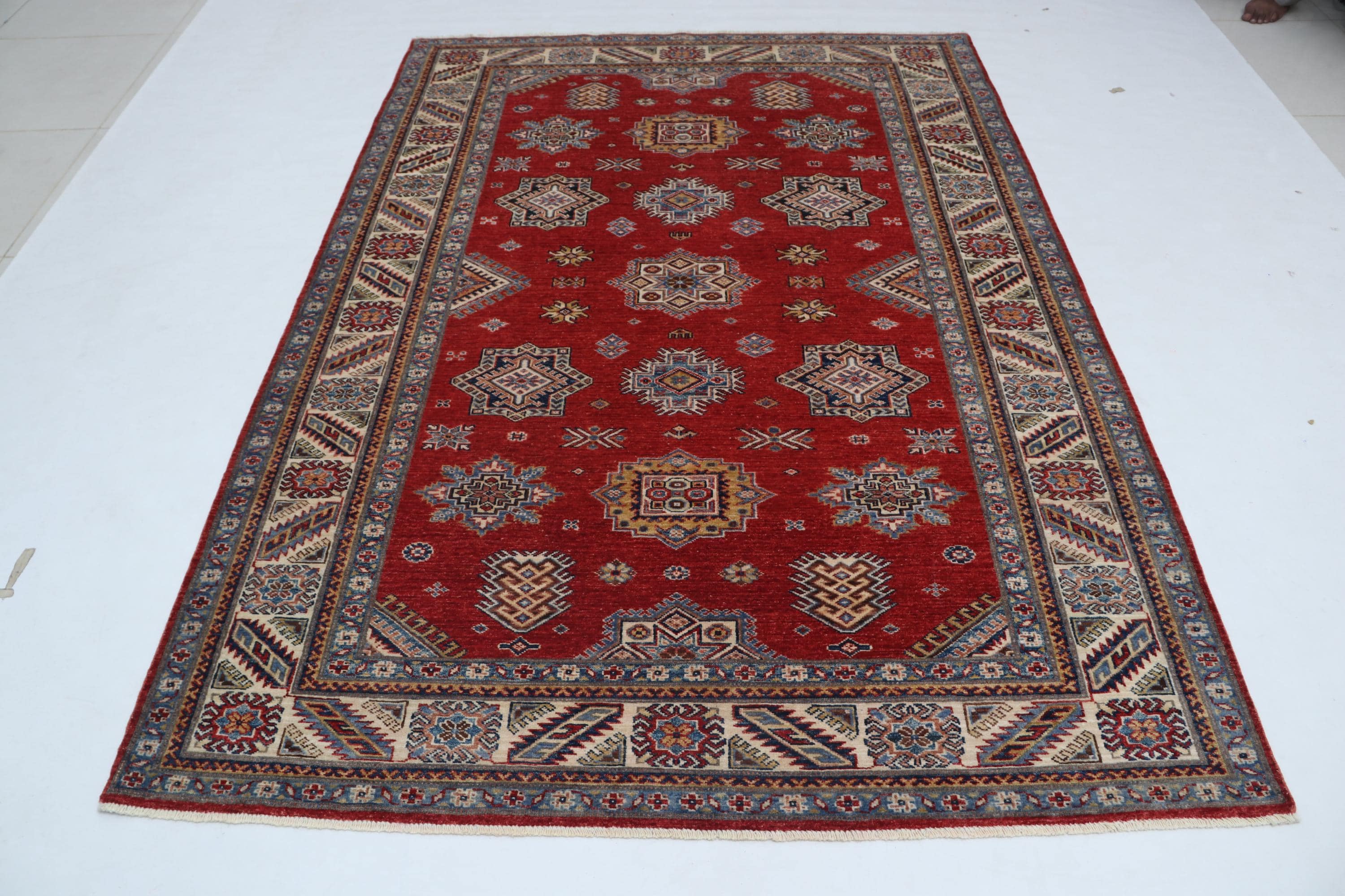 Elevate your décor with the Super Kazak , a luxury handmade Geonatrical rug.