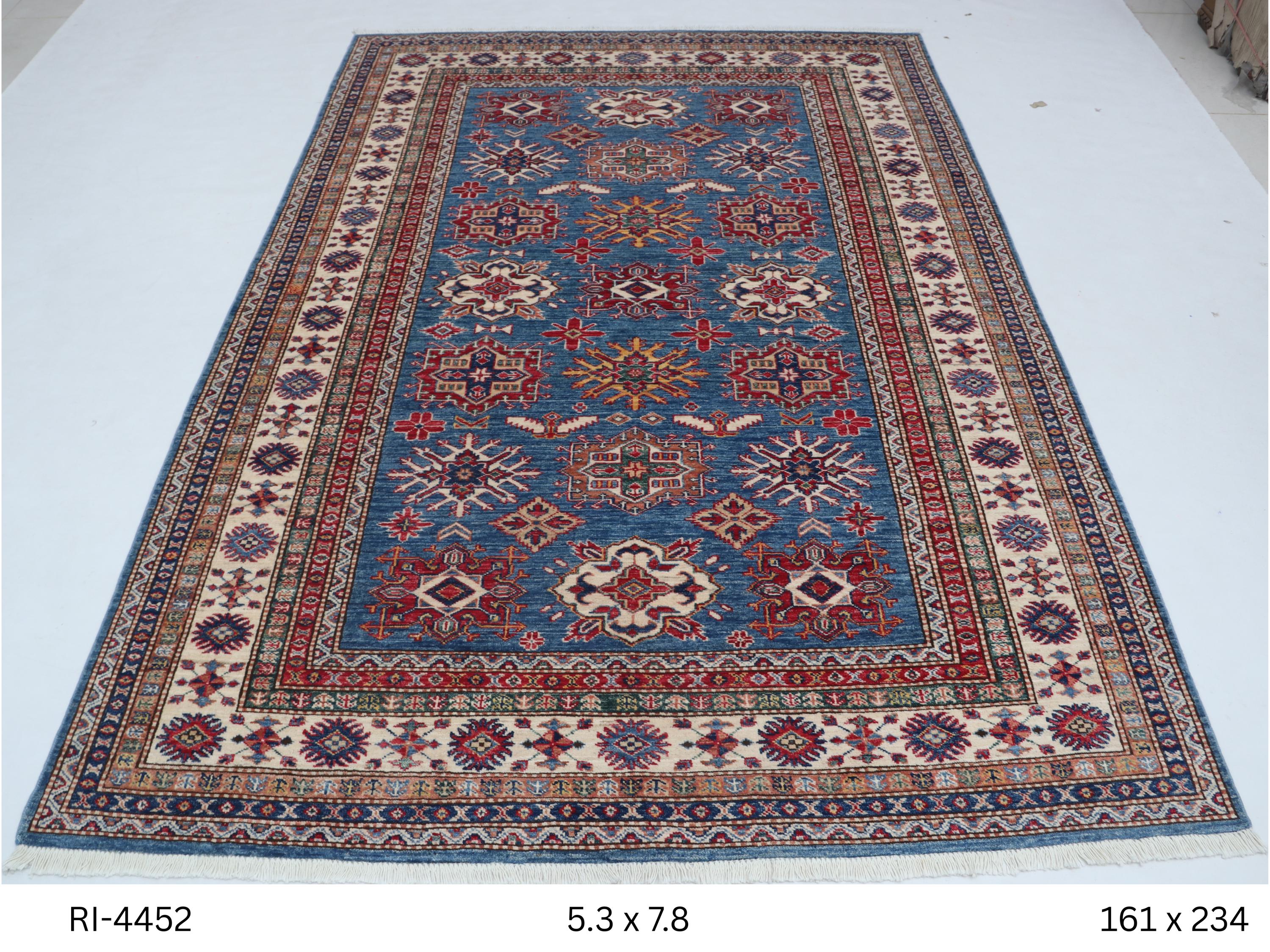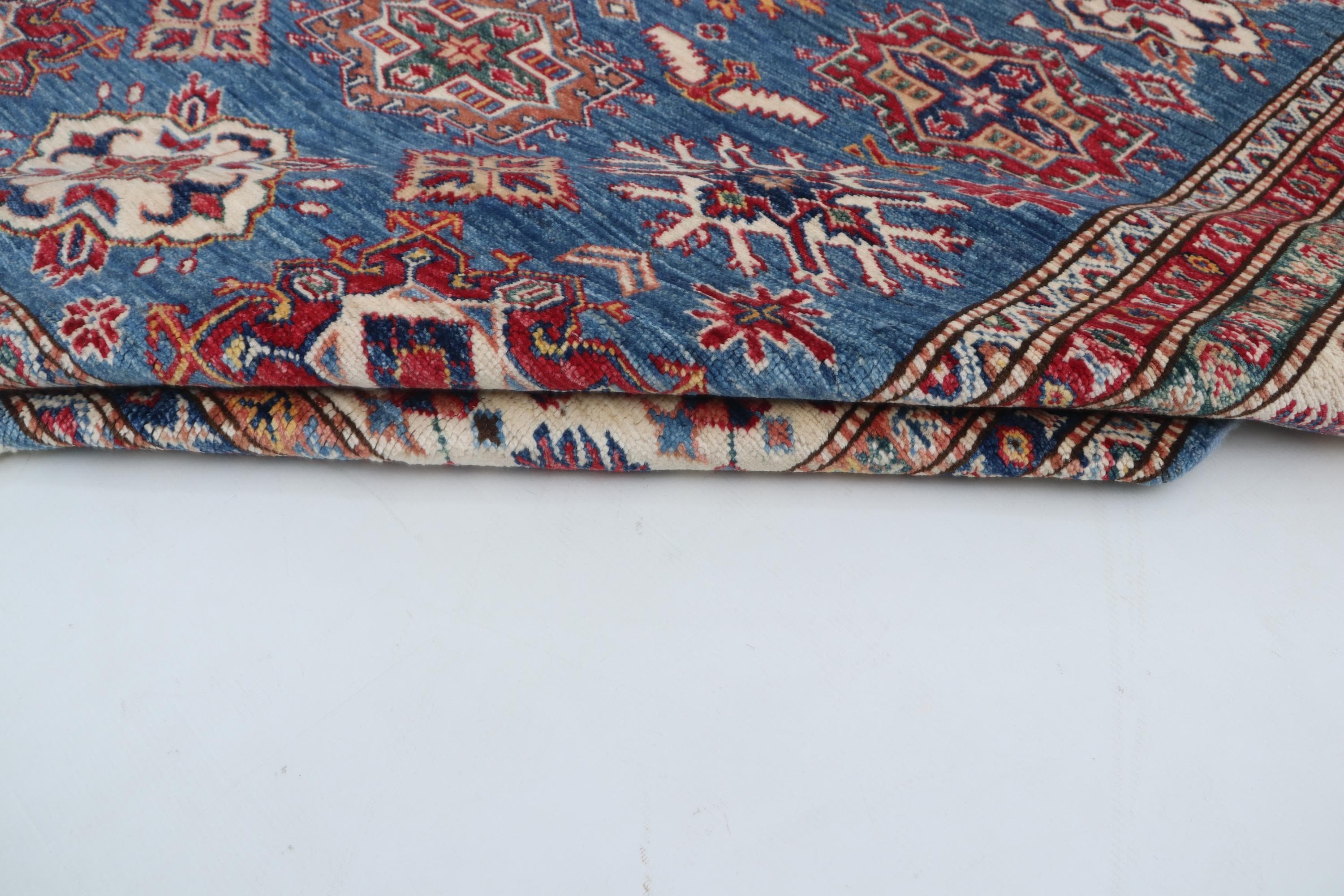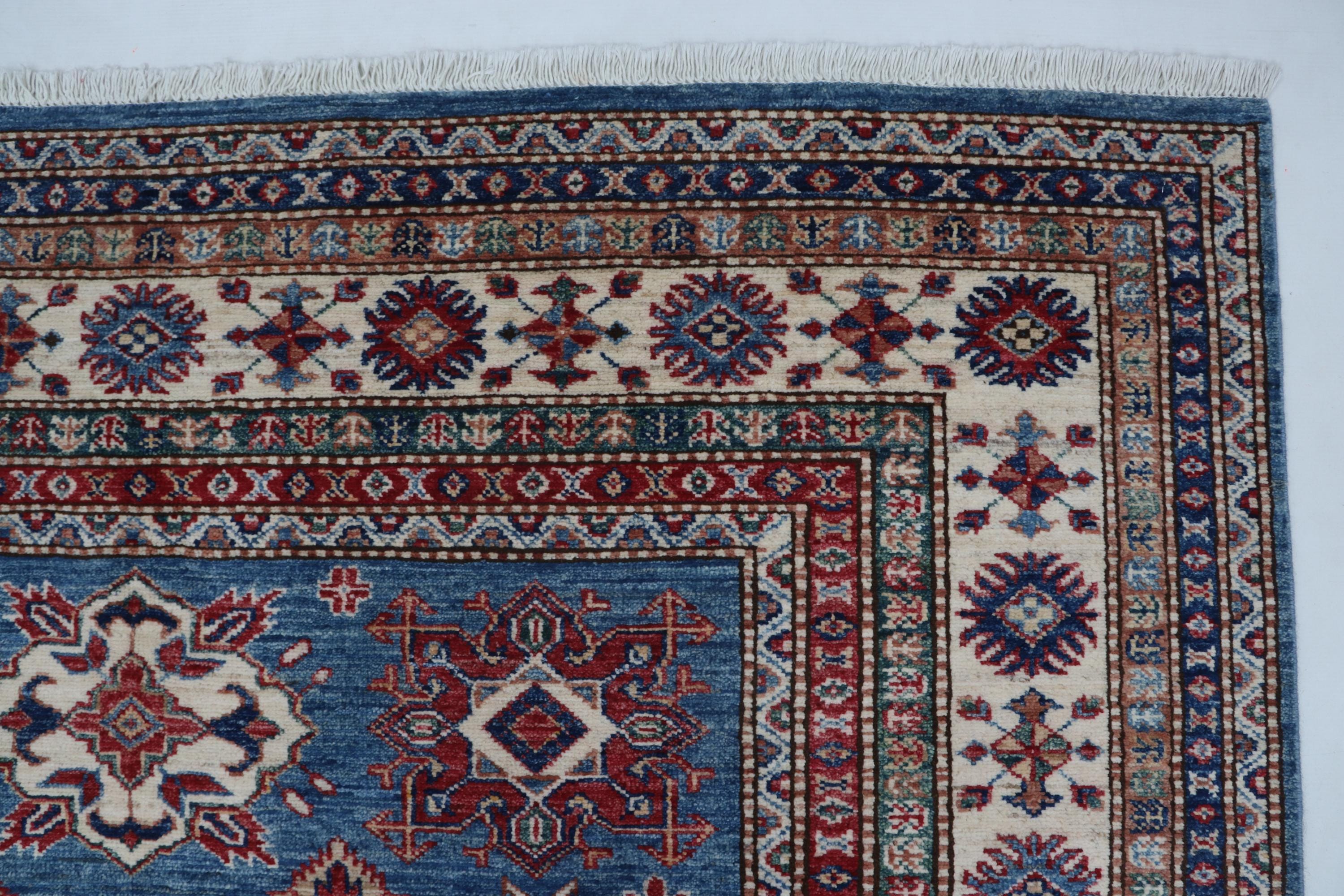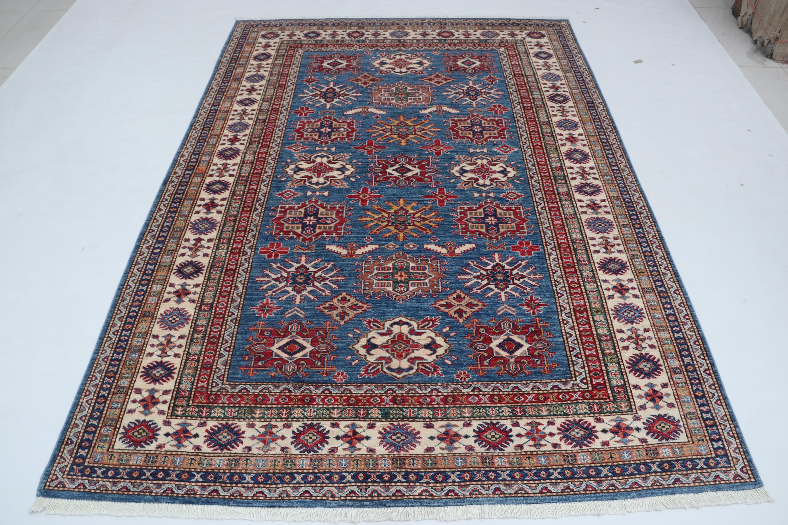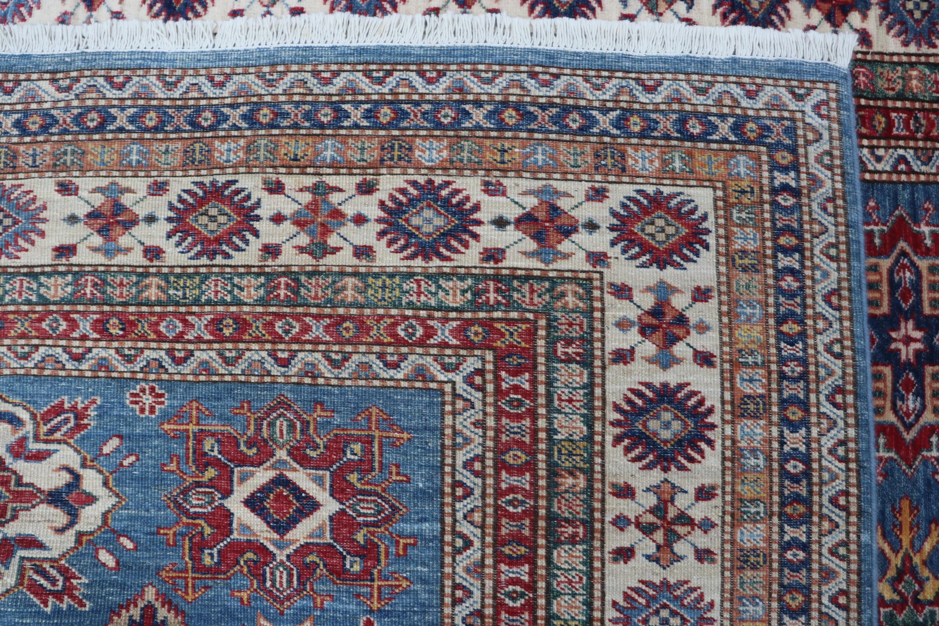 Elevate your décor with the Super Kazak , a luxury handmade Geonatrical rug.