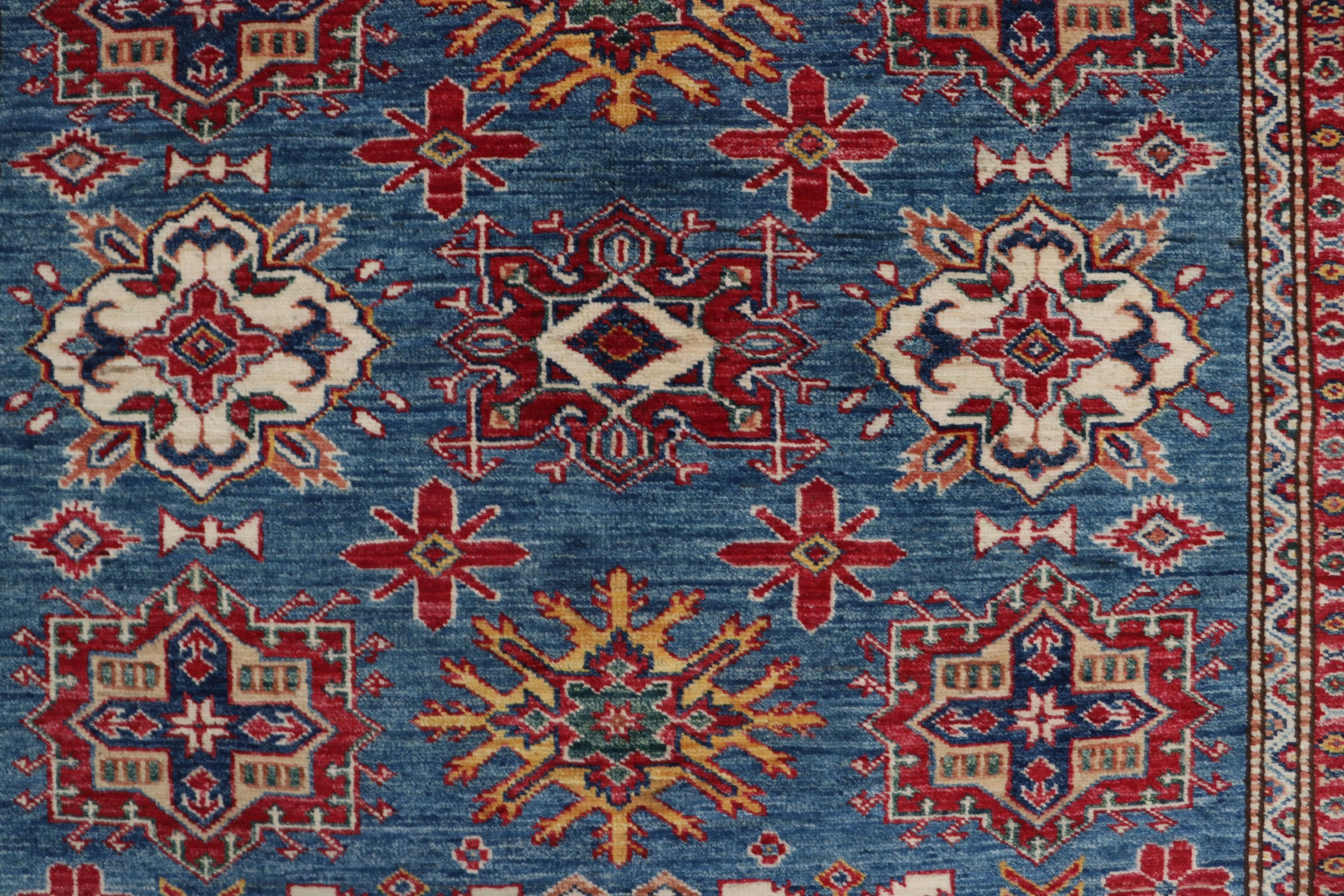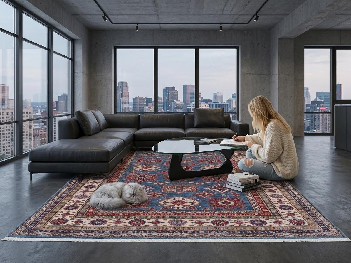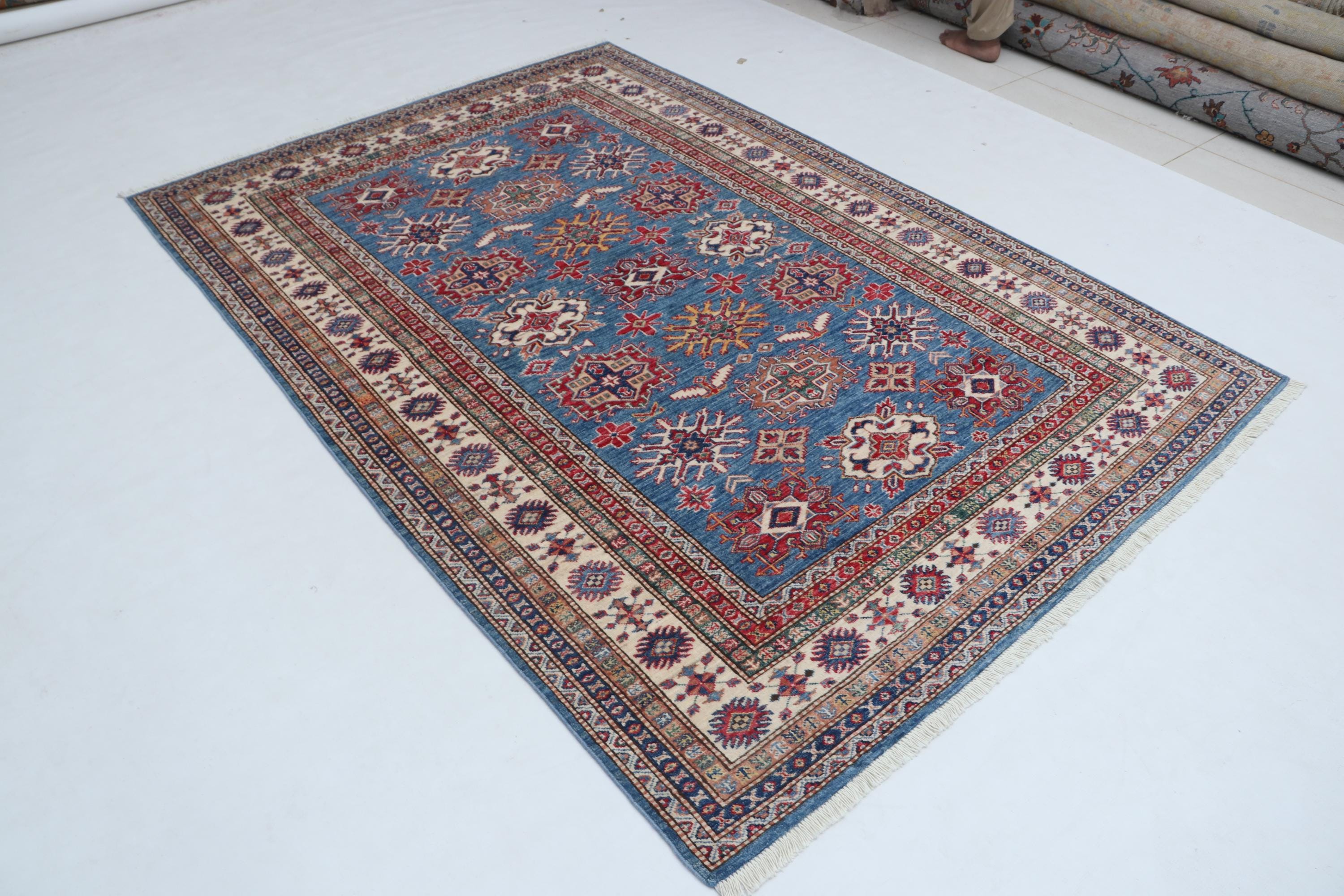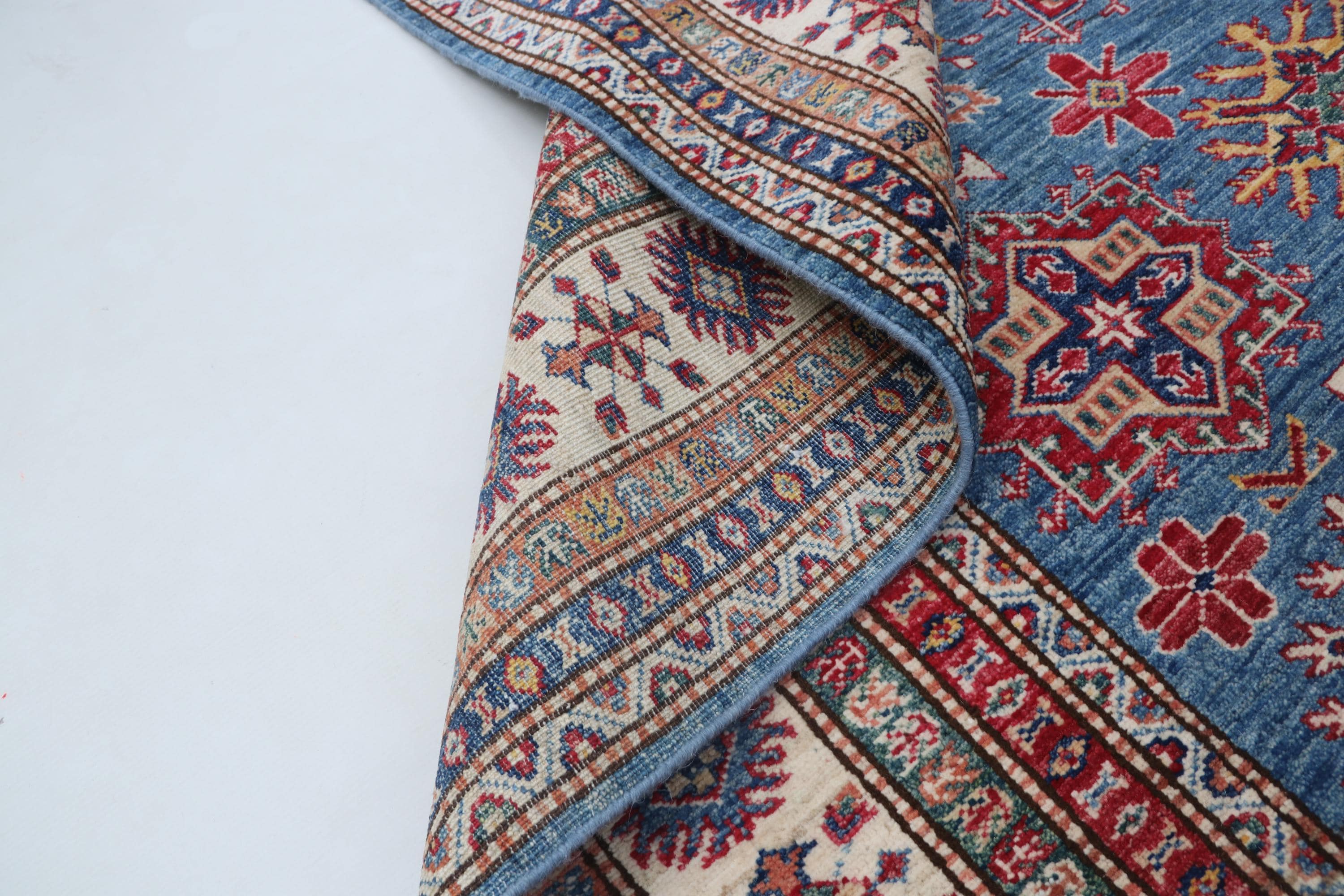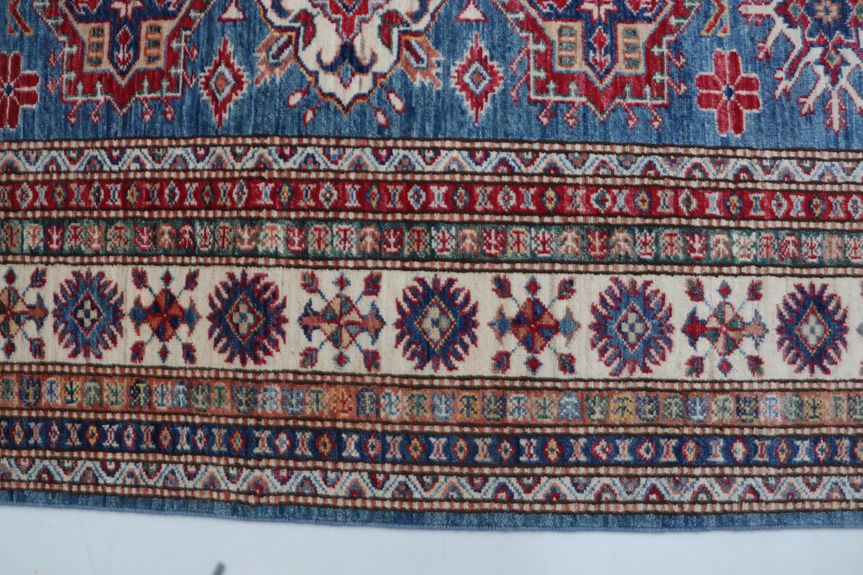 Elevate your décor with the Super Kazak , a luxury handmade Geonatrical rug.