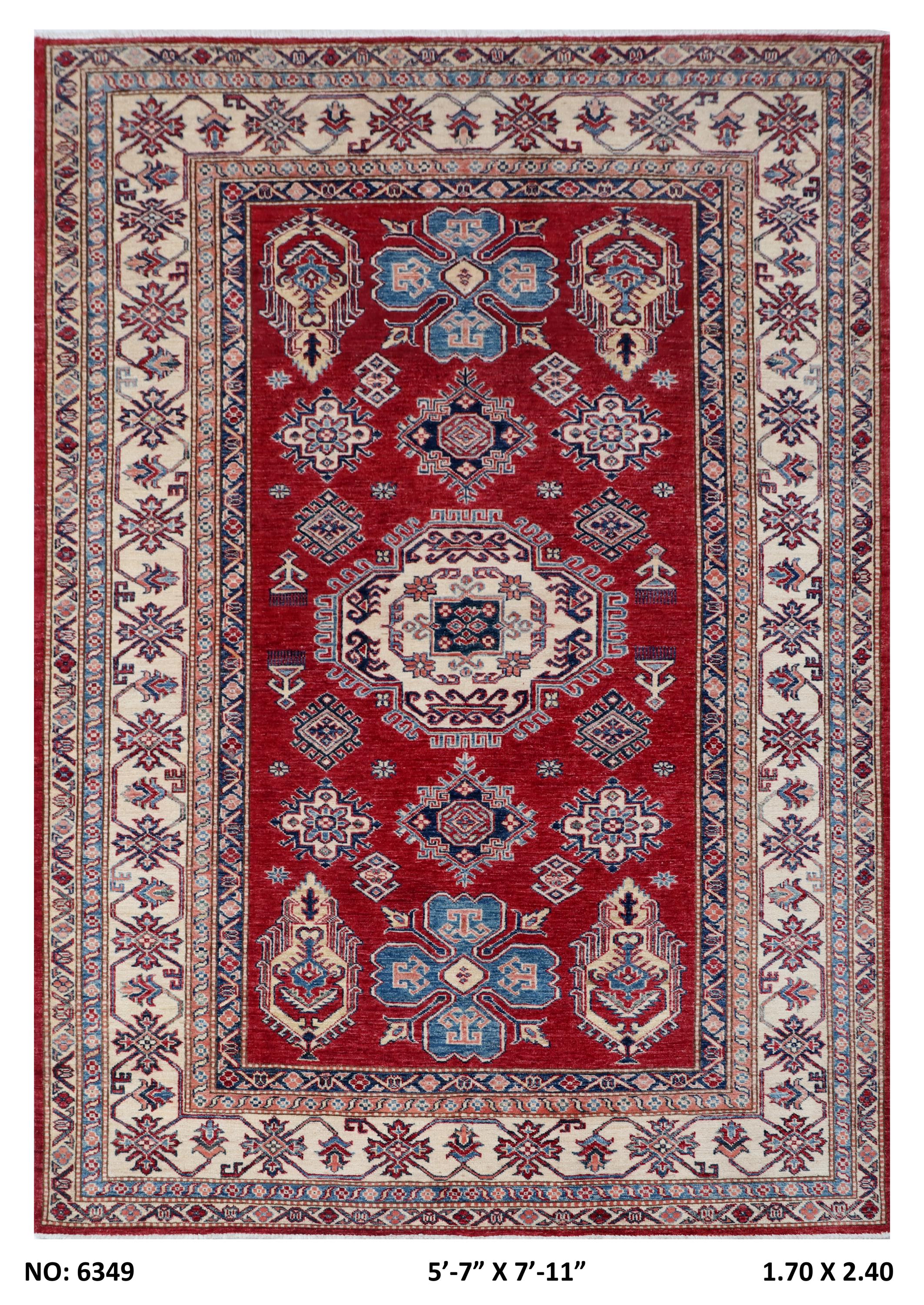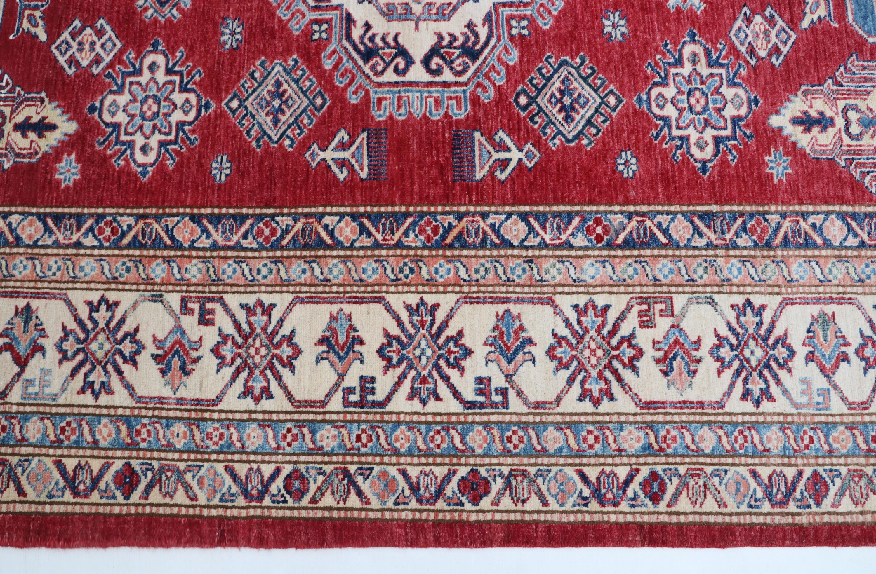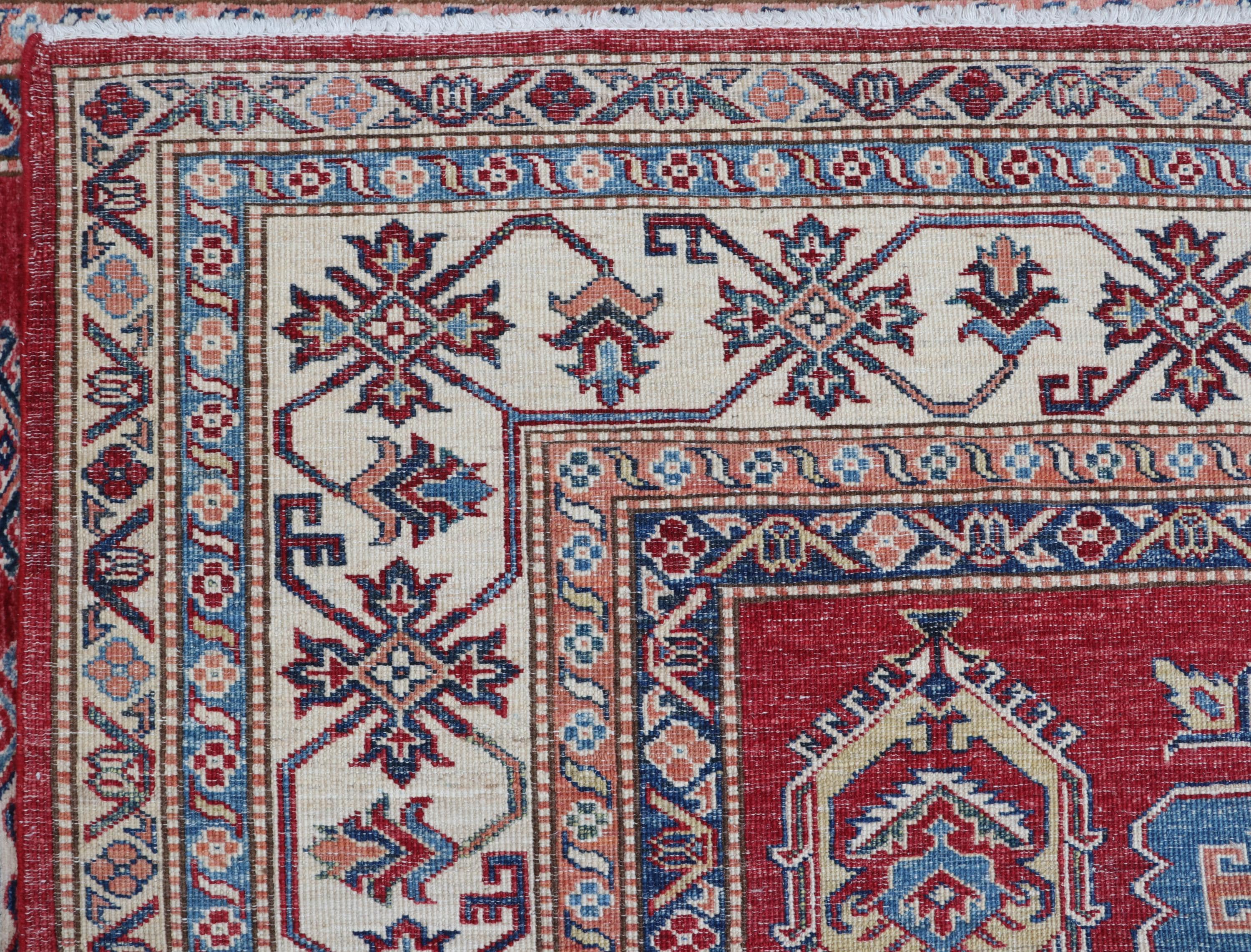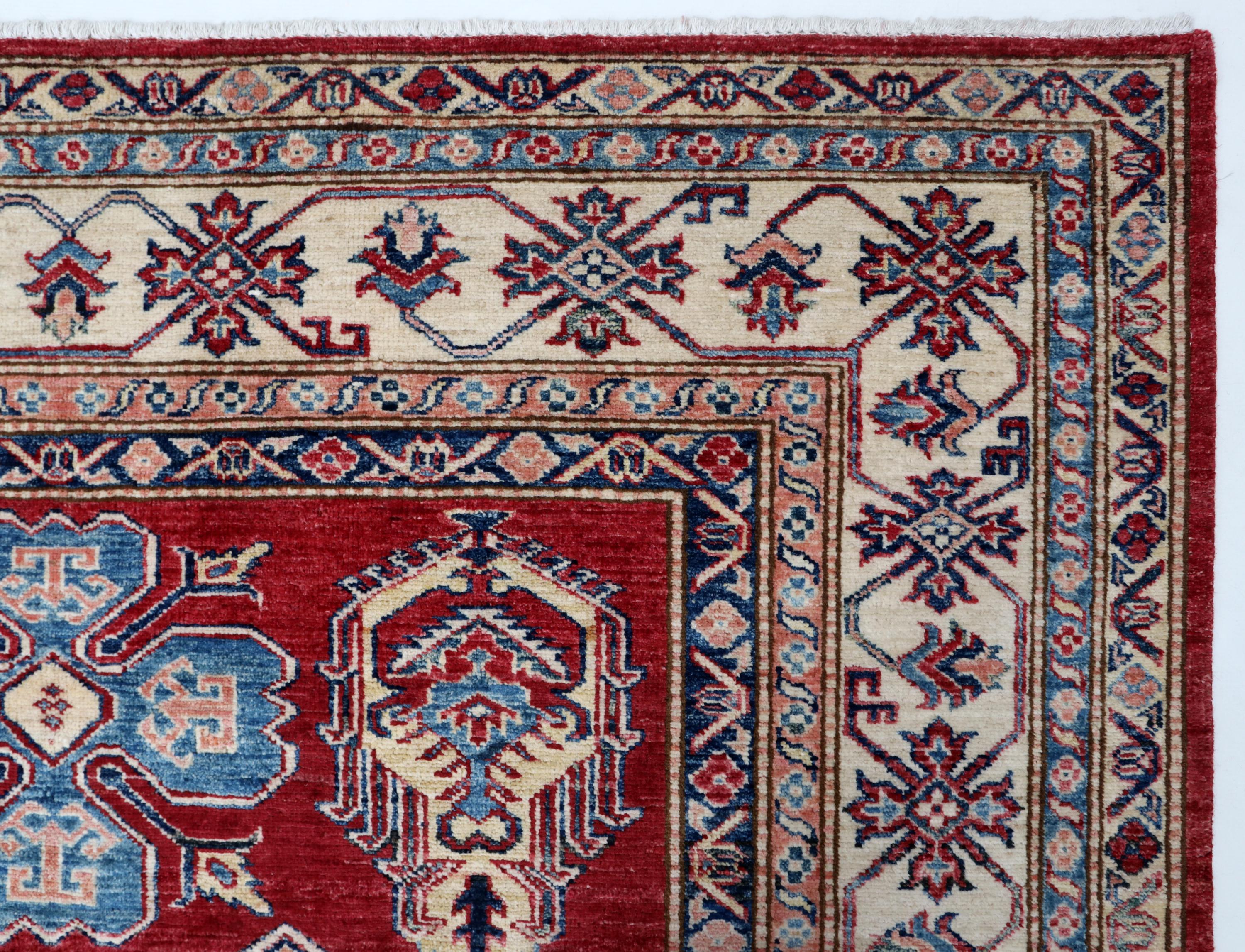 Elevate your décor with the Super Kazak , a luxury handmade Geonatrical rug.