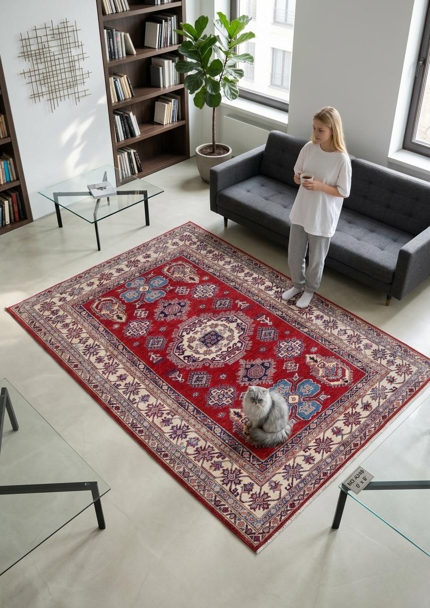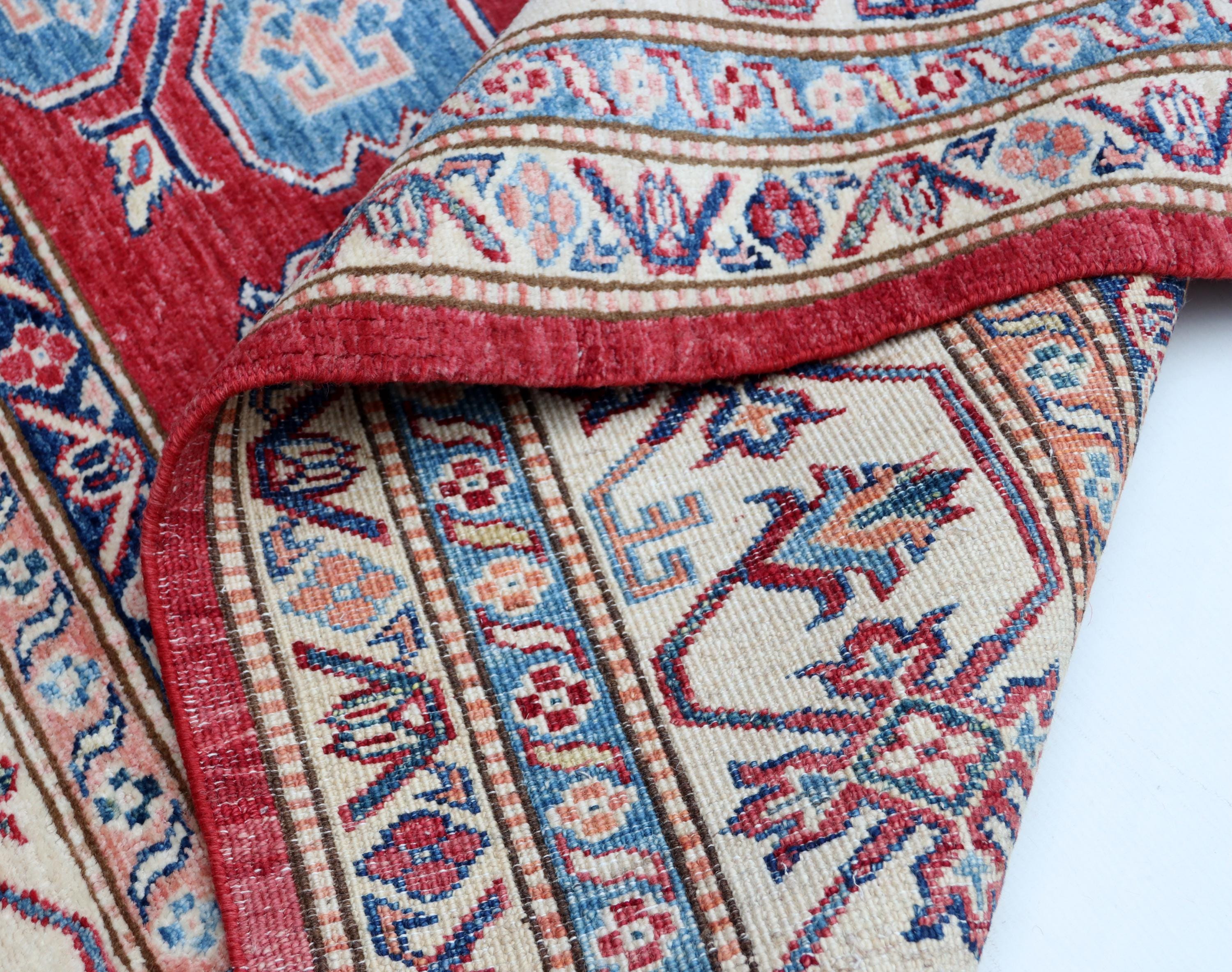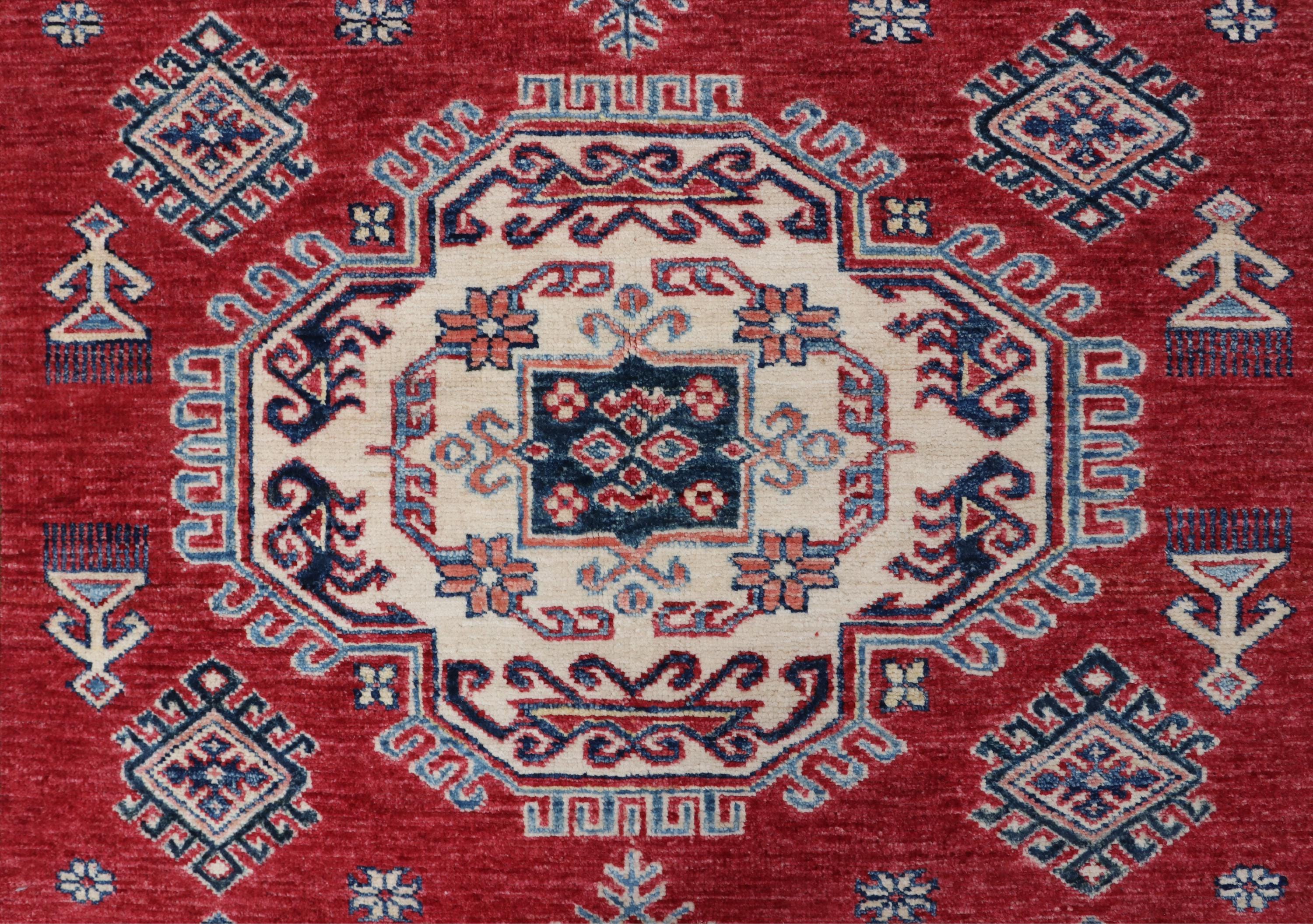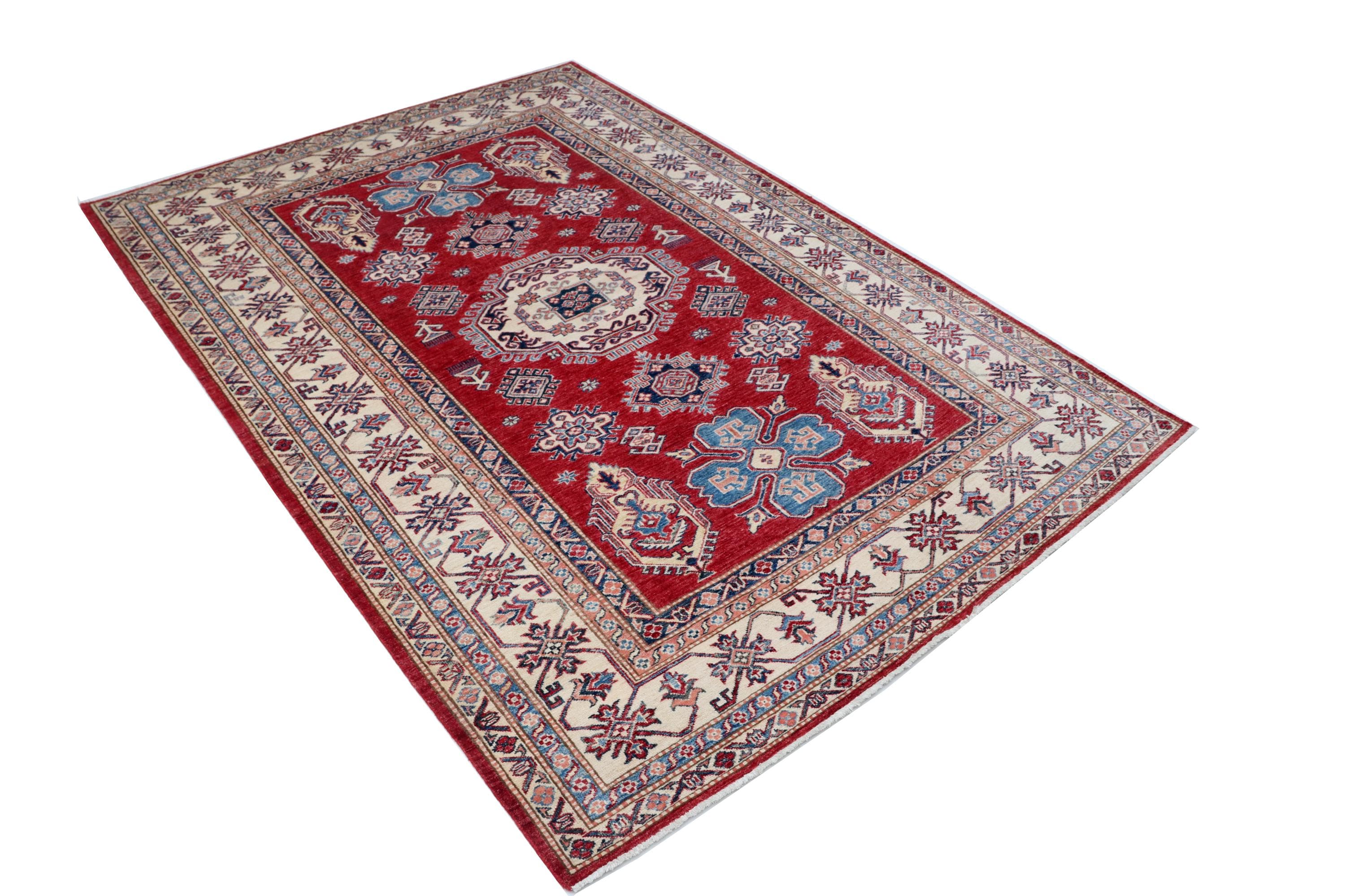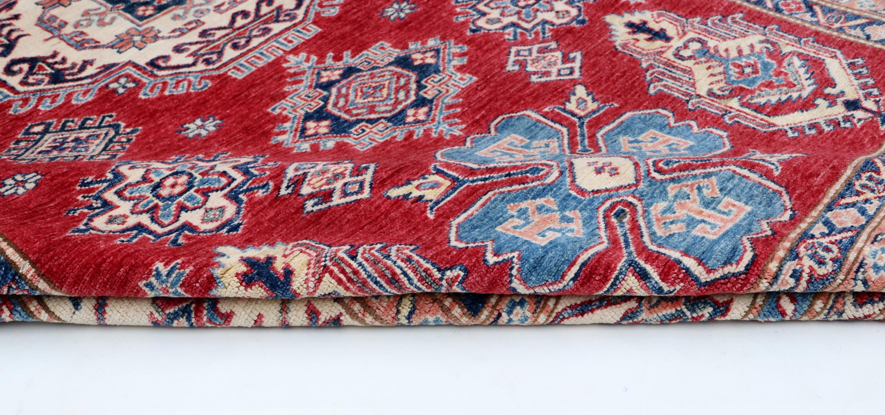 Elevate your décor with the Super Kazak , a luxury handmade Geonatrical rug.