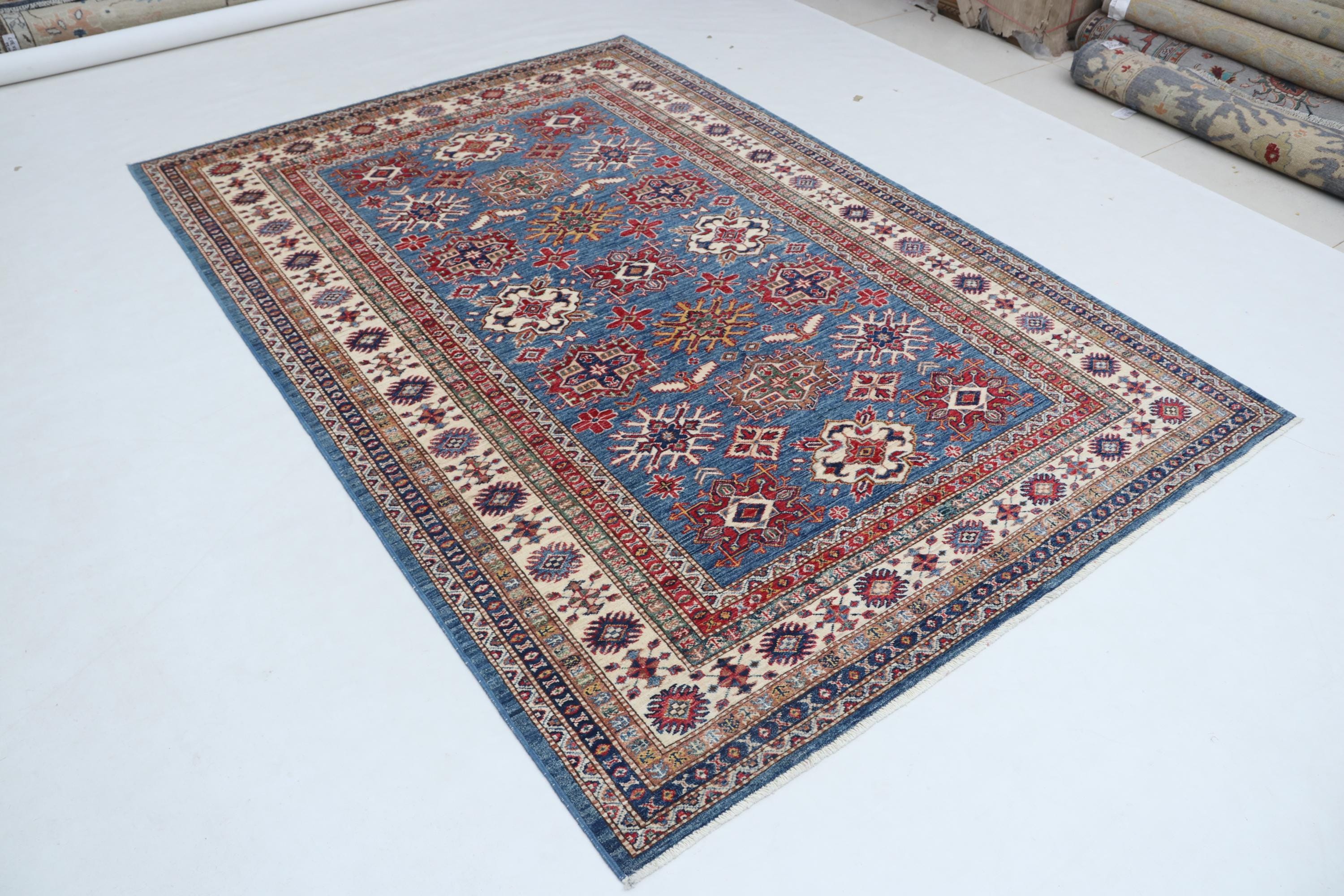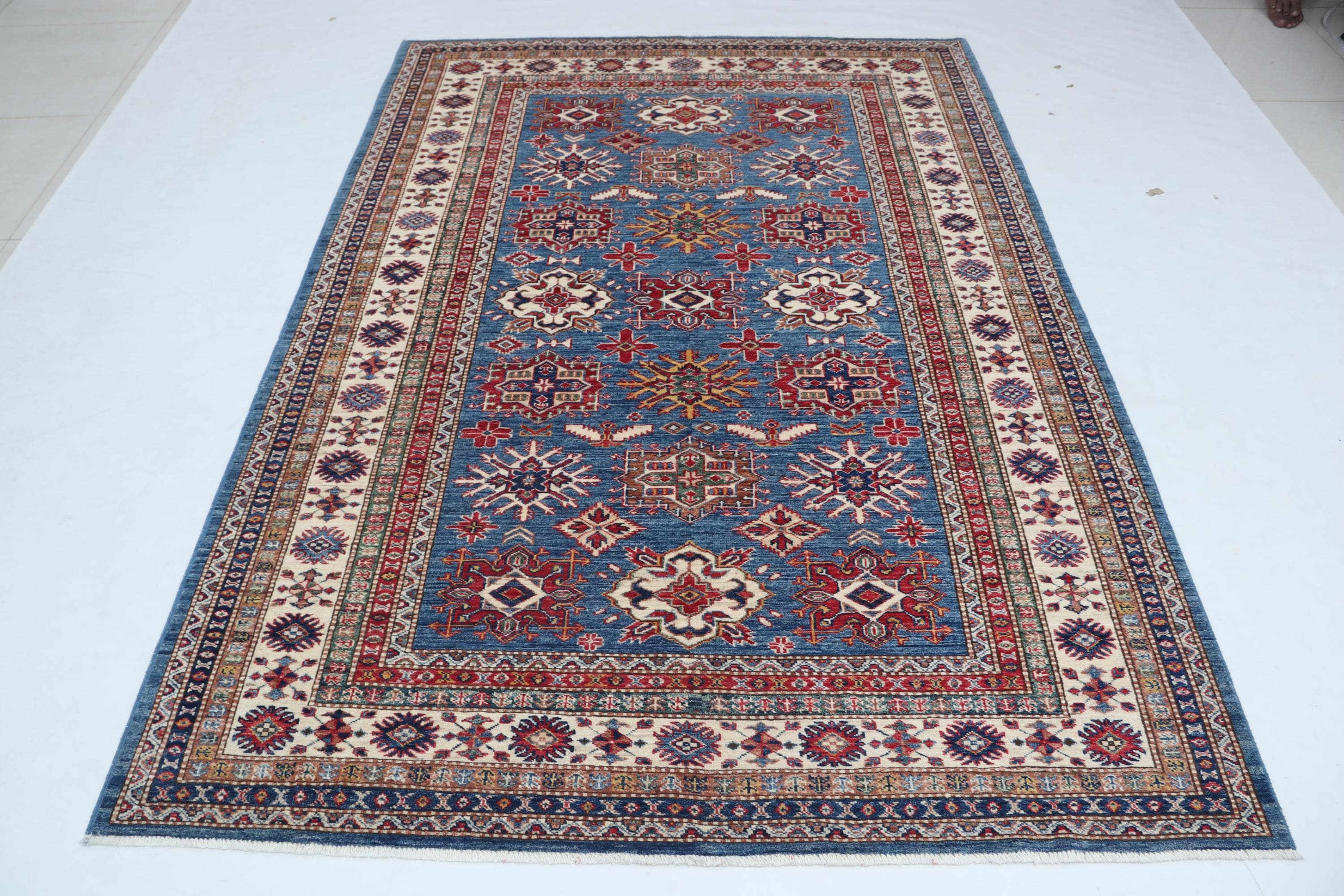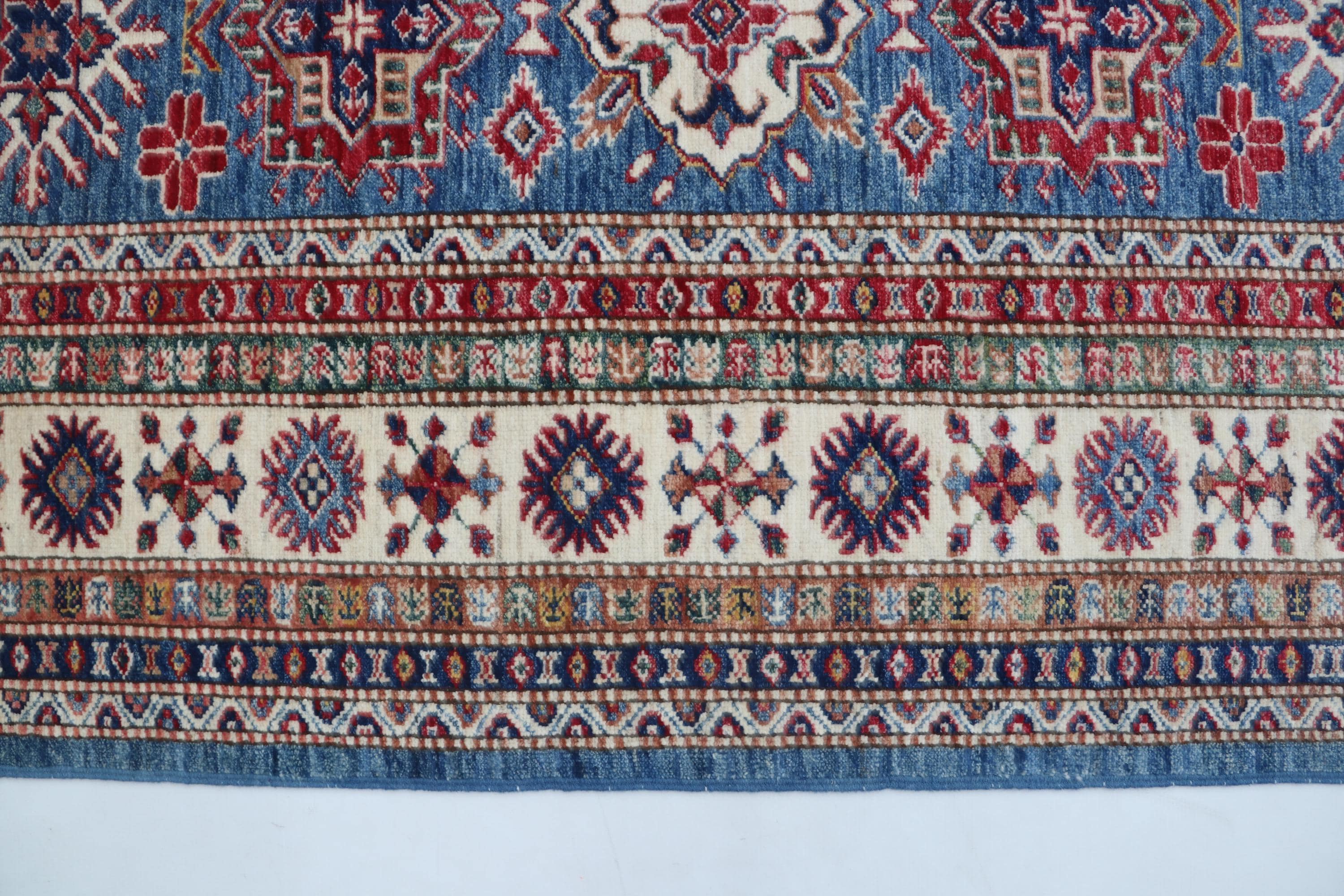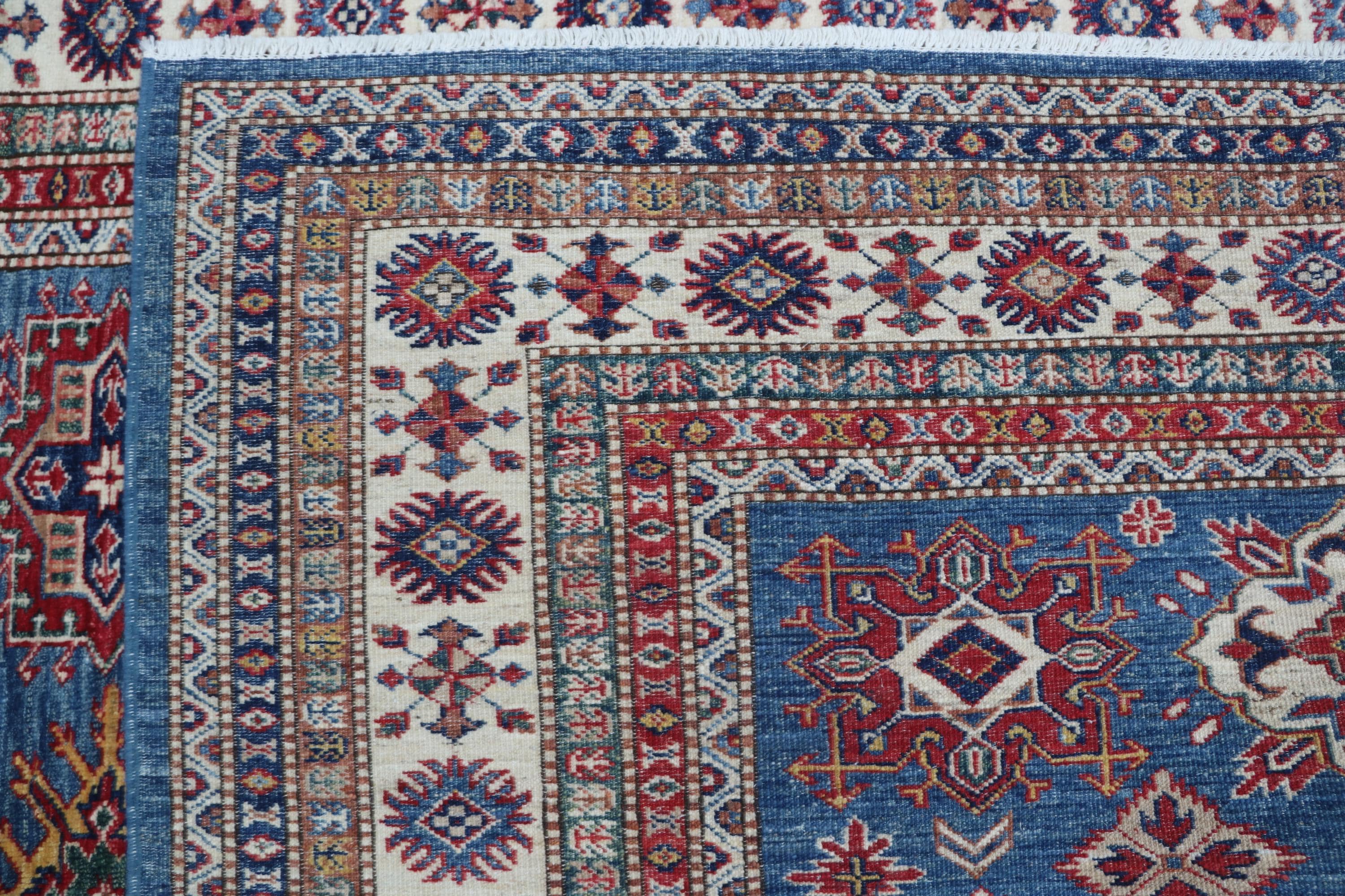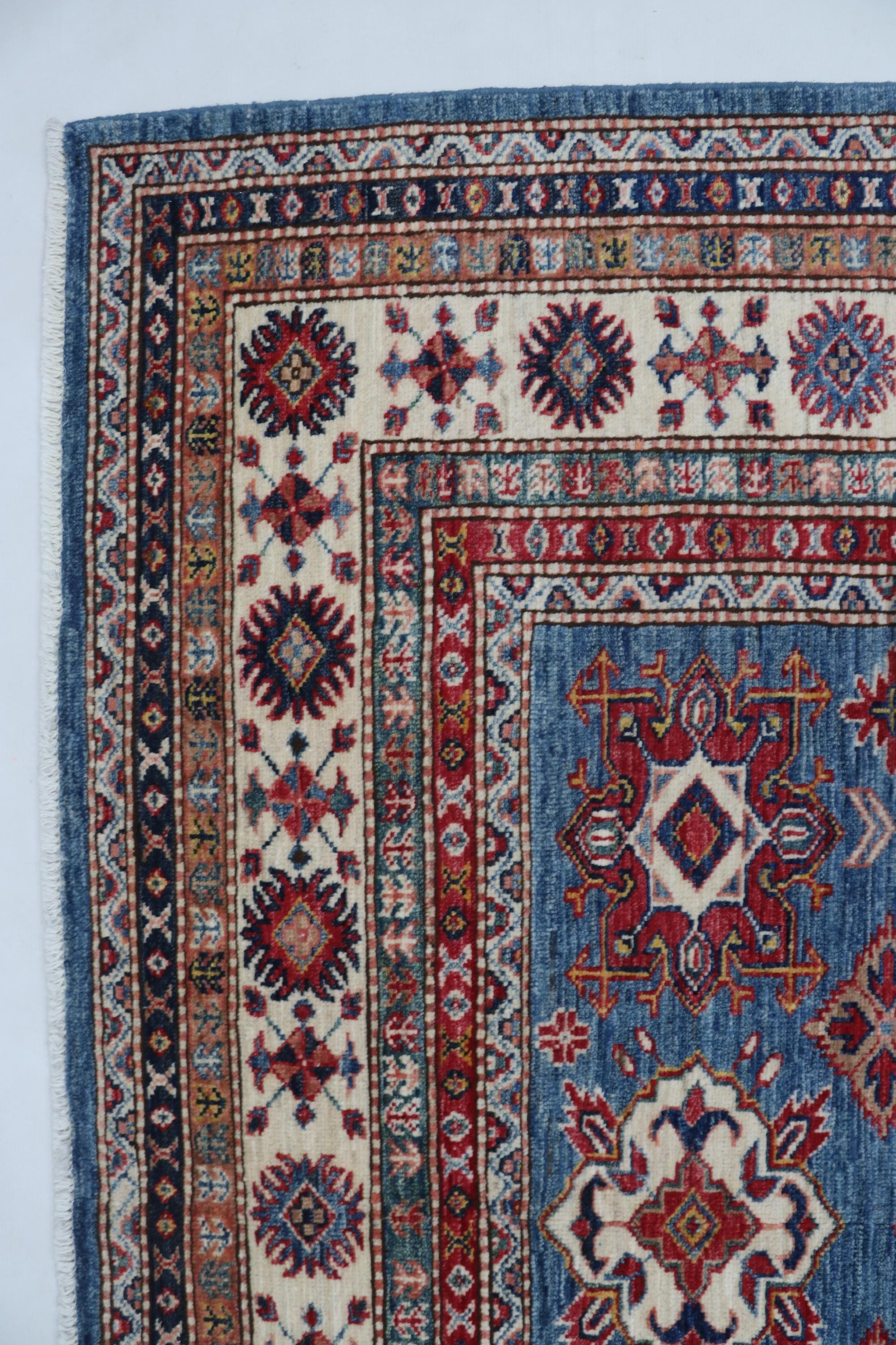 Elevate your décor with the Super Kazak , a luxury handmade Geonatrical rug.