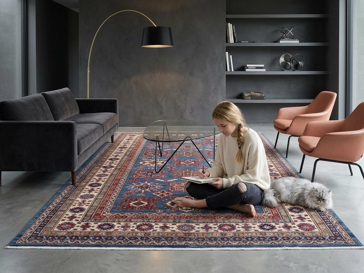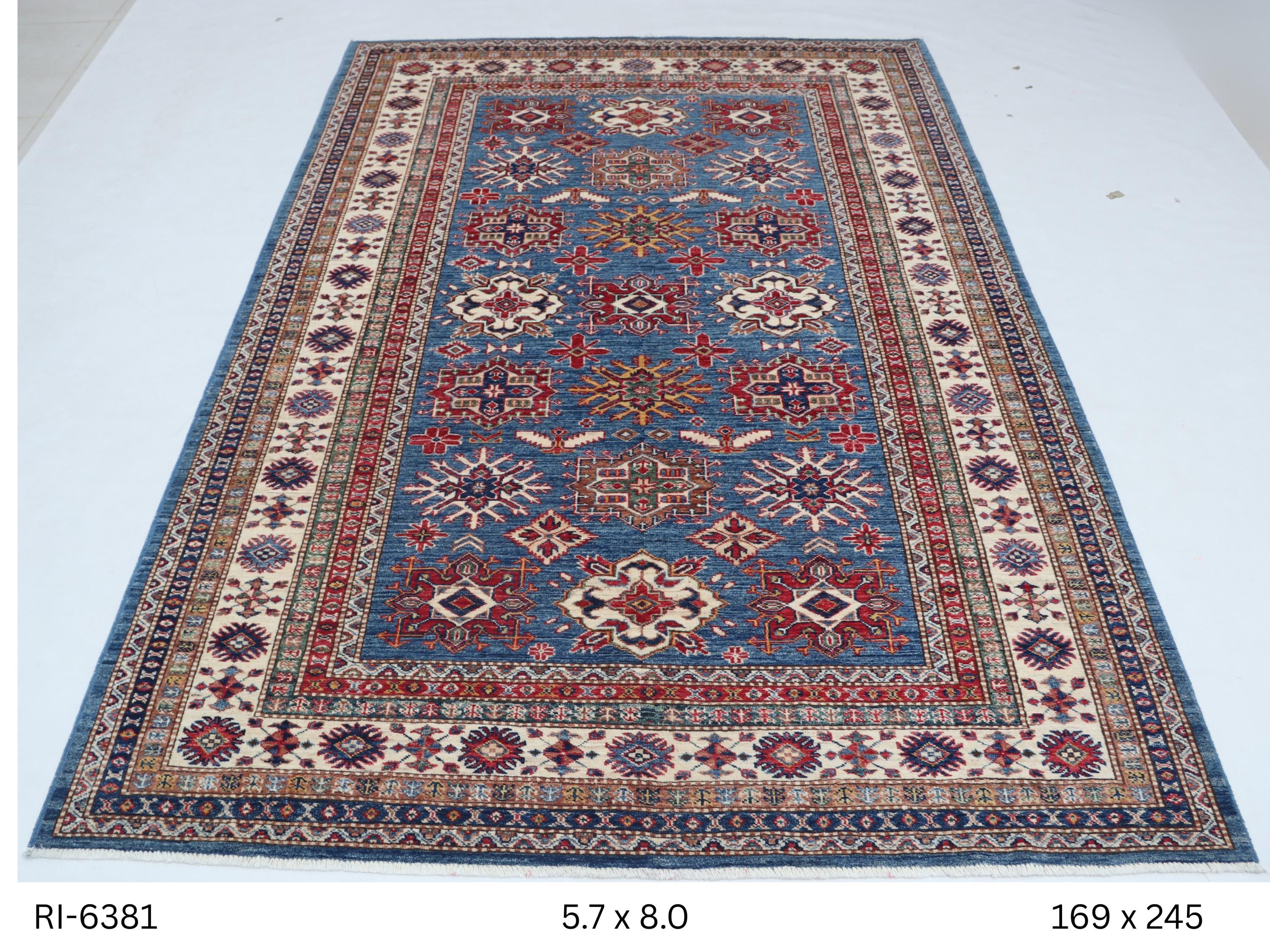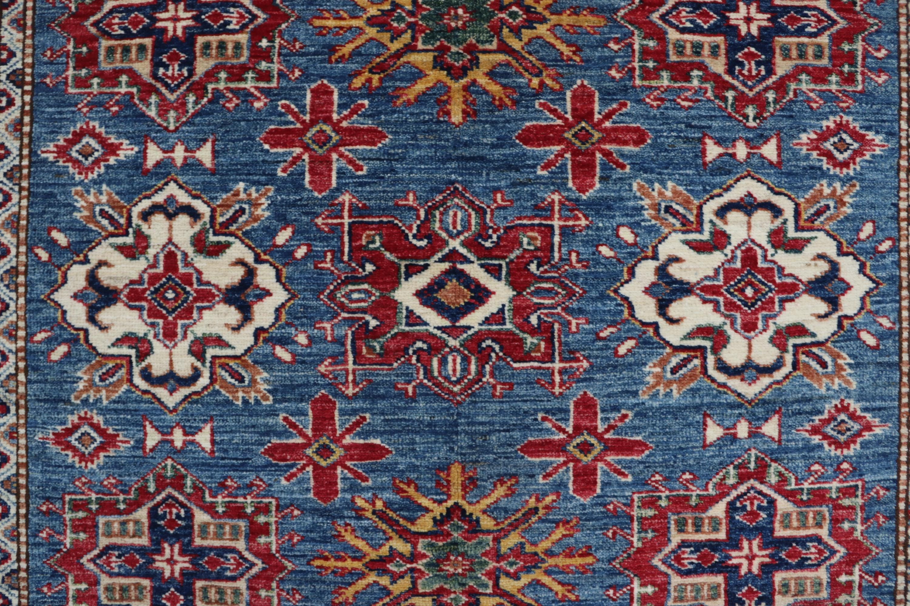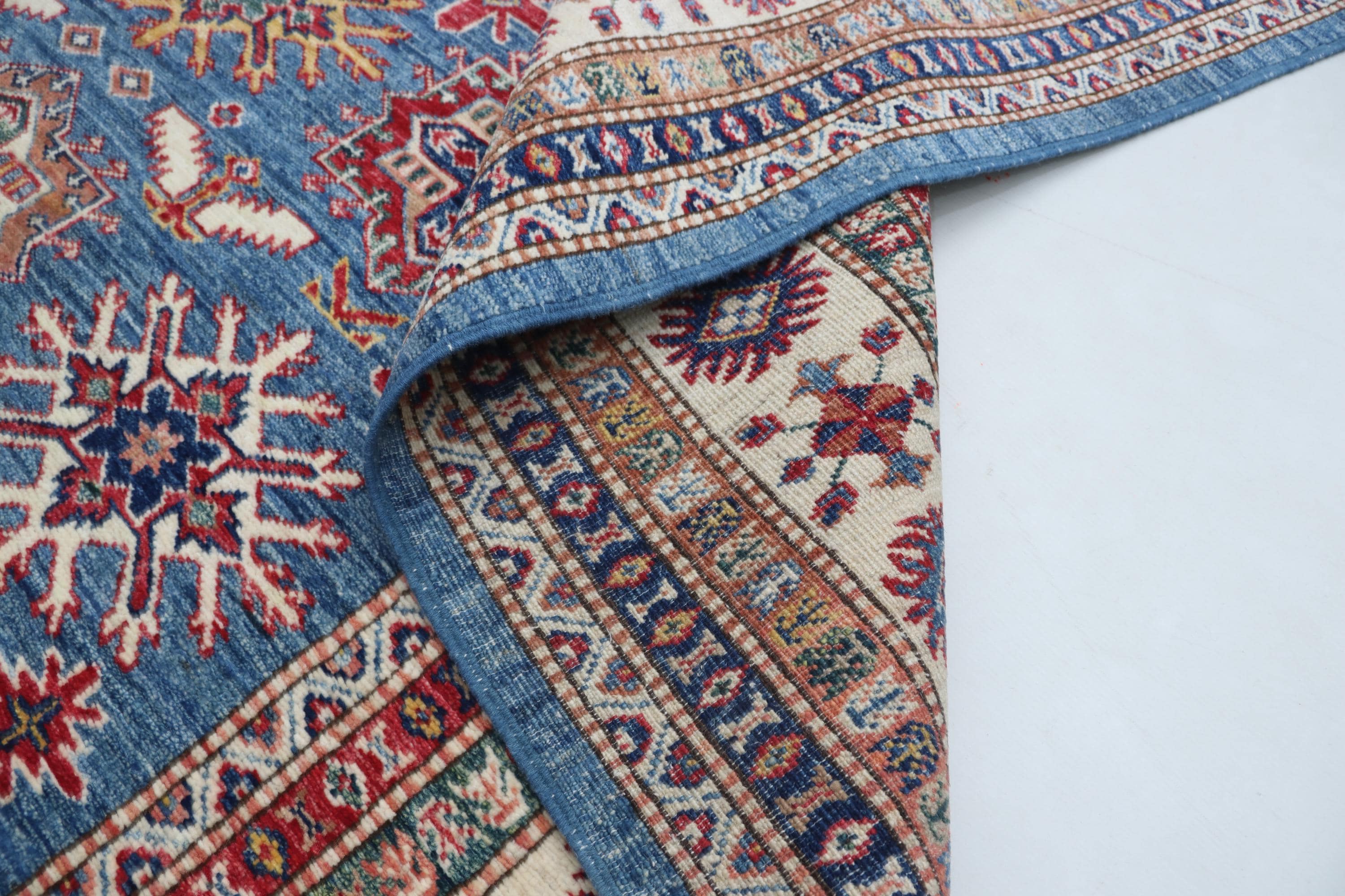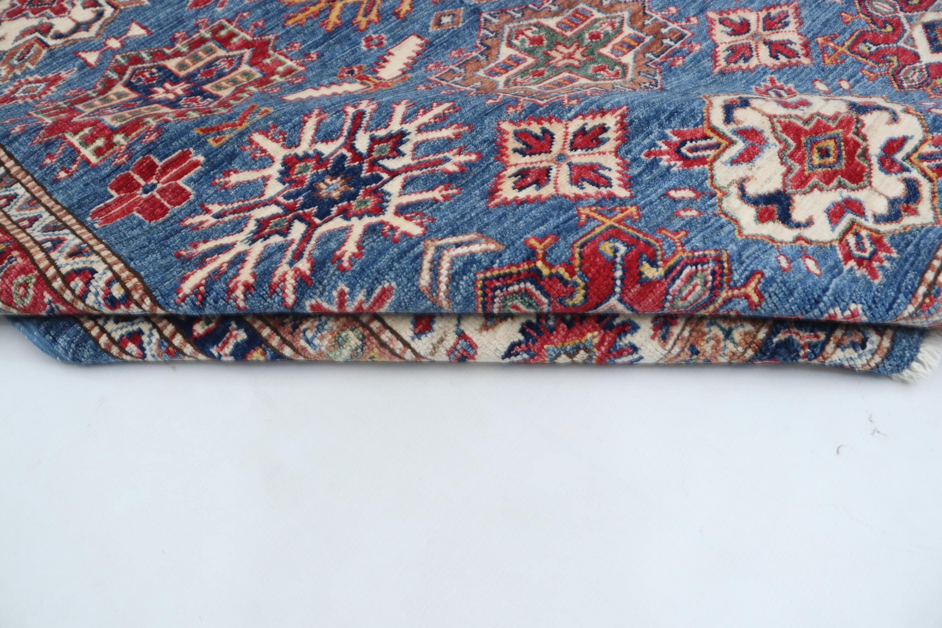 Elevate your décor with the Super Kazak , a luxury handmade Geonatrical rug.