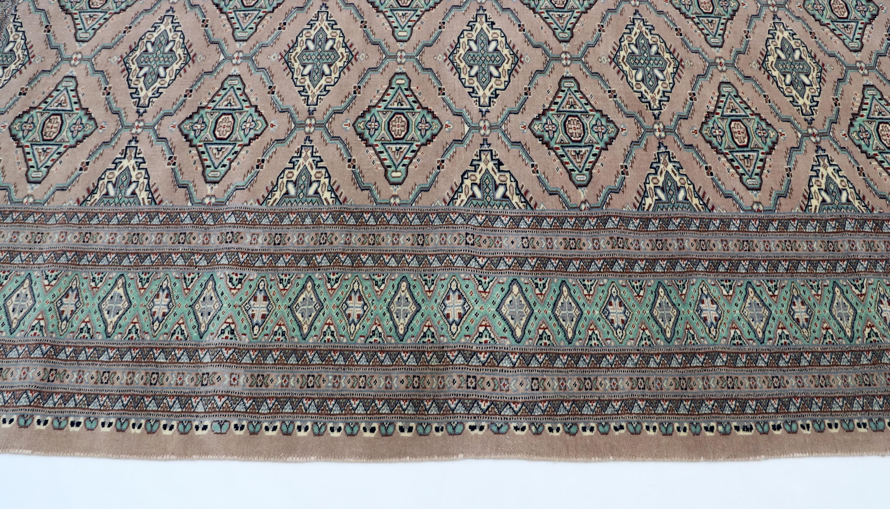 this rug in Brown with a Green border brings elegance to any room.